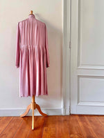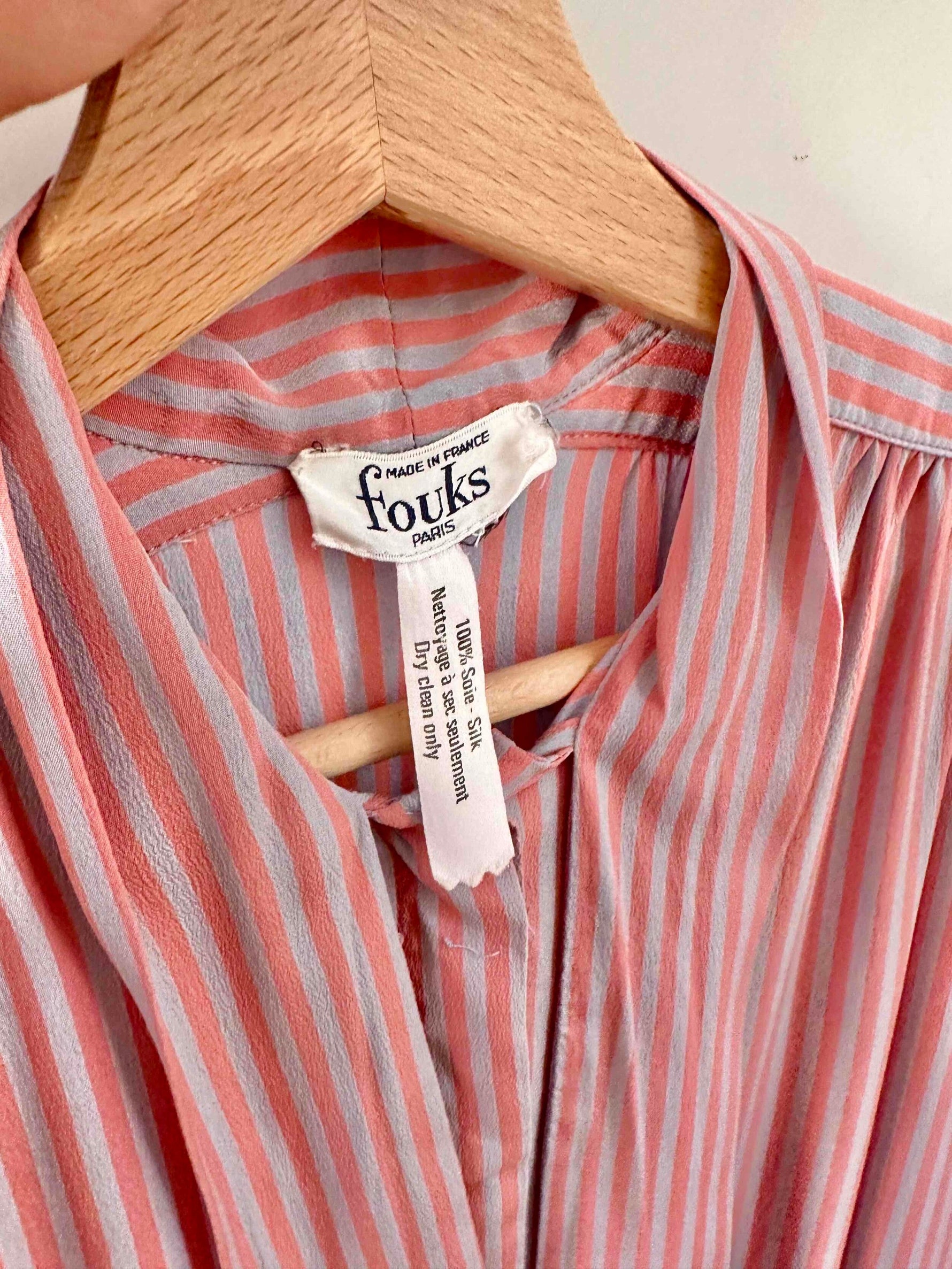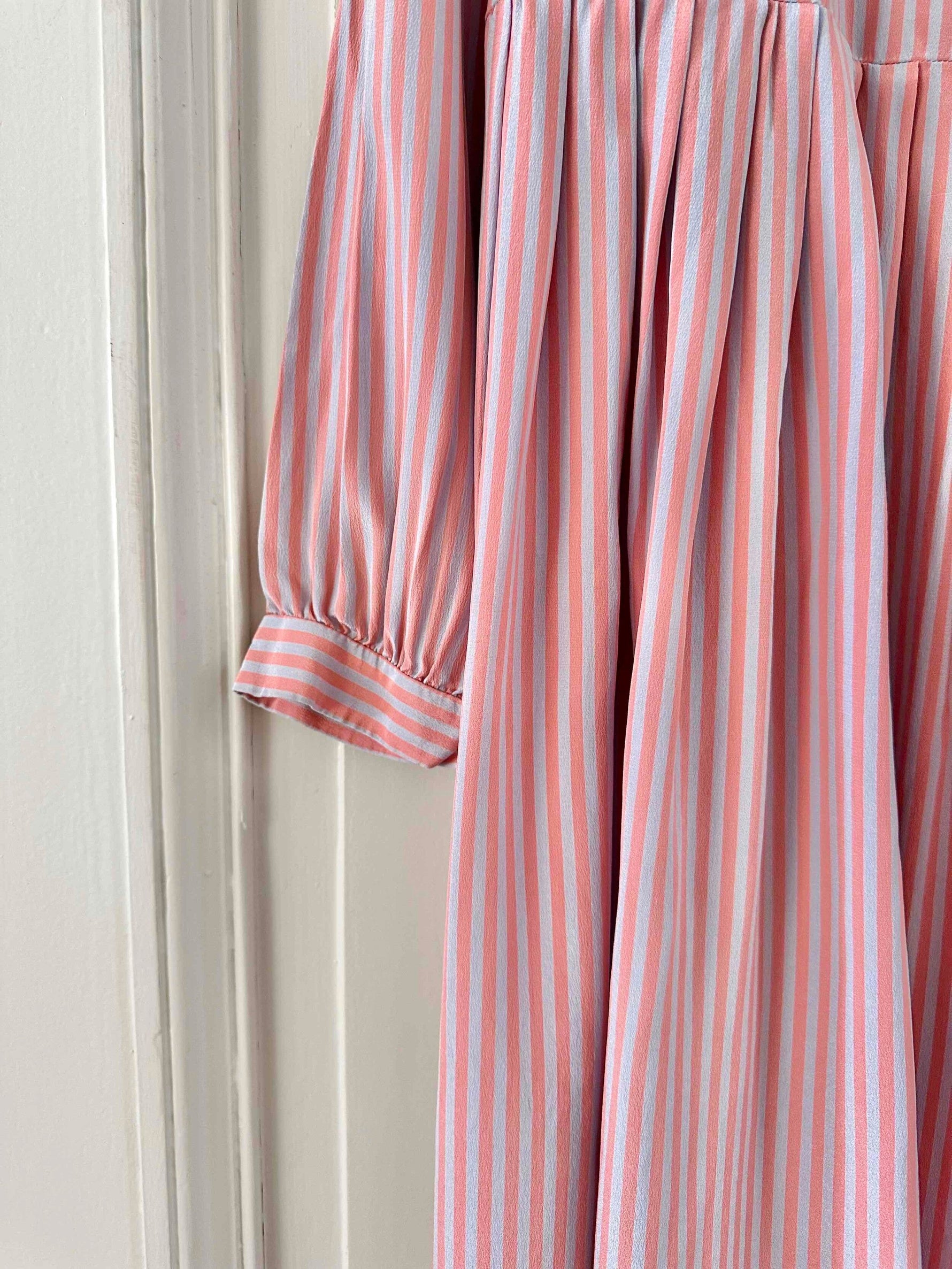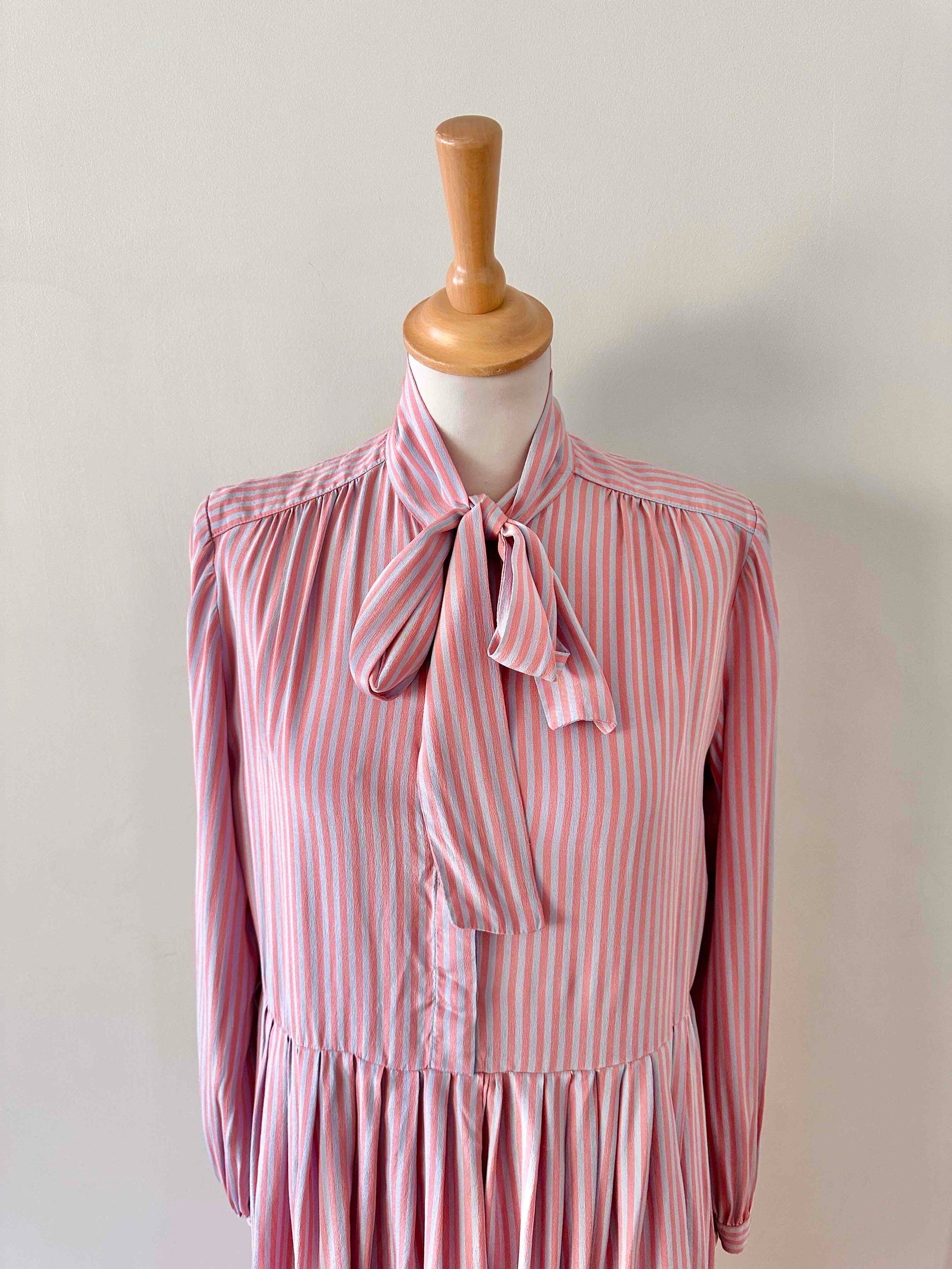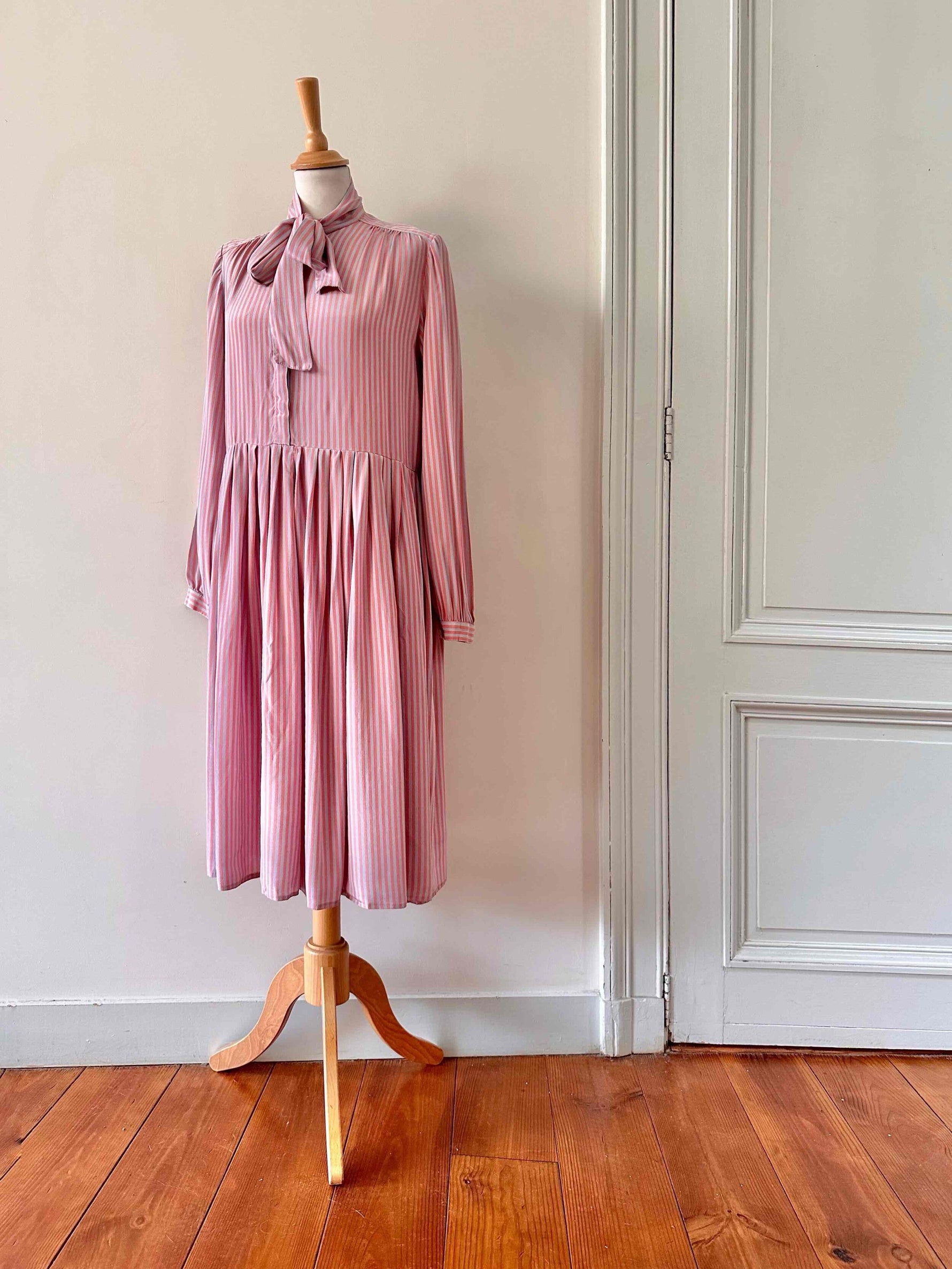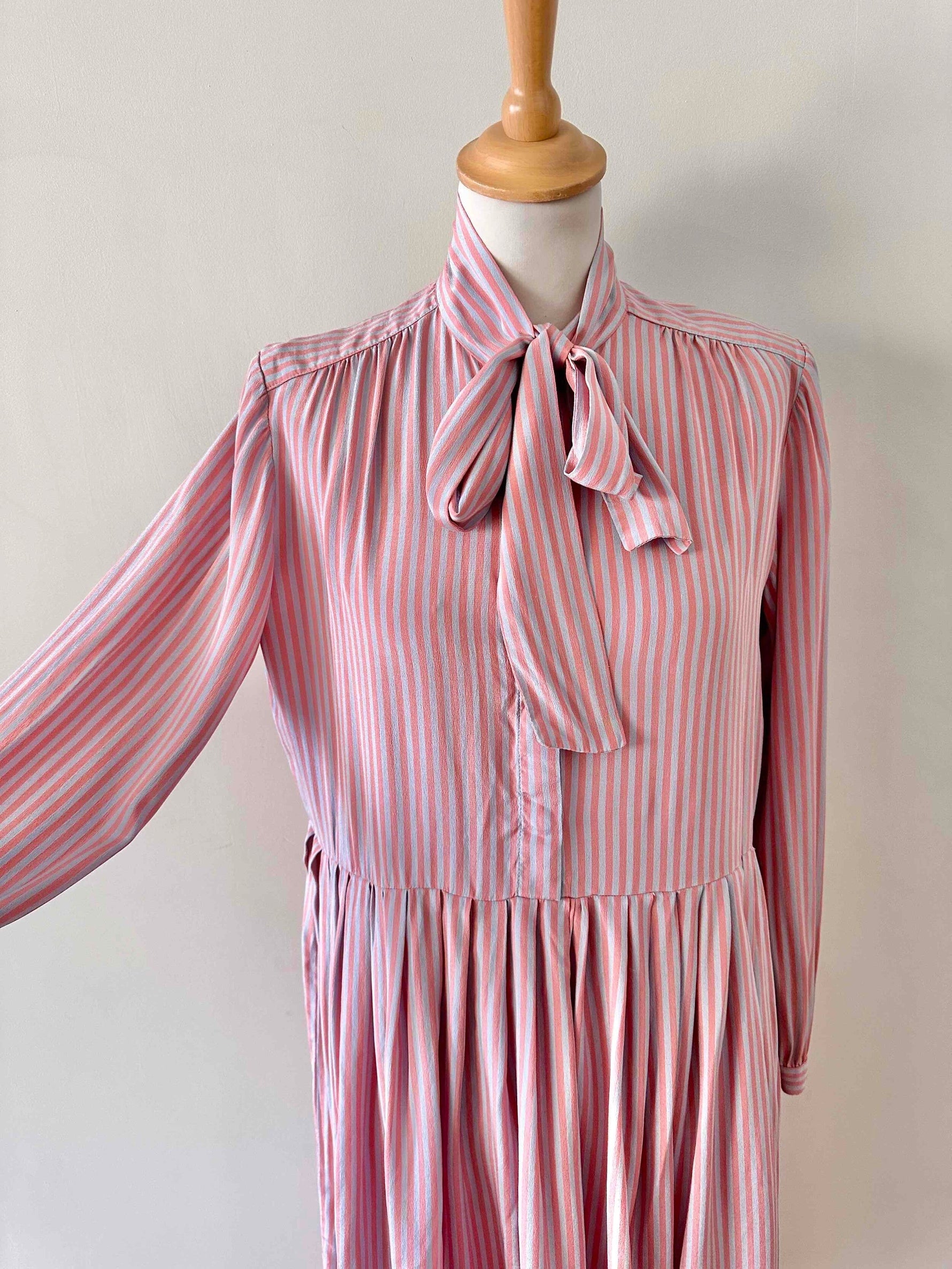 Robe chemise en soie, 100%, soie rayures roses blush et bleu ciel, col lavallière à nouer, haut boutonner, manches longues ballons, longueur midi, taille babydoll, fabriquée en France, taille 36 et 38, portée ici sur un mannequin T36, aisselles 45 cm.