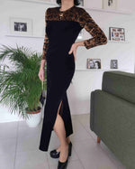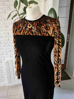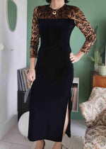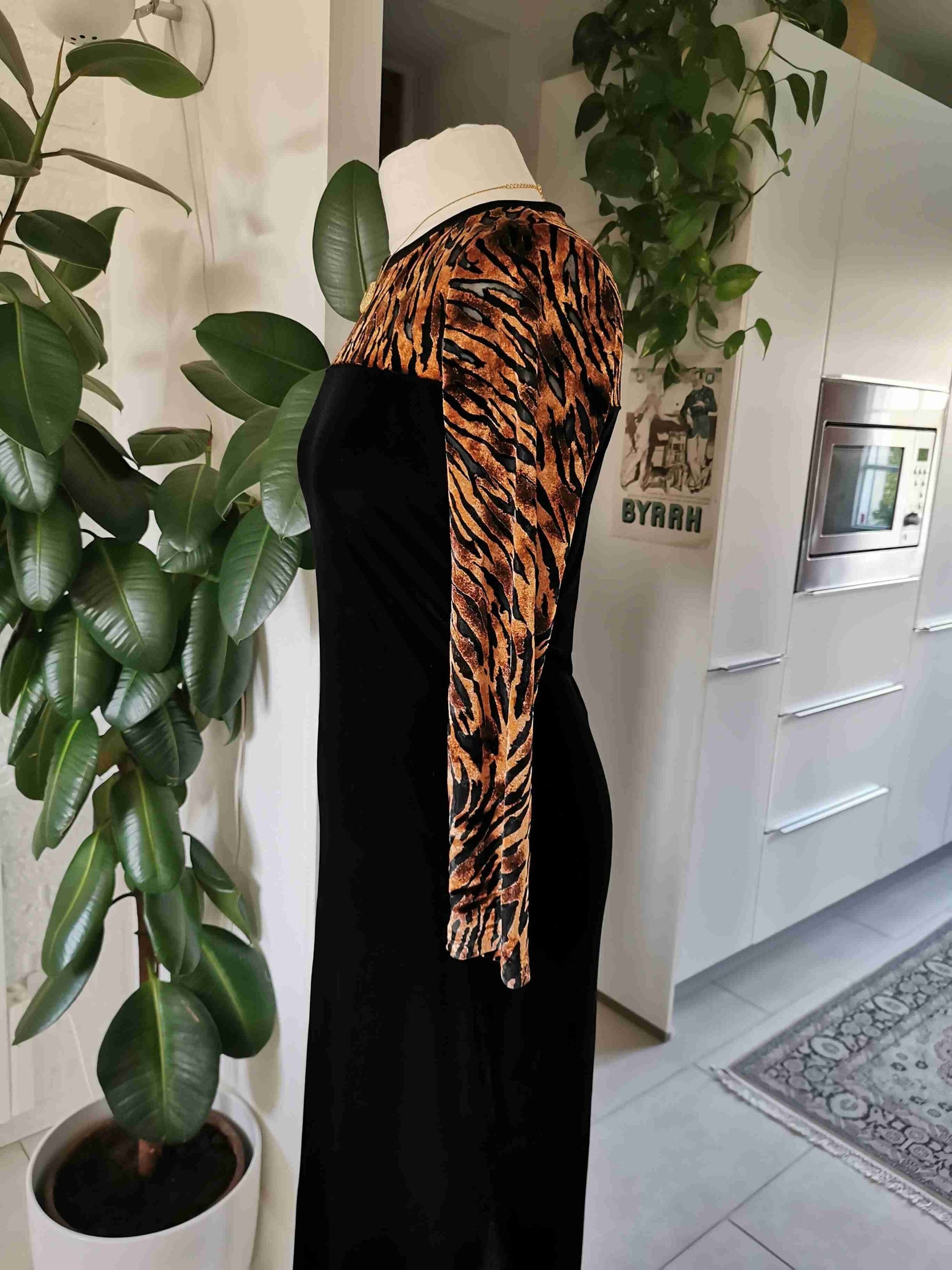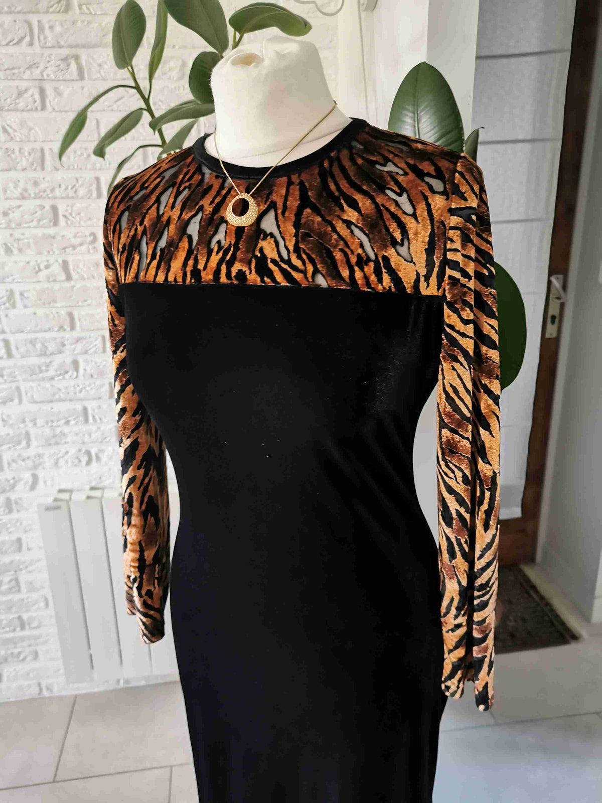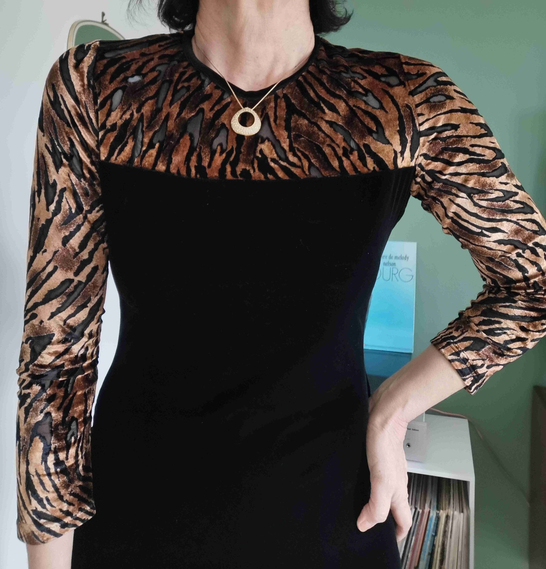 Le haut et les manches sont en lurex et velours imprimé léopard légèrement transparent