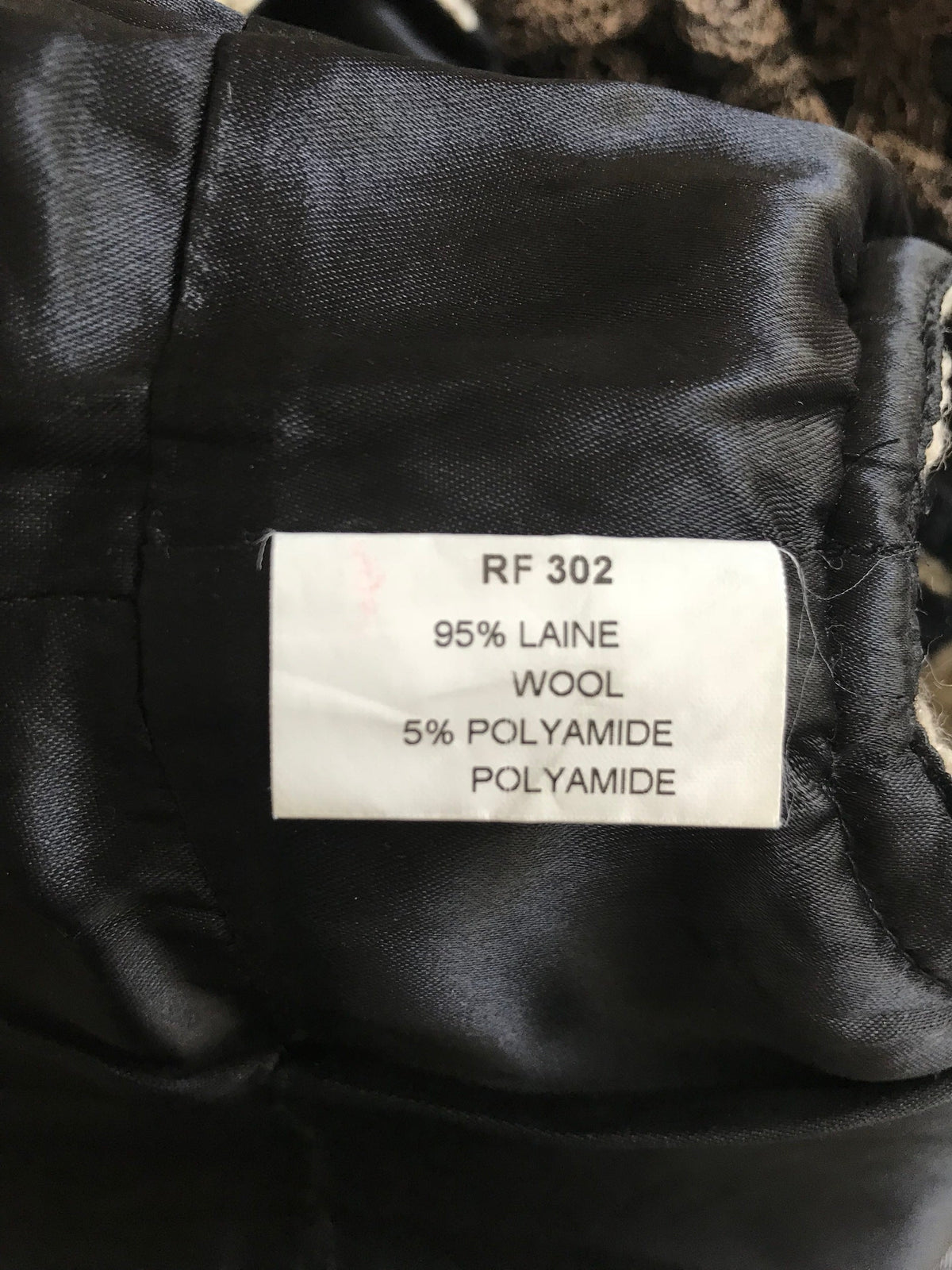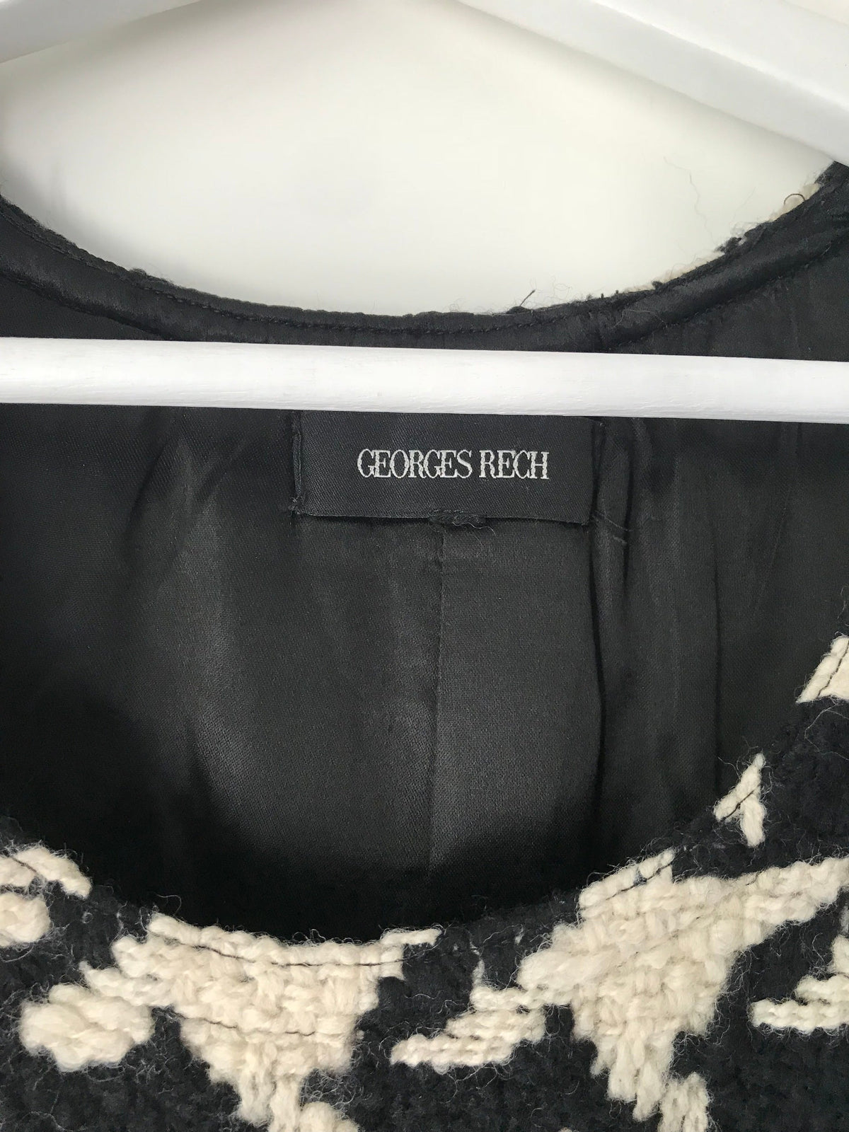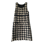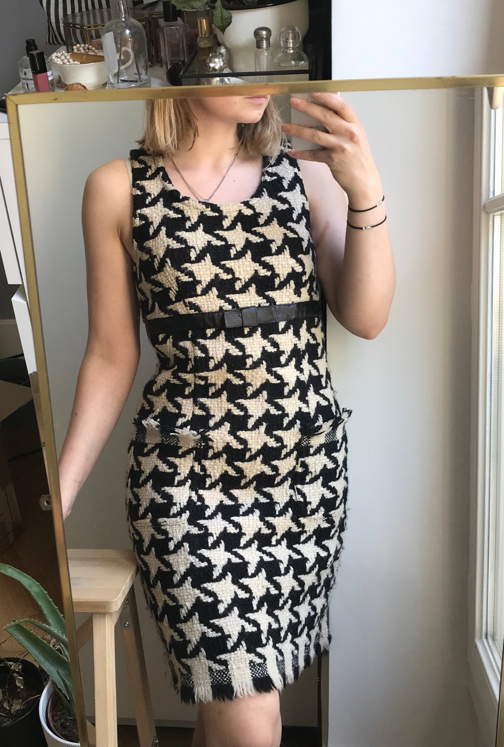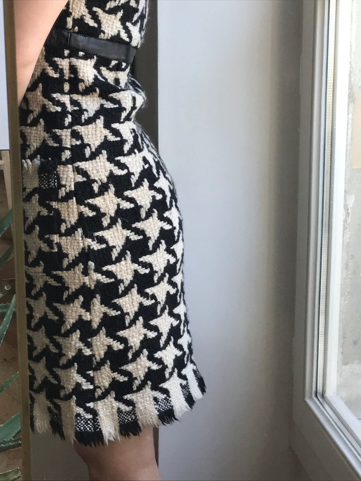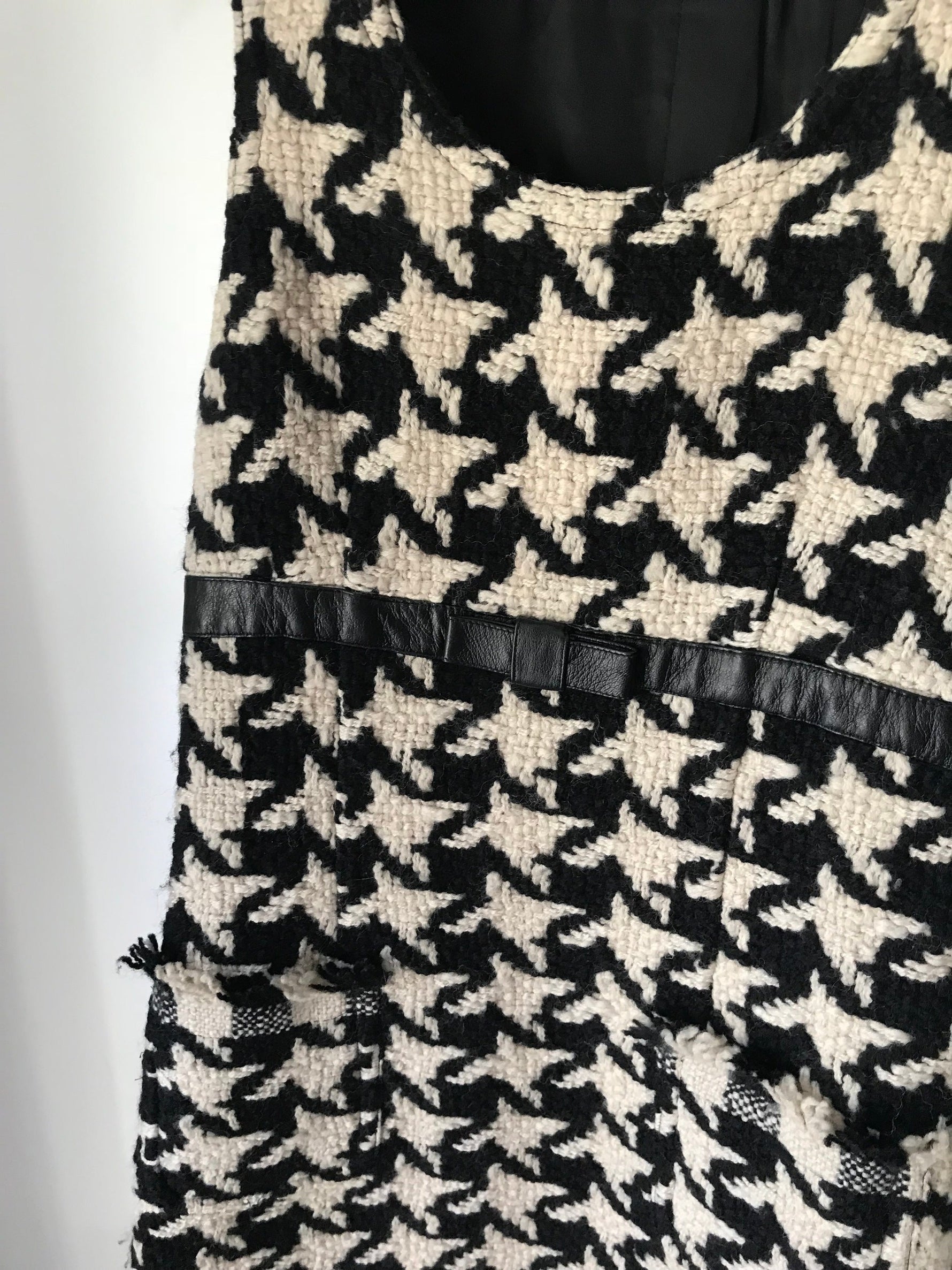 Prix unitaire parRobe courte sans manches en tweed beige et noir. Détails de ceinture simili cuir et bordures non finies. De la marque couture "Georges RECH". Poitrine 40 cm.