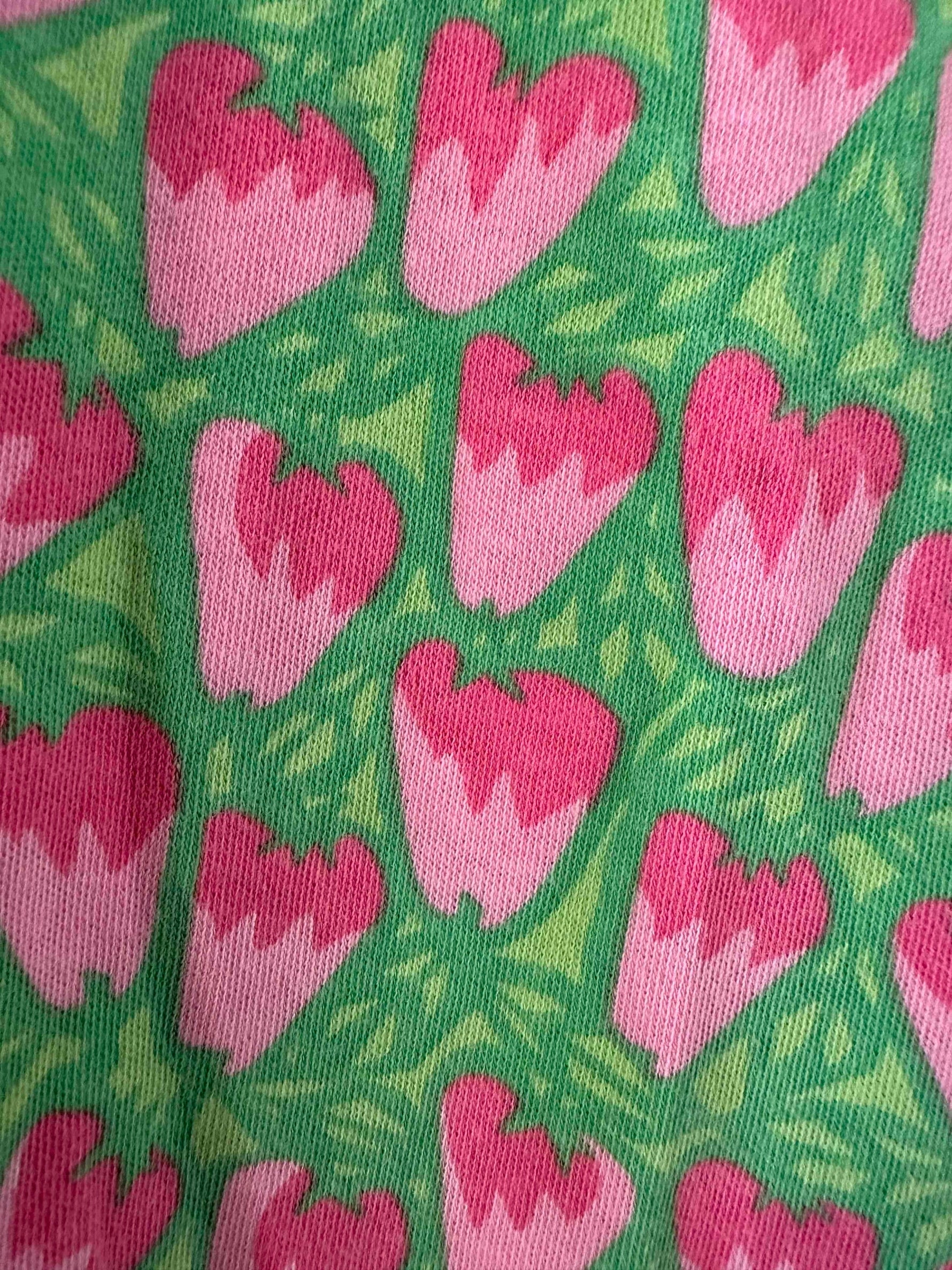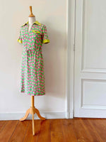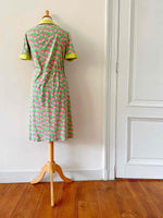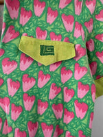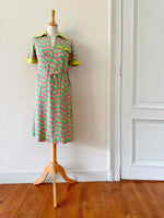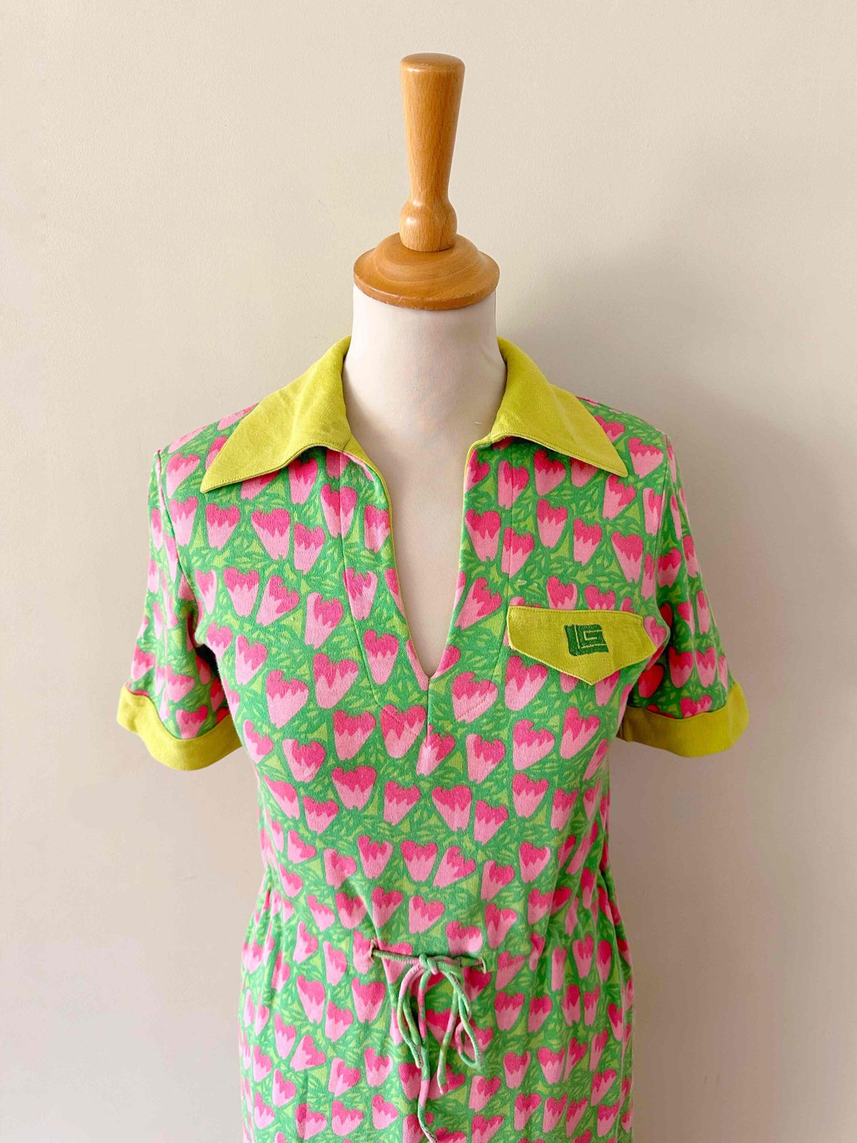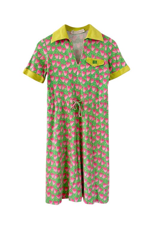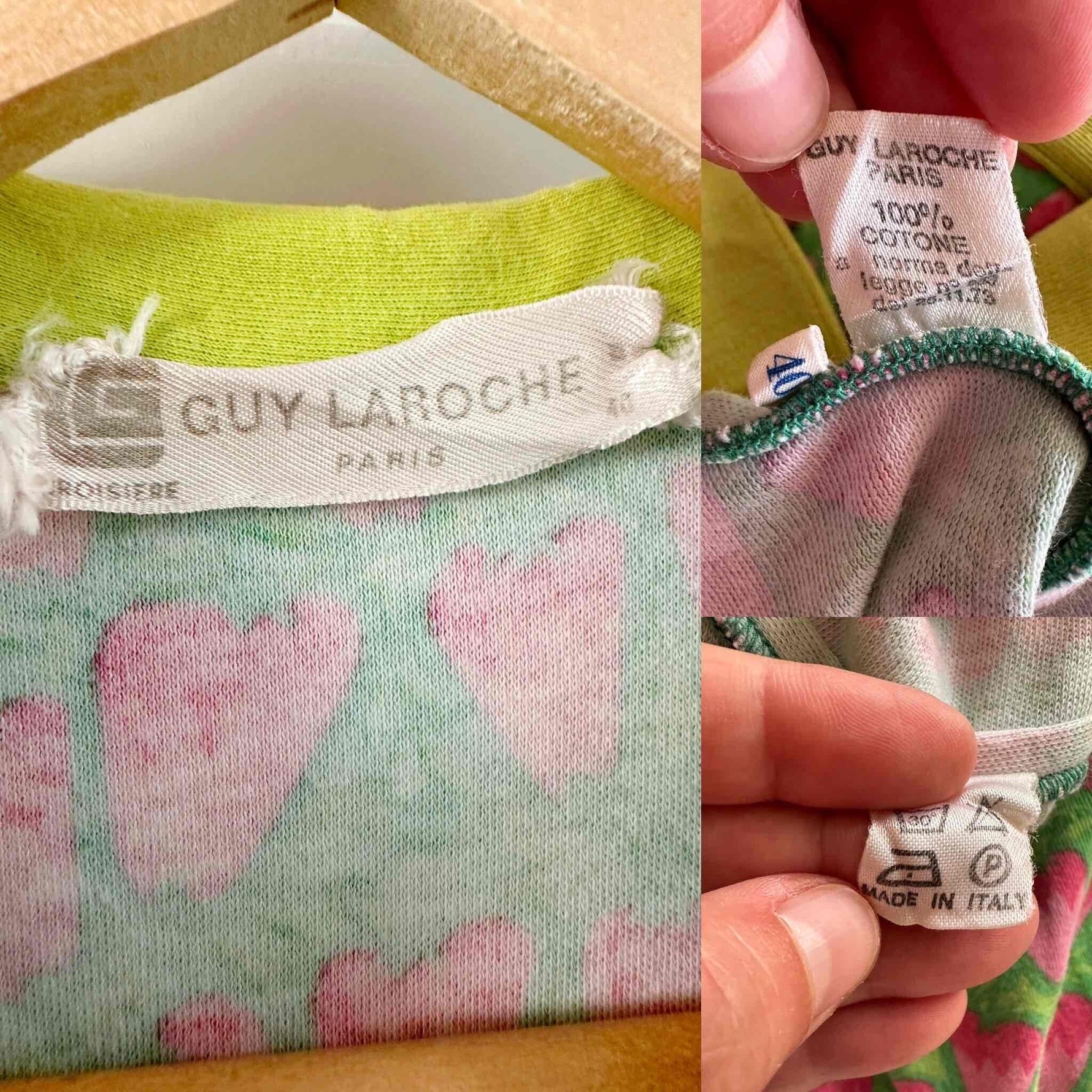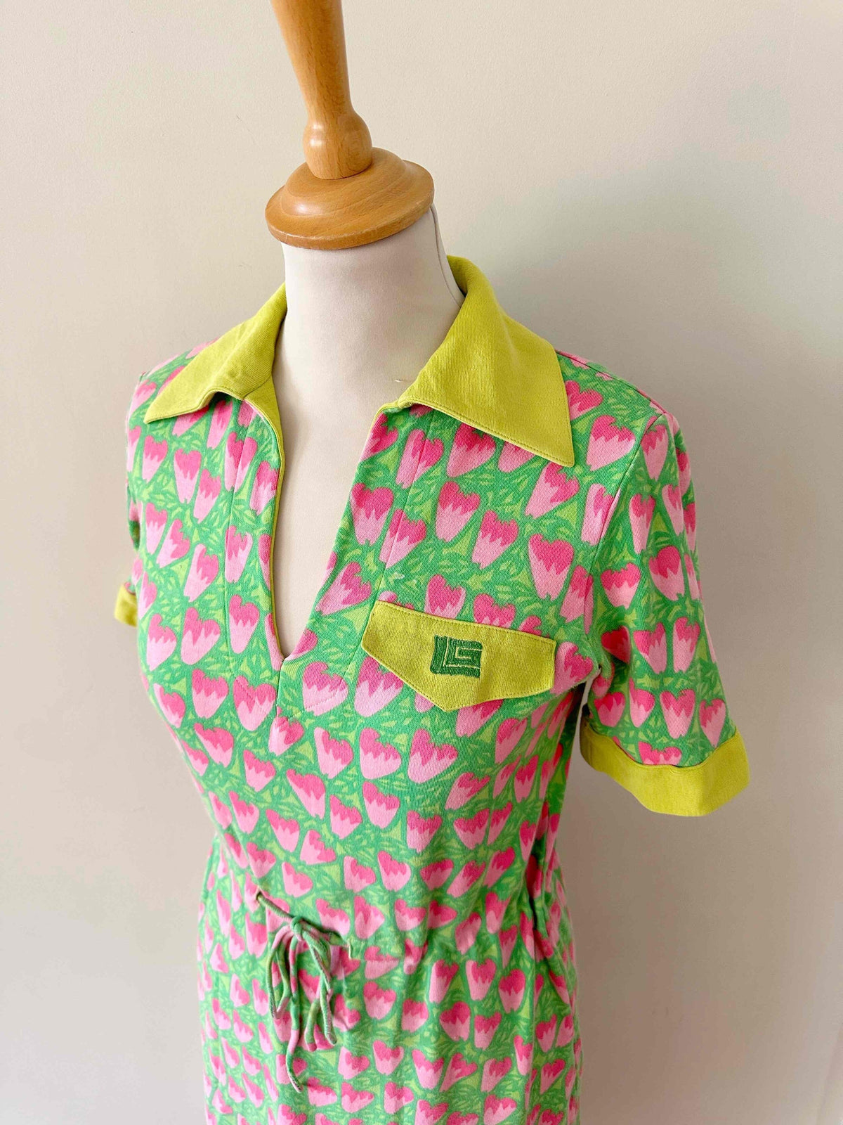 Prix unitaire parRobe Guy Laroche 70s, en jersey de coton molleton motifs fraises arty, vert gazon, vert anis et roses, logo des années 70s brodé sur poche poitrine, col polo, taille à nouer, fabriquée en Italie, taille 36 portée oci sur un mannequin T36, aisselles 44cm. Pièce rare des premières années de la griffe.