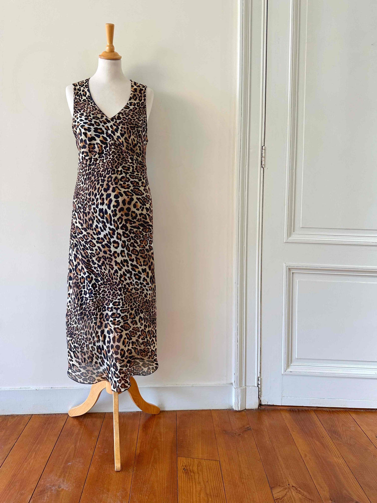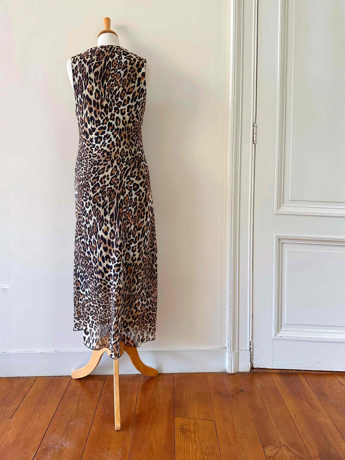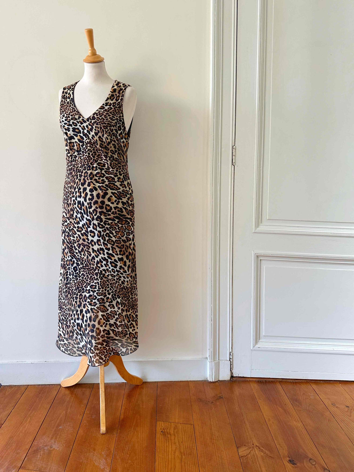 Prix unitaire parRobe nuisette léopard, en voile viscose doublée imprimé léopard, découpes sous poitrine, taillée en biais, fabriquée en France, taille 36 portée ici sur un mannequin T36, aisselles 44cm.