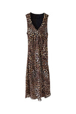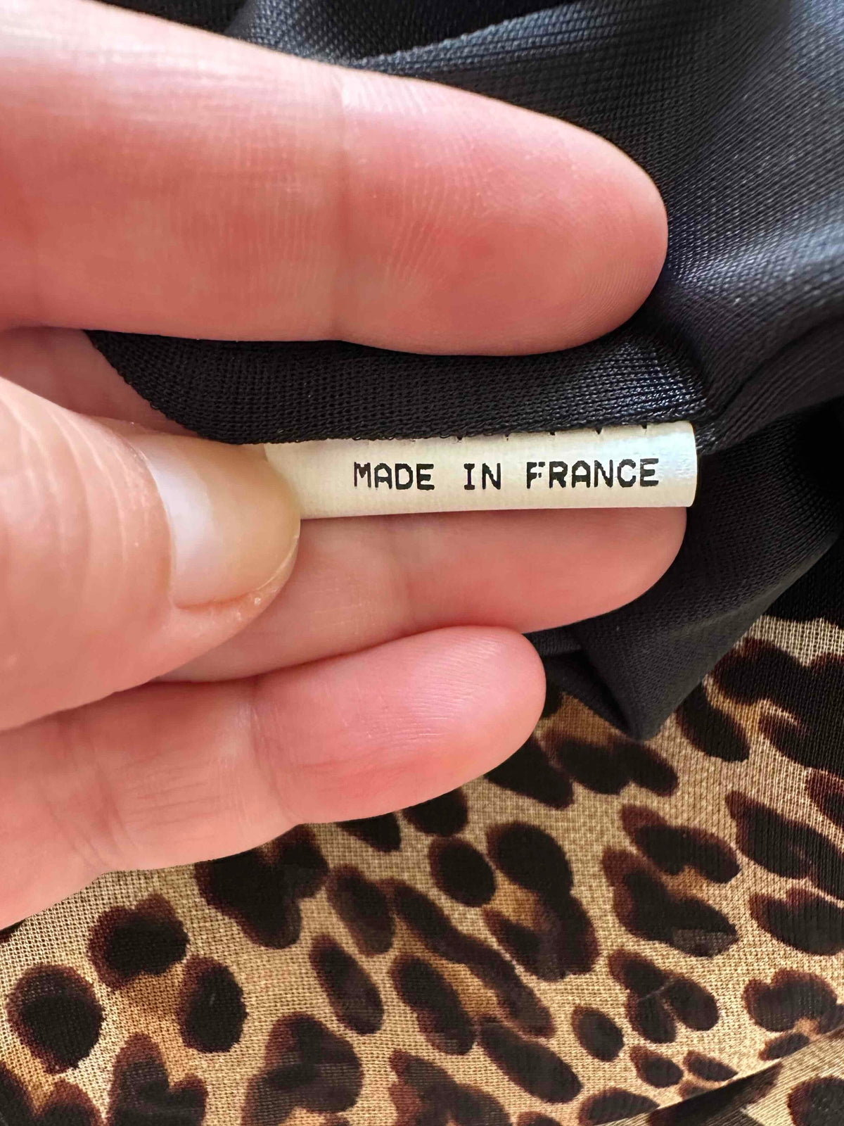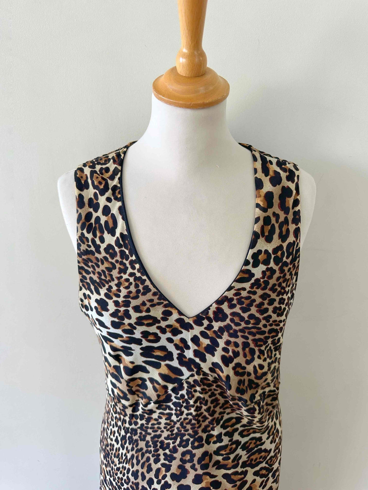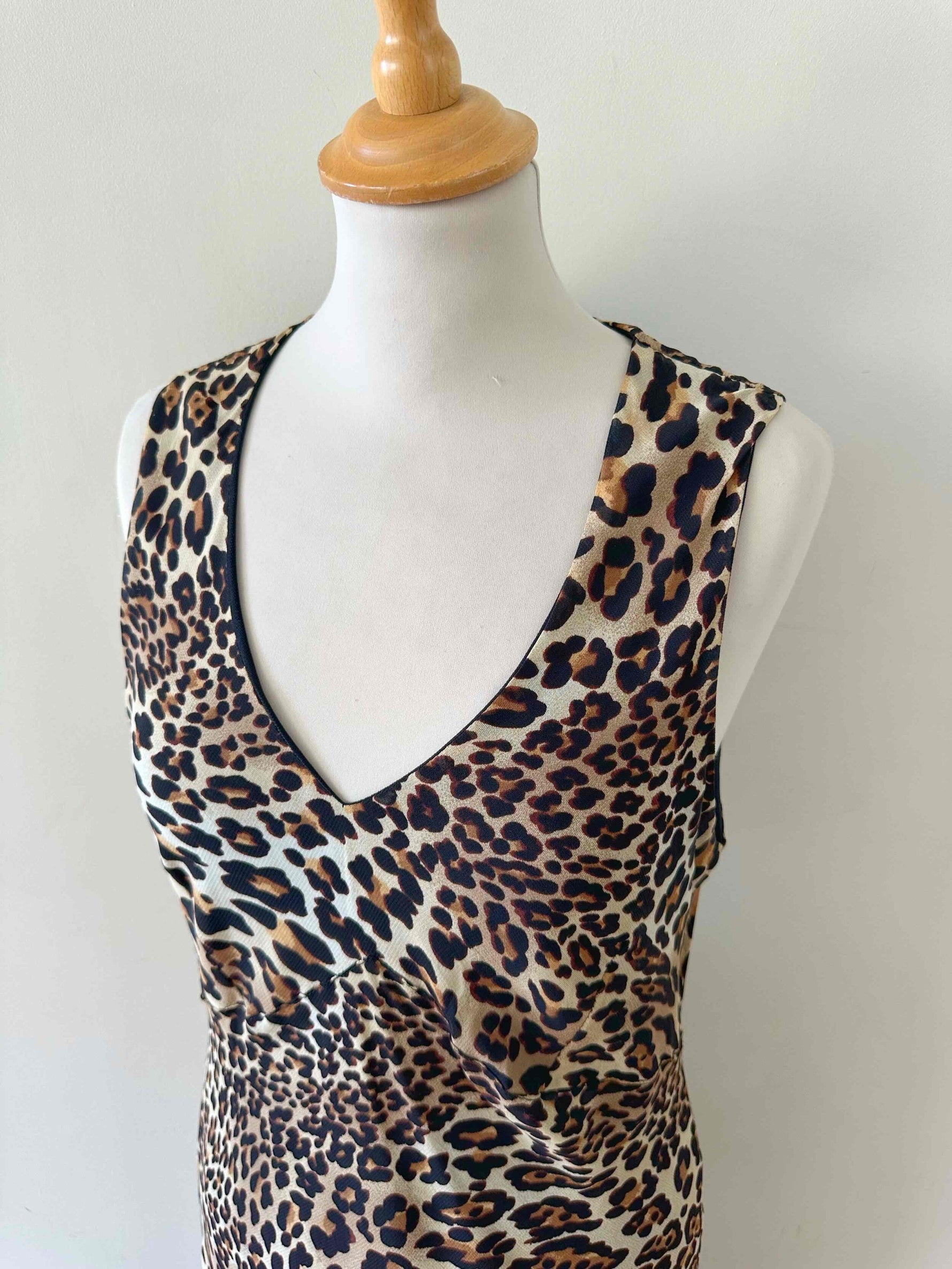 Prix unitaire parRobe nuisette léopard, en voile viscose doublée imprimé léopard, découpes sous poitrine, taillée en biais, fabriquée en France, taille 36 portée ici sur un mannequin T36, aisselles 44cm.