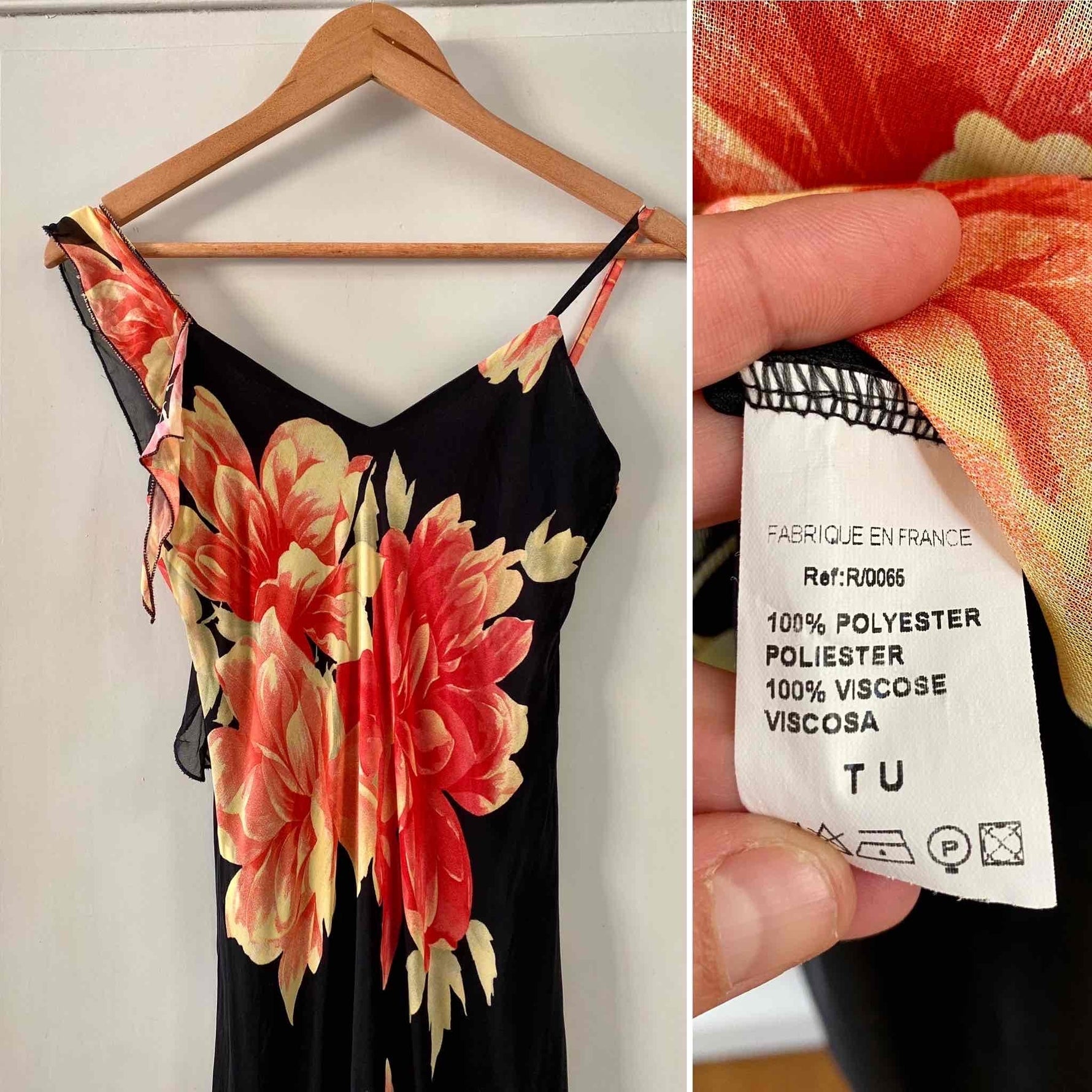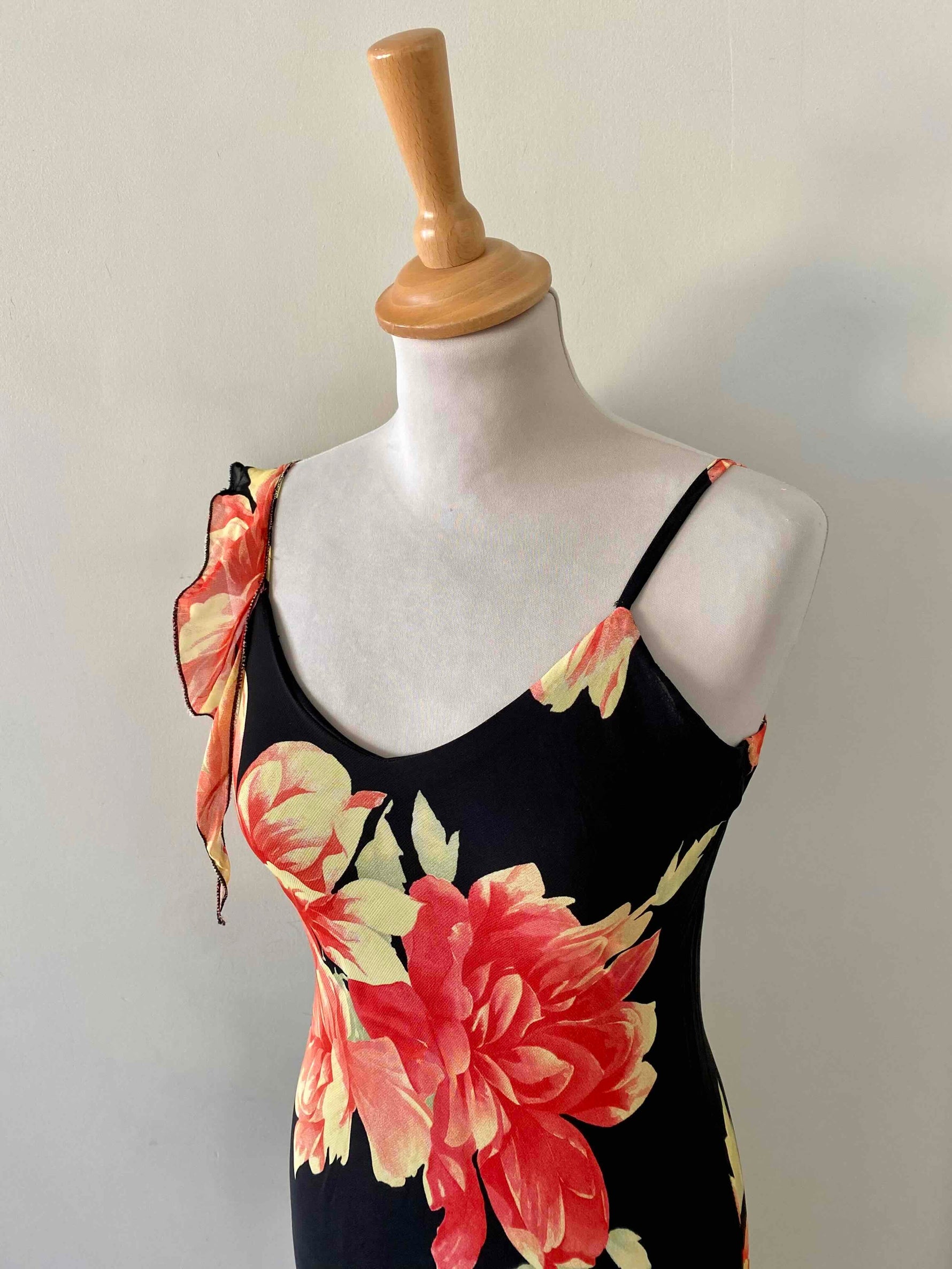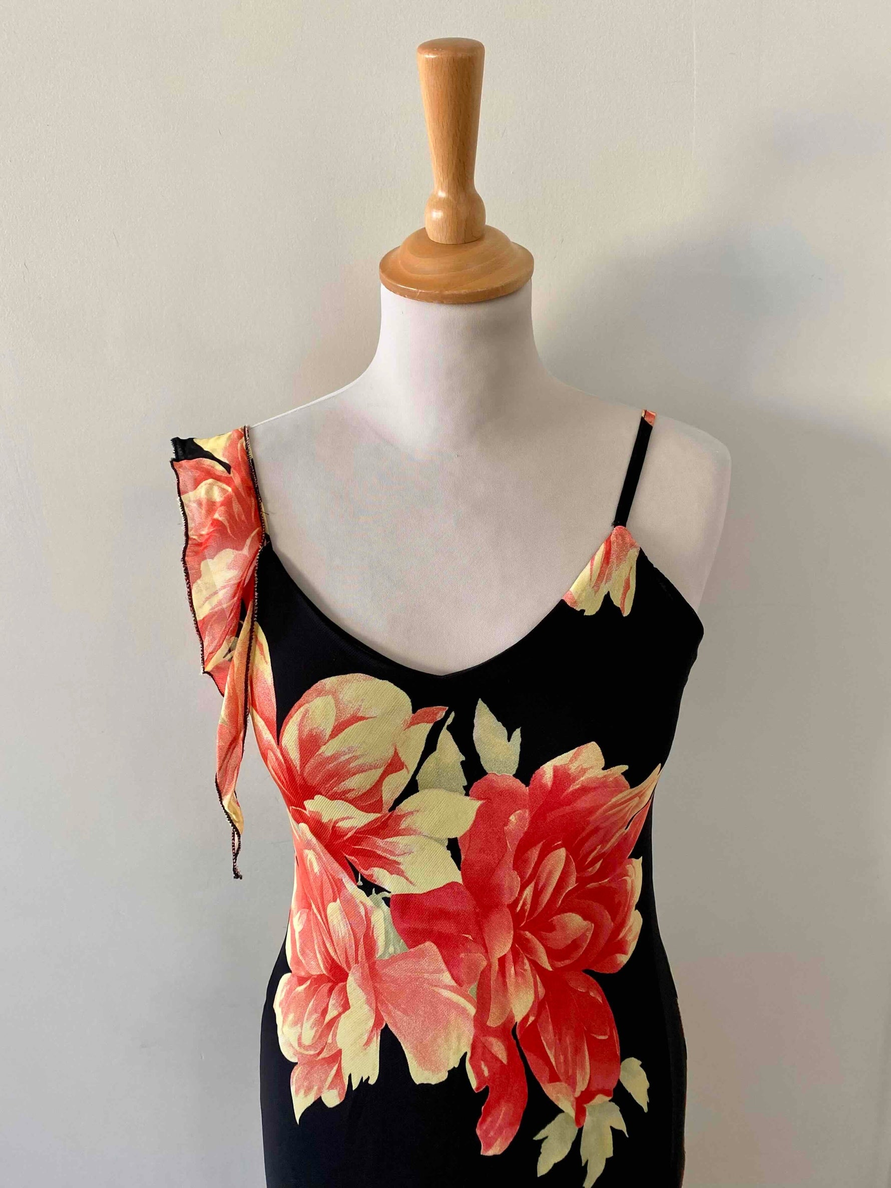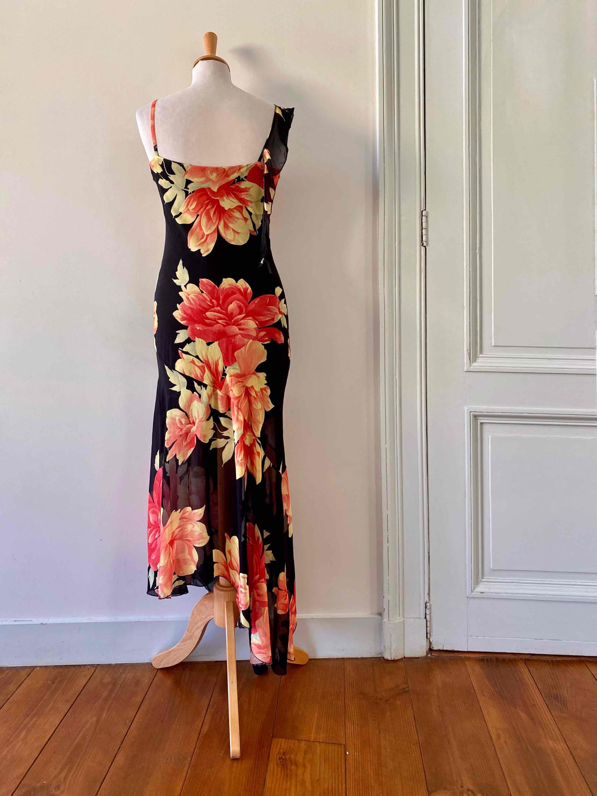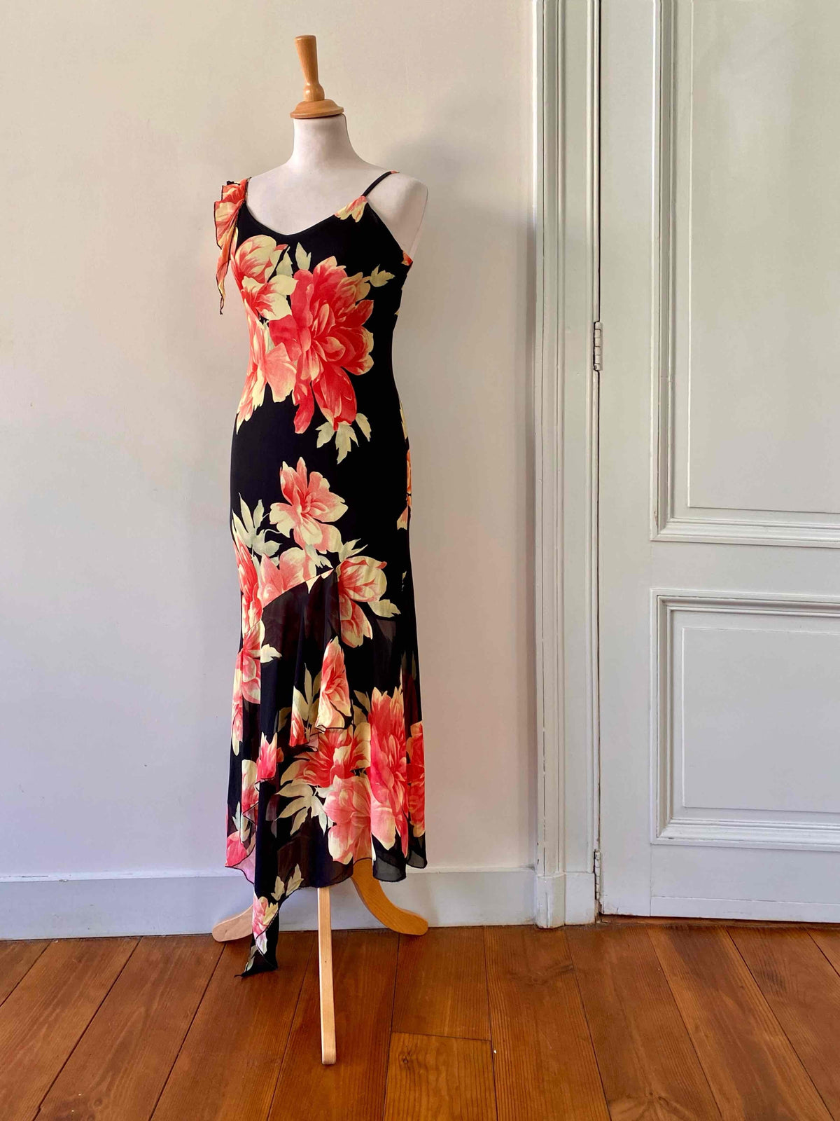 Prix unitaire parRobe longue à fleurs en voile viscose doublée noire imprimée grandes fleurs rouges, jaunes, oranges, bretelles spaghettis, avec volant sur une épaule, forme fit and flare en biais, bas asymétrique, fabriquée en France, taille 36 portée ici sur un mannequin T36, aisselles 43cm.