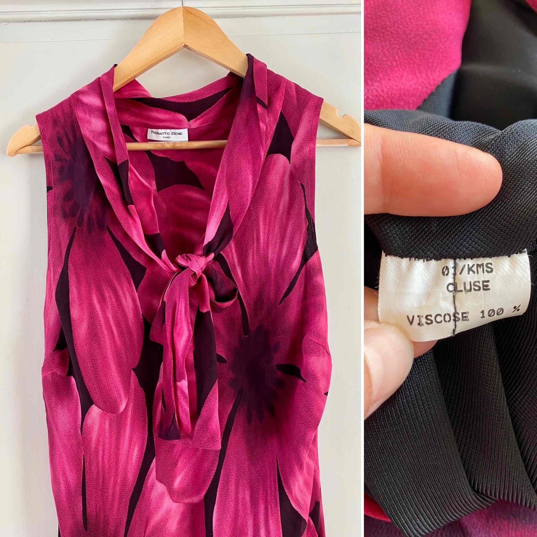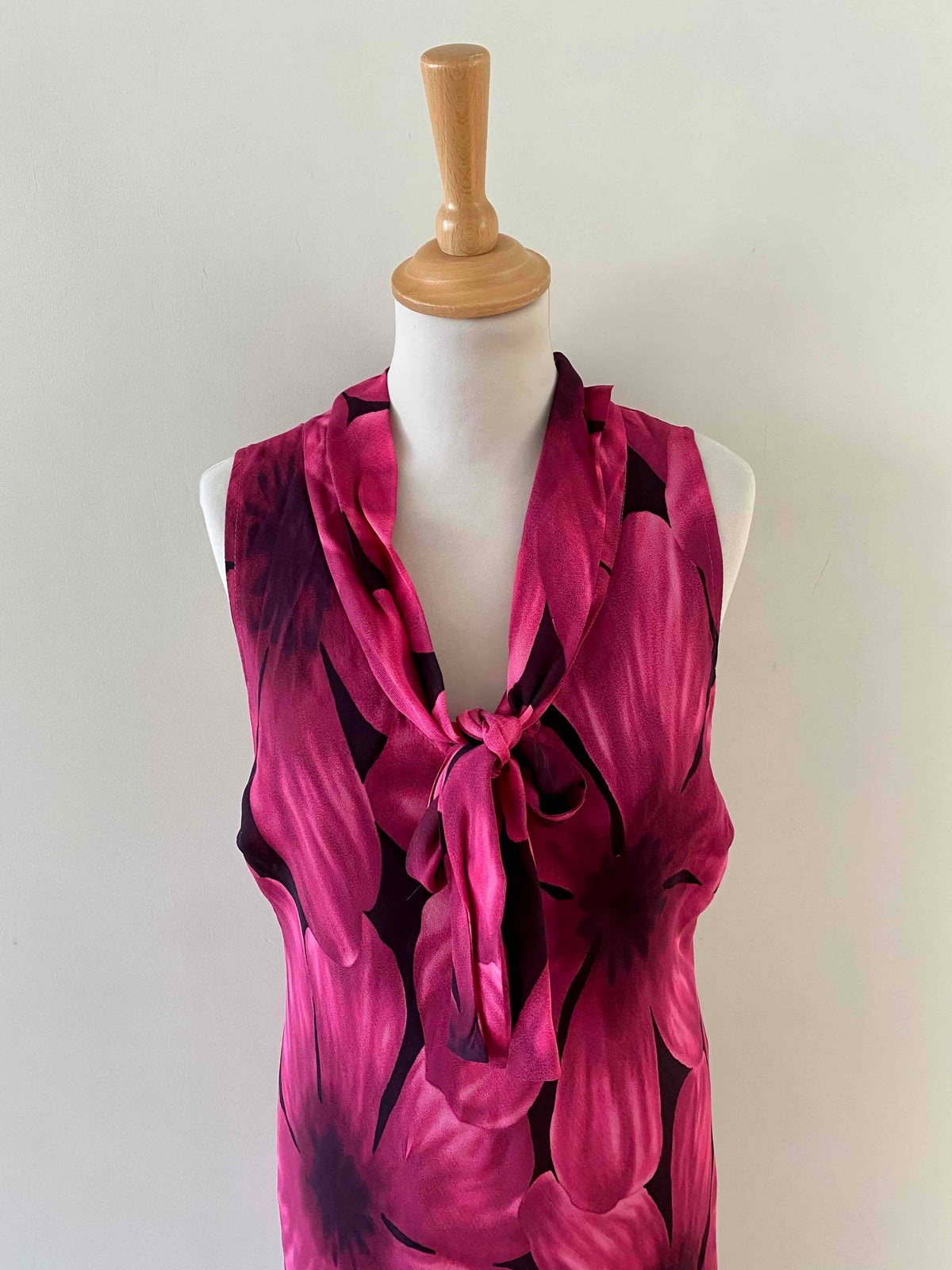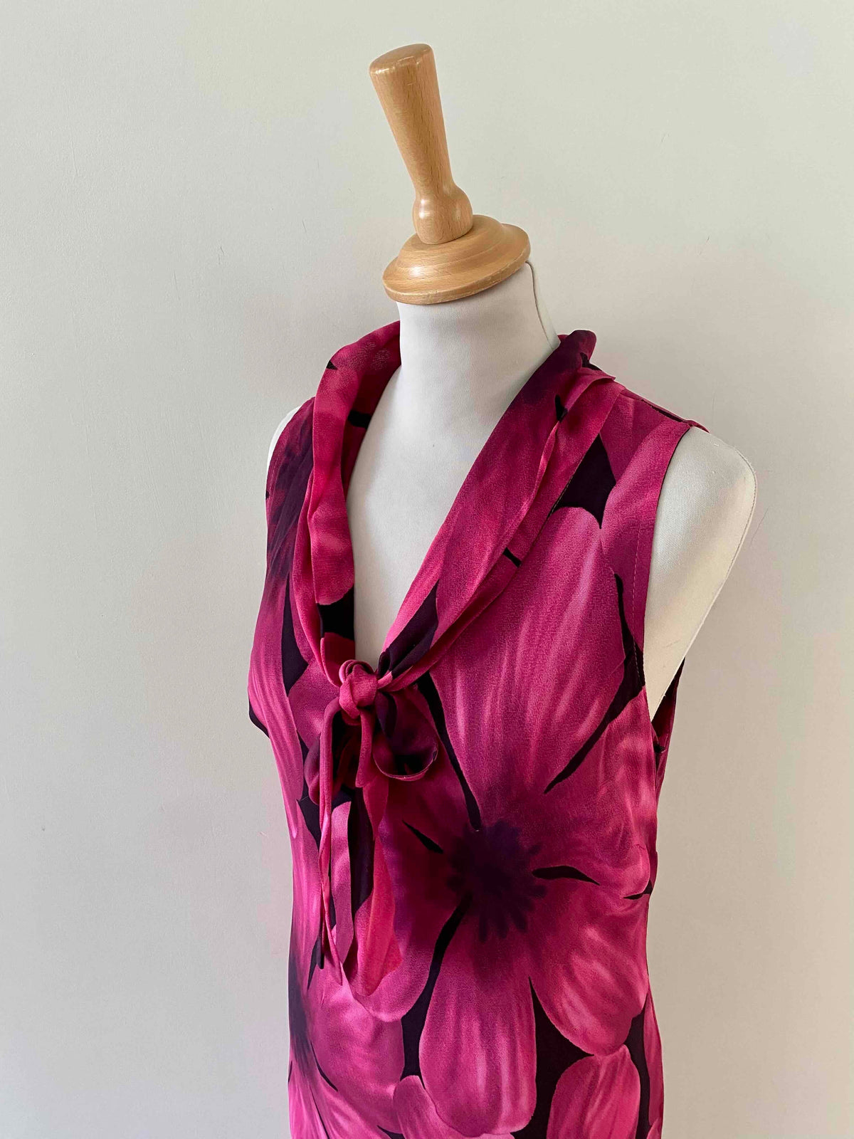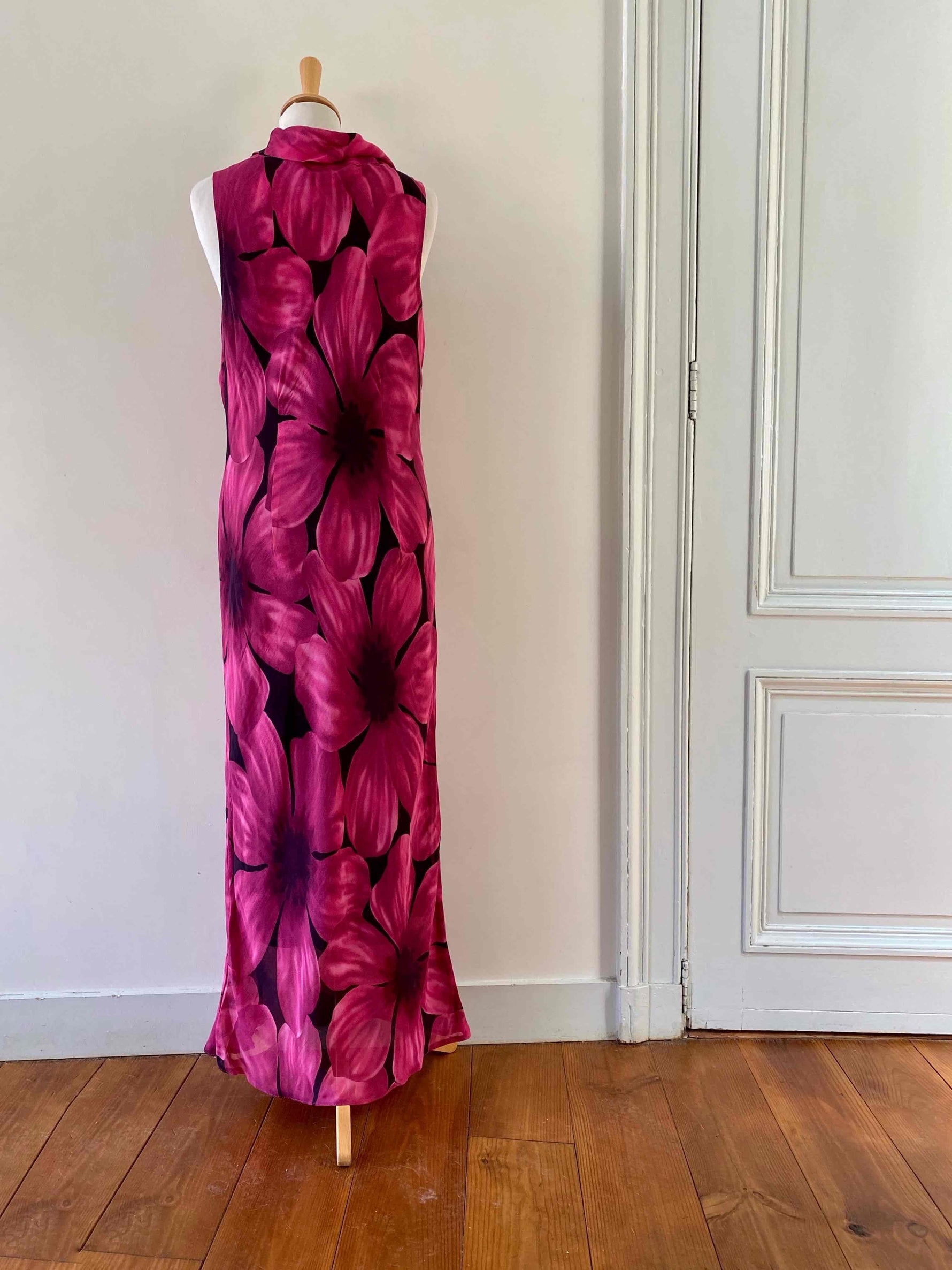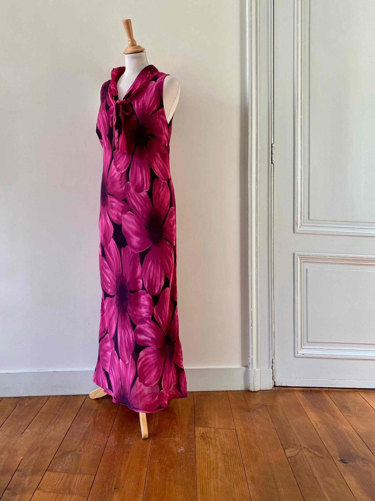 Prix unitaire parRobe longue à fleurs en voile viscose doublée noire imprimée grandes fleurs roses fuschias et prunes, col foulard à nouer, longueur maxi et forme fit and flare en biais, fabriquée en France, taille 38 portée ici sur un mannequin T36, aisselles 46cm.