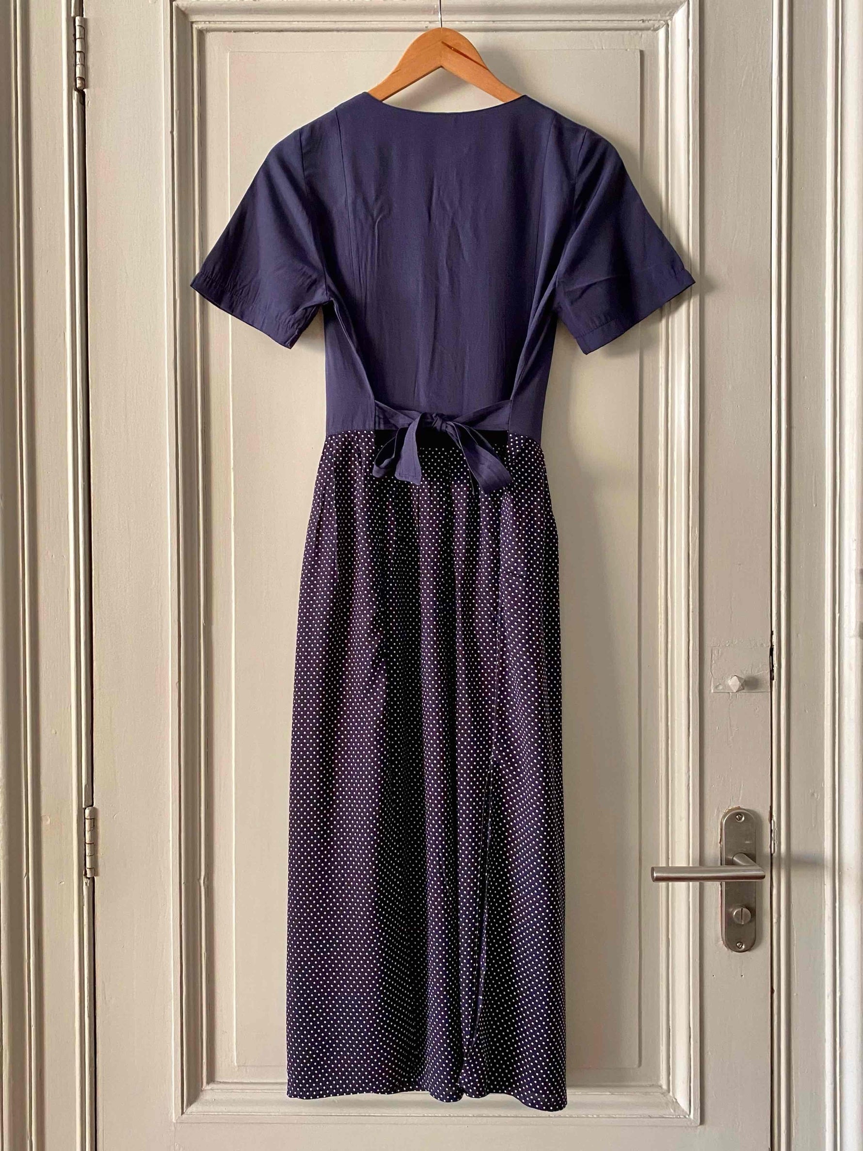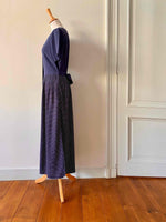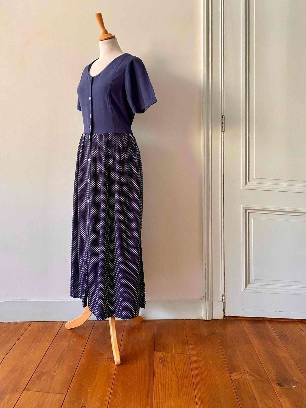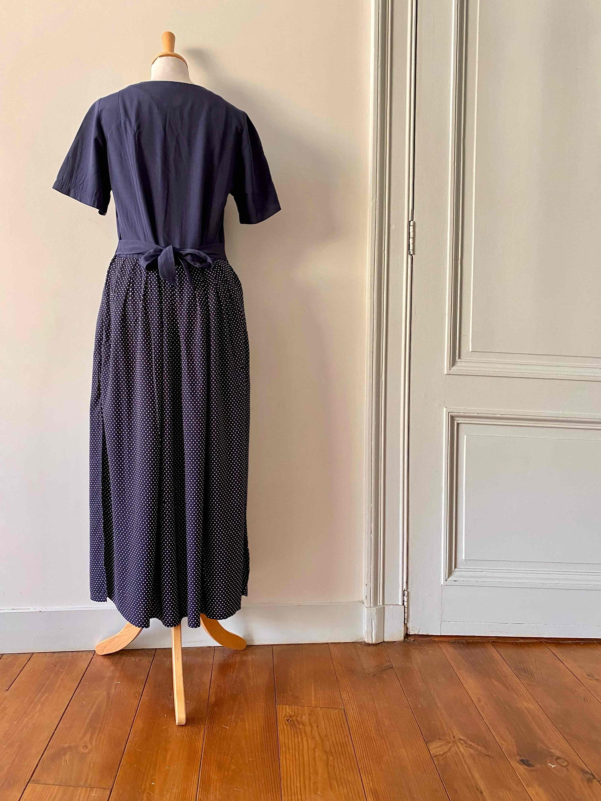 Prix unitaire parRobe longue à pois, en viscose bleu nuit imprimée minis pois blancs, haut uni, boutonné en nacre, ceinture taille à nouer dos, fentes bas côtés, années 80’s, taille 36 et 38 portée ici sur un mannequin T36, aisselles 45cm.