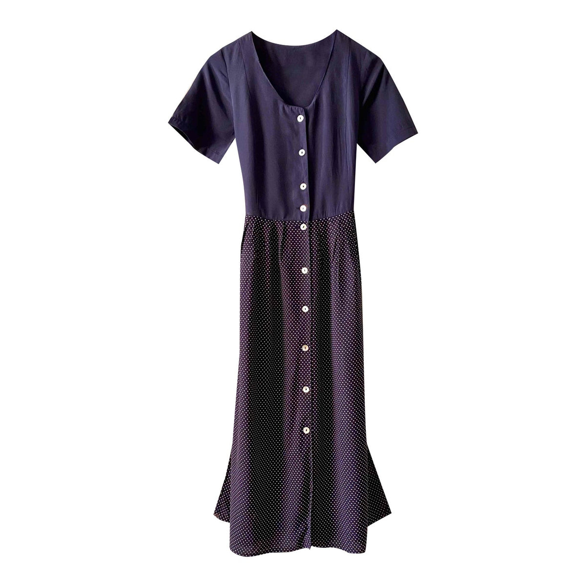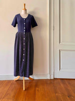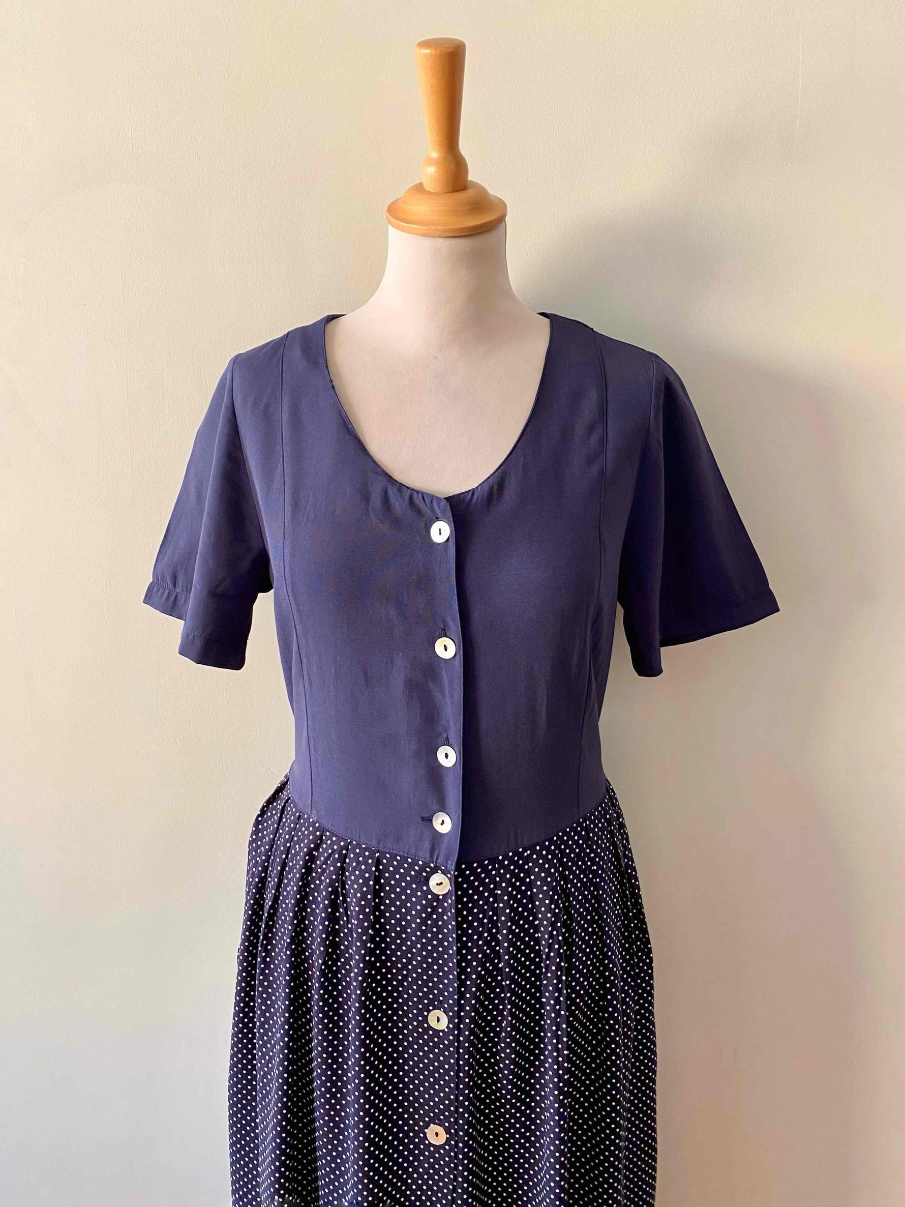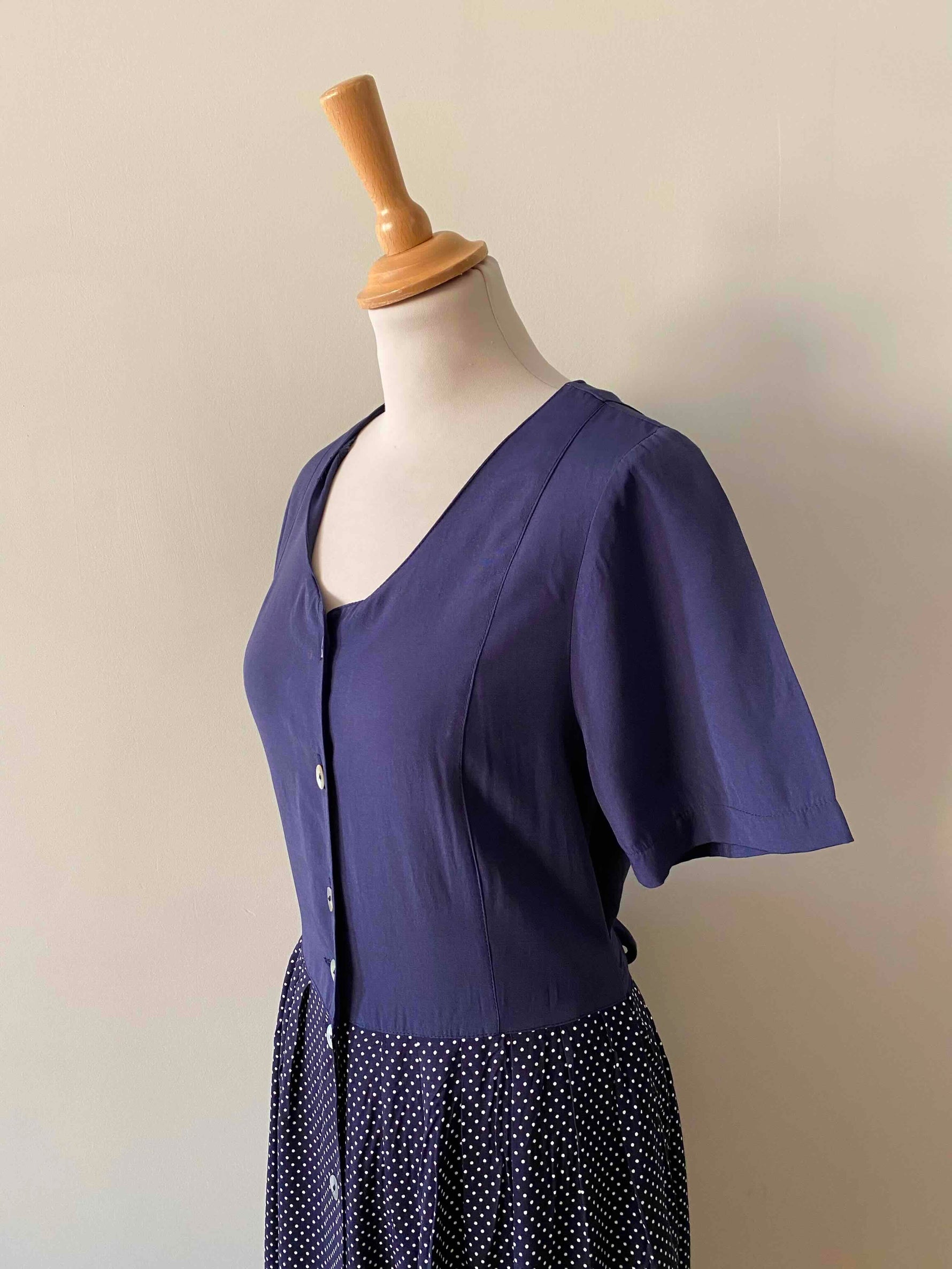 Prix unitaire parRobe longue à pois, en viscose bleu nuit imprimée minis pois blancs, haut uni, boutonné en nacre, ceinture taille à nouer dos, fentes bas côtés, années 80’s, taille 36 et 38 portée ici sur un mannequin T36, aisselles 45cm.