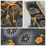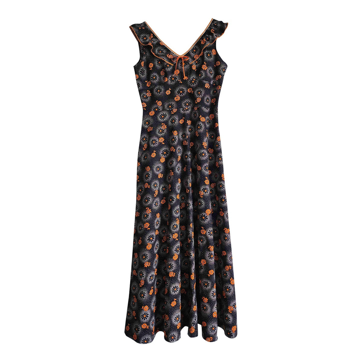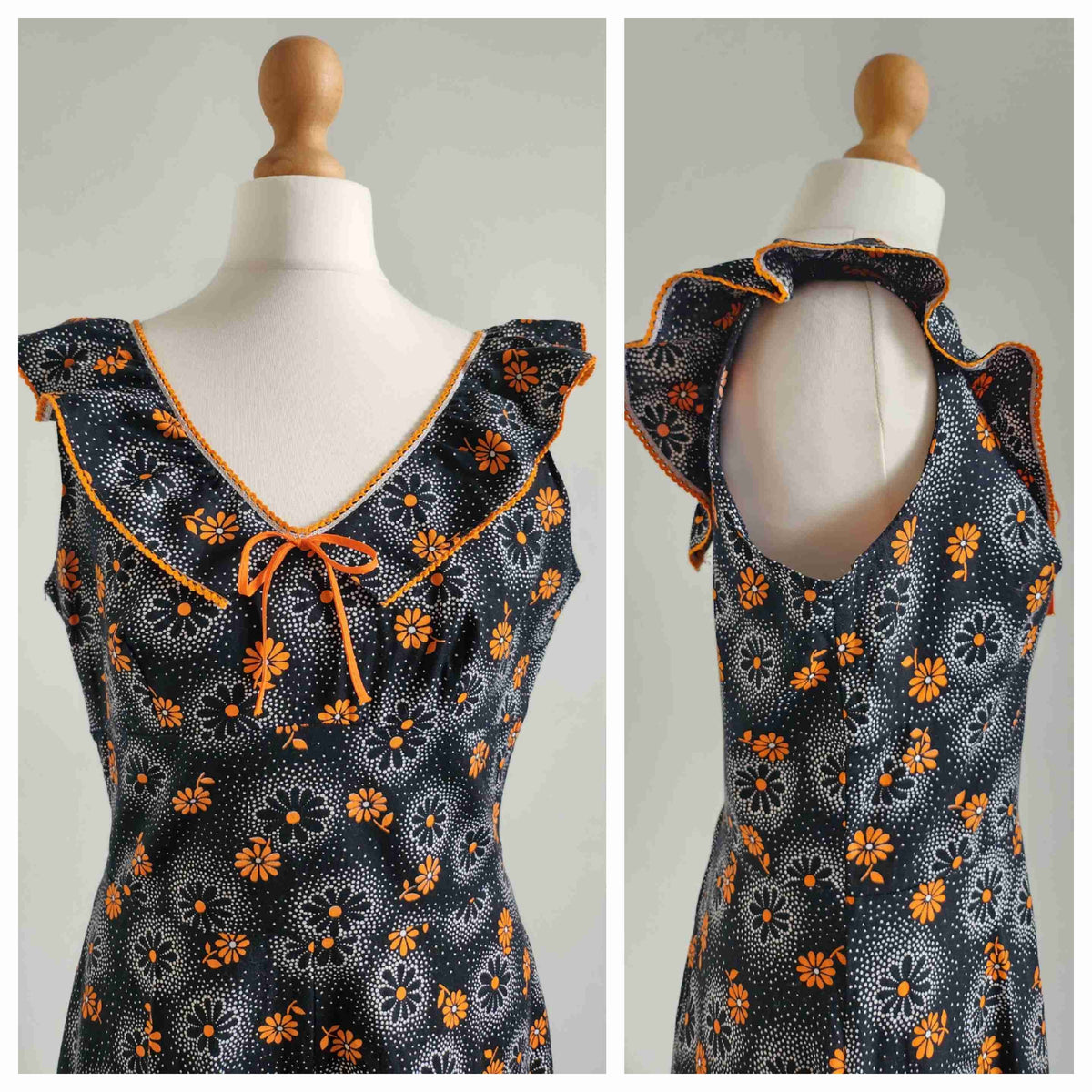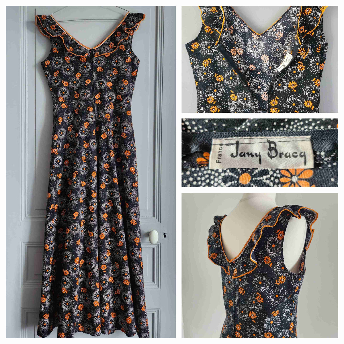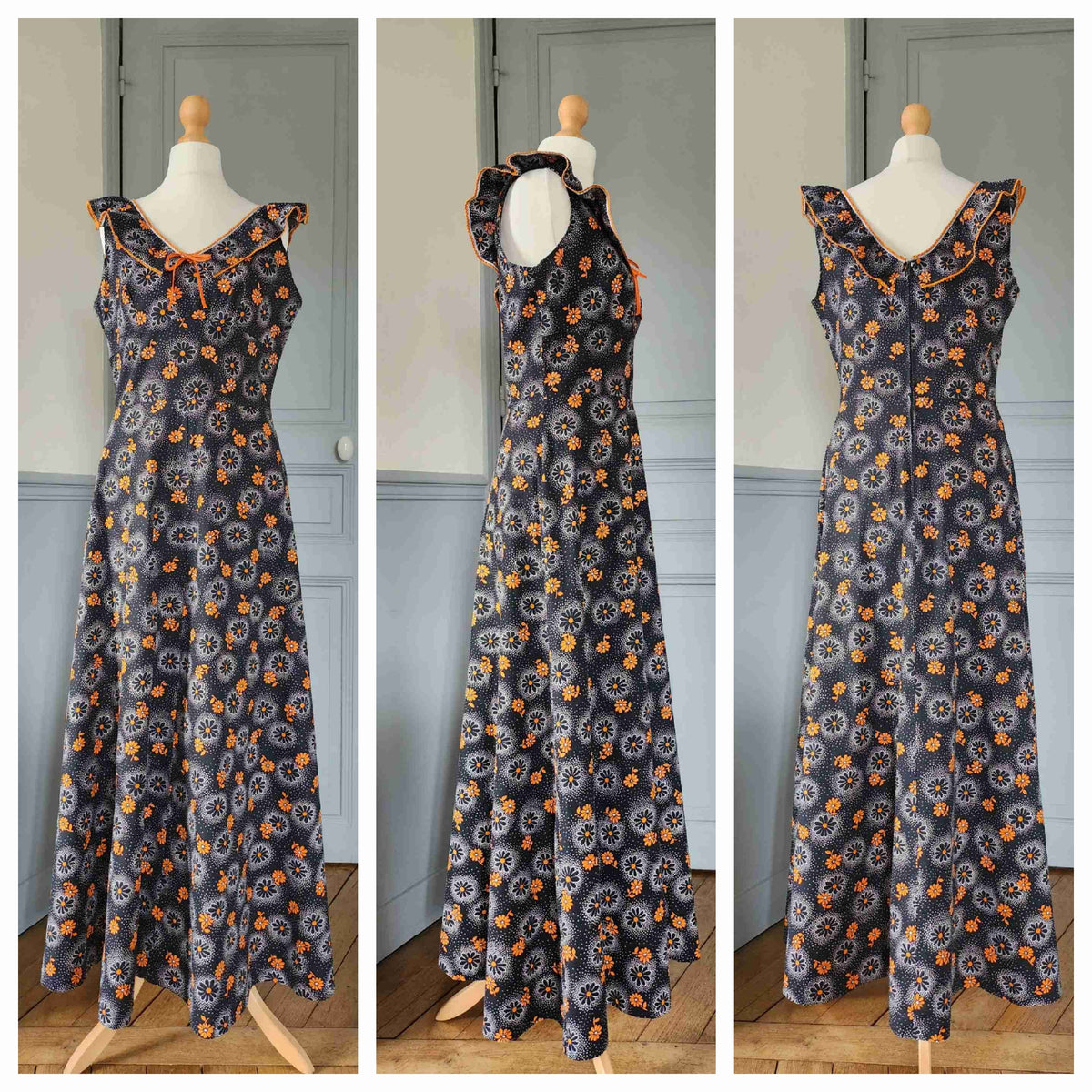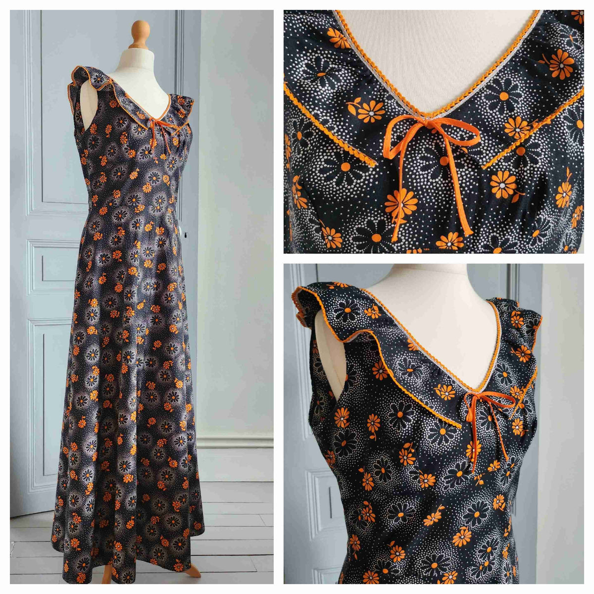 Prix unitaire parRobe longue à fleurs en coton imprimé marguerites orange, noir et blanc sur fond noir, sans manches, encolure V volantée, finition croquet au crochet orange, petit noeud fixe devant, empiecement taille haute marquée, jupon évasé. Fermeture éclair au dos.