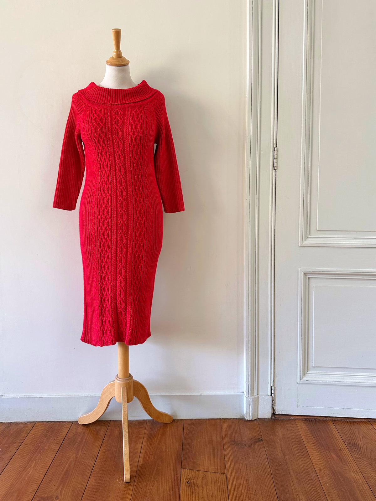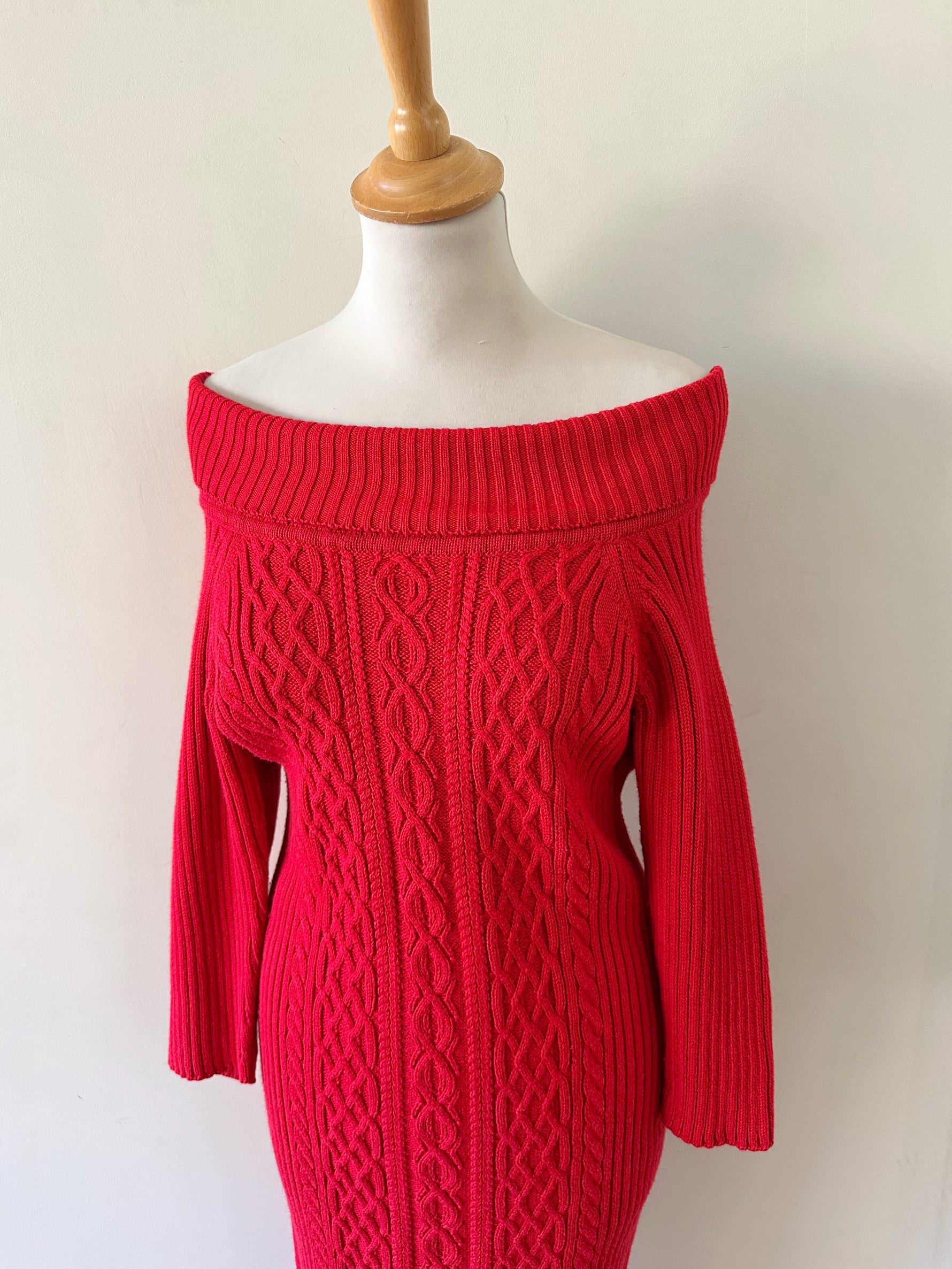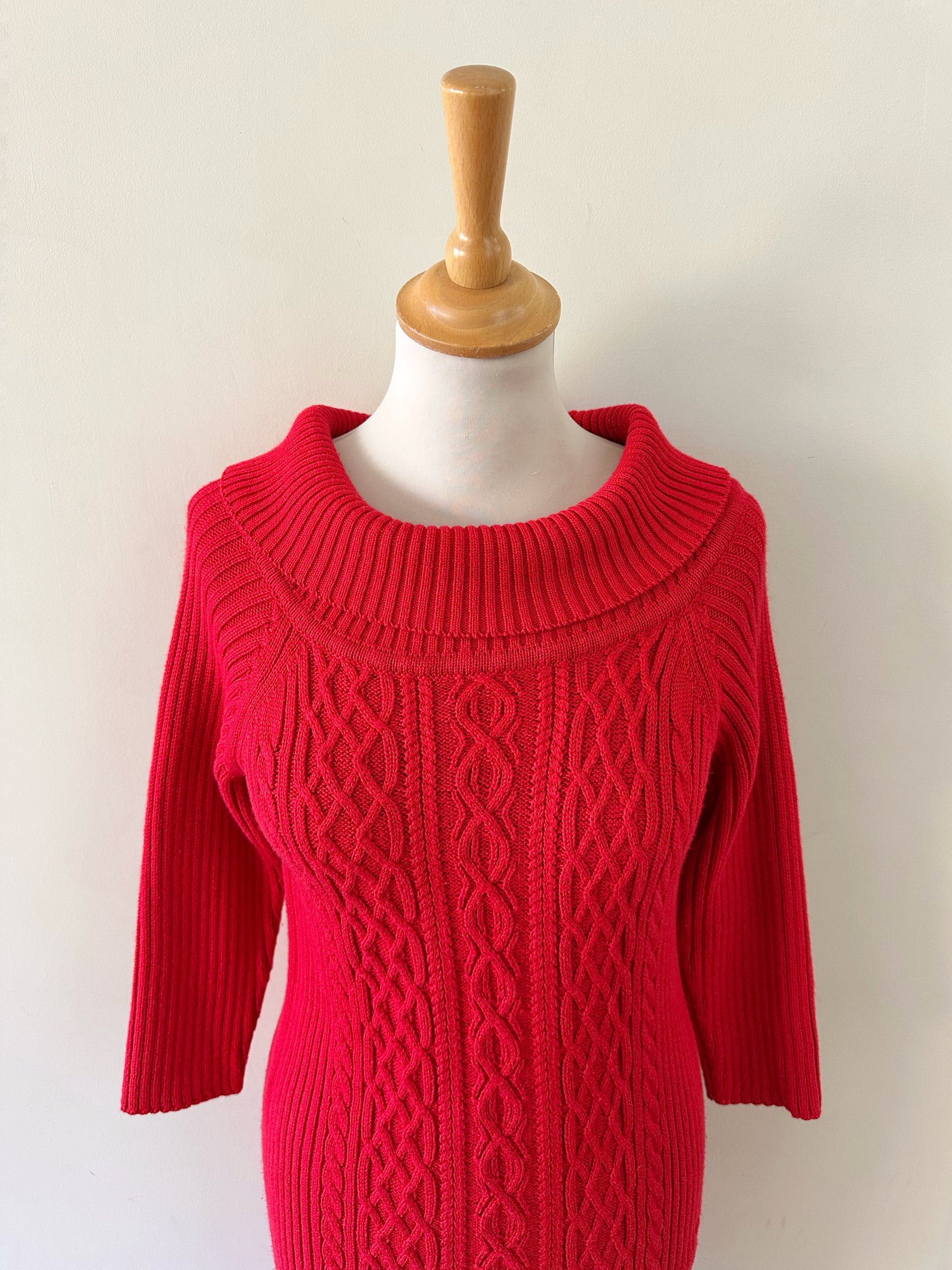 Robe longue en laine, maille torsadée et côtelée rouge, col à porter open-shoulder, manches 3/4, taille 36 portée ici sur un mannequin T36. Aisselles 44cm Longueur 120cm