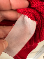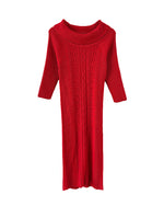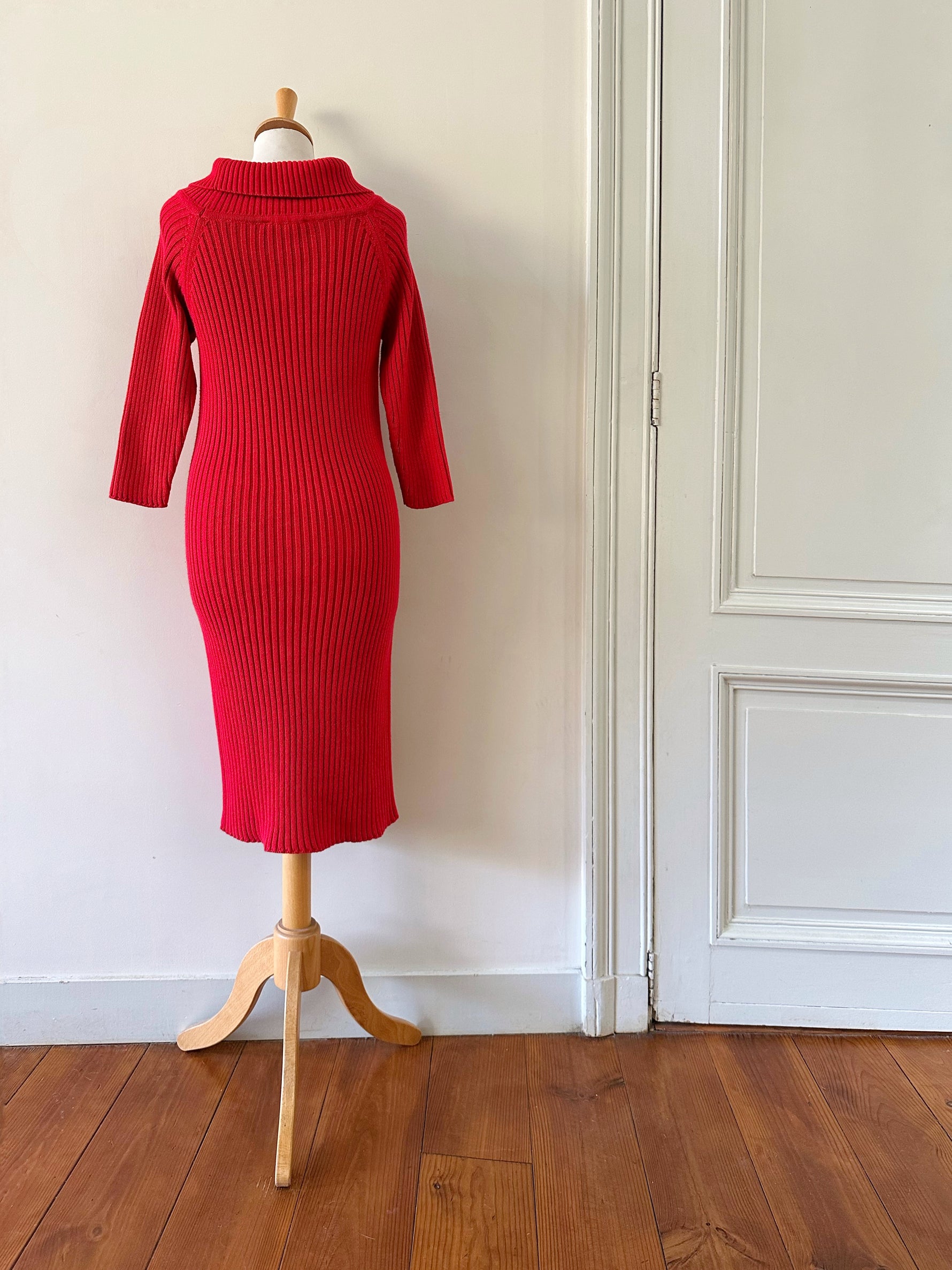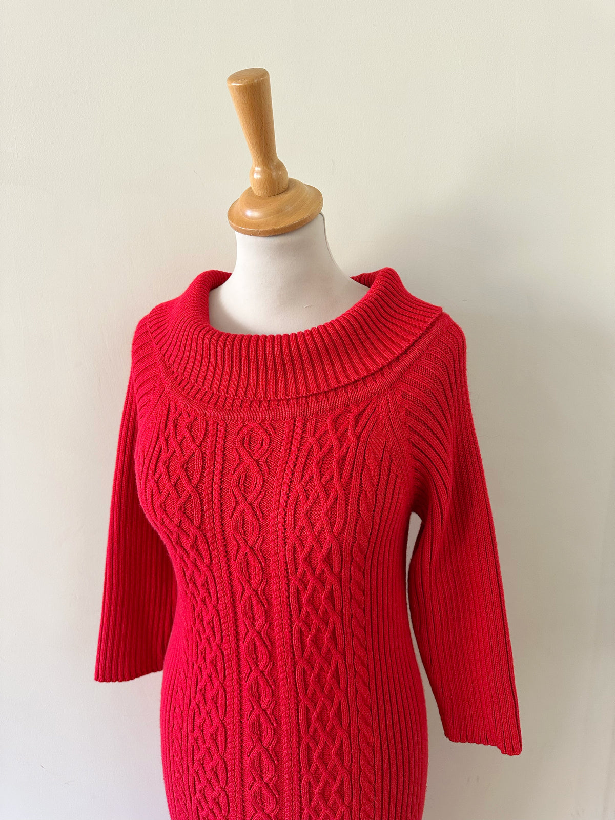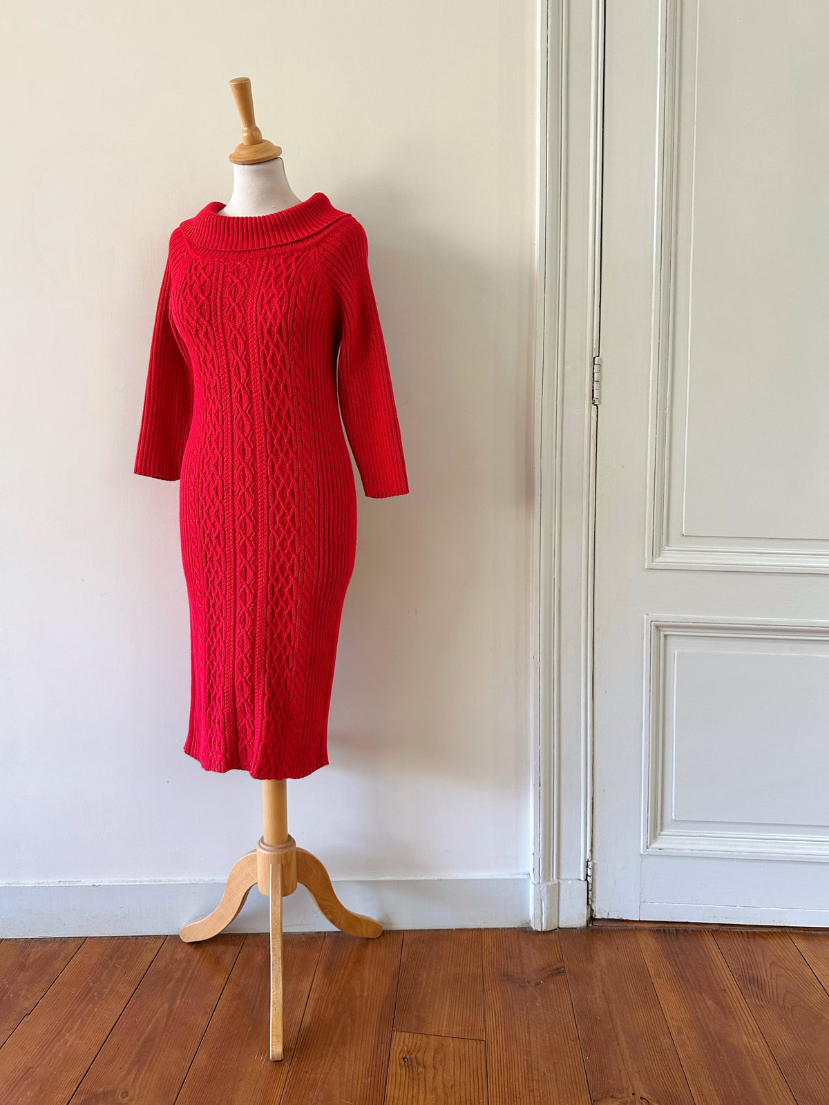 Robe longue en laine, maille torsadée et côtelée rouge, col à porter open-shoulder, manches 3/4, taille 36 portée ici sur un mannequin T36. Aisselles 44cm Longueur 120cm