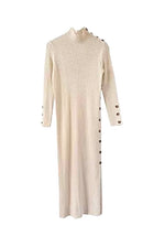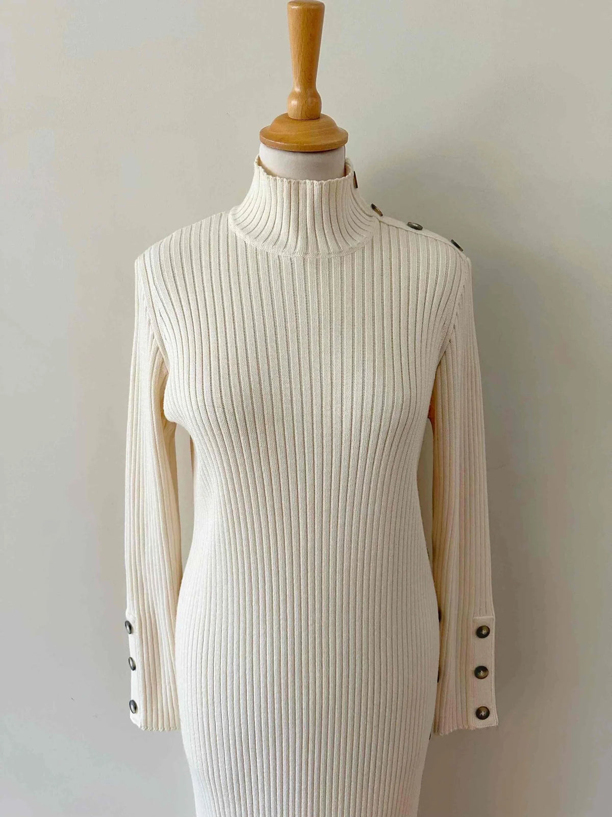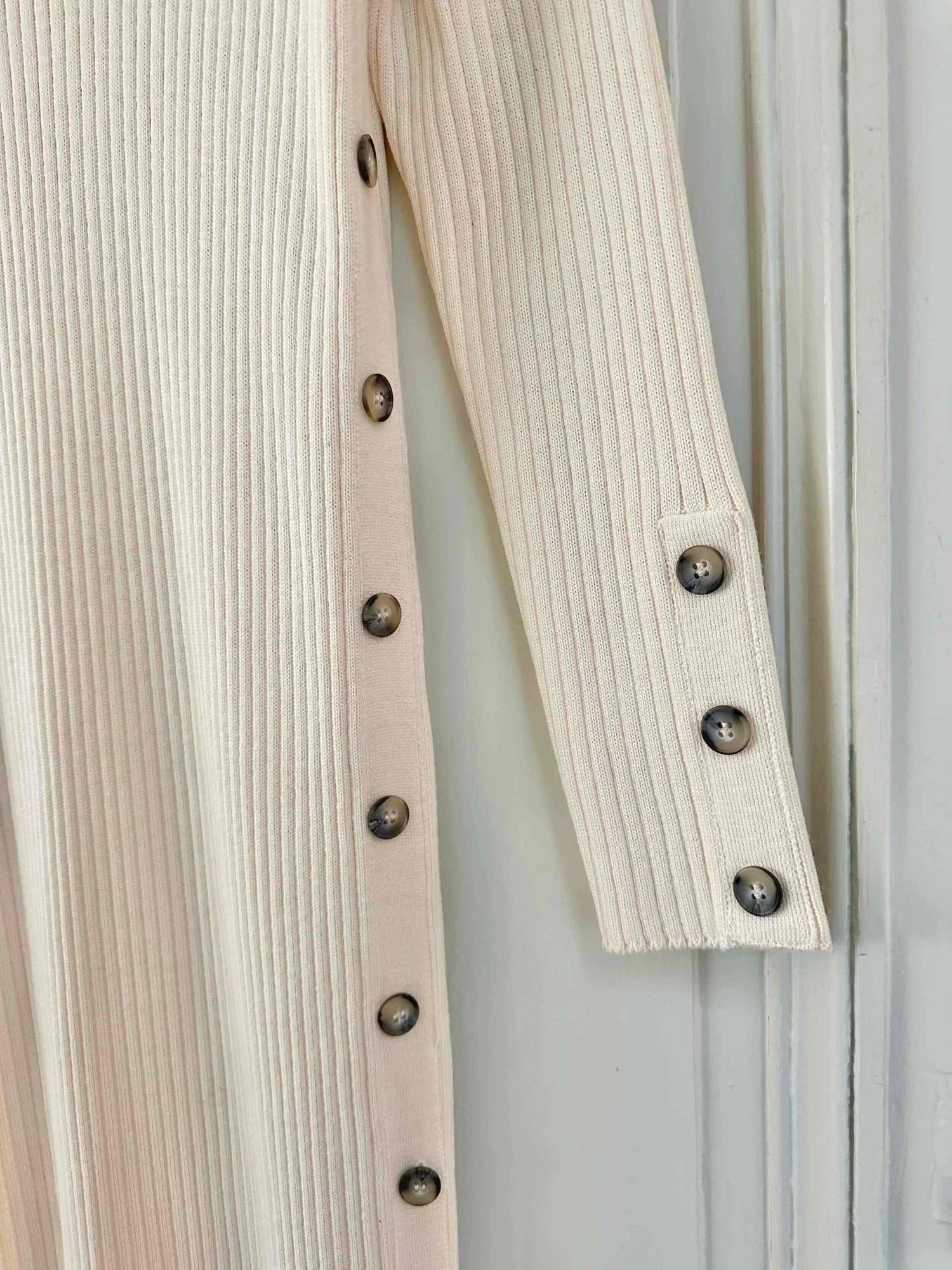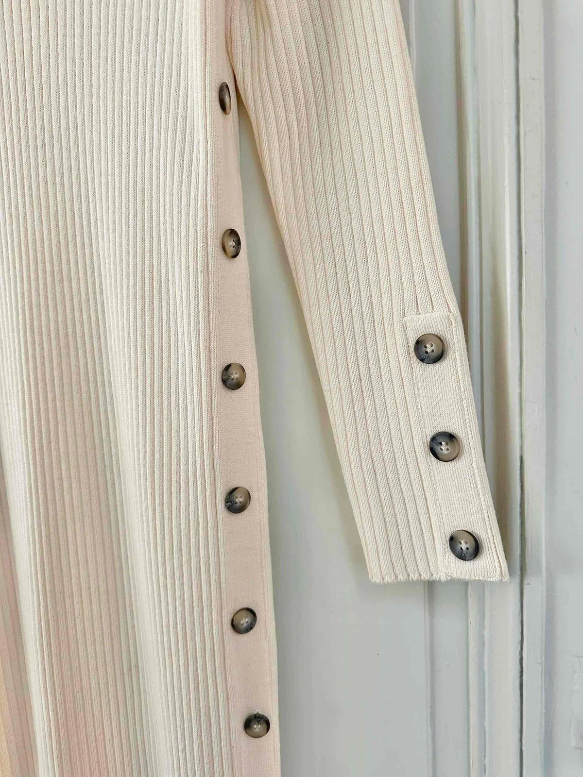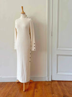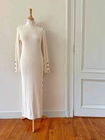 Robe longue en laine, maille cotelee écrue, col cheminé, details de boutons aux manches, à l'epaule, et sur un côté fendu, convient aux tailles 36 et 38 portée ici sur un mannequin T36. Aisselles 44cm Longueur 125cm
