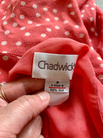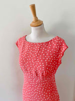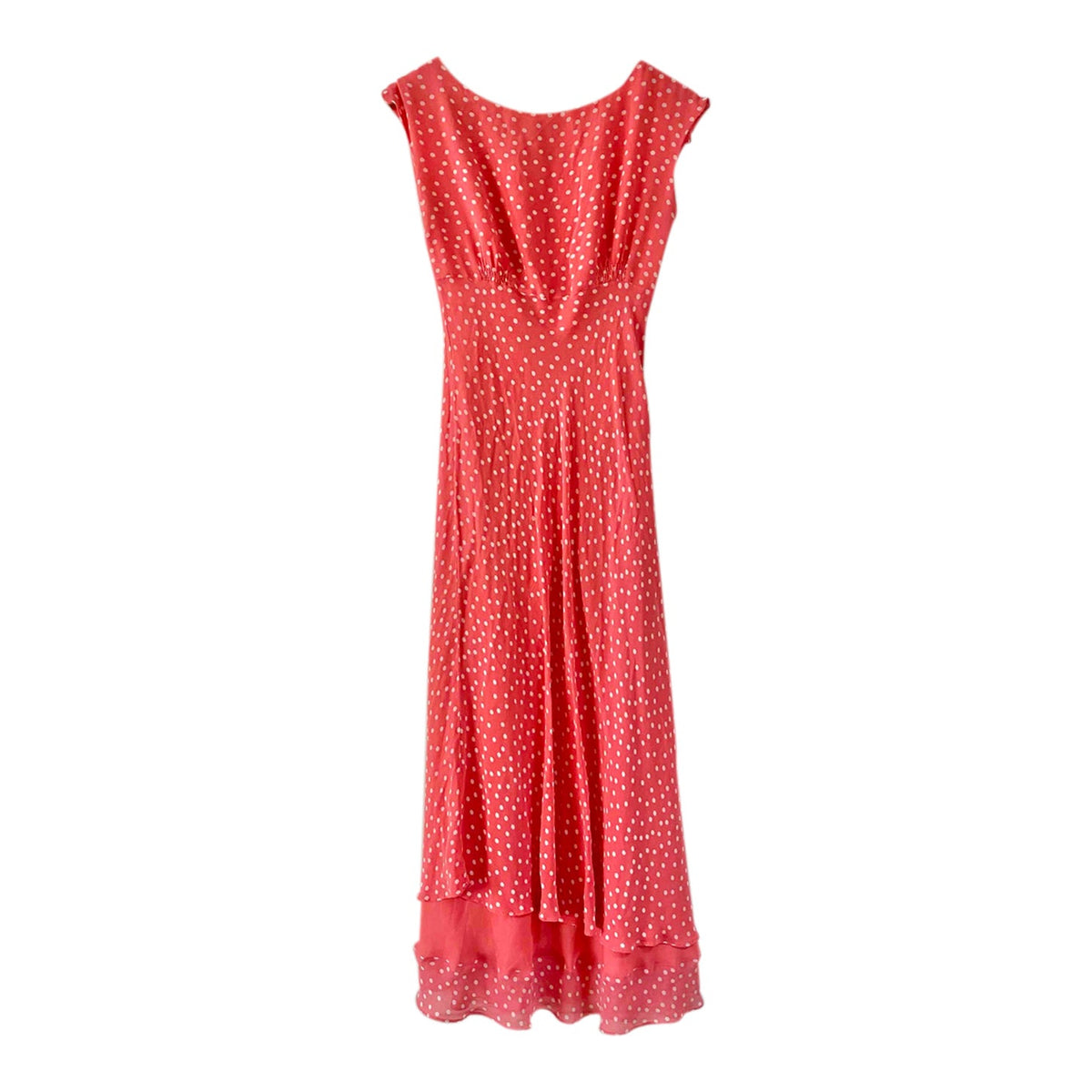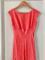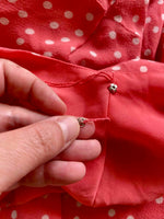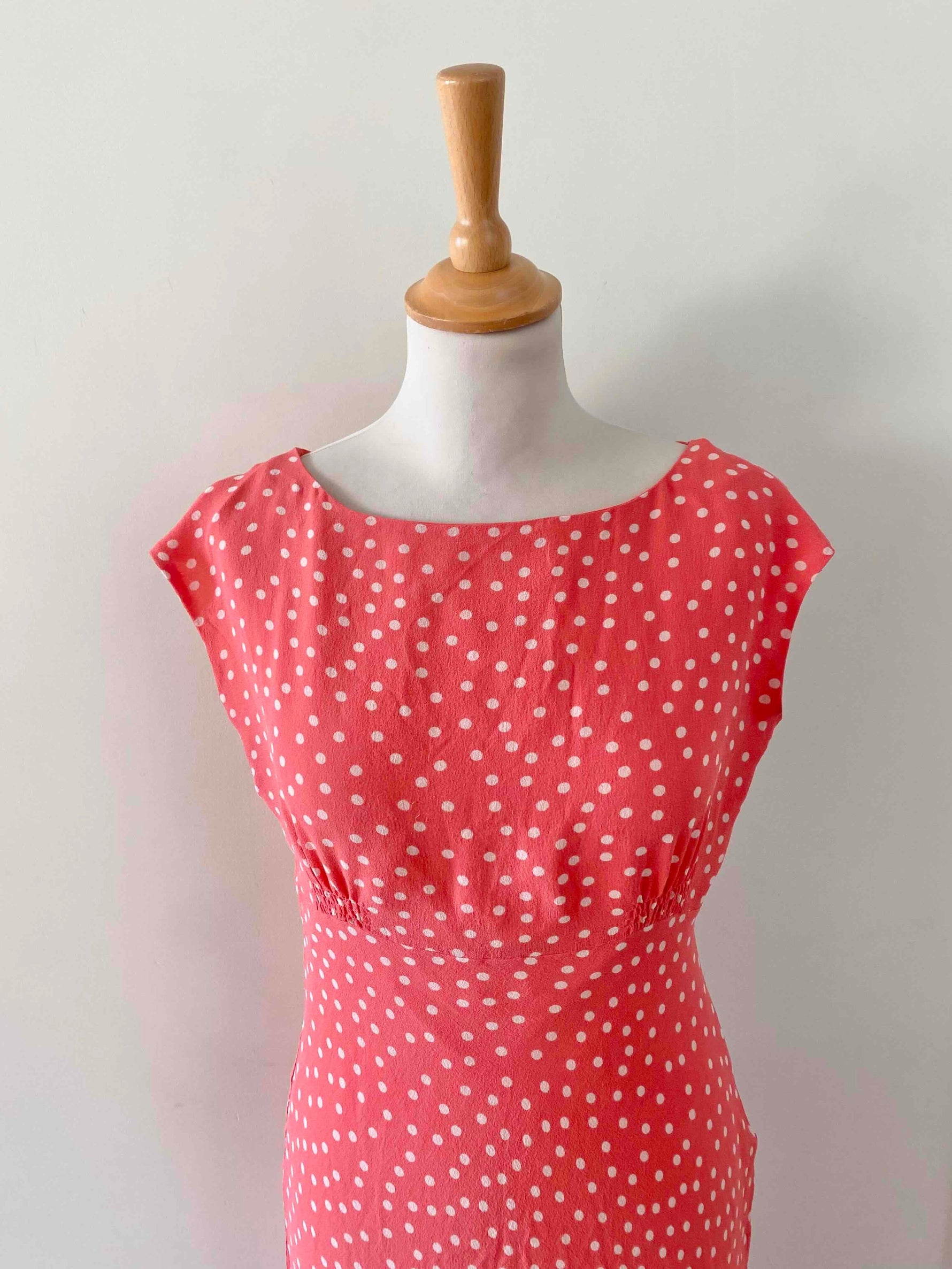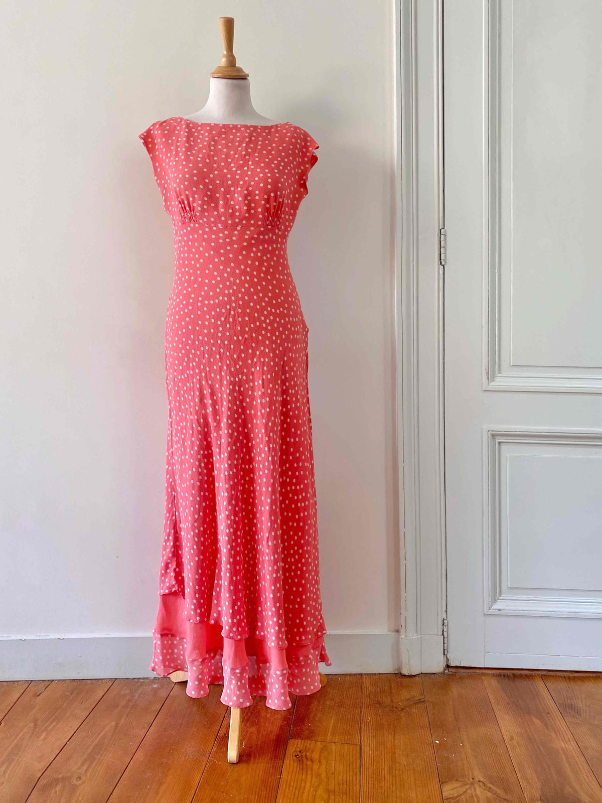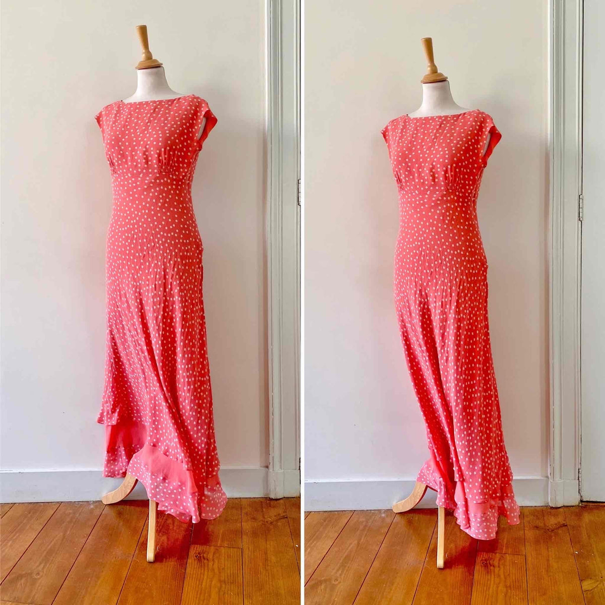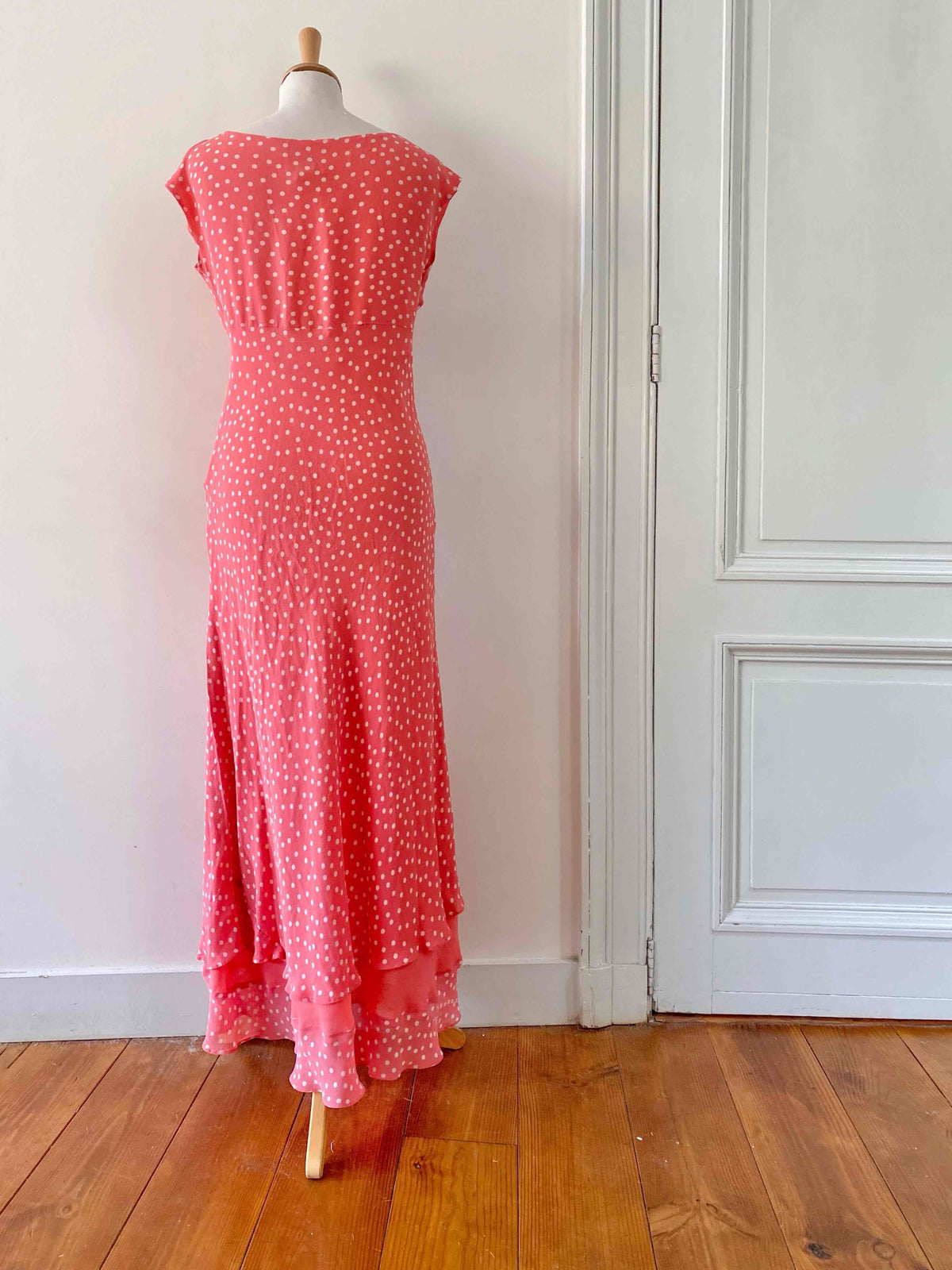 Prix unitaire parRobe longue en soie, mousseline de soie doublée en soie rose orangé imprimée pois blancs, découpe froncée sous poitrine, col rond et manches descendues, forme fit and flare volantée en bas, pressions sous épaules pour maintient de soutien-gorge, années 80’s, taille 36 portée ici sur un mannequin T36, aisselles 43cm.