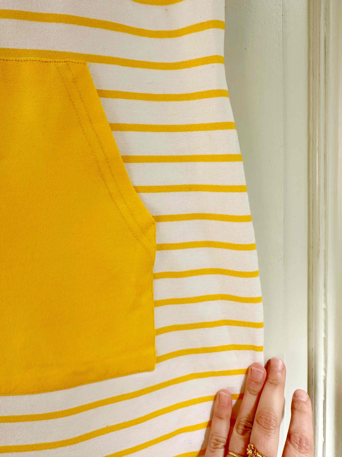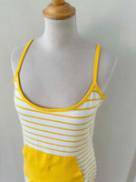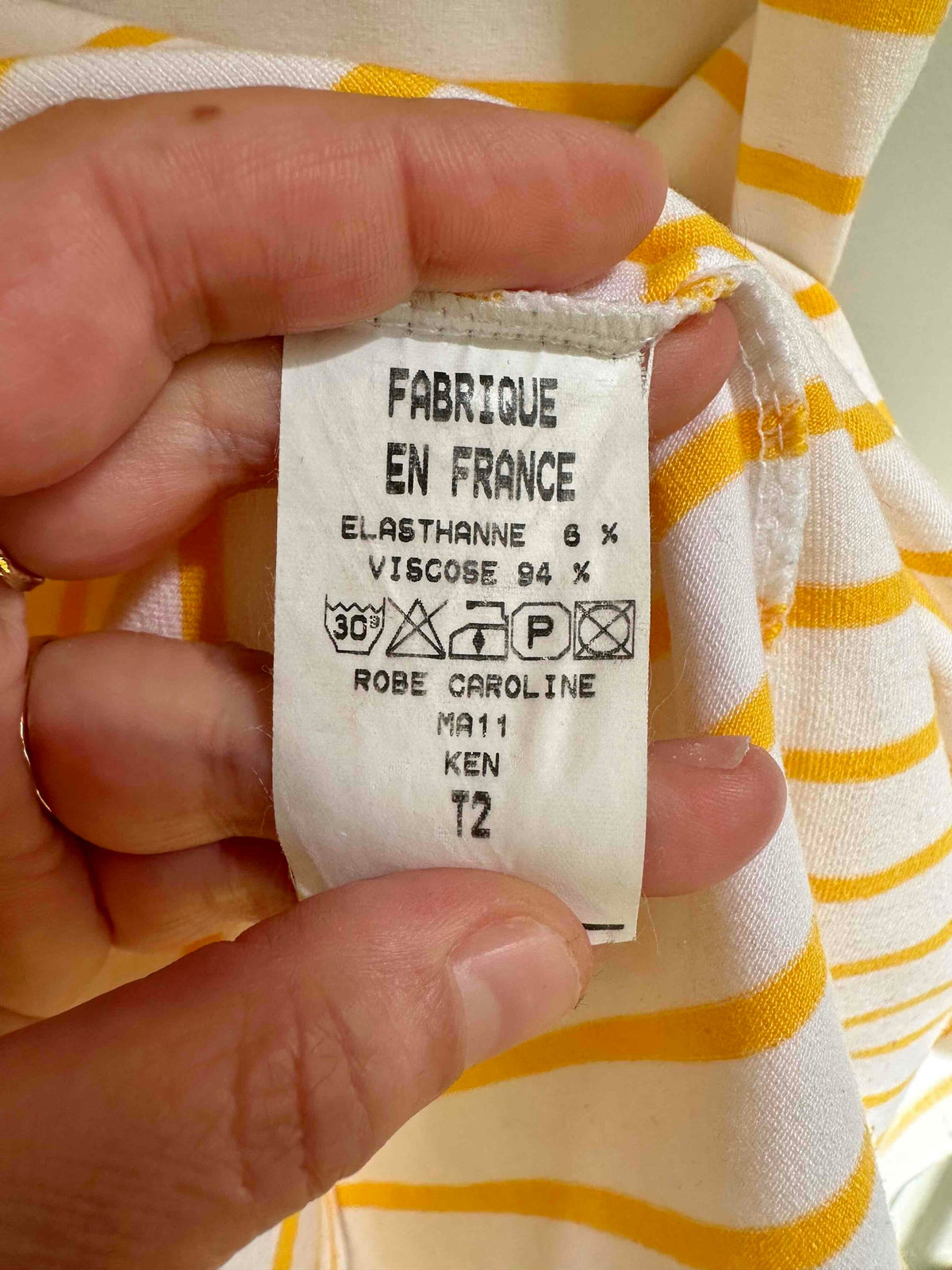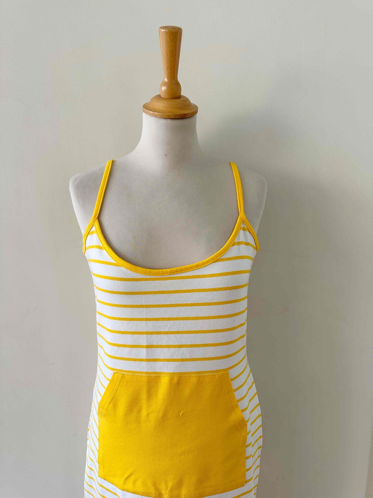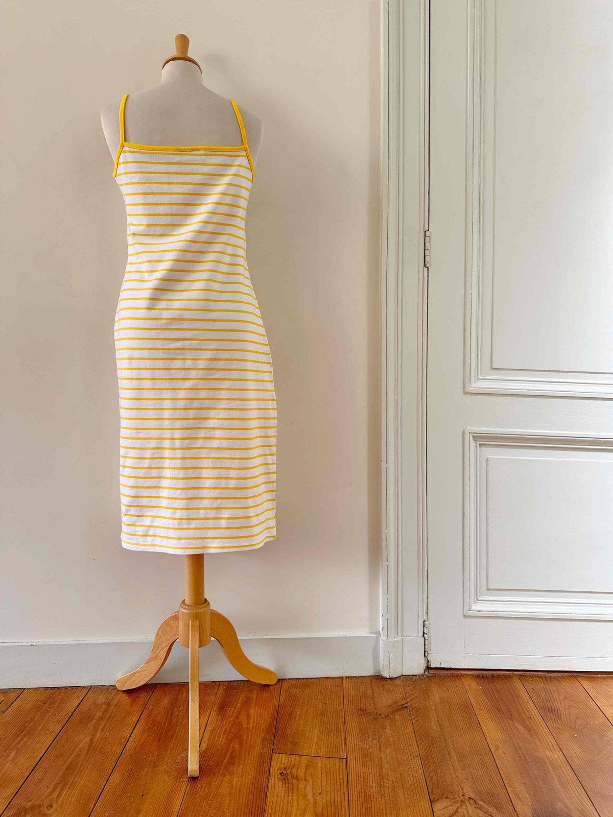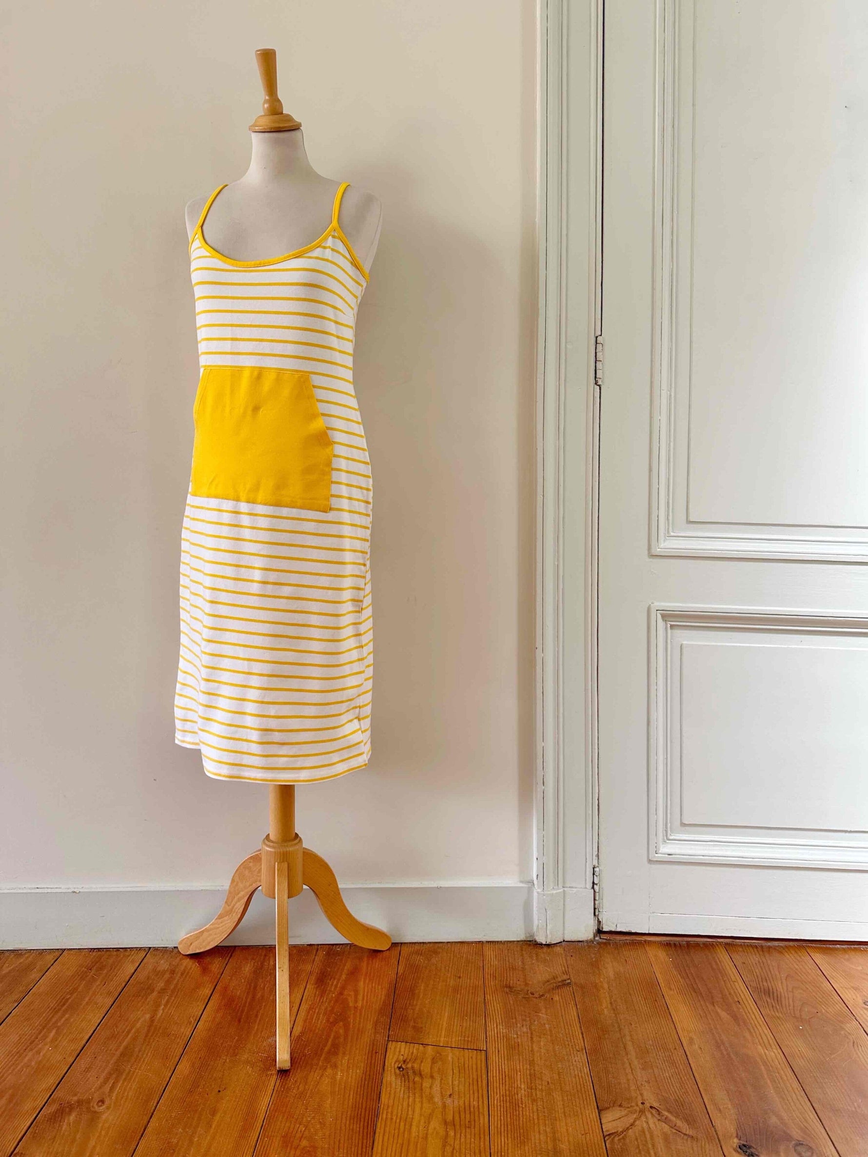 Robe marinière, en maille jersey viscose élasthanne, blanche à rayures marinières jaunes soleil, bretelles spaghettis, poche devant, fabriquée en France, taille 38, portée ici sur un mannequin T36.