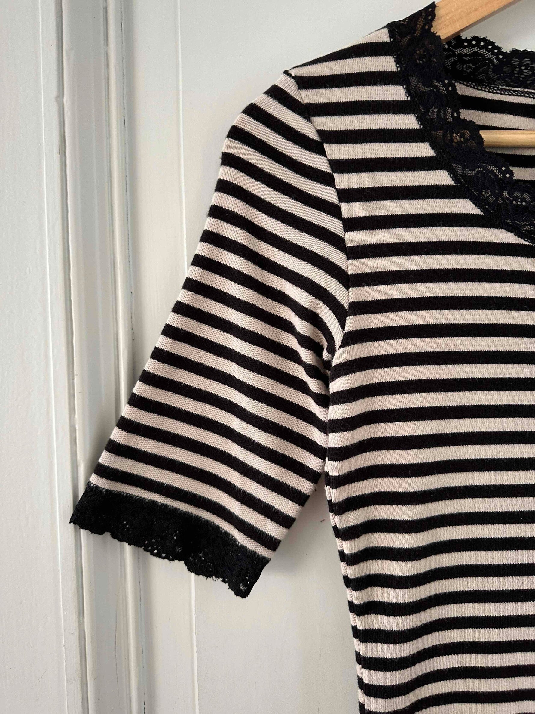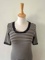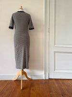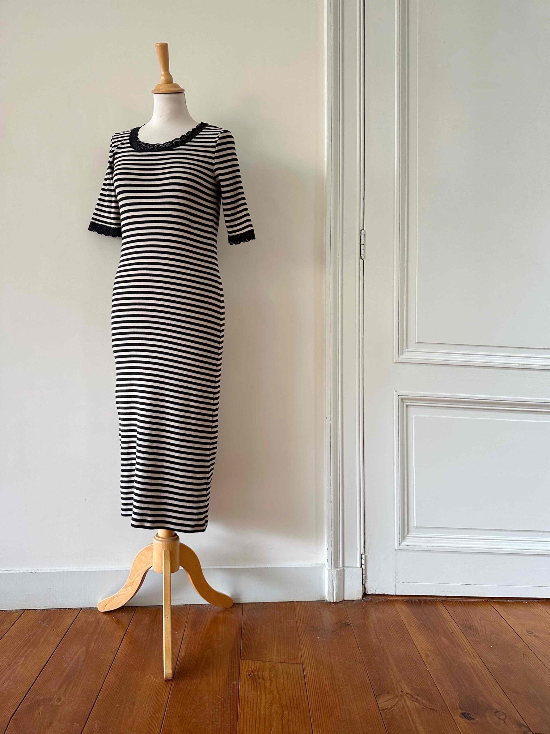 Robe longue marinière, en jersey 100% coton, rayures écru beige et noires, encolure ronde et manches courtes bordées de dentelle noire, fabriquée en France, taille 38, portée ici sur un mannequin T36.