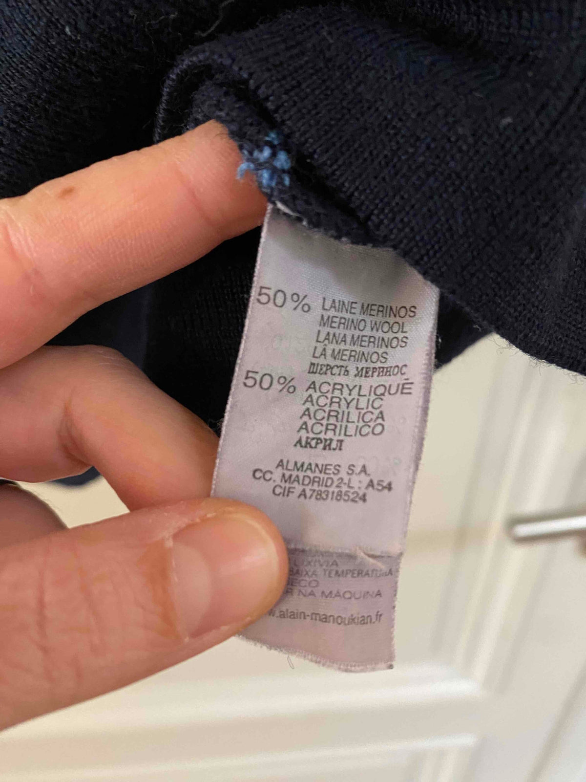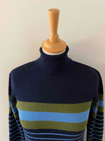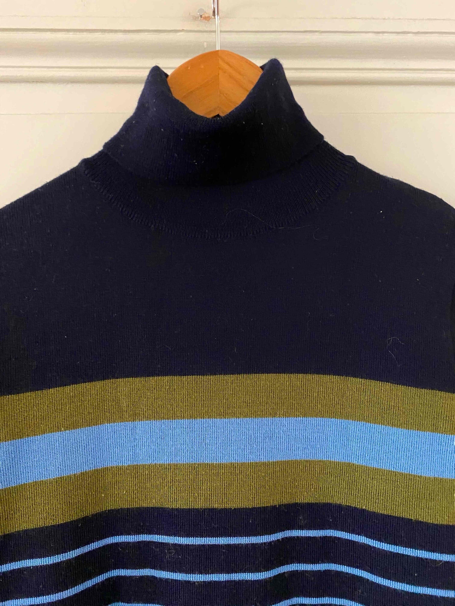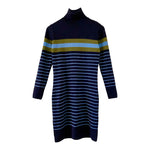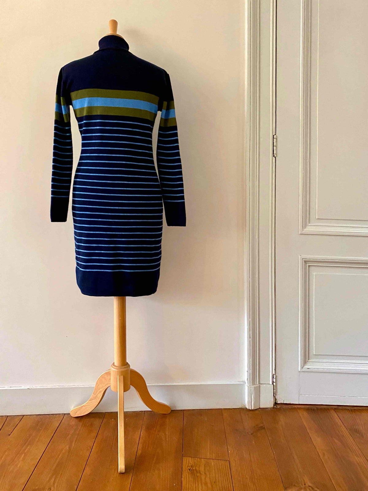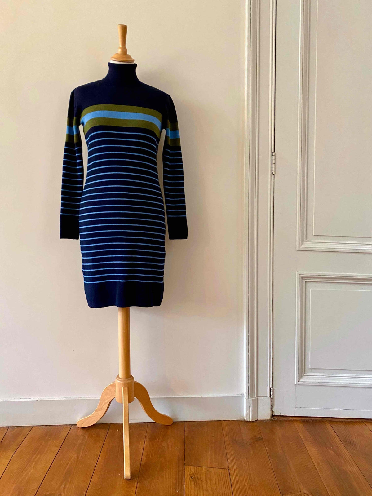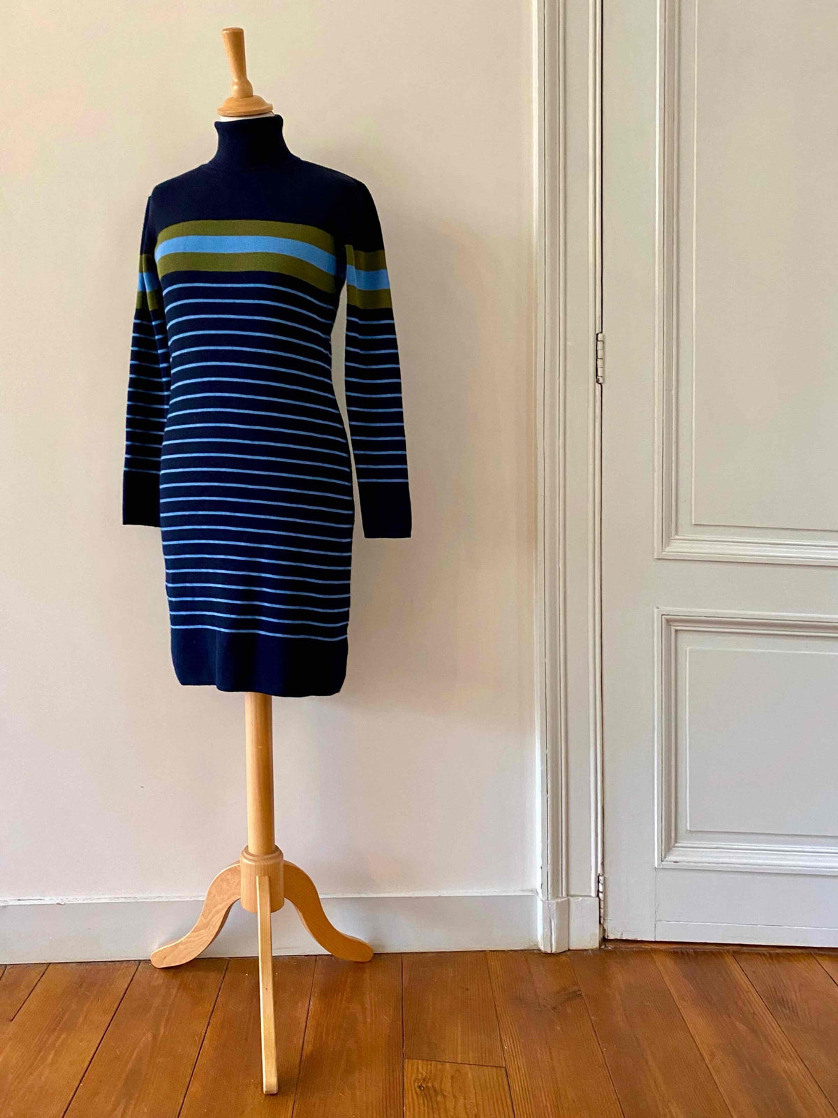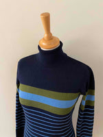 Robe marinière en laine, laine merinos mélangée bleue marine, rayures marinières bleues ciel et vert olive, col roulé, taille 36 portée ici sur un mannequin T36.