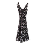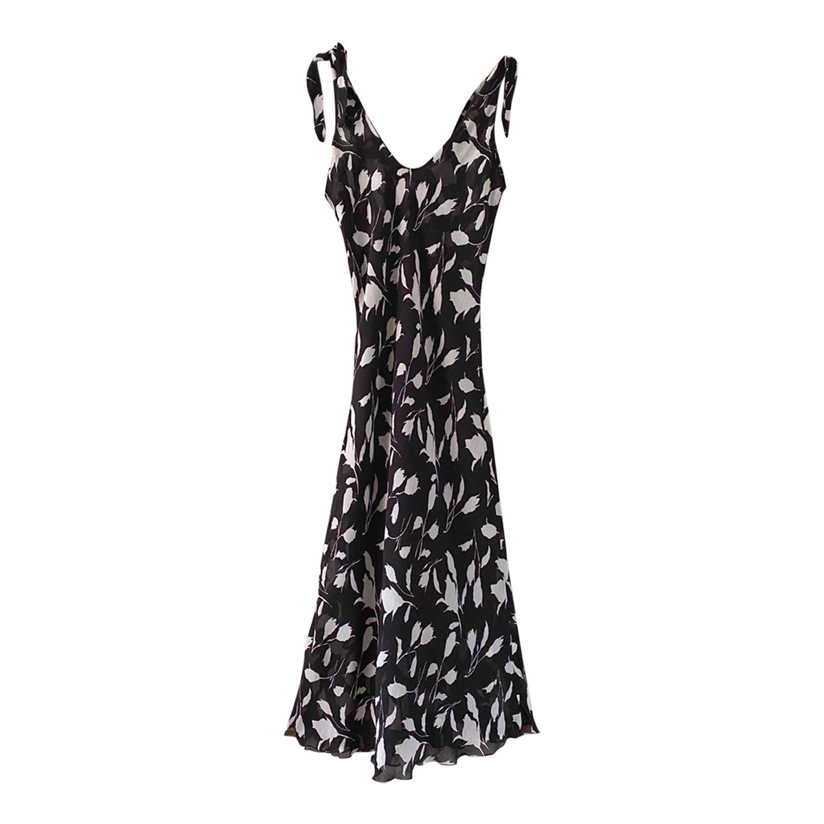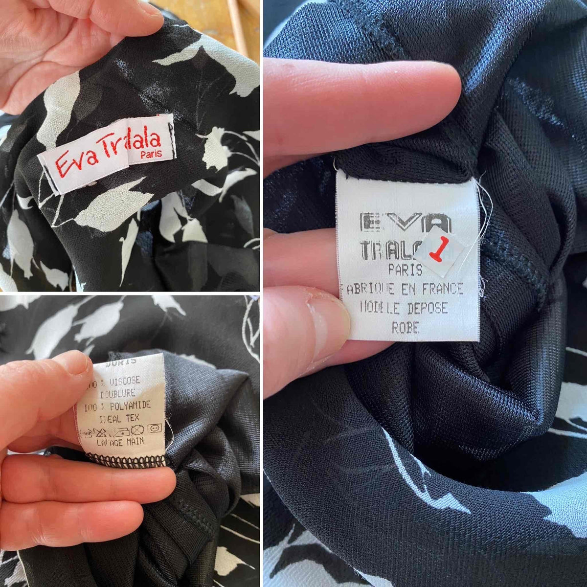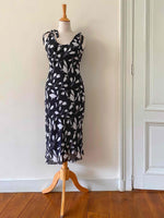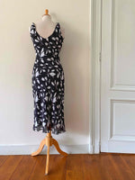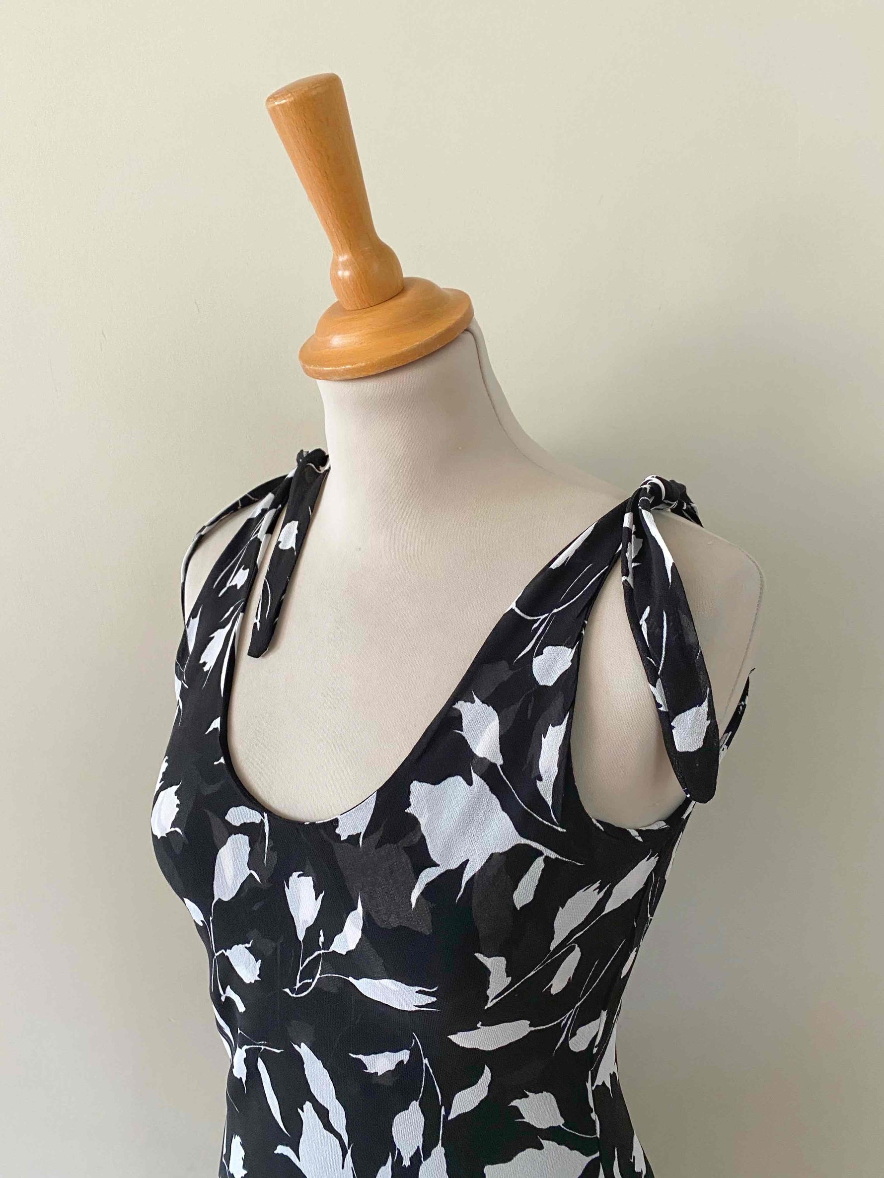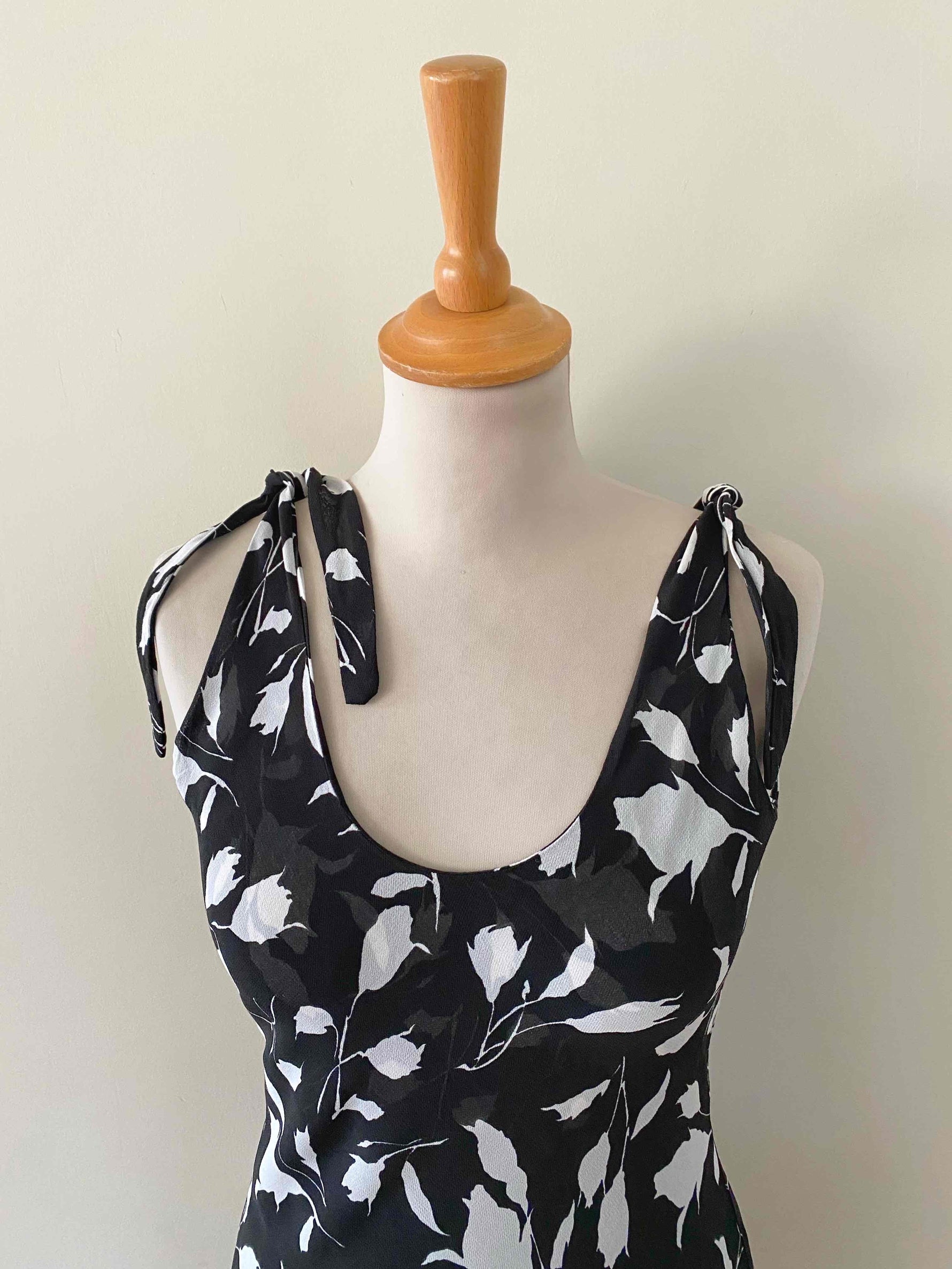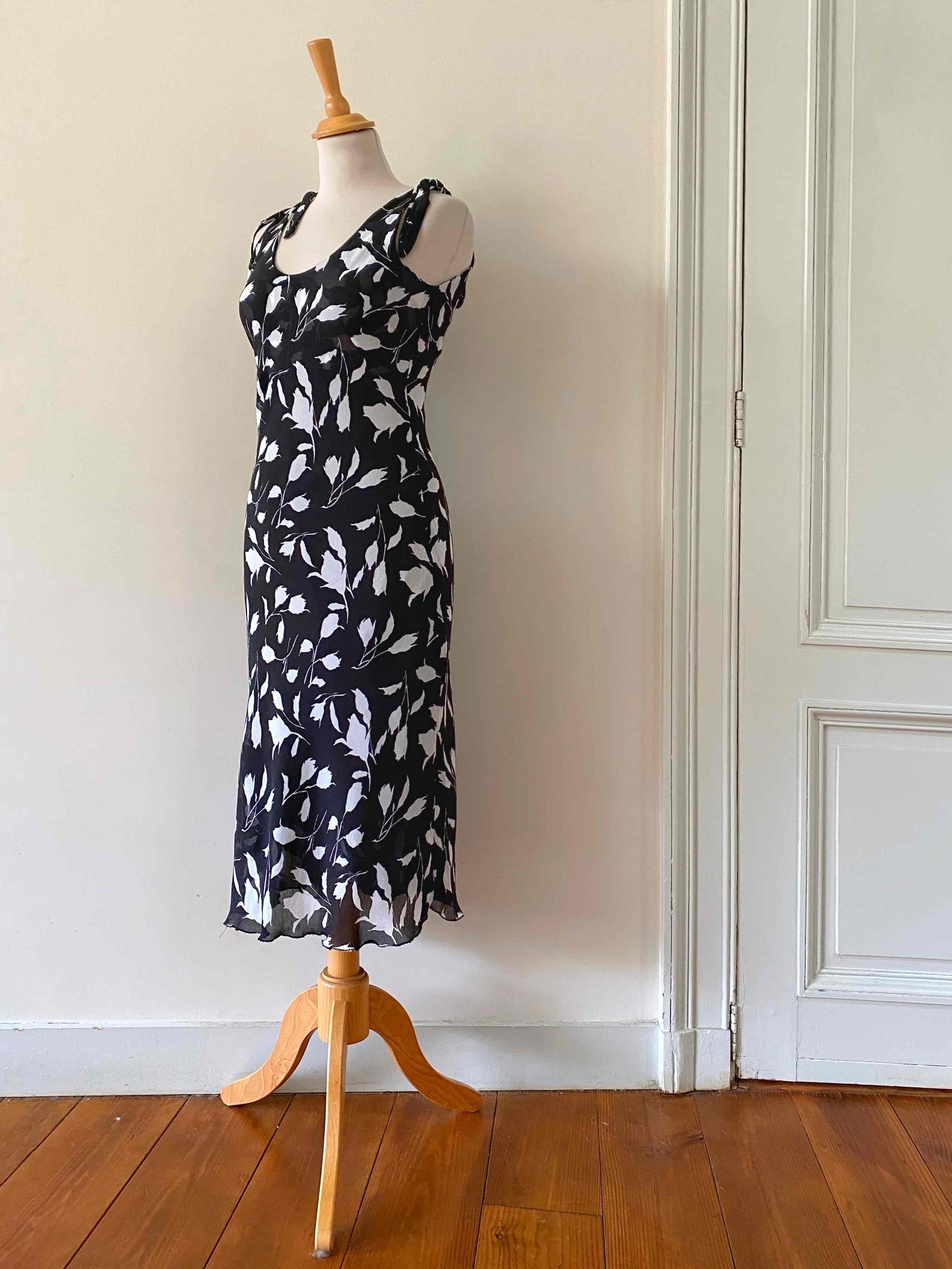 Prix unitaire parRobe midi à fleurs, en voile viscose doublée noire imprimée fleurs blanches, bretelles à nouer, forme fit and flare en biais, fabriquée en France, taille 34 et 36 portée ici sur un mannequin T36, aisselles 42cm.