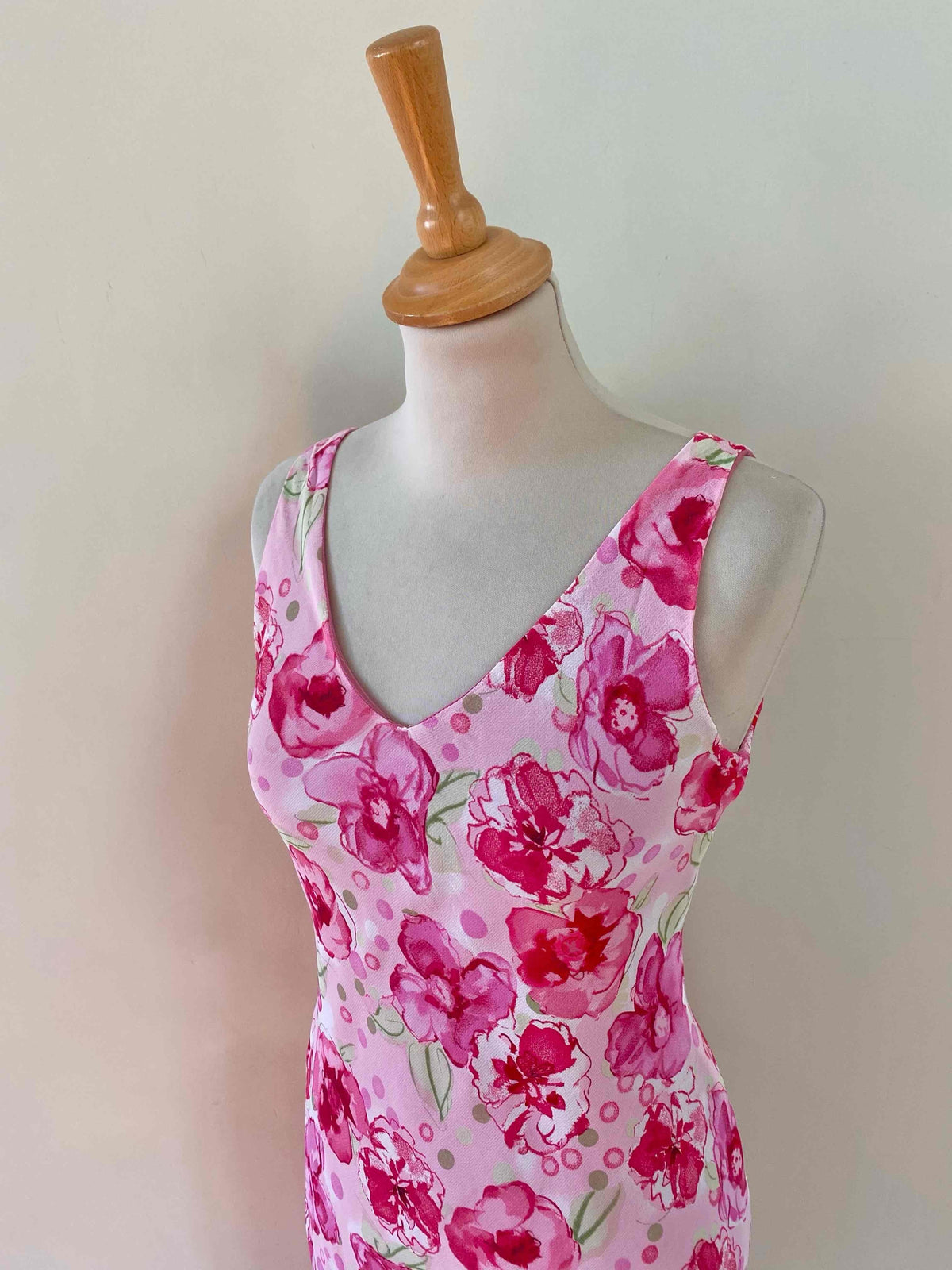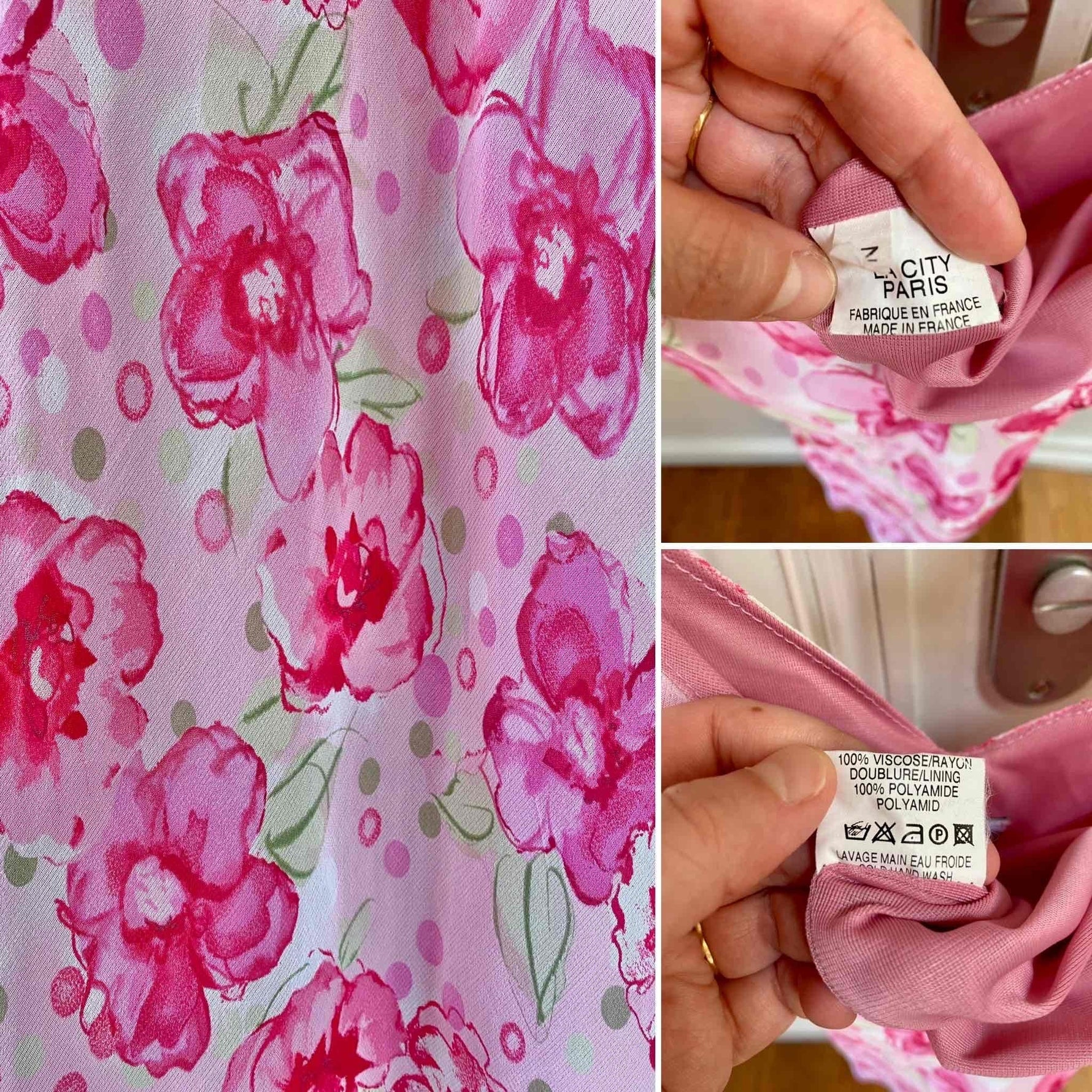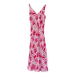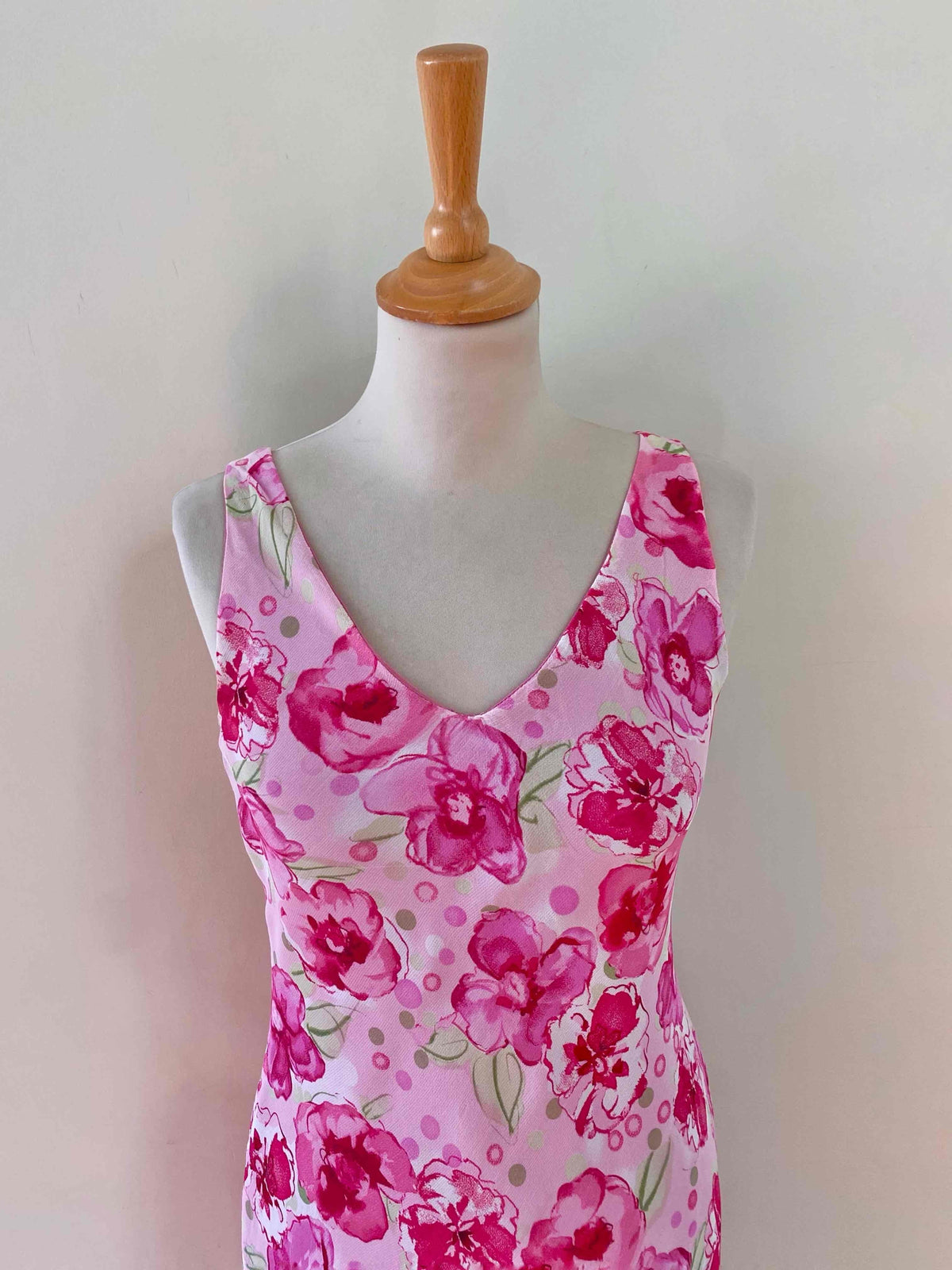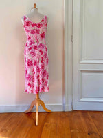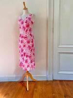 Prix unitaire parRobe midi à fleurs en voile viscose doublée rose pâle imprimée fleurs et pois roses fuschias, rose pastel et vert anis, encolure V, forme fit and flare en biais, fabriquée en France, taille 34 et 36 porté ici sur un mannequin T36, aisselles 42cm.