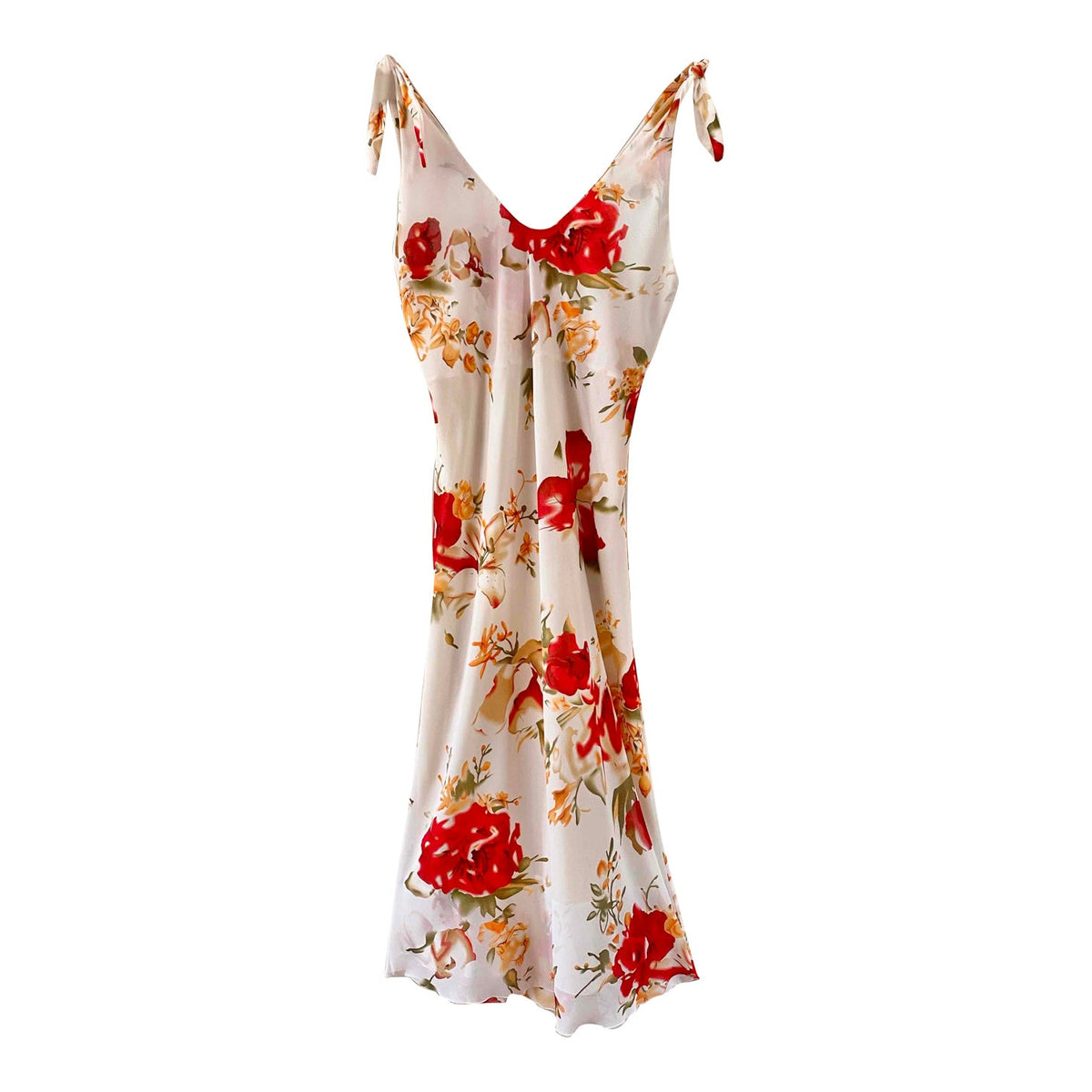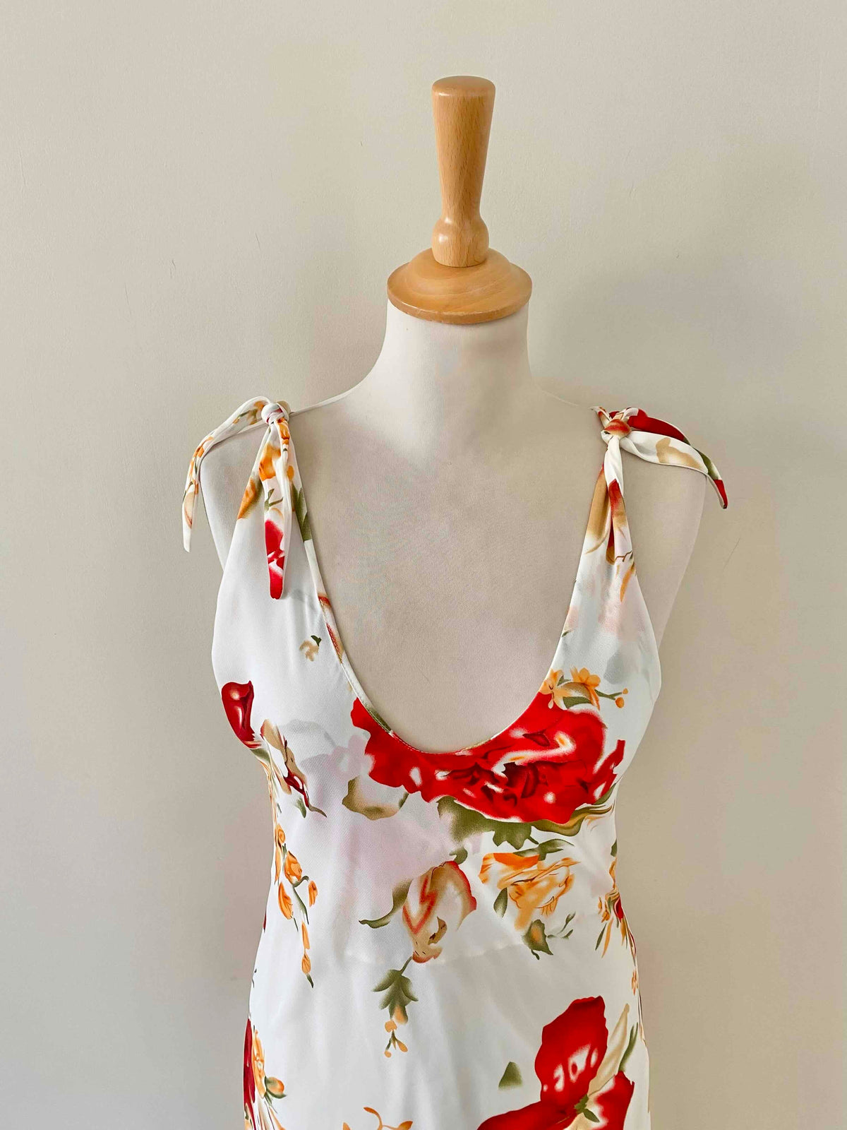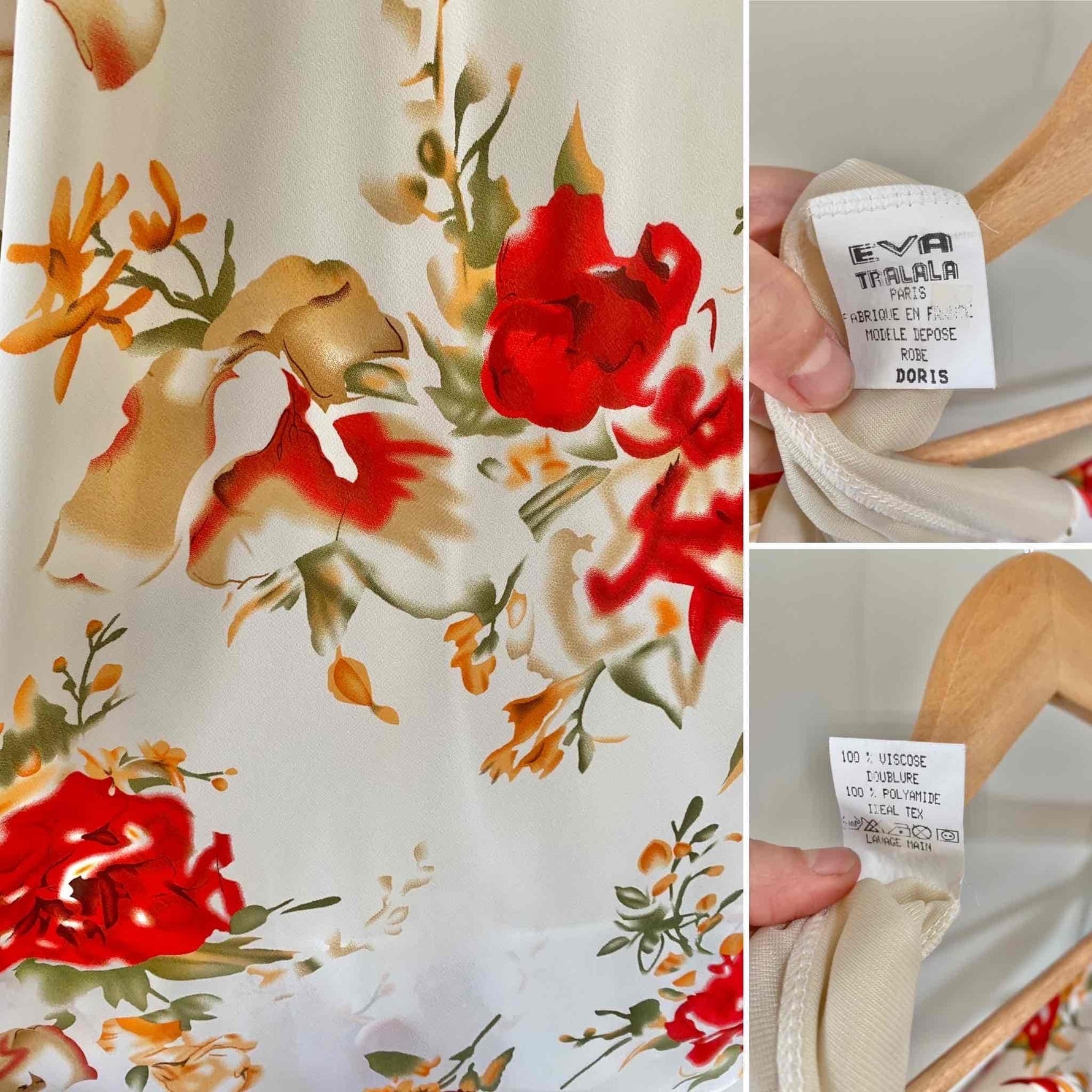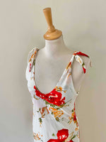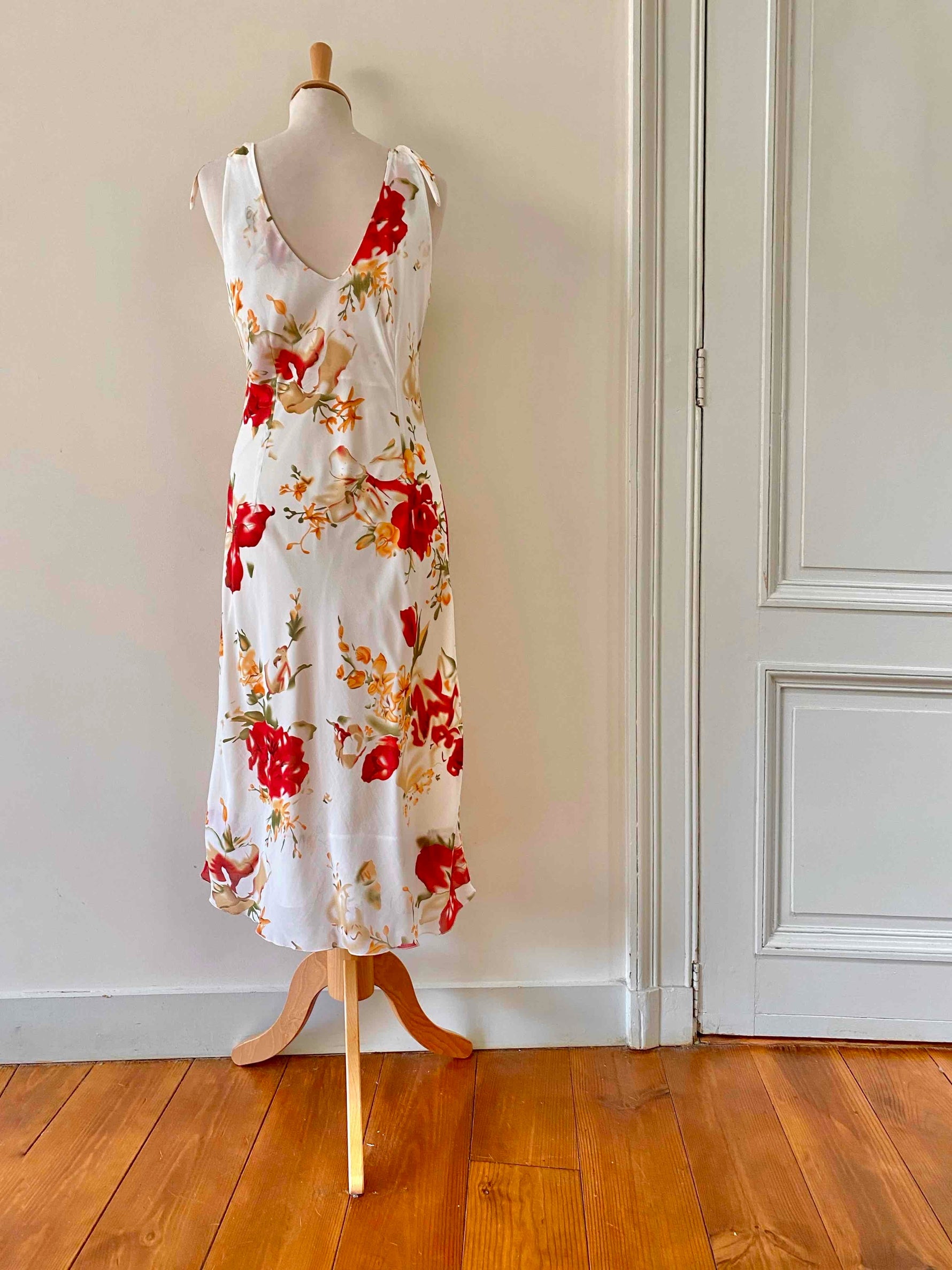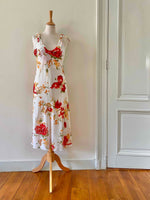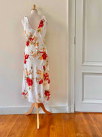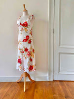 Robe midi à fleurs, en voile viscose doublée blanc imprimée fleurs rouges, jaunes et vertes aquarellées bretelles à nouer, forme fit and flare en biais, fabriquée en France, taille 38 portée ici sur un mannequin T36, aisselles 45cm.