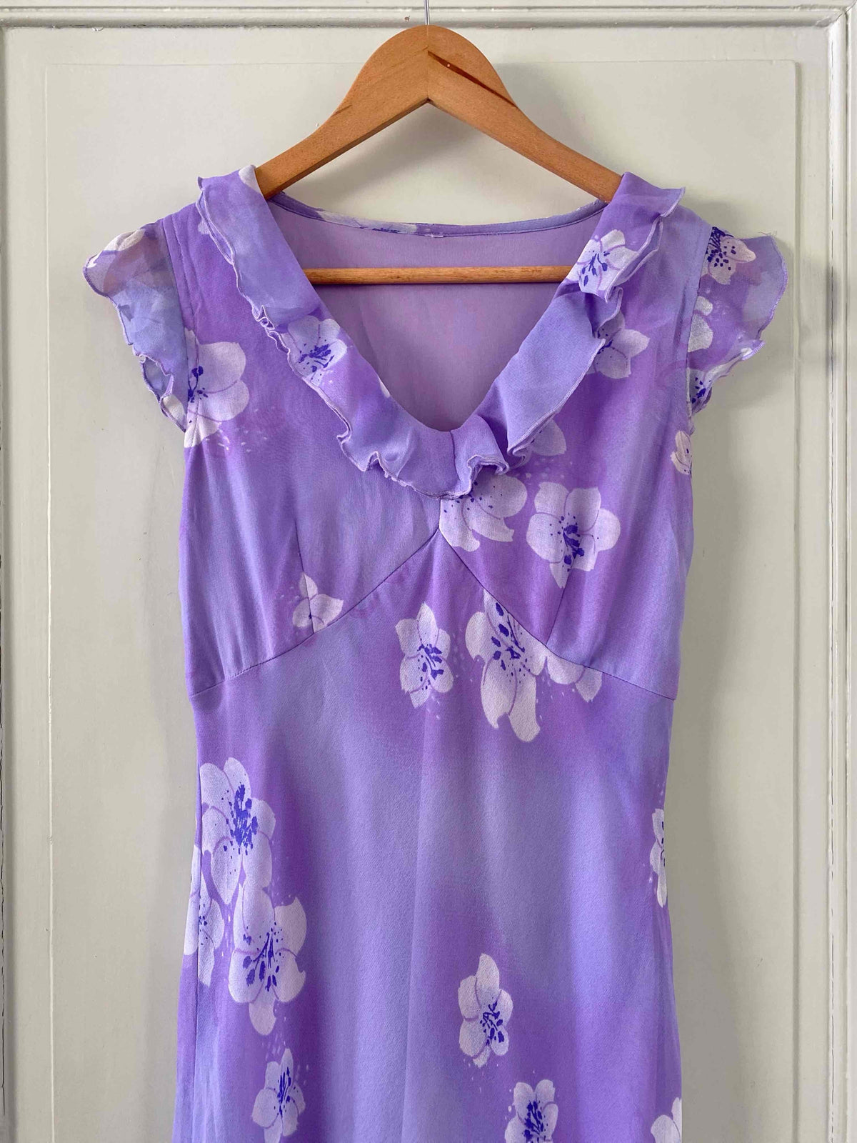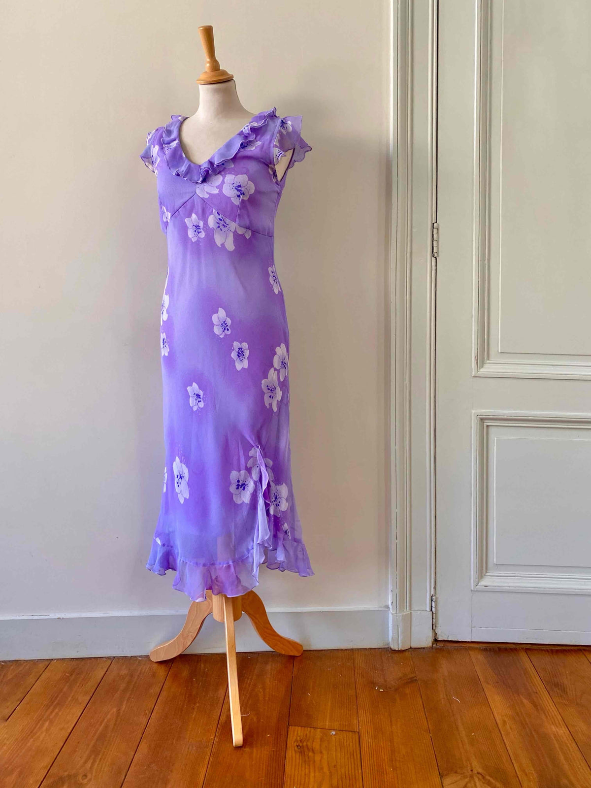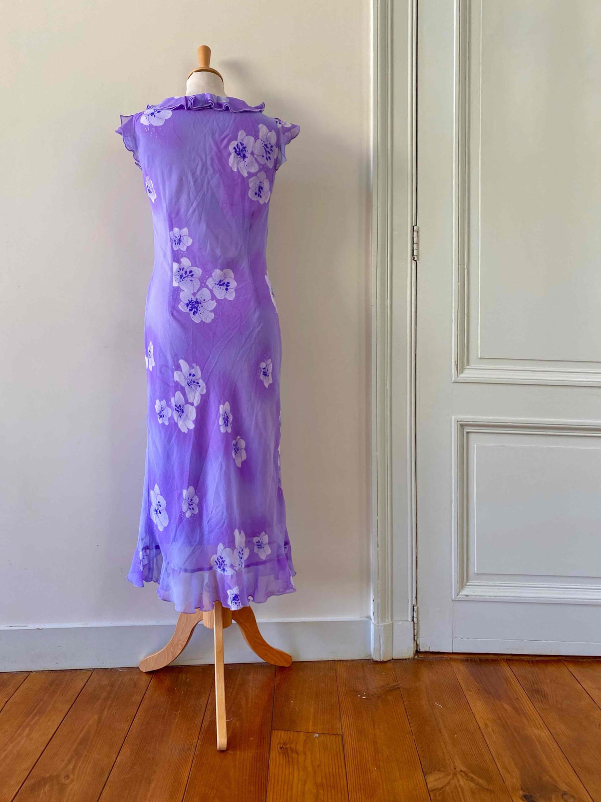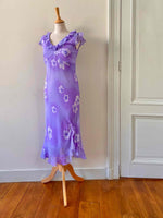 Prix unitaire parRobe midi à fleurs en voile viscose lilas imprimée fleurs violettes et lilas pastel, encolure V volantée et emmanchures volantées, bas fendu volanté, forme fit and flare en biais, fabriquée en France, taille 36 portée ici sur un mannequin T36, aisselles 43cm.