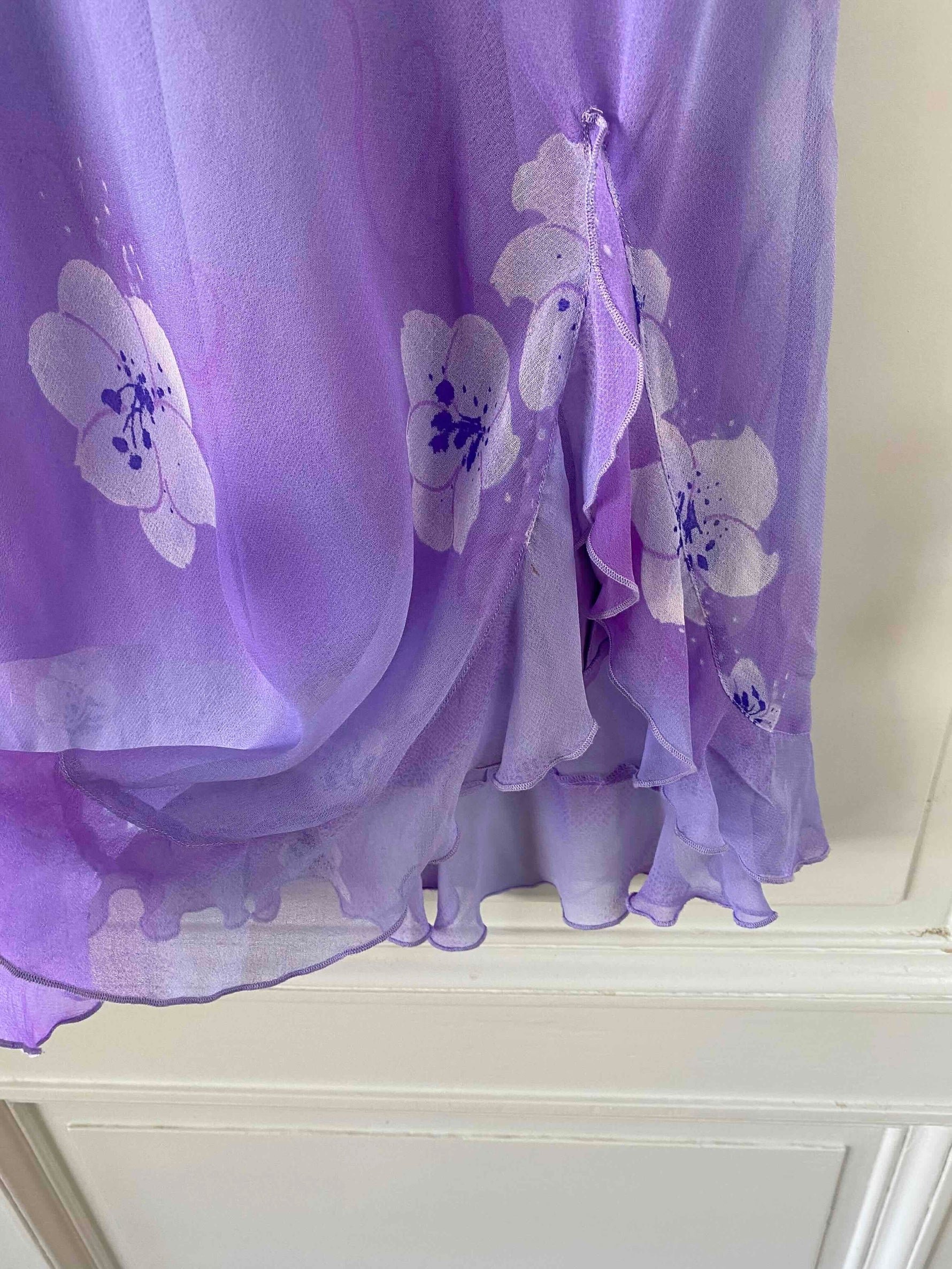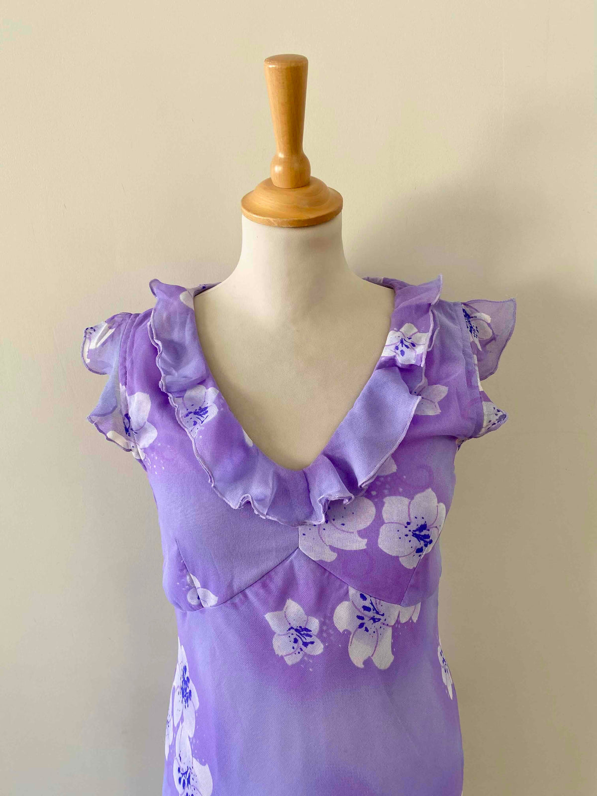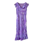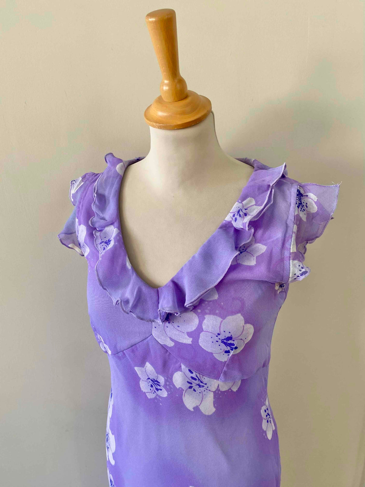Prix unitaire parRobe midi à fleurs en voile viscose lilas imprimée fleurs violettes et lilas pastel, encolure V volantée et emmanchures volantées, bas fendu volanté, forme fit and flare en biais, fabriquée en France, taille 36 portée ici sur un mannequin T36, aisselles 43cm.