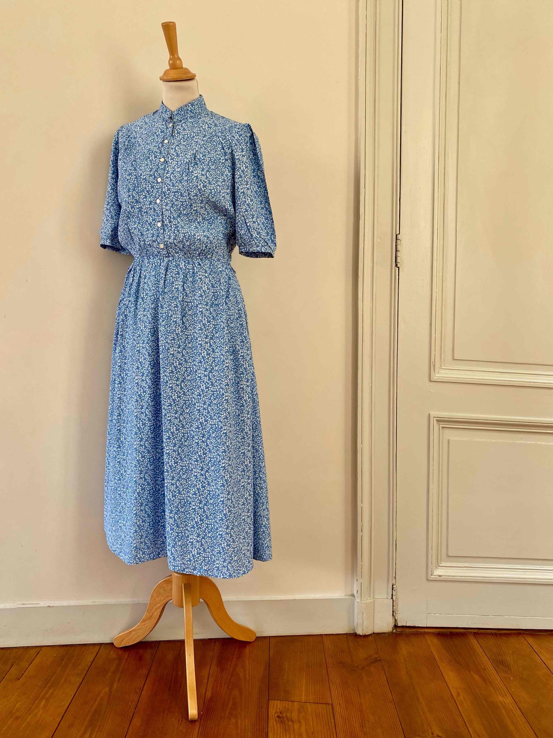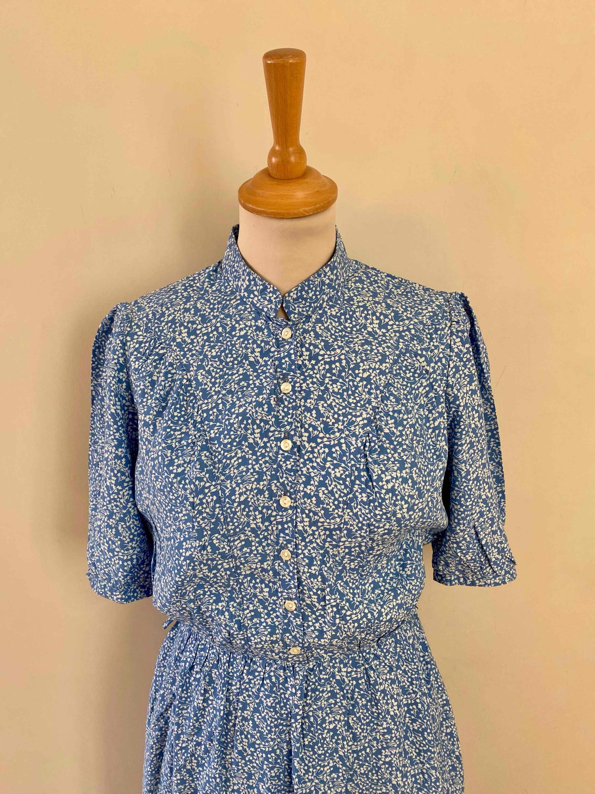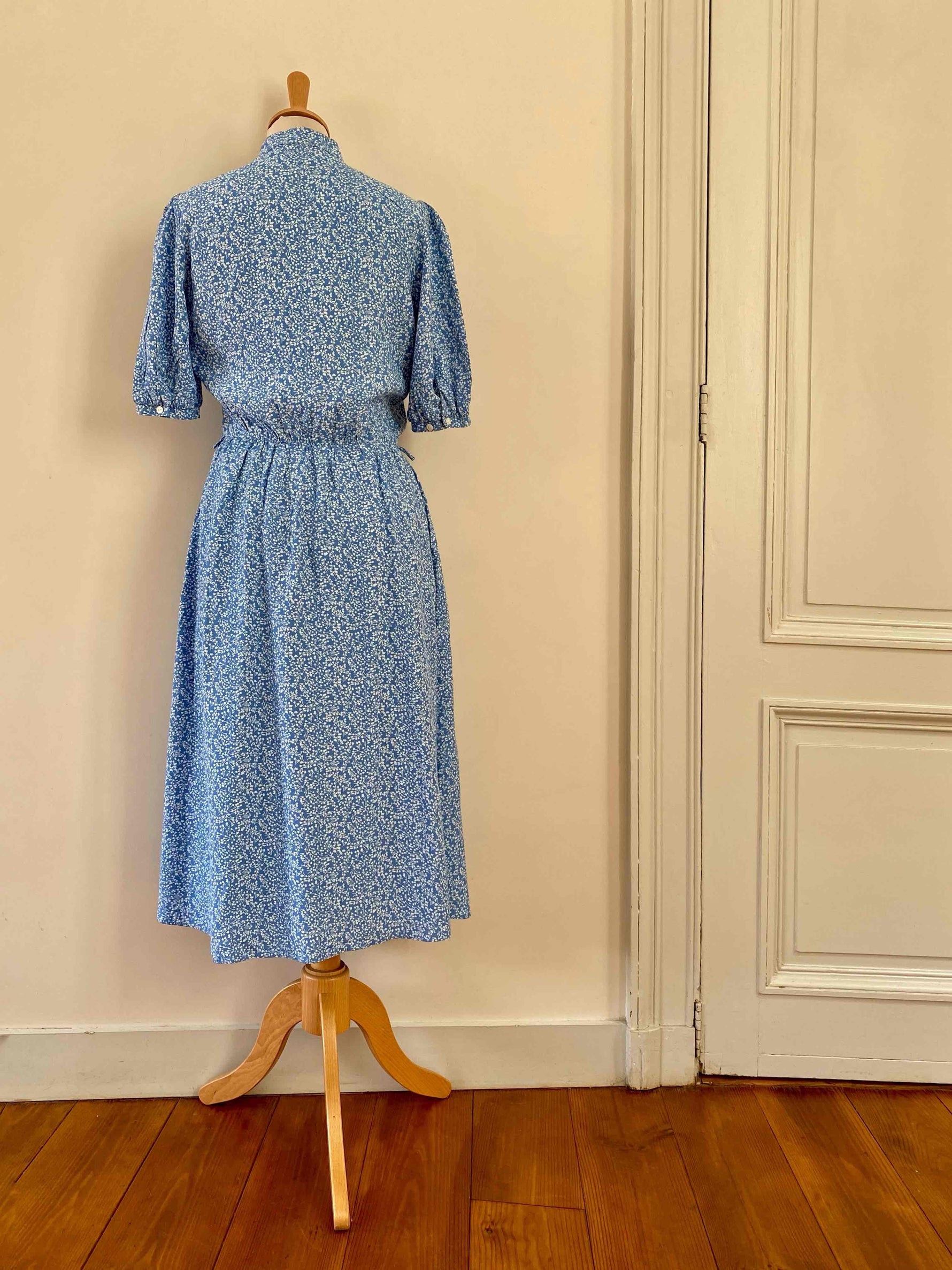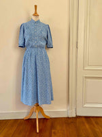 Prix unitaire parRobe midi à fleurs, en viscose bleue ciel imprimée minis fleurs blanches, col montant boutonnée, manches ballons courtes, fermeture éclaire côté, années 80’s, taille 36 portée ici sur un mannequin T36, aisselles 44cm.