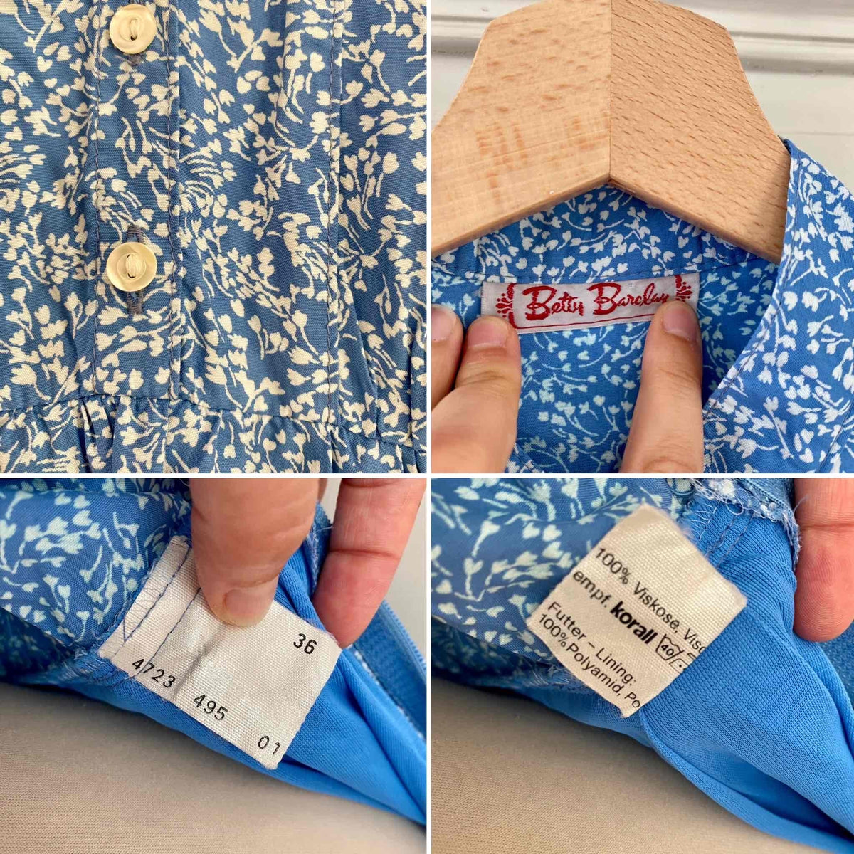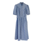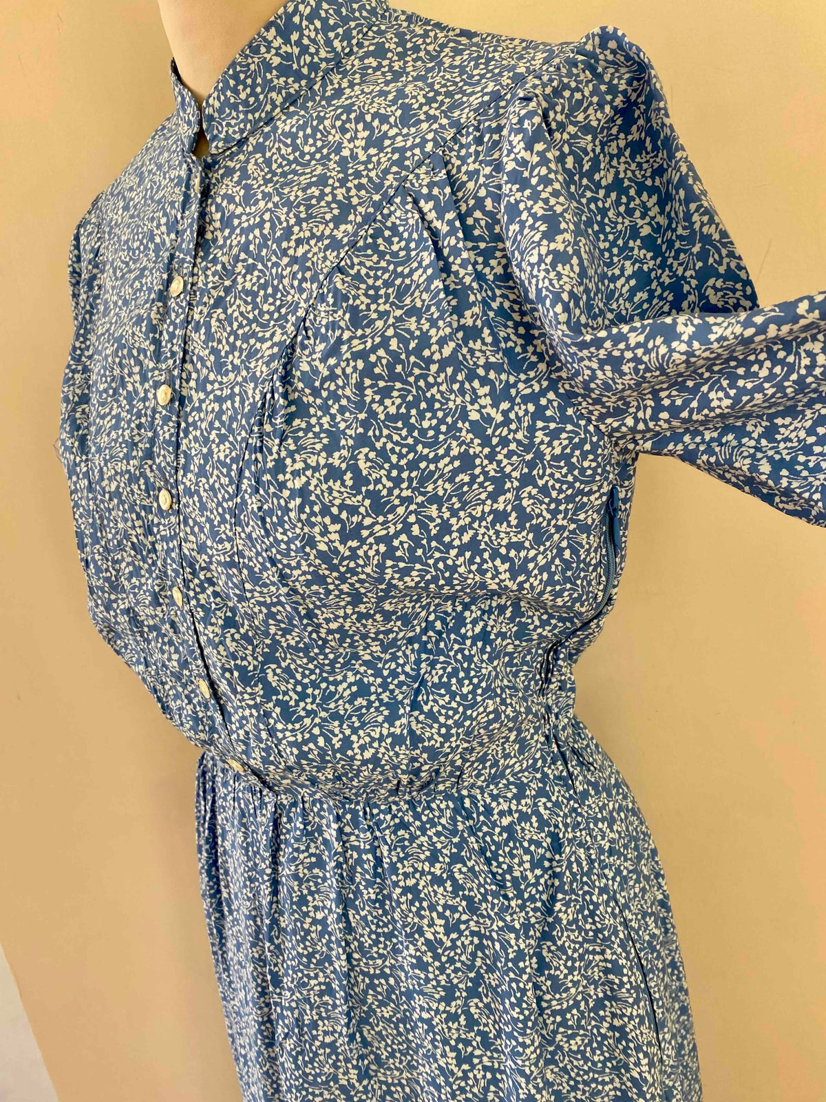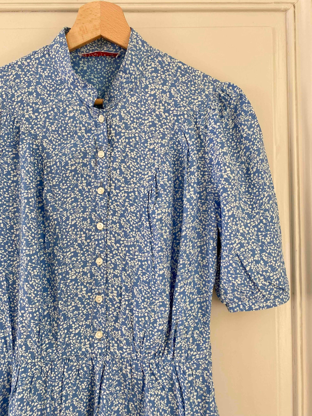 Prix unitaire parRobe midi à fleurs, en viscose bleue ciel imprimée minis fleurs blanches, col montant boutonnée, manches ballons courtes, fermeture éclaire côté, années 80’s, taille 36 portée ici sur un mannequin T36, aisselles 44cm.