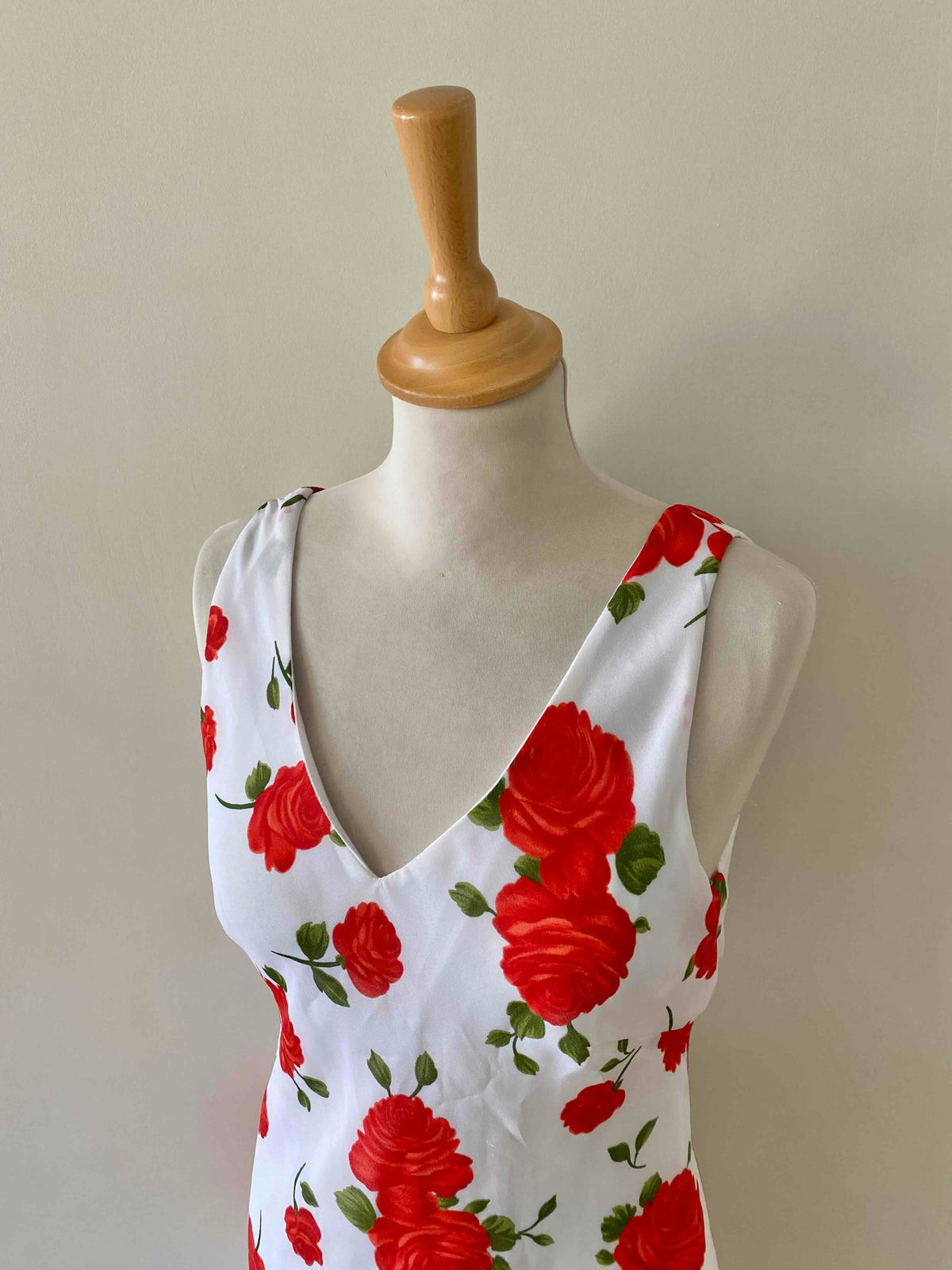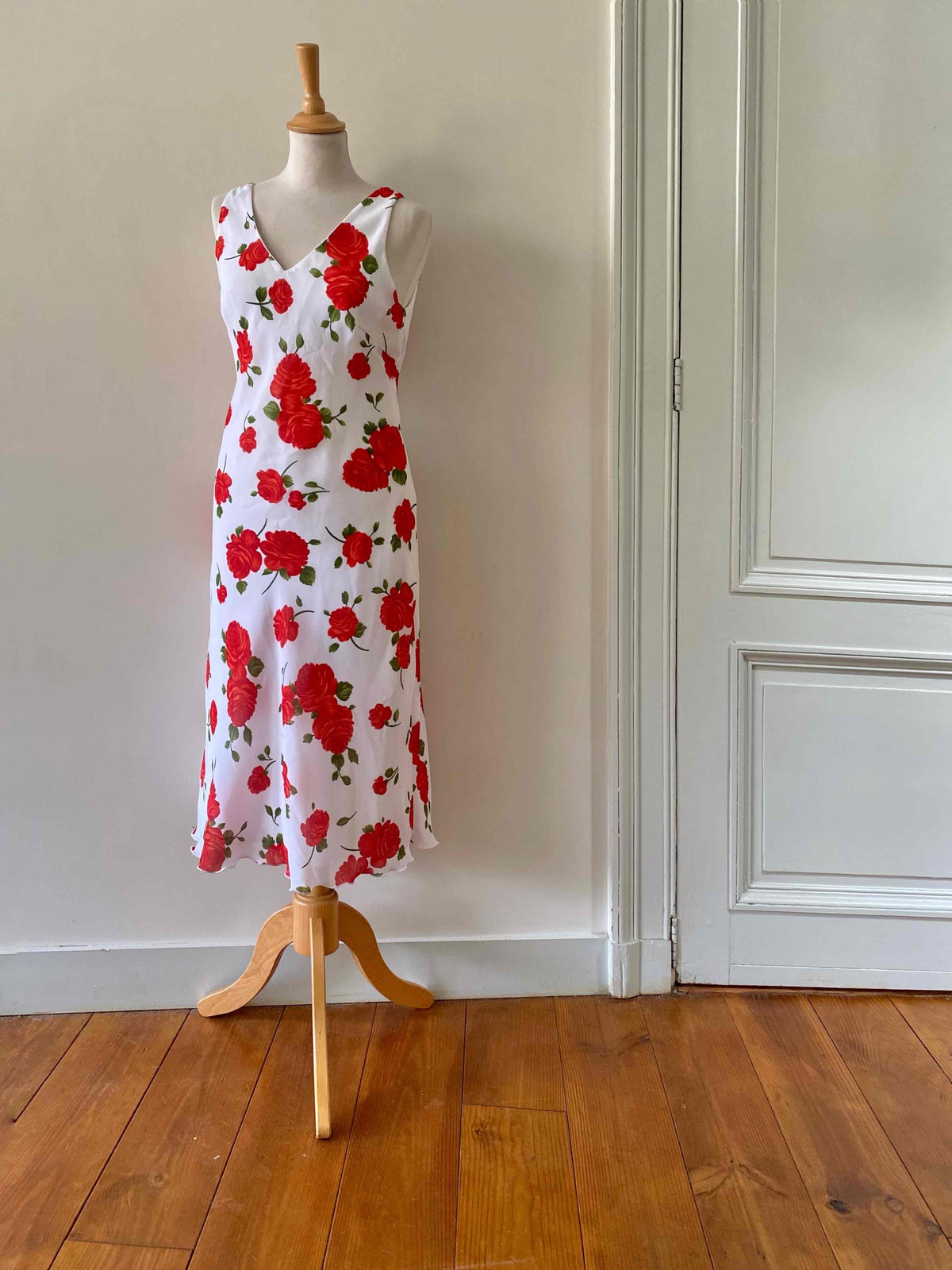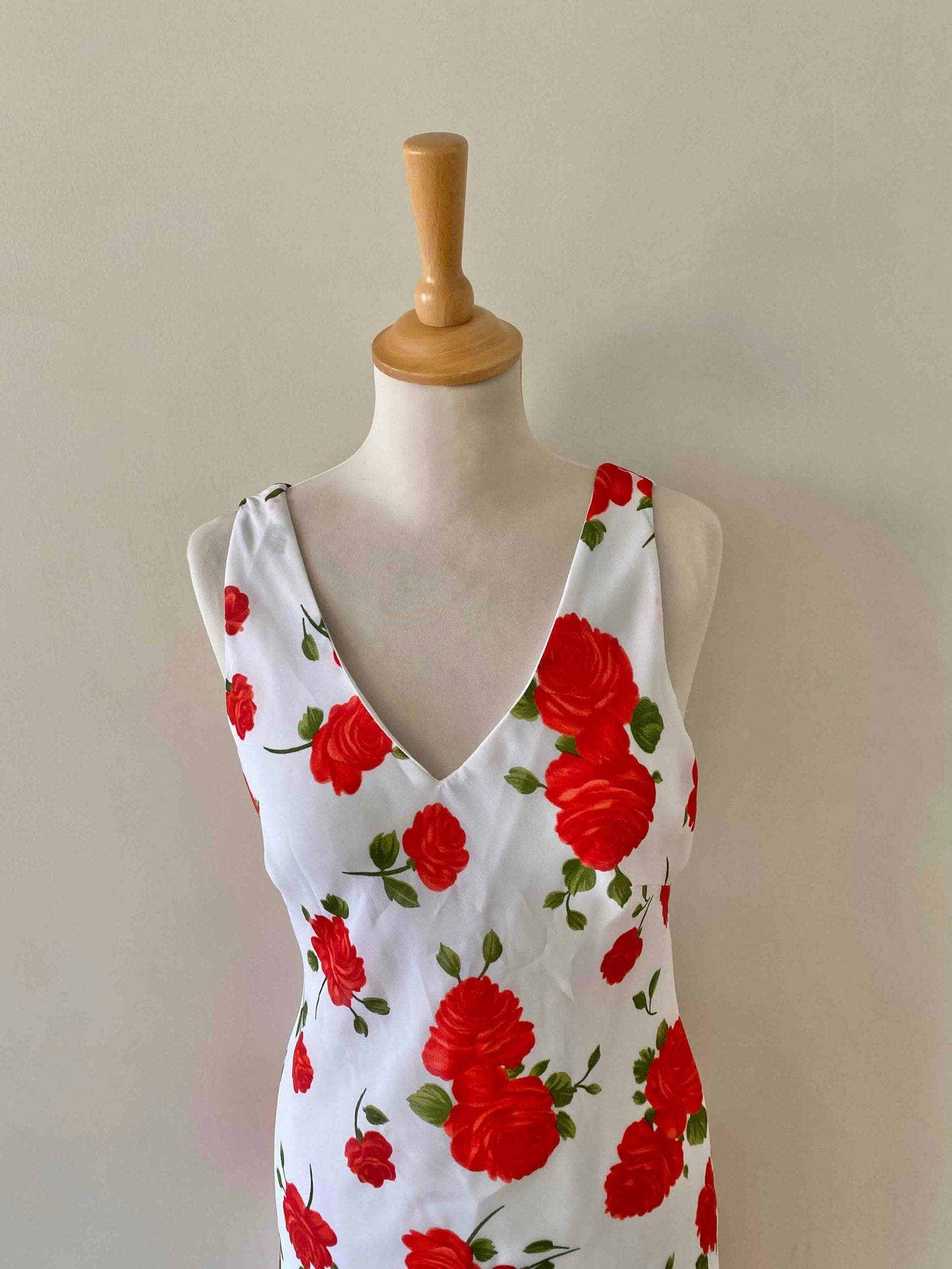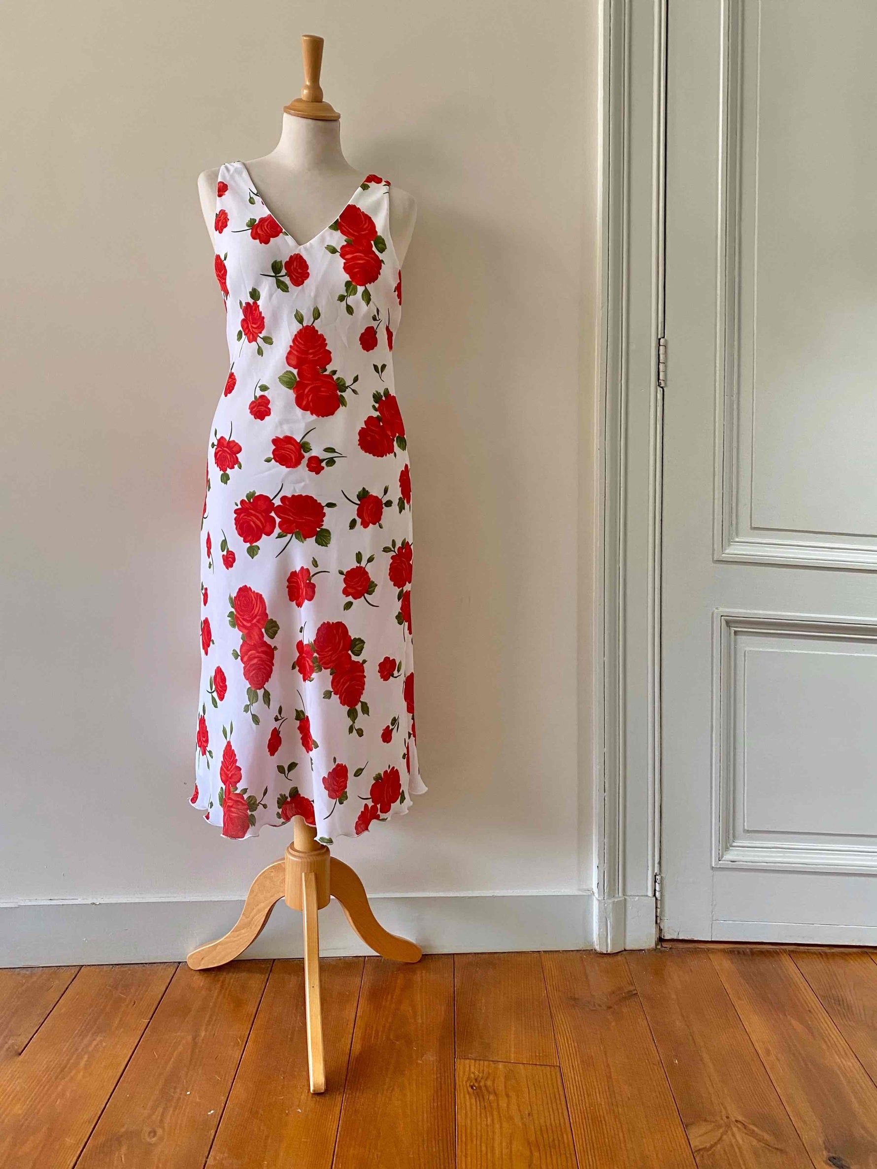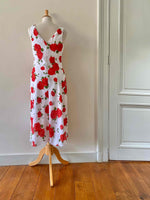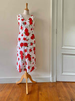 Prix unitaire parRobe midi à fleurs, en voile viscose doublée blanche imprimée roses rouges et vertes, encolure V devant et dos, longueur midi forme fit and flare en biais, fabriquée en Italie, taille 36 portée ici sur un mannequin T36, aisselles 43cm.
