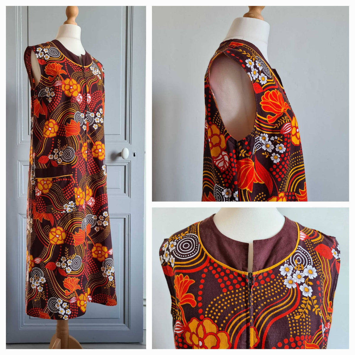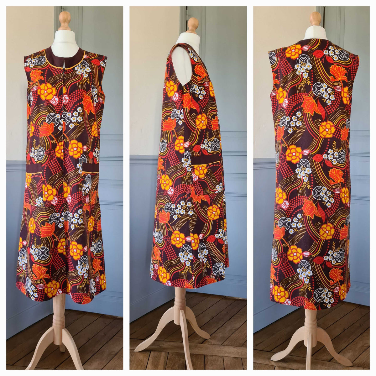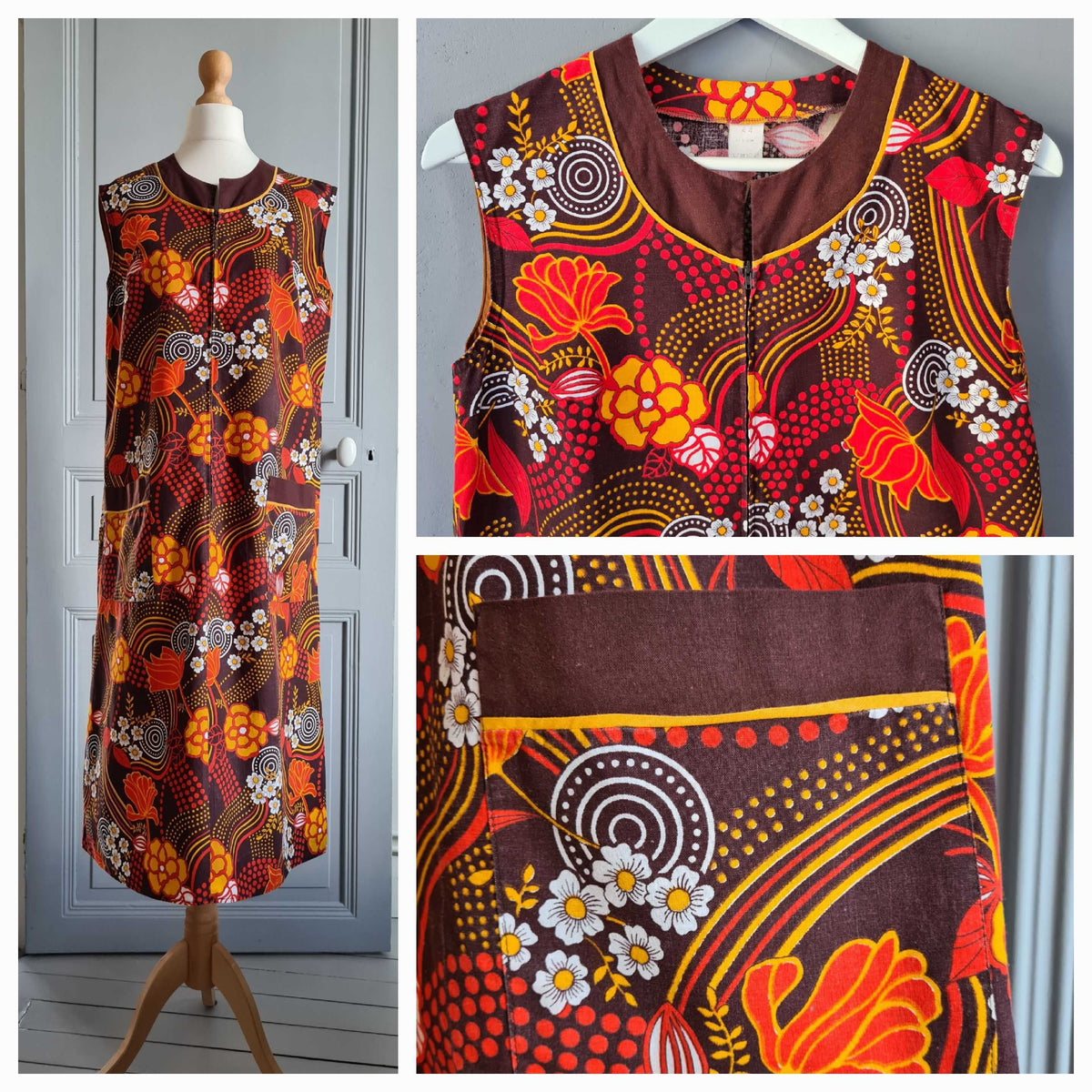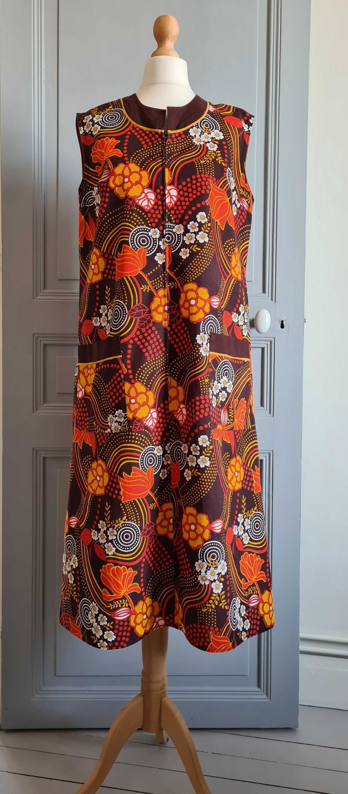 Prix unitaire parRobe en coton à fleurs et motifs jaune, orange et chocolat, sans manches, zippée devant (jusqu'à hauteur de hanches), encolure ronde fendue, deux poches plates, coupe droite. Longueur midi. Ancienne robe d'intérieur à imprimé typique de la décennie. Poitrine 47 cm.