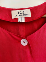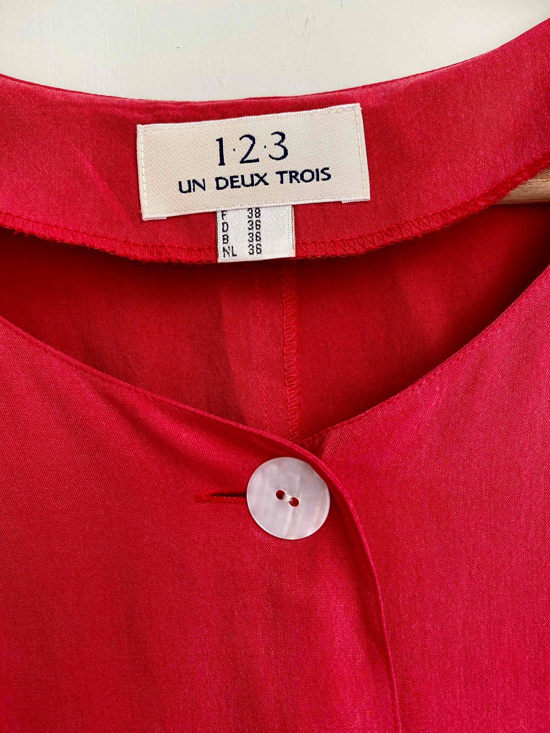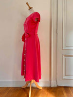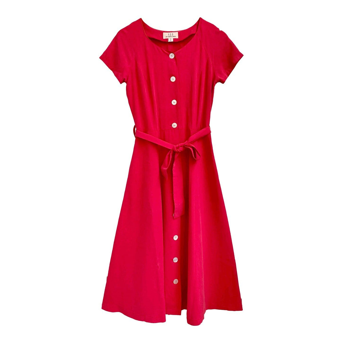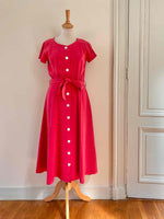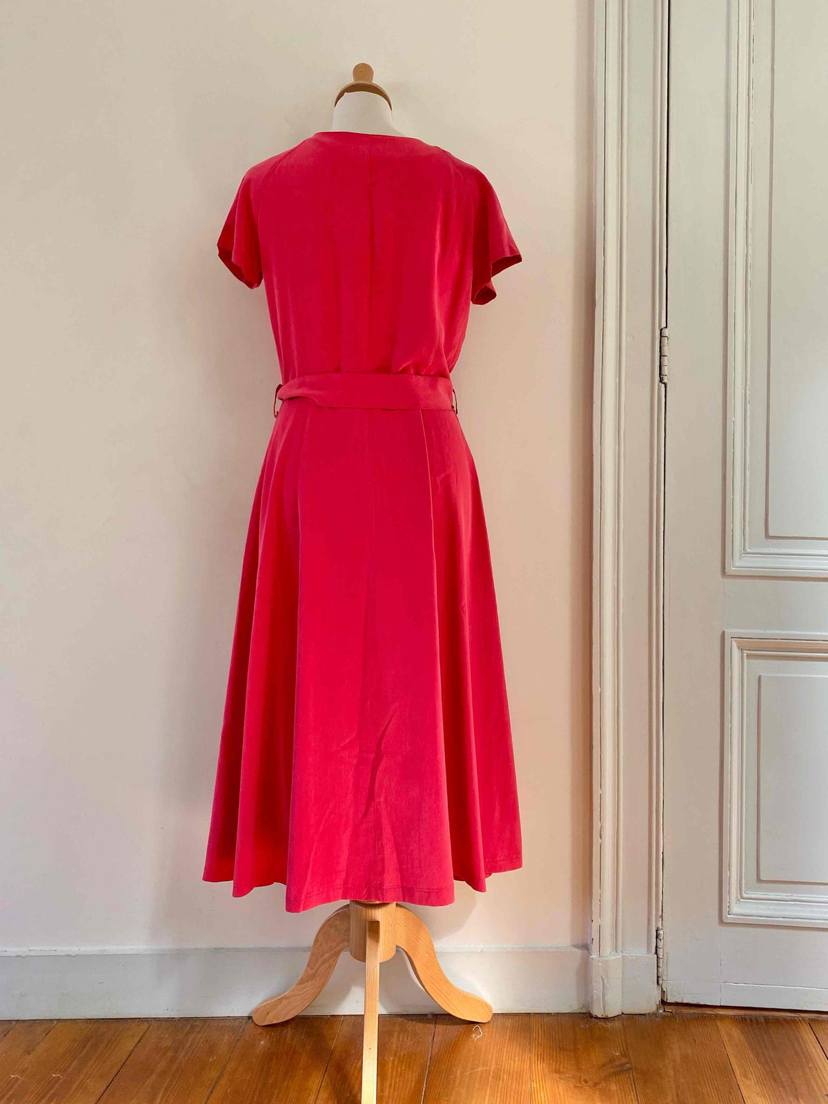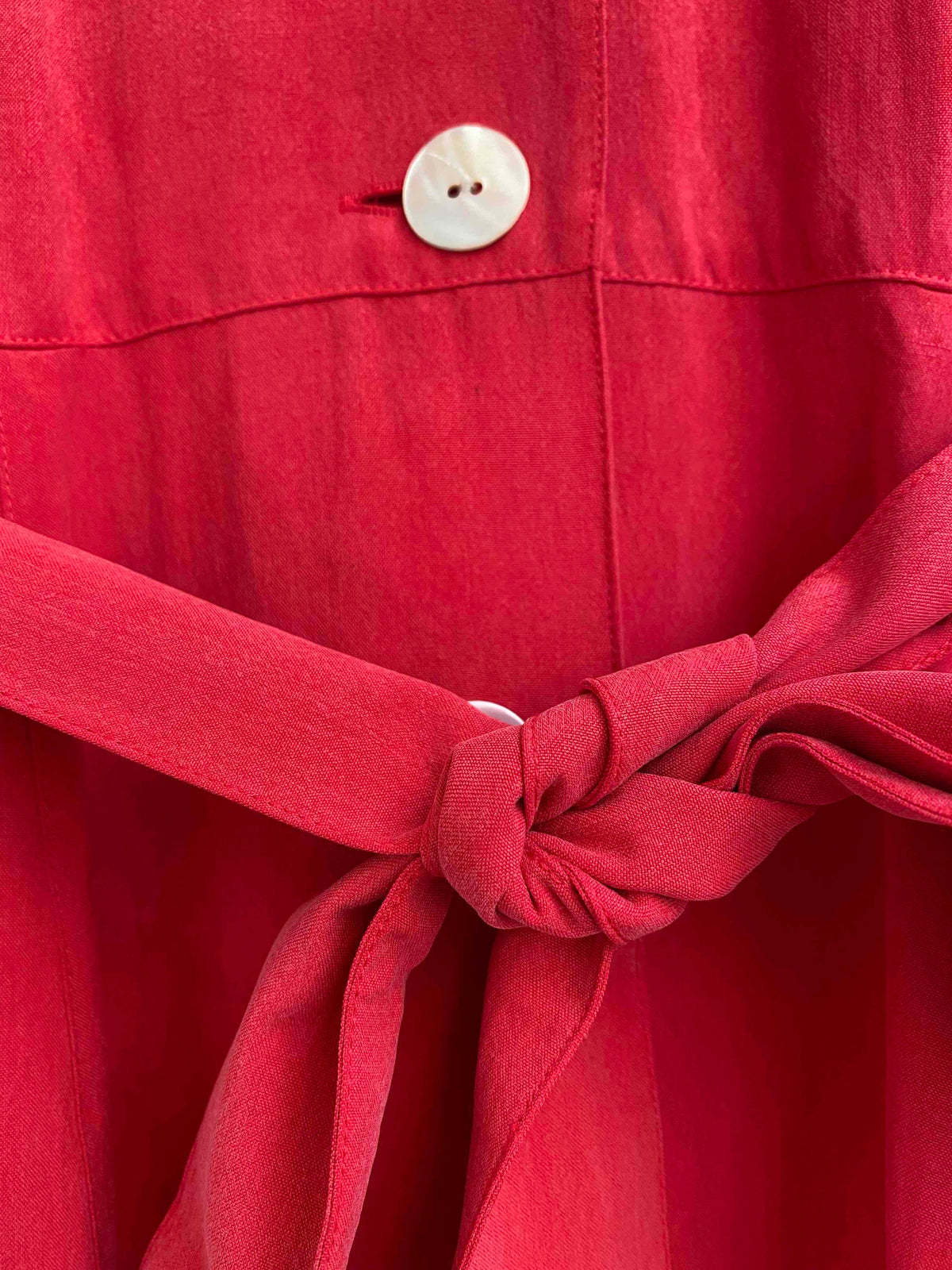 Robe midi en Soie boutonnée rouge vermillon, en 100% soie, ceinture amovible à nouer taille, manches courtes, boutons nacres, taille 36 actuelle portée ici sur un mannequin T36, aisselles 45cm.