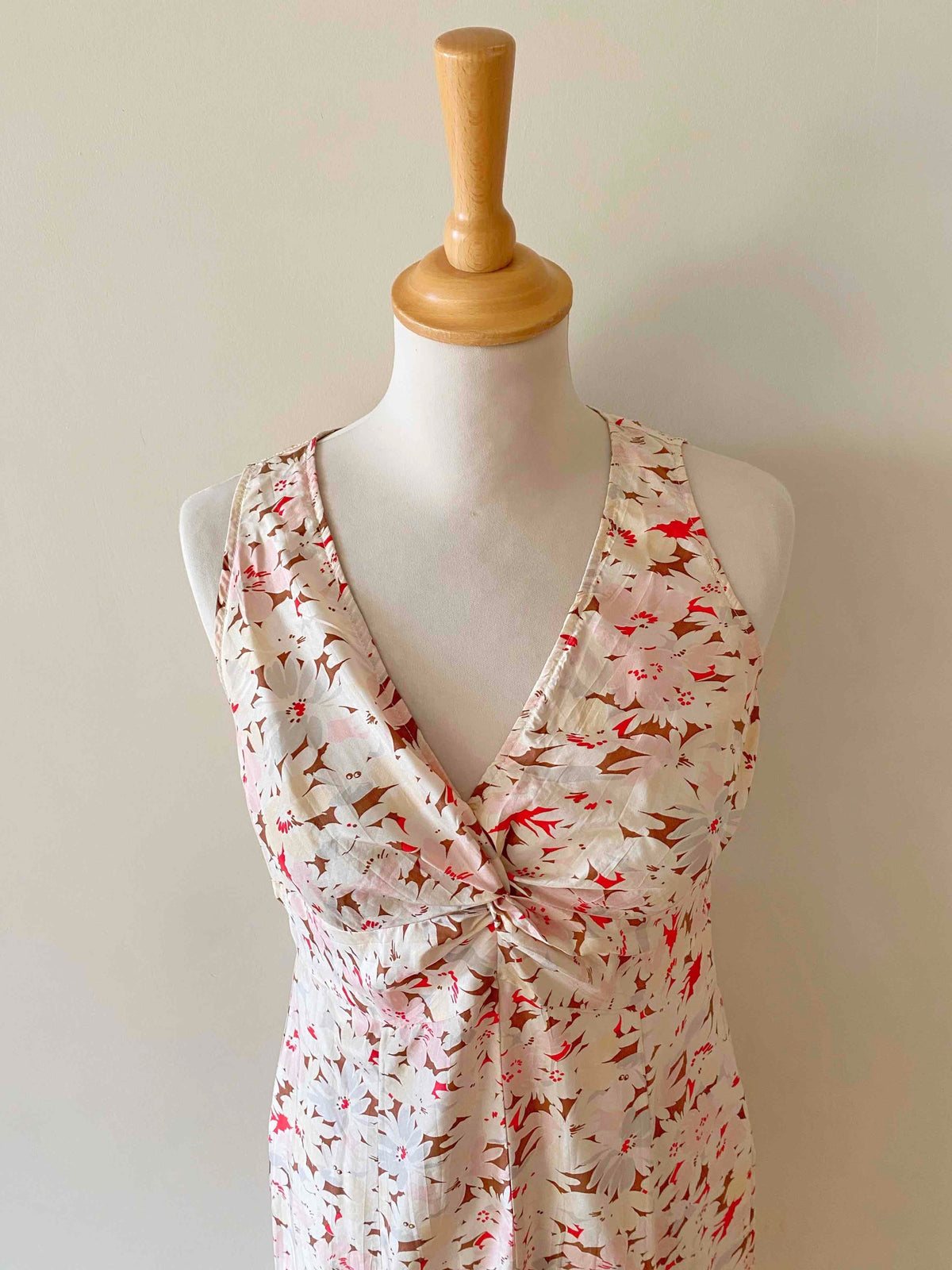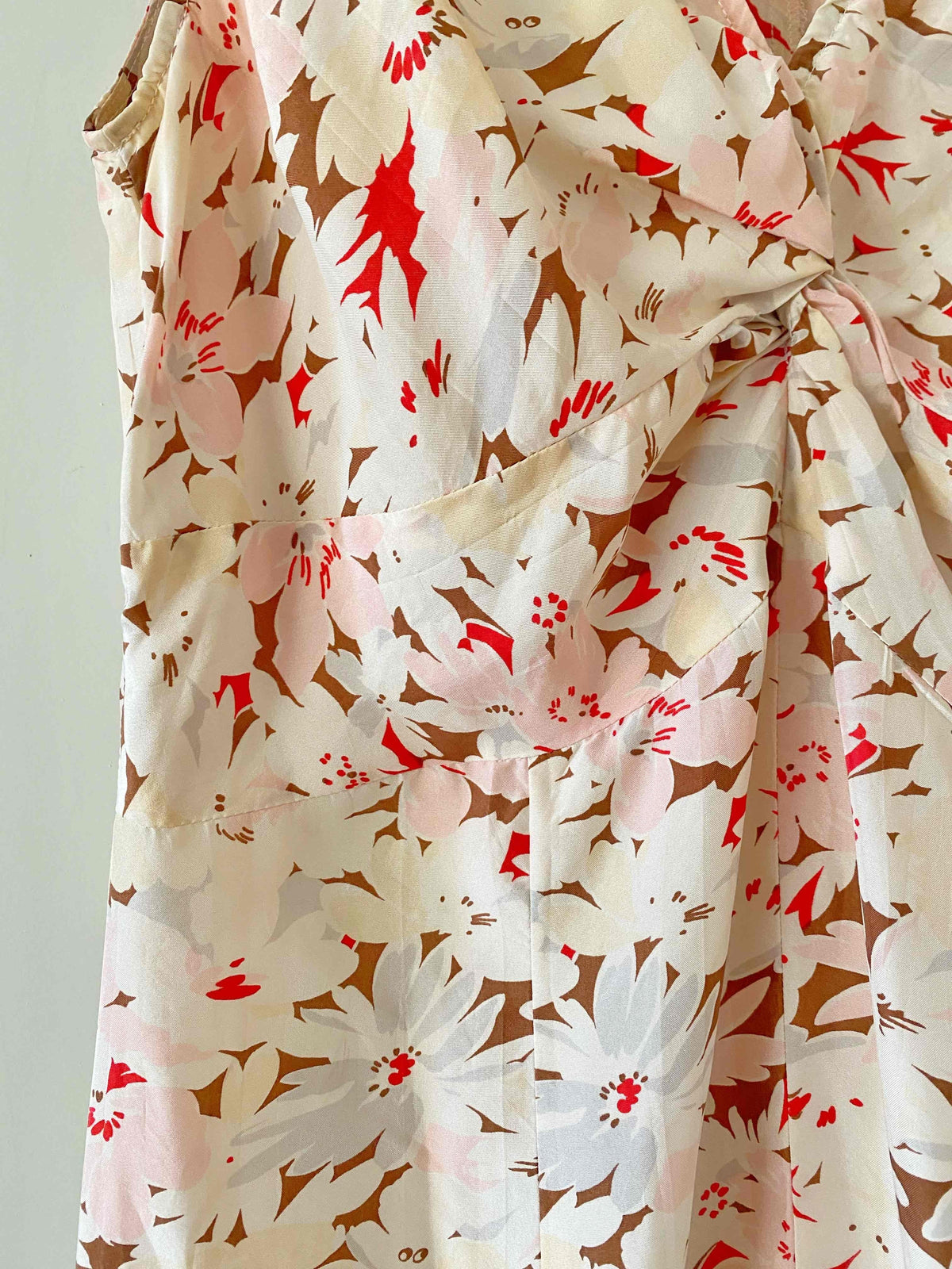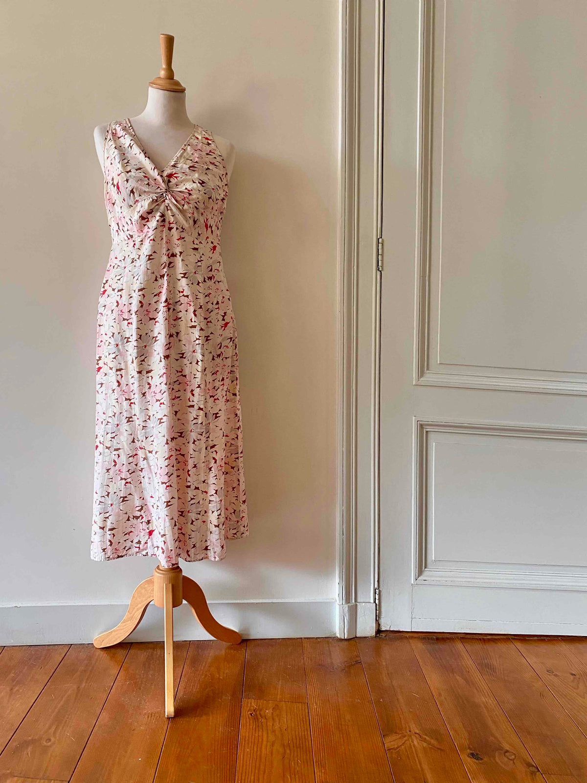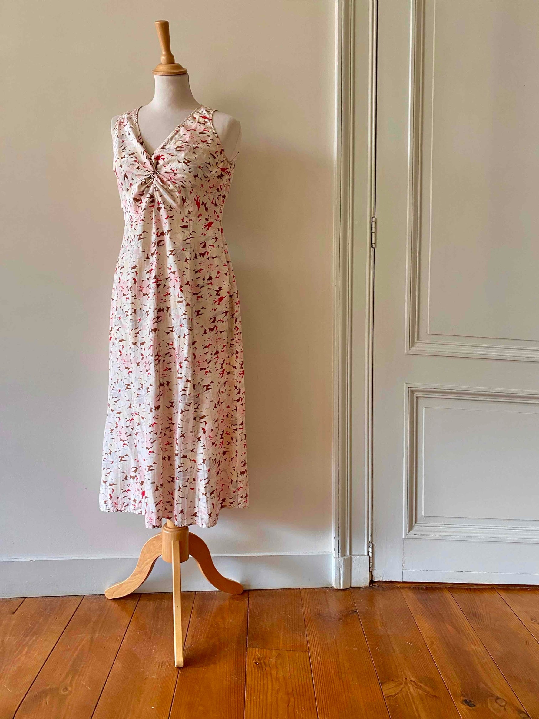 Prix unitaire parRobe midi en soie, blanche écrue imprimée fleurs roses, rouges et chocolats, col en V à poitrine nouée torsadée, fermeture éclaire côté, fabriquée en Italie, taille 36 portée ici sur un mannequin T36, aisselles 43cm.