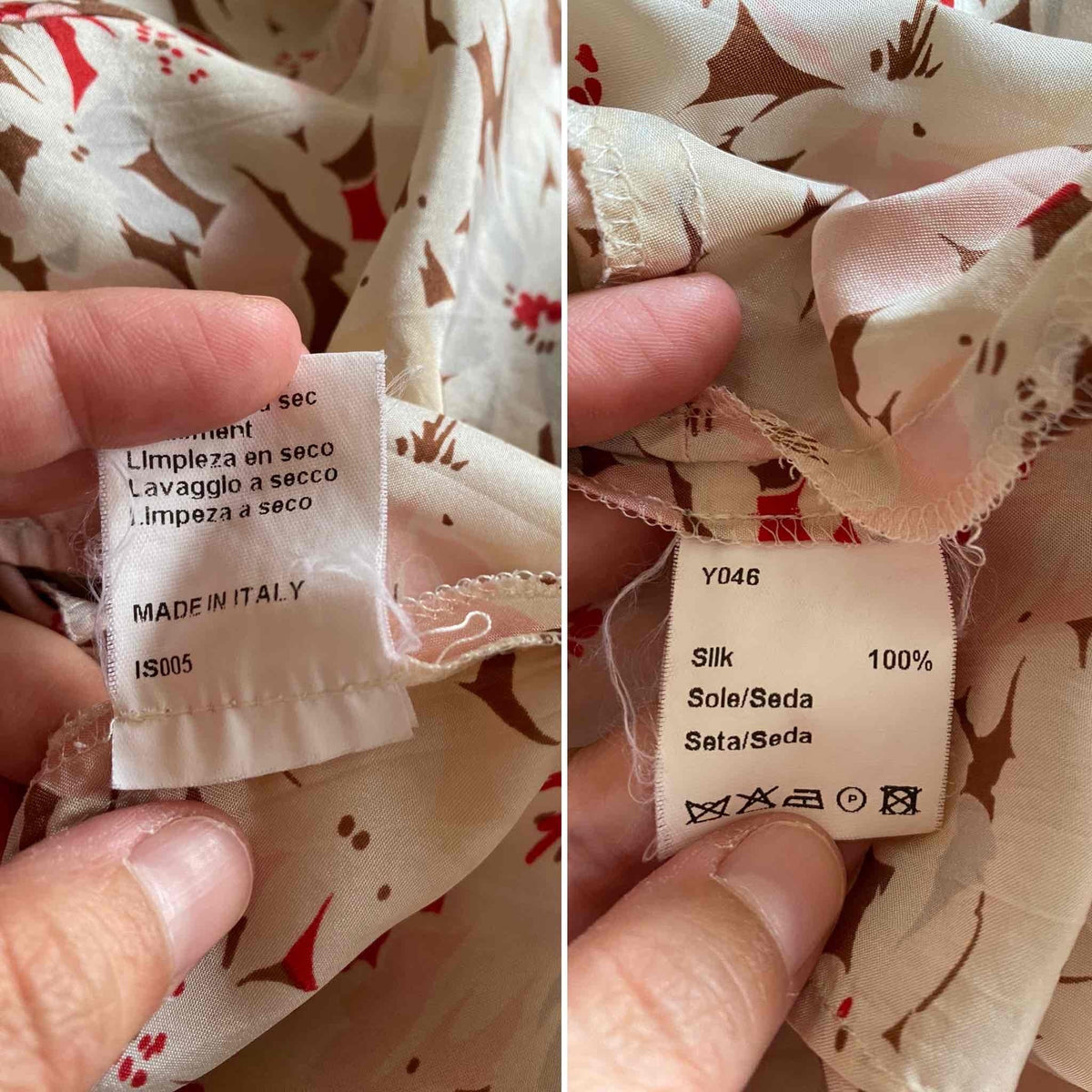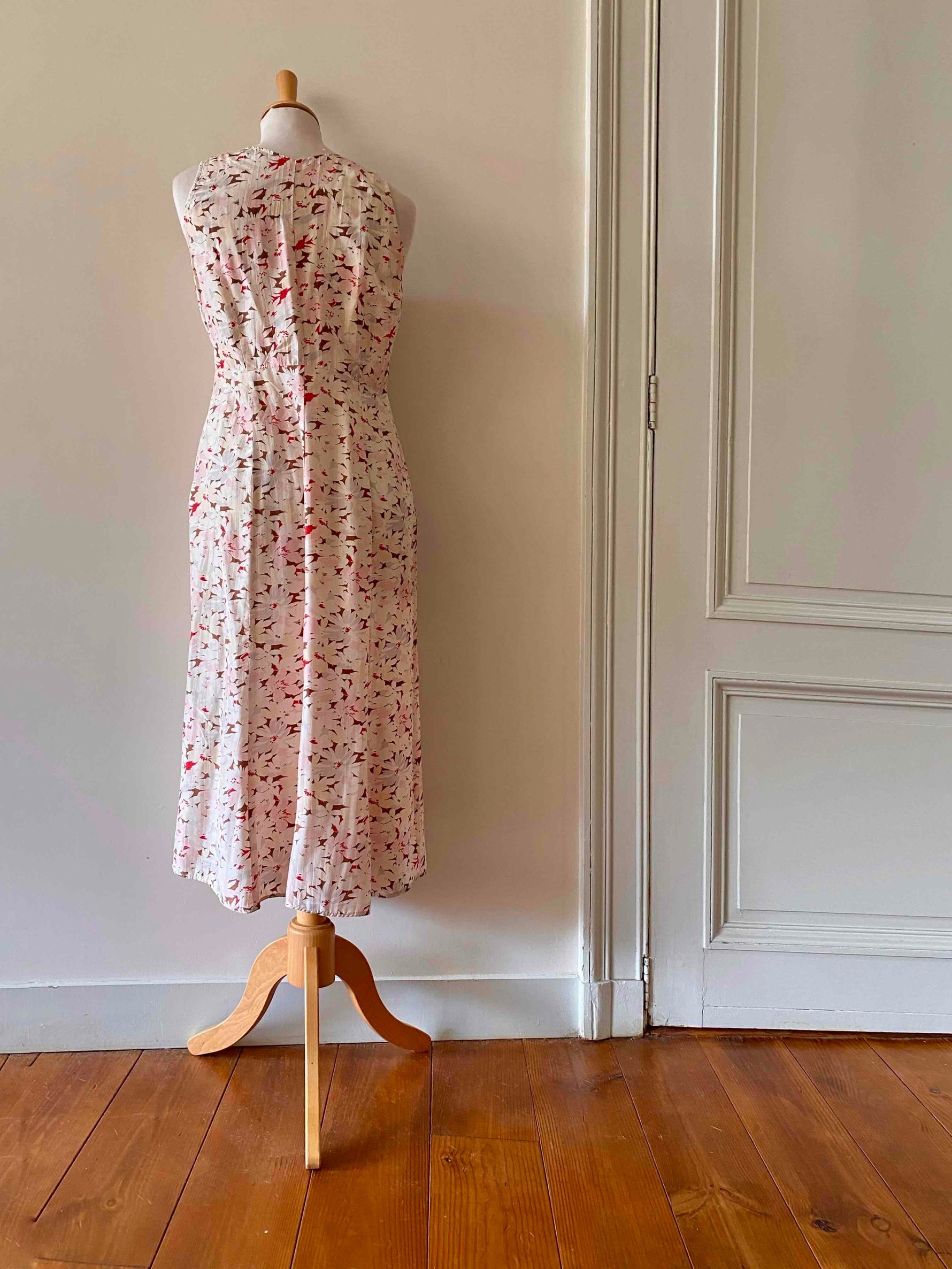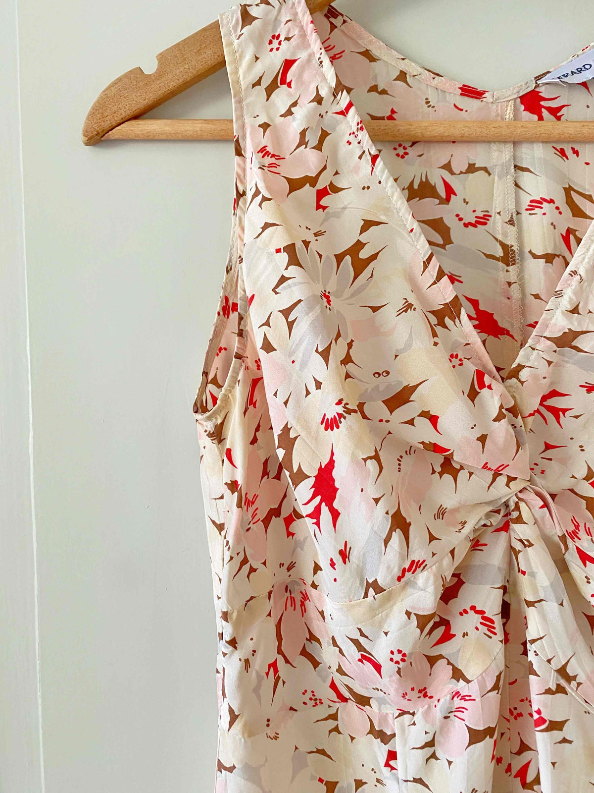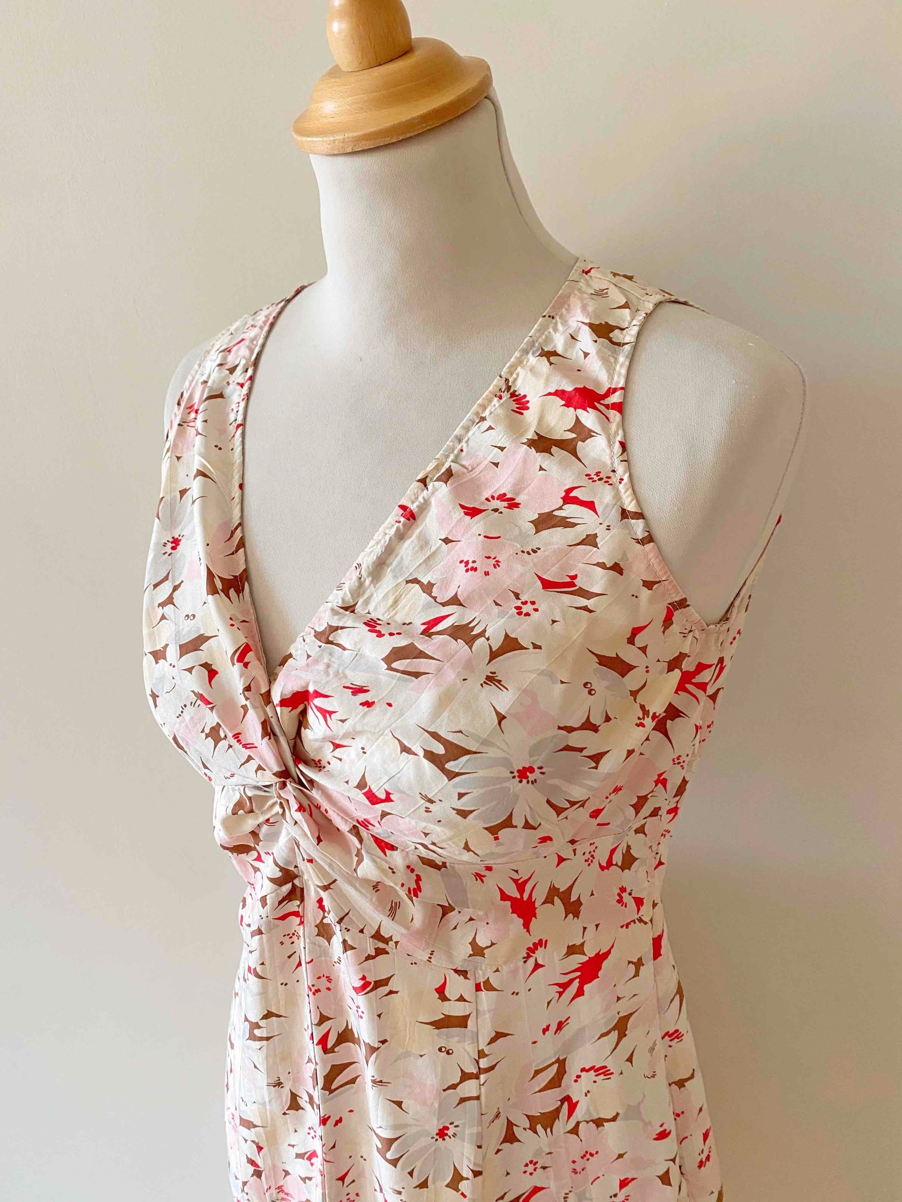 Prix unitaire parRobe midi en soie, blanche écrue imprimée fleurs roses, rouges et chocolats, col en V à poitrine nouée torsadée, fermeture éclaire côté, fabriquée en Italie, taille 36 portée ici sur un mannequin T36, aisselles 43cm.