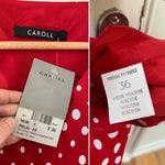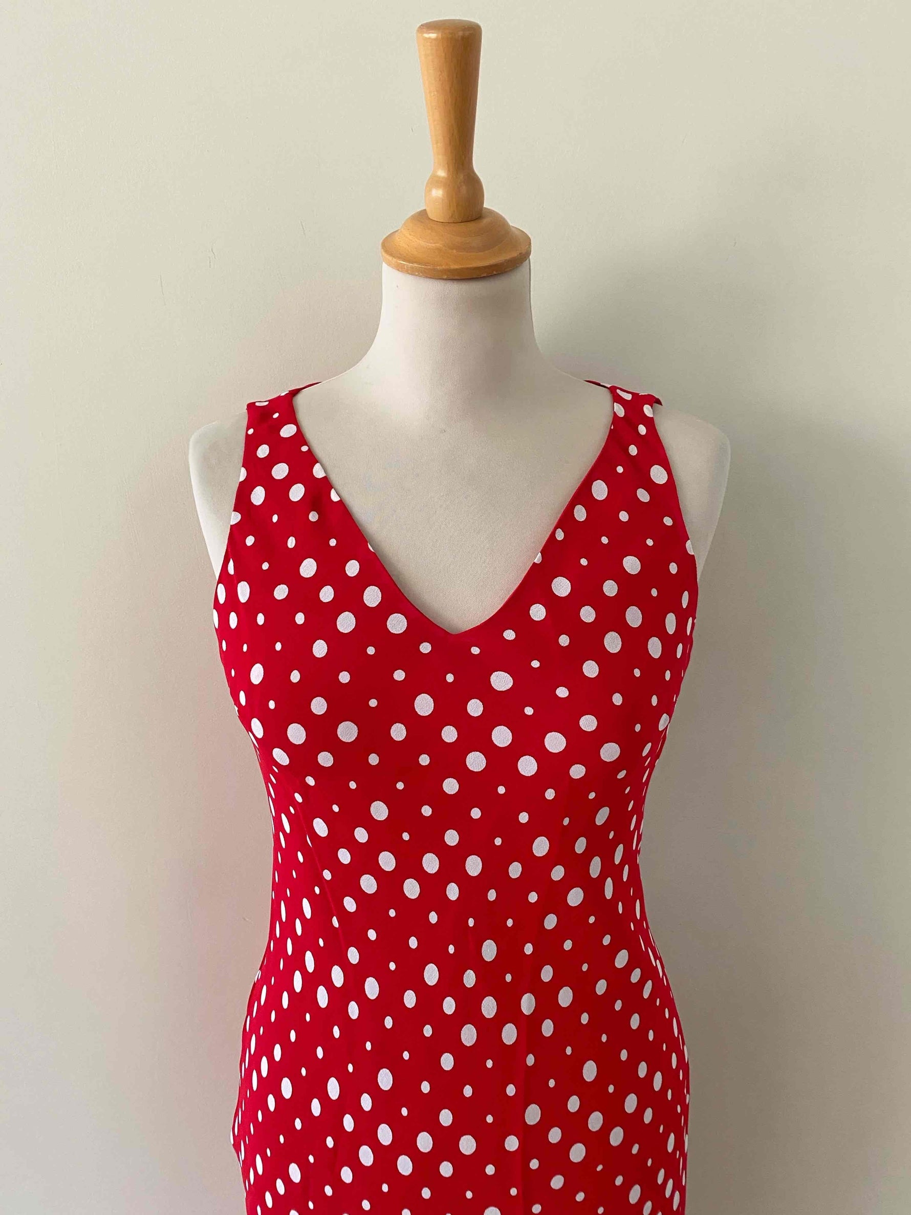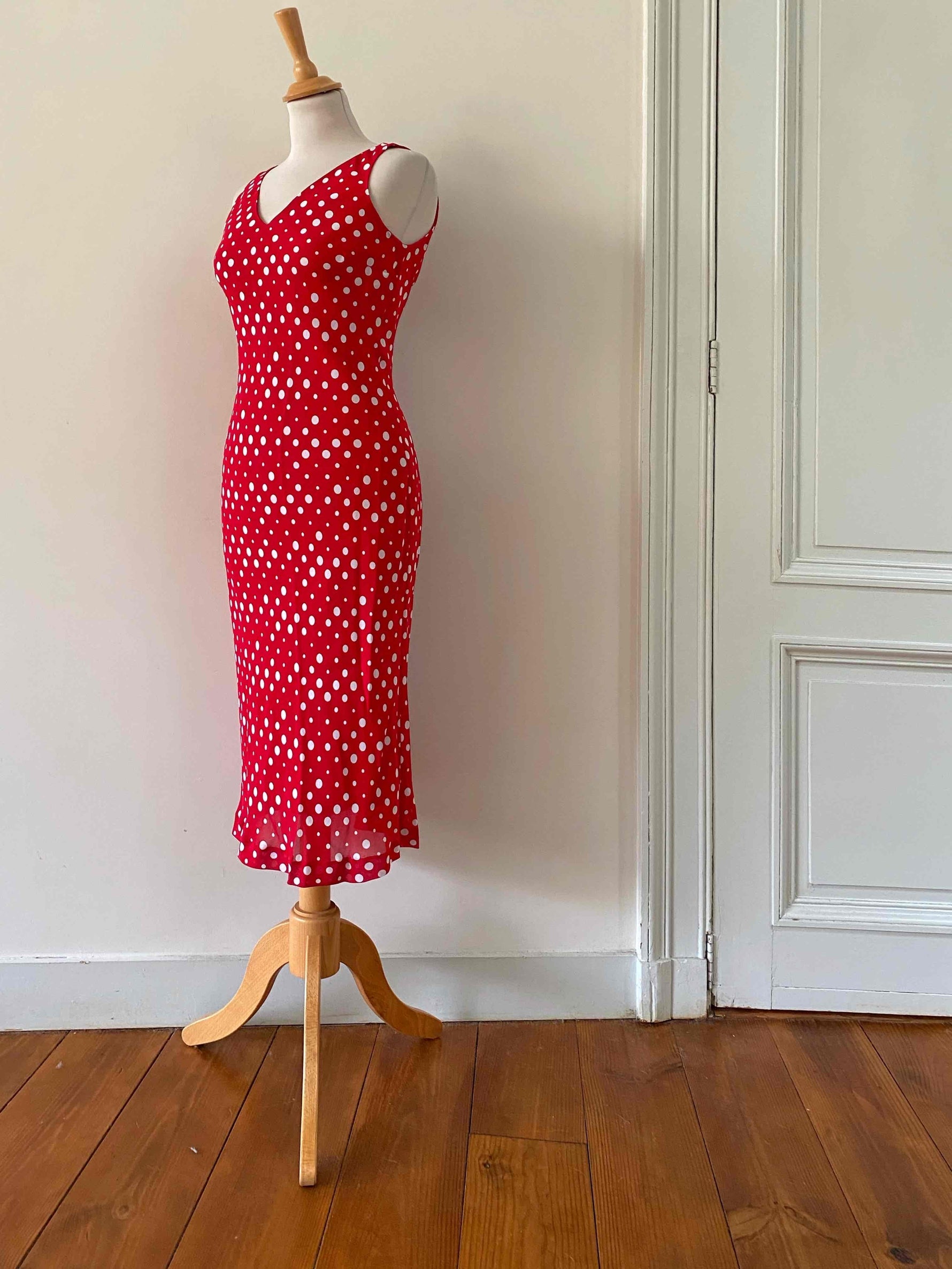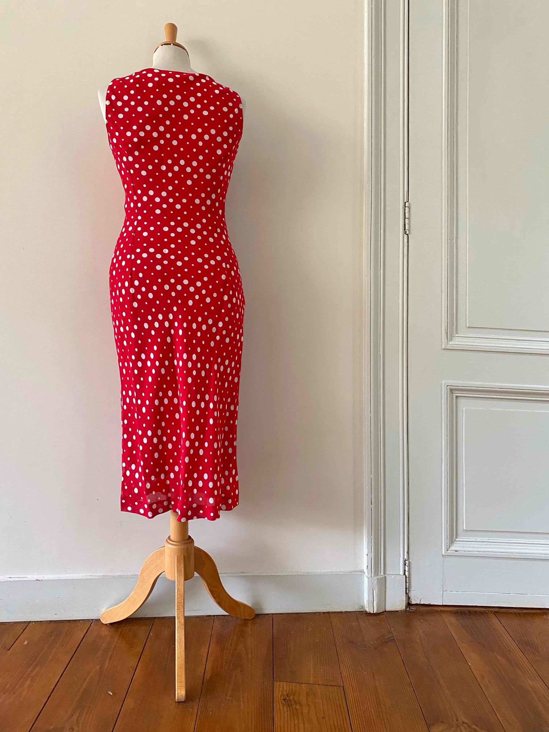 Robe midi à pois en voile viscose doublée rouge imprimée pois différentes tailles blancs, col V échancré, forme fit and flare en biais, fabriquée en France, deadstock avec étiquettes d’origine, taille 36 portée ici sur un mannequin T36.