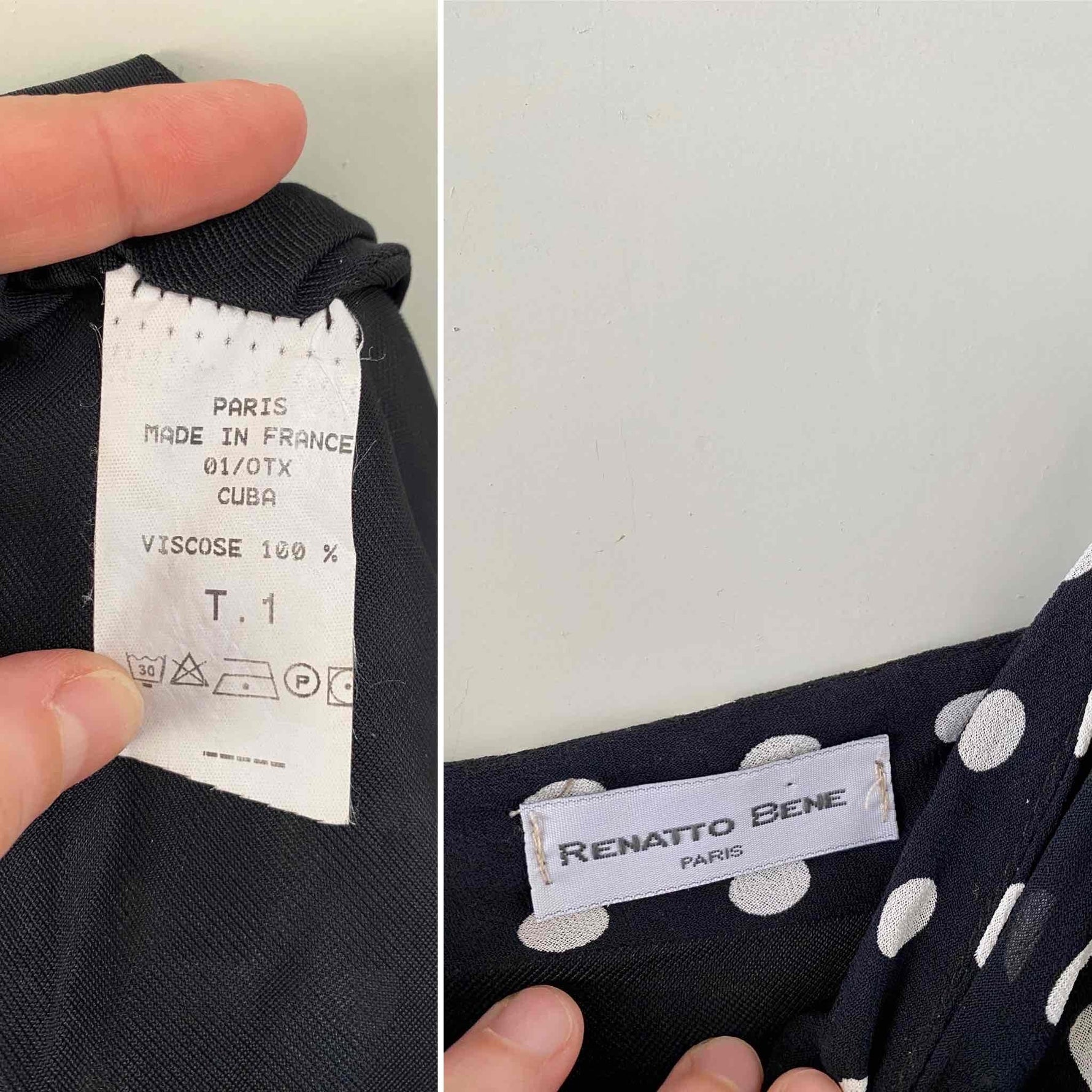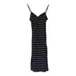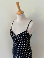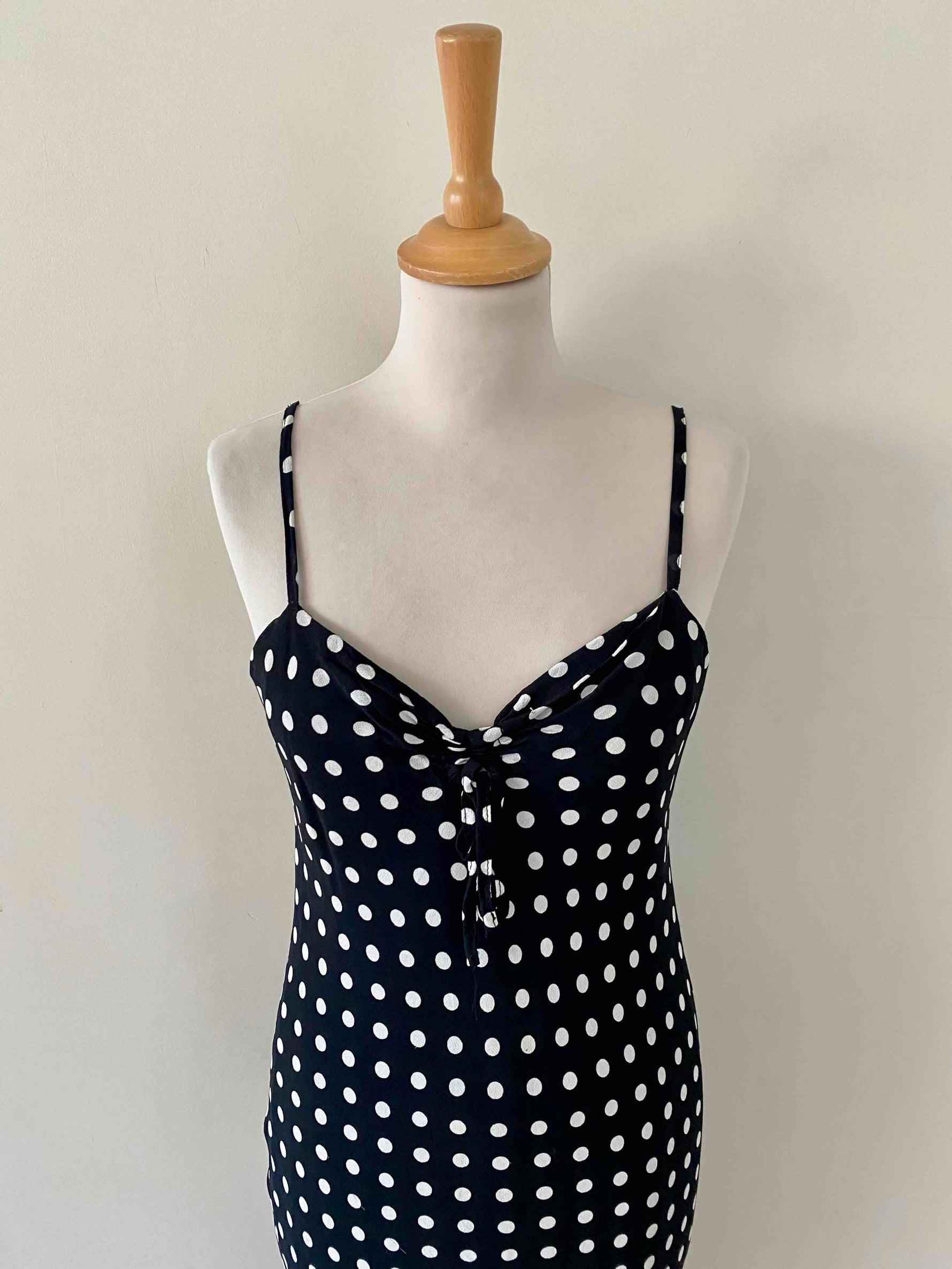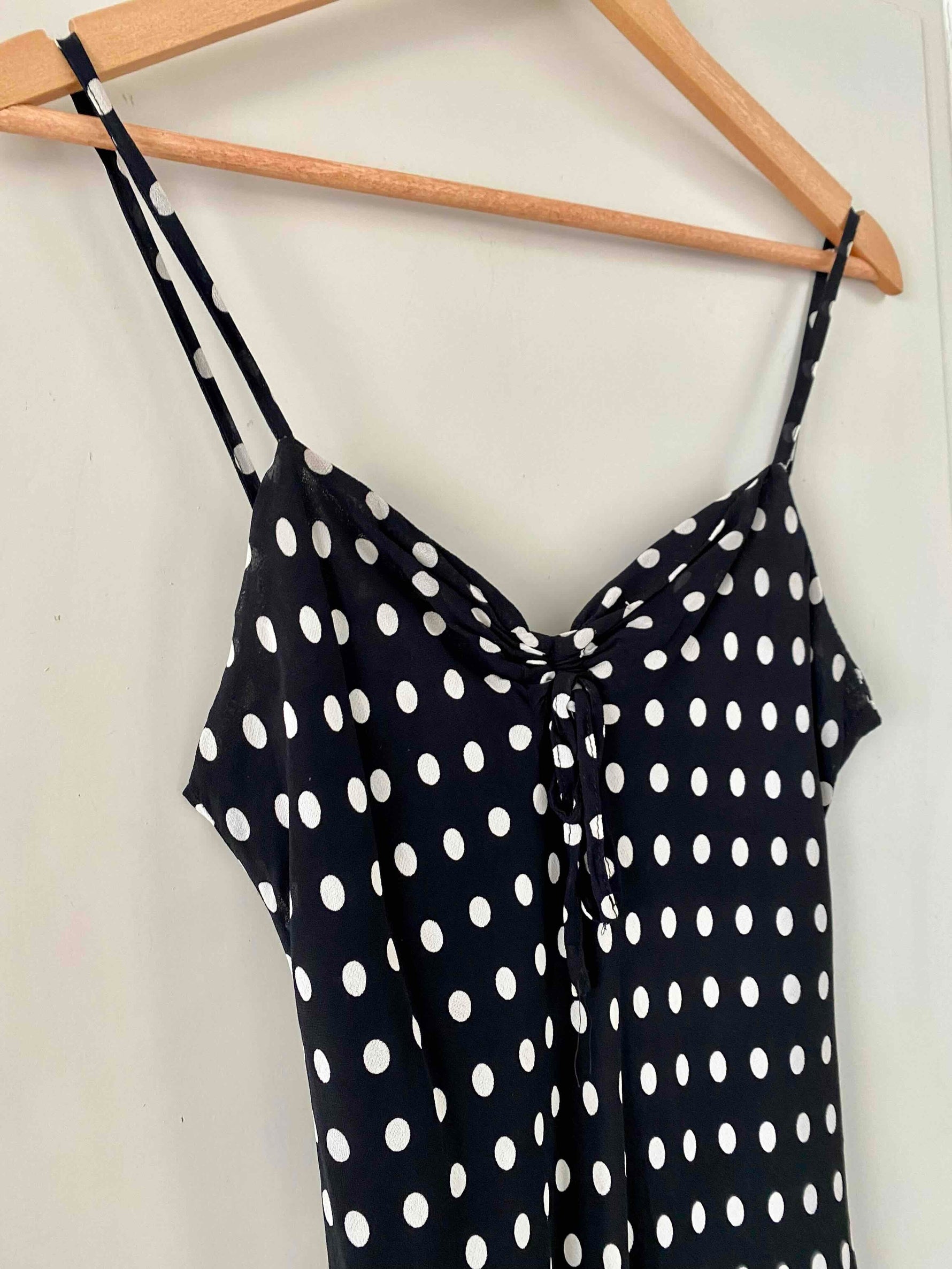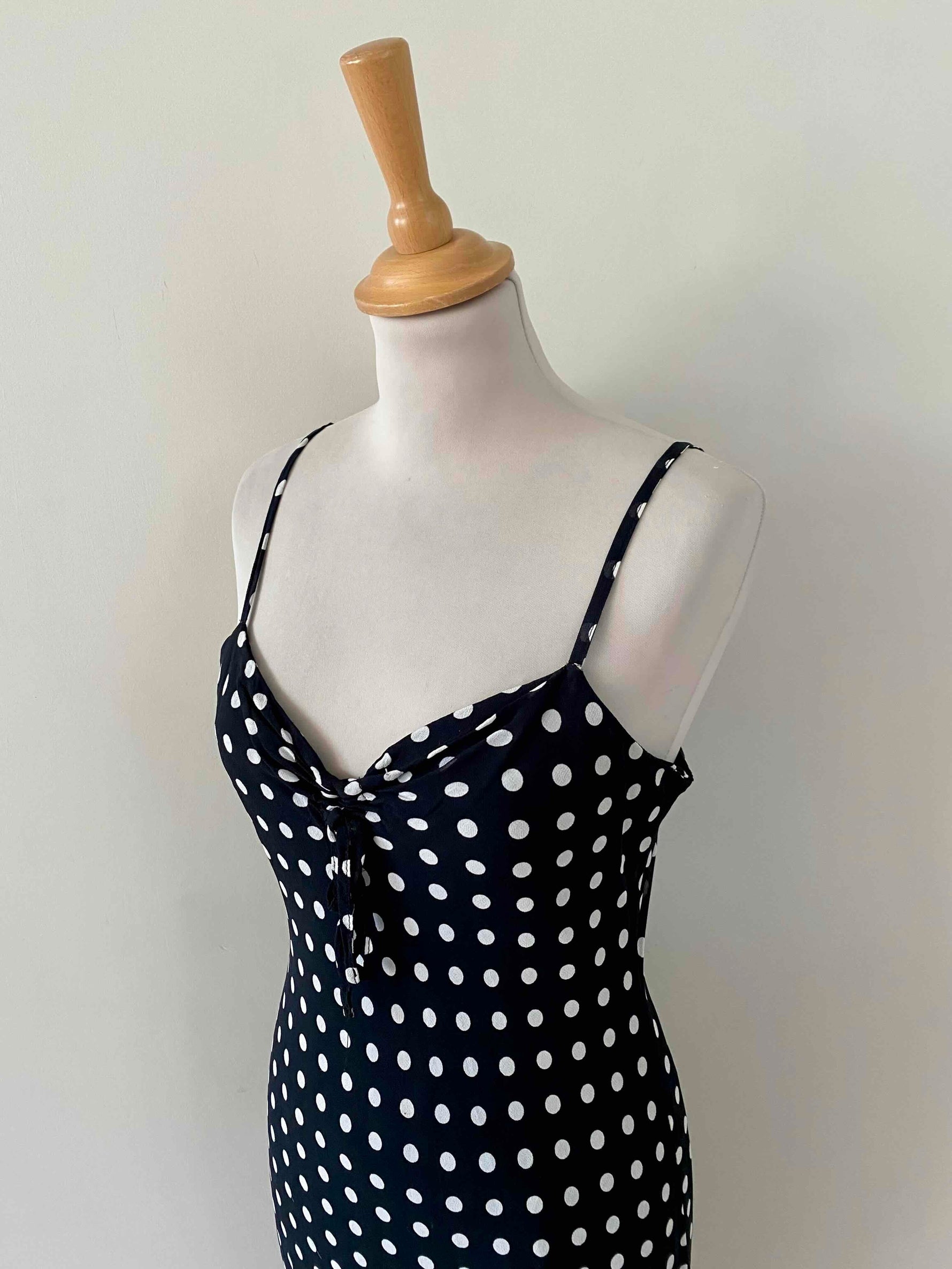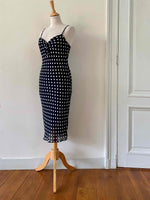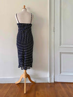Robe midi à pois, en voile viscose doublée noire imprimée pois blancs, poitrine froncée à nouer, fines bretelles, forme fit and flare, fabriquée en France, taille 36 portée ici sur un mannequin T36, aisselles 43cm.