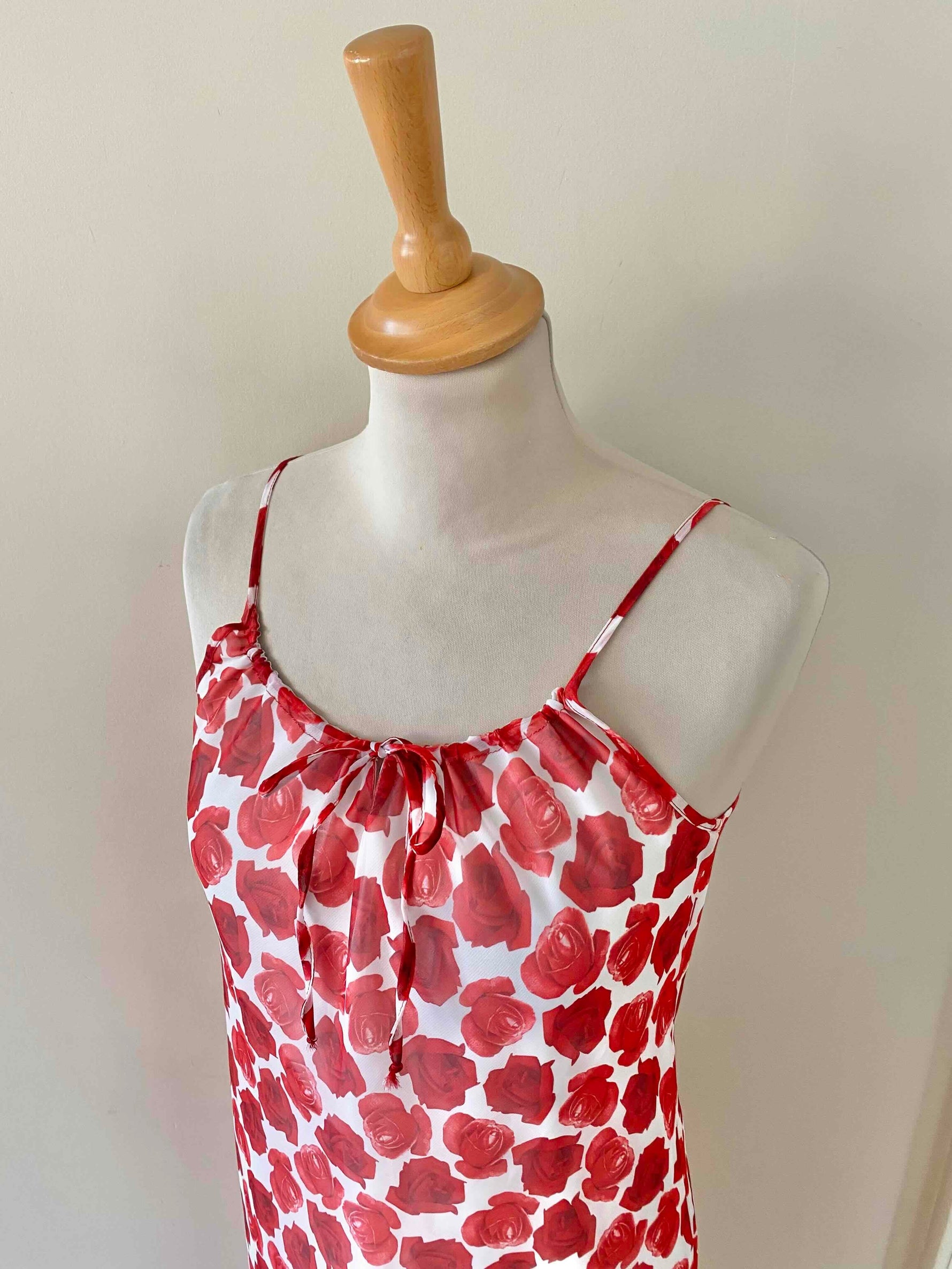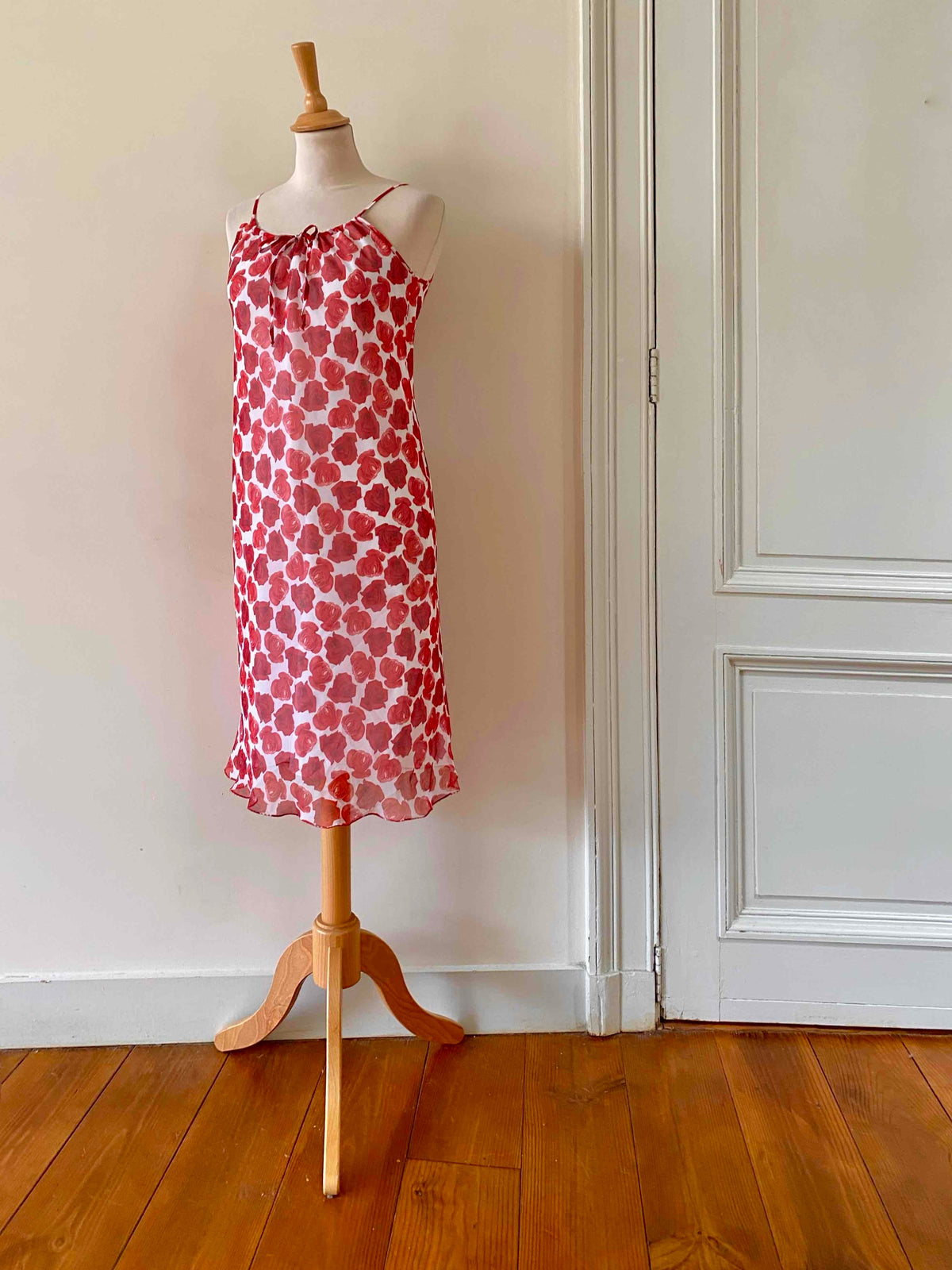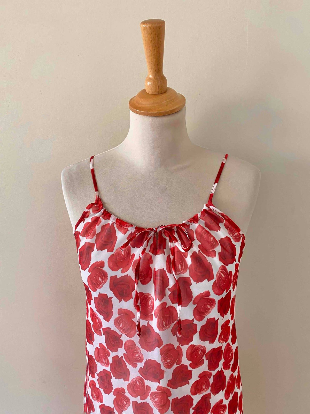 Prix unitaire parRobe midi fleurie en voile doublé blanc imprimé fleurs de roses rouges, bretelles spaghettis à nouer sur la poitrine froncée, forme fit and flare en biais, fabriquée en France, taille 36 portée ici sur un mannequin T36, aisselles 43cm.