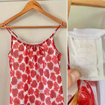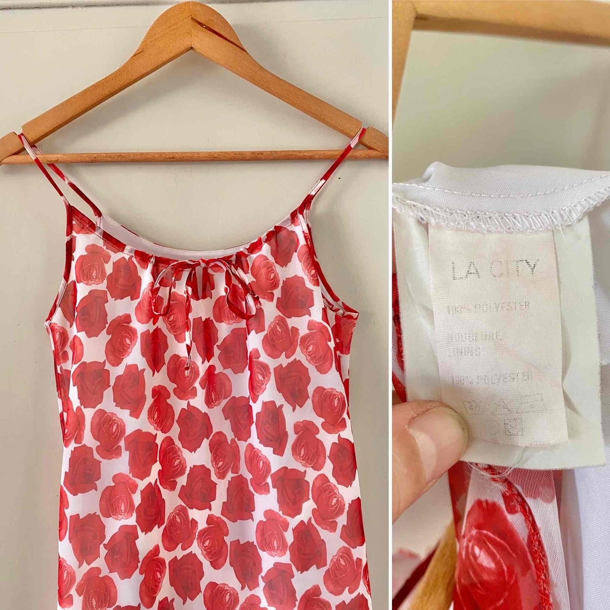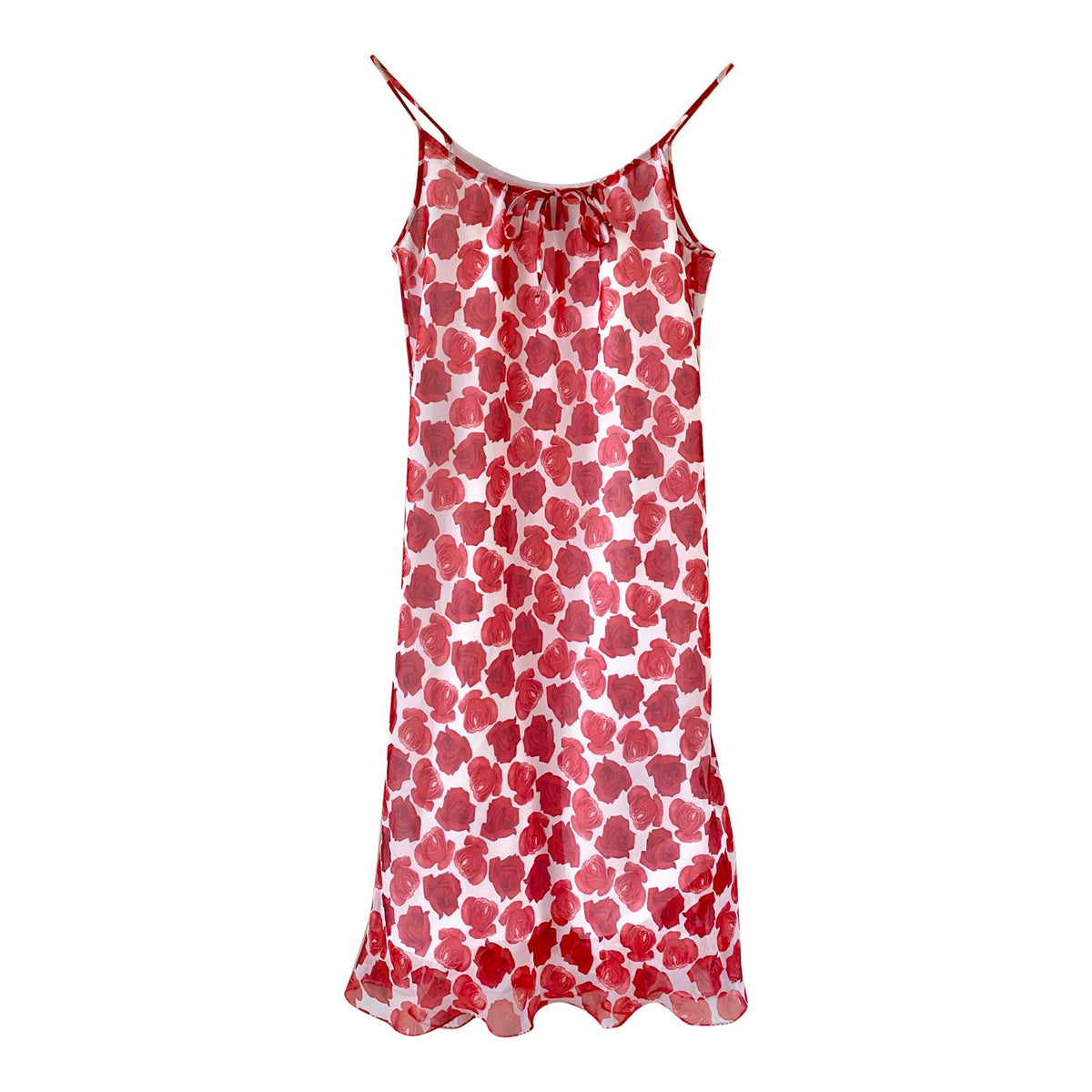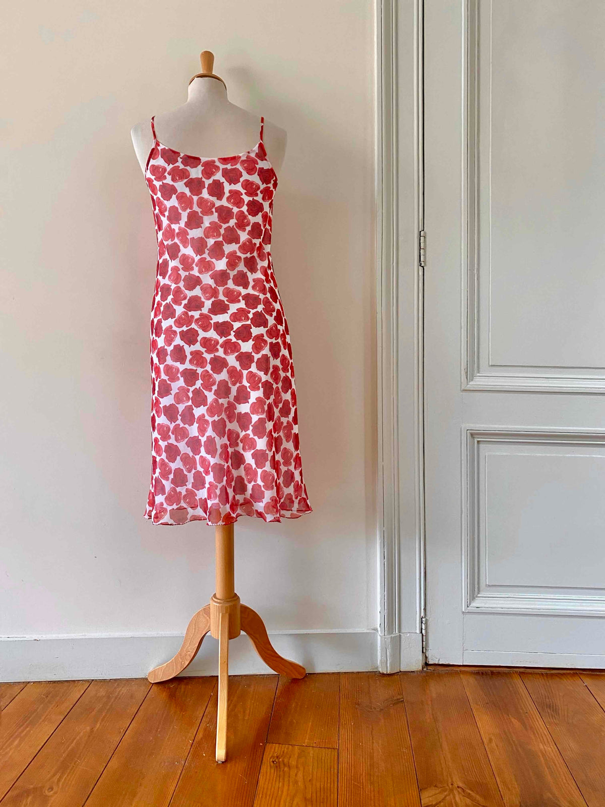 Prix unitaire parRobe midi fleurie en voile doublé blanc imprimé fleurs de roses rouges, bretelles spaghettis à nouer sur la poitrine froncée, forme fit and flare en biais, fabriquée en France, taille 36 portée ici sur un mannequin T36, aisselles 43cm.
