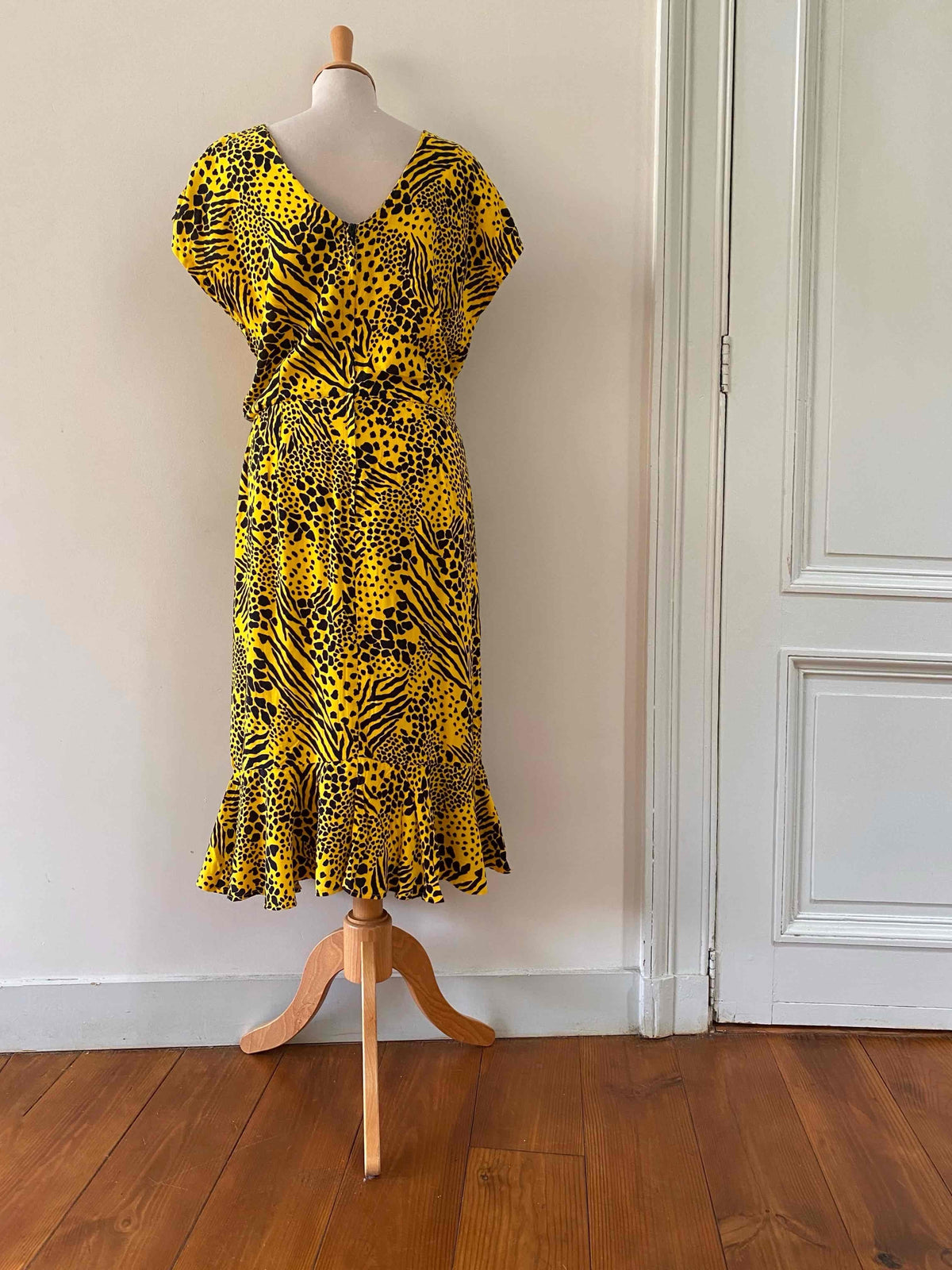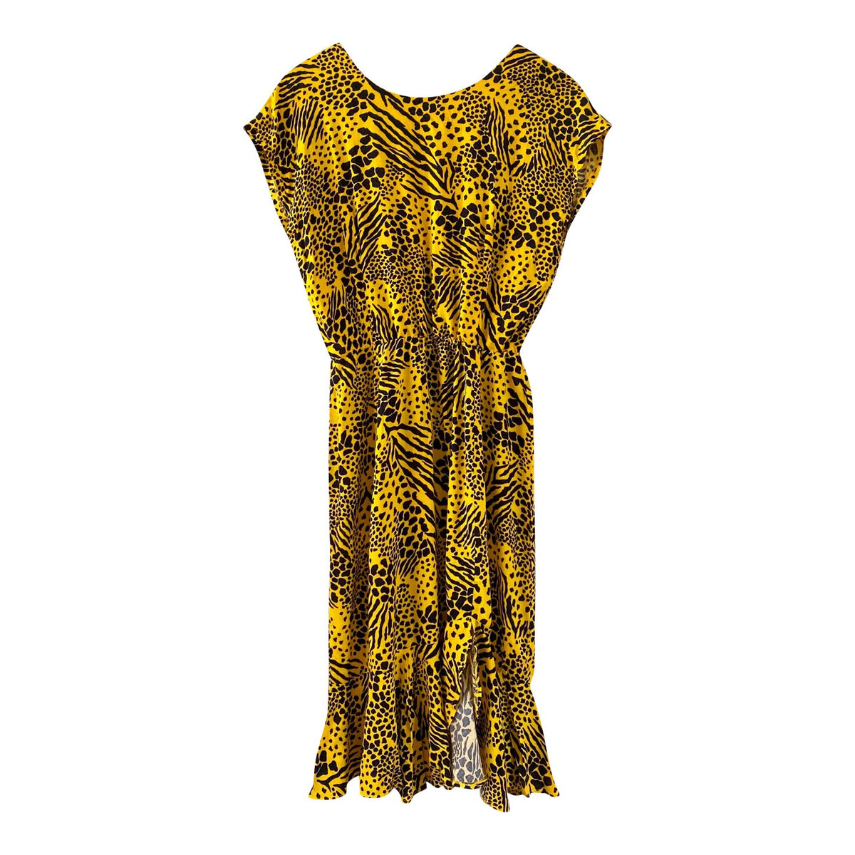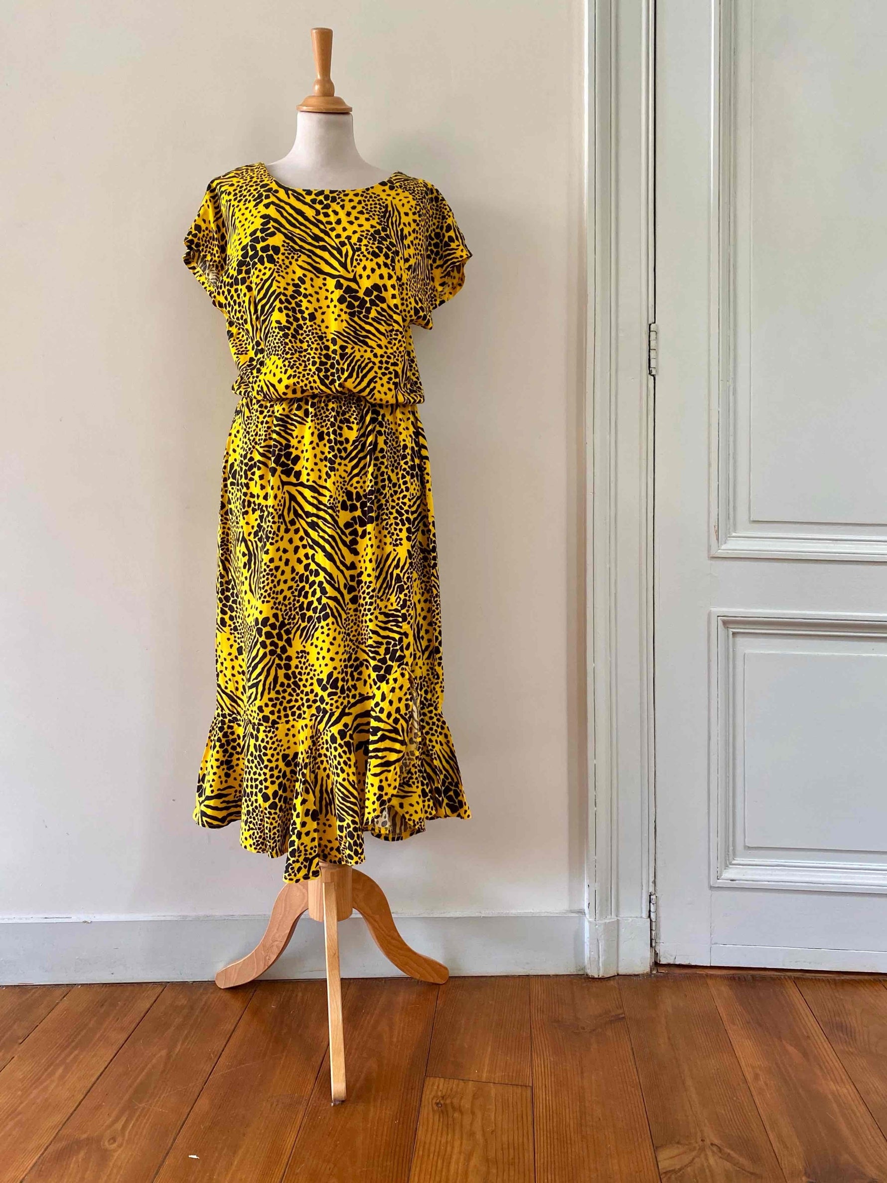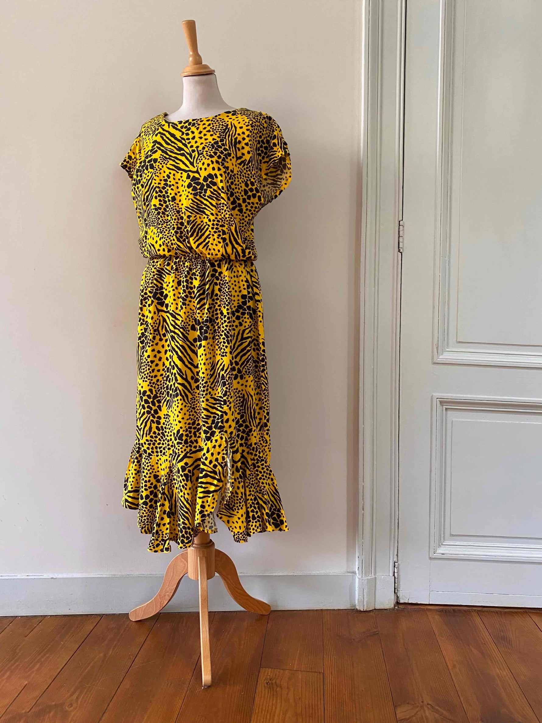 Robe midi léopard wild, en viscose jaune imprimée motifs safari léopards, girafe et zèbre, bas volanté, dos en V échancré, taille élastique, manches chauve-souris courtes, fabriquée en France, taille 44 italienne, taille 38 portée ici sur un mannequin T36 et serrée sur une personne T40.