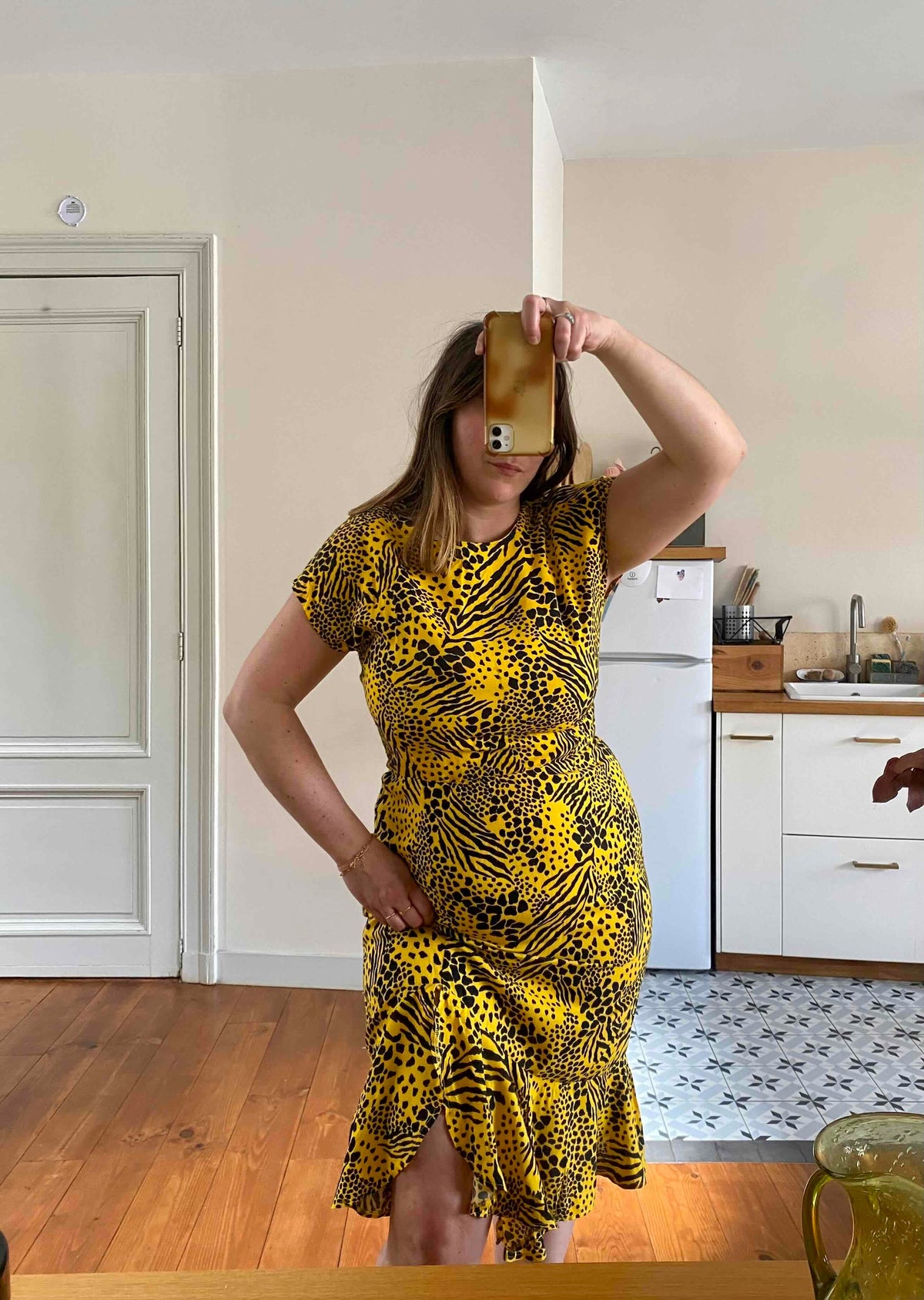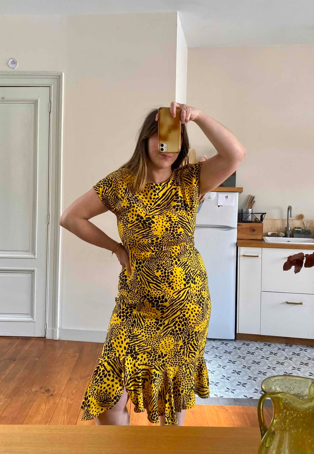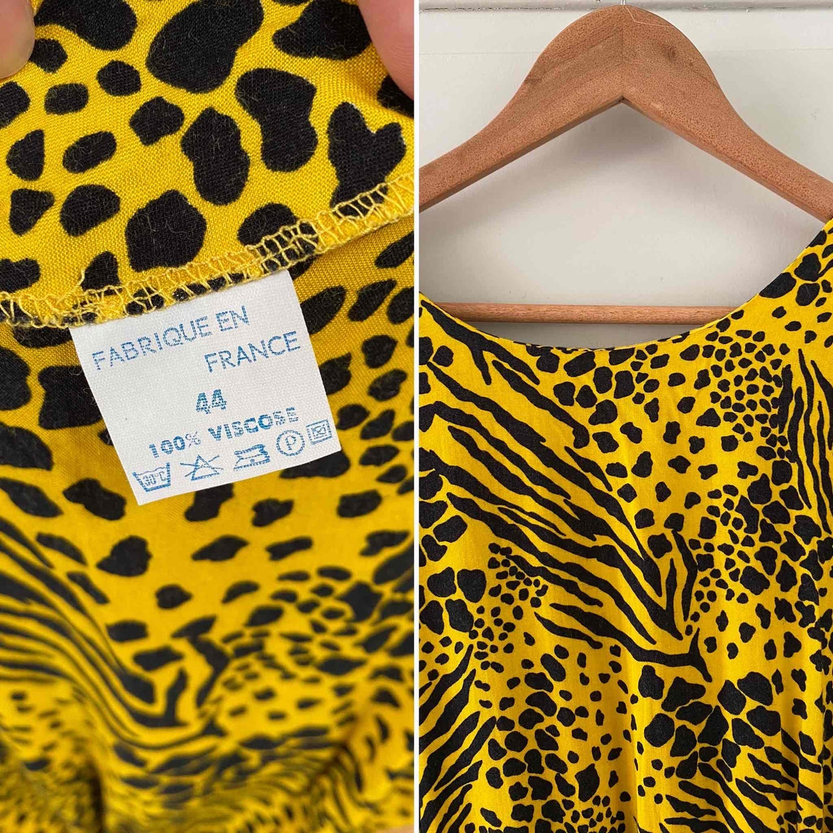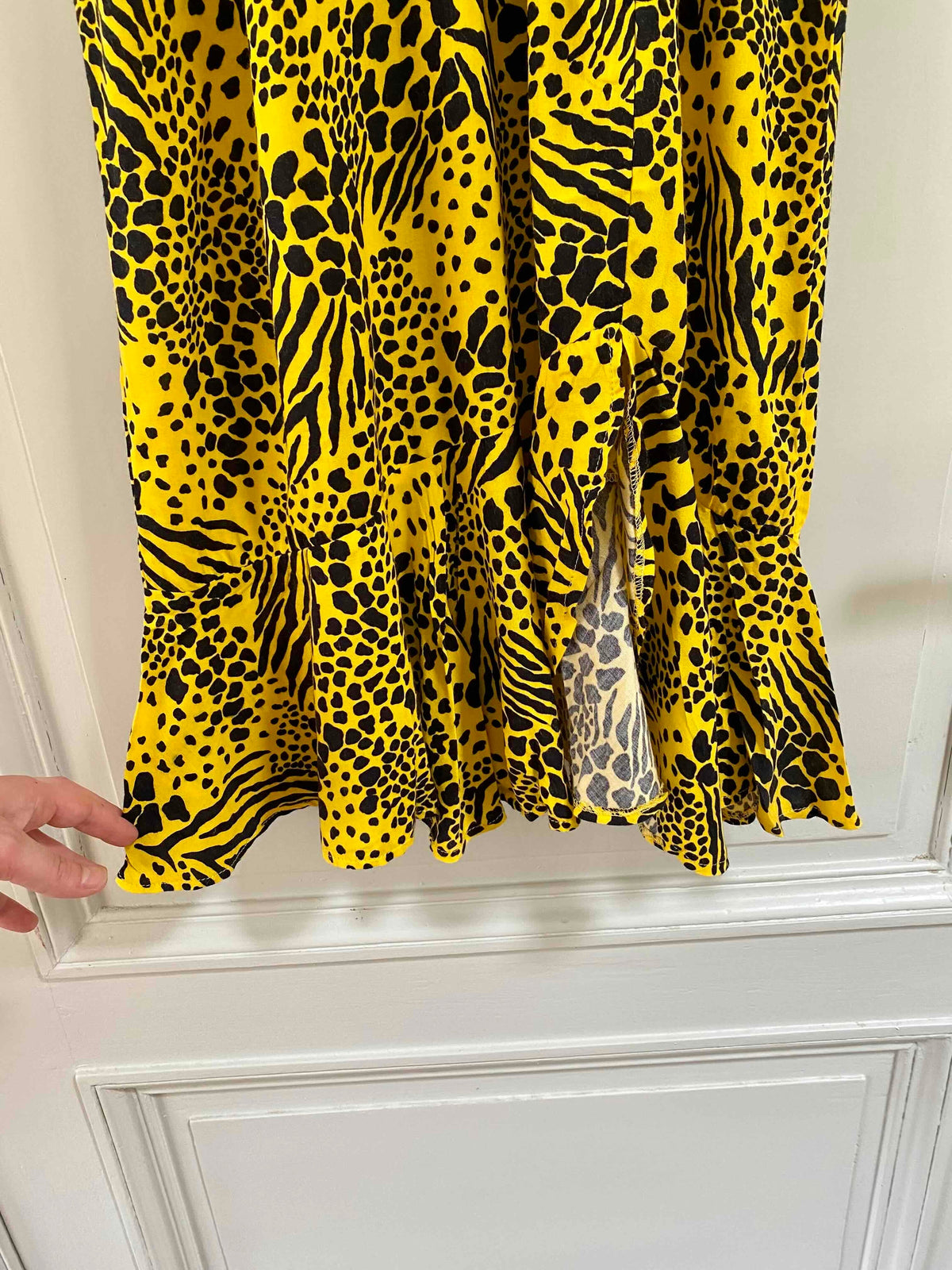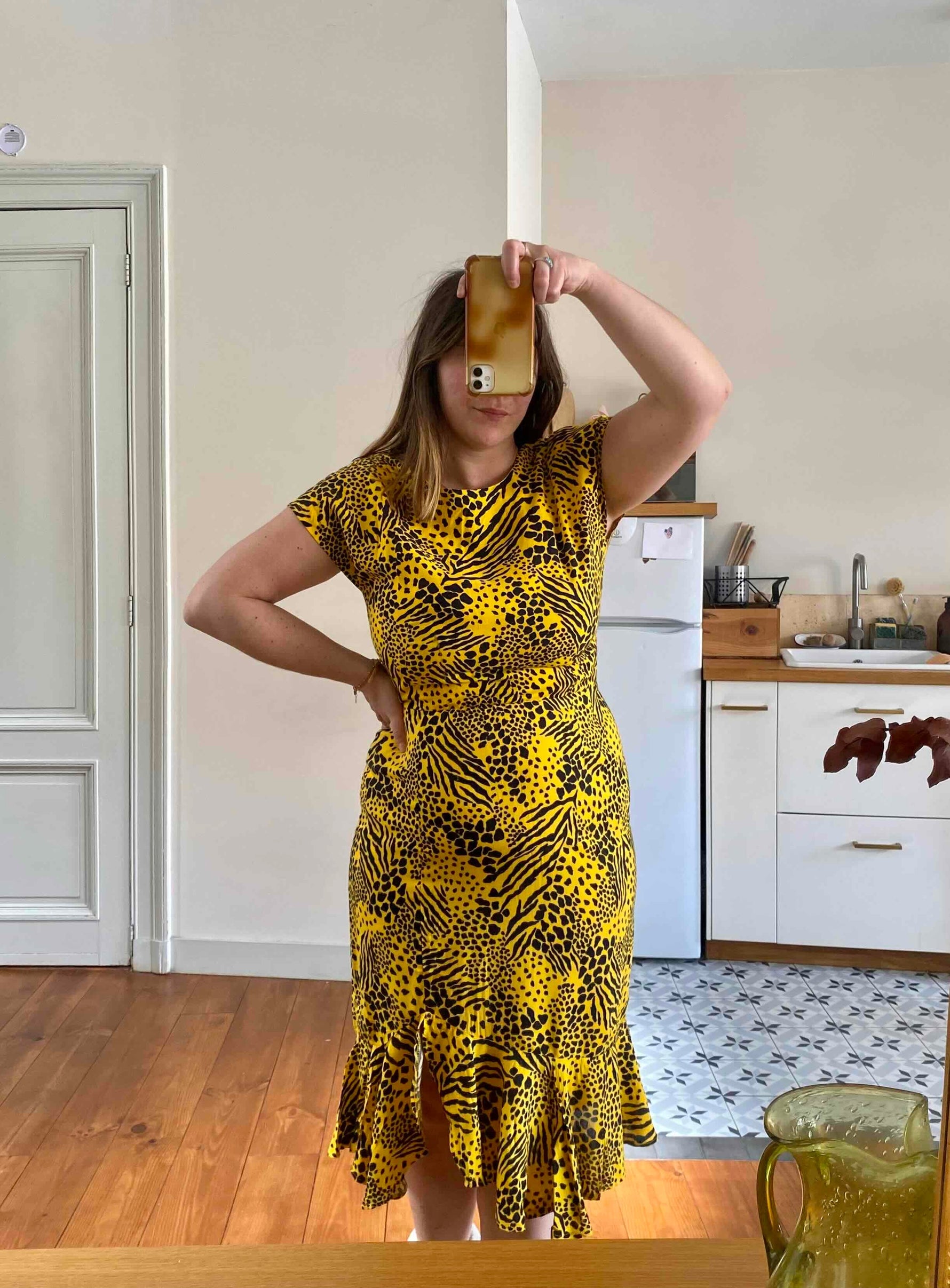 Robe midi léopard wild, en viscose jaune imprimée motifs safari léopards, girafe et zèbre, bas volanté, dos en V échancré, taille élastique, manches chauve-souris courtes, fabriquée en France, taille 44 italienne, taille 38 portée ici sur un mannequin T36 et serrée sur une personne T40.