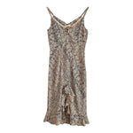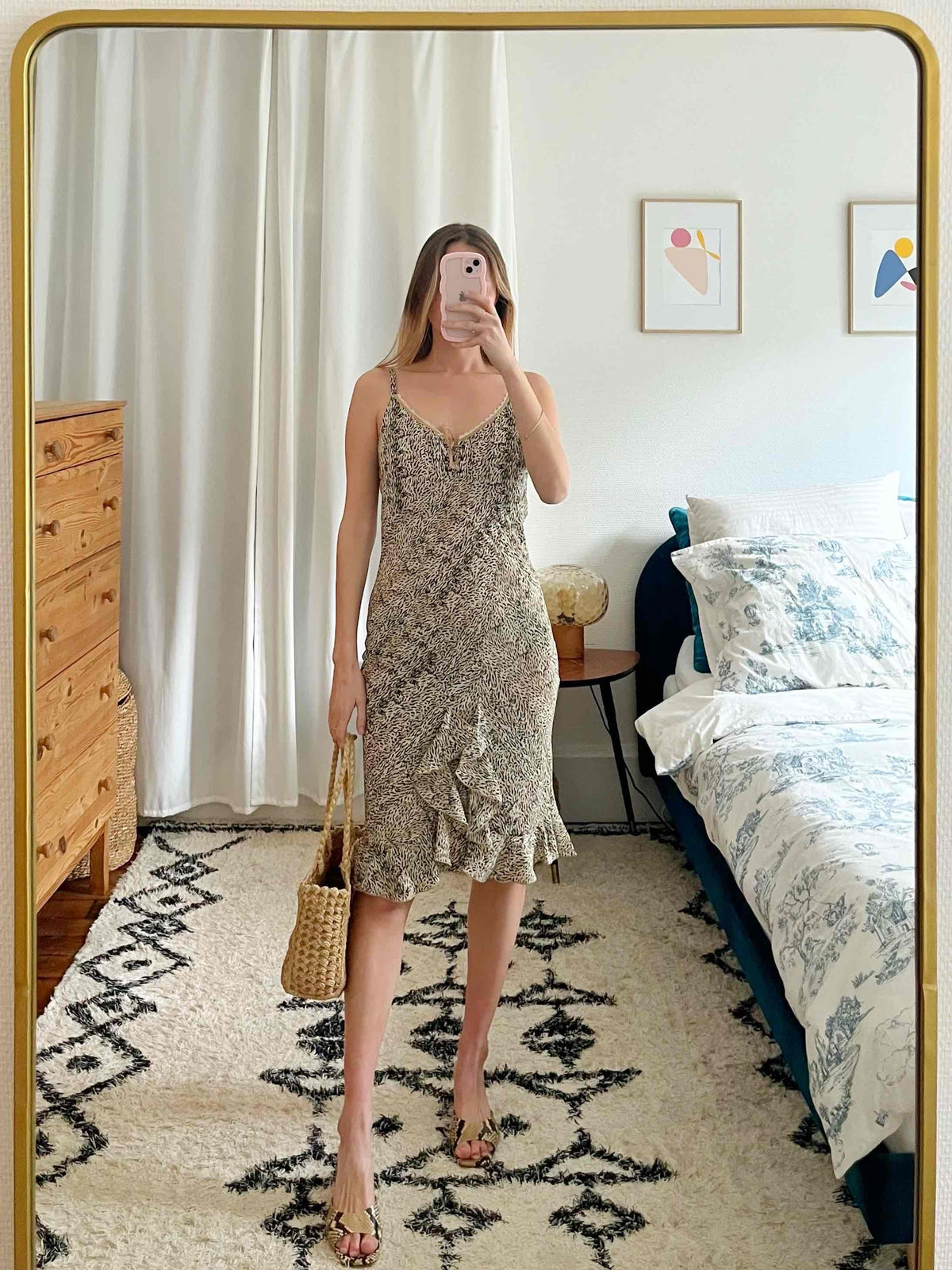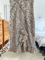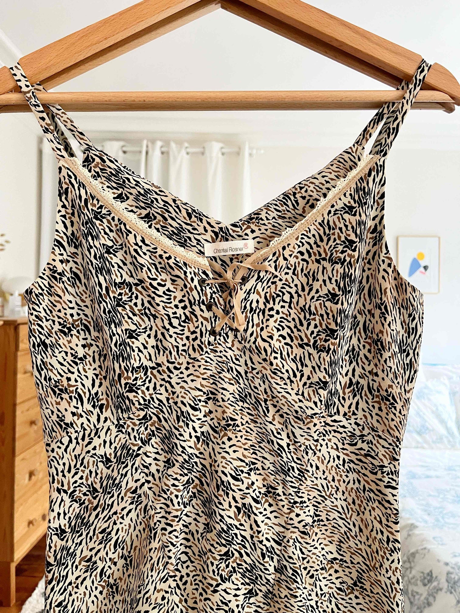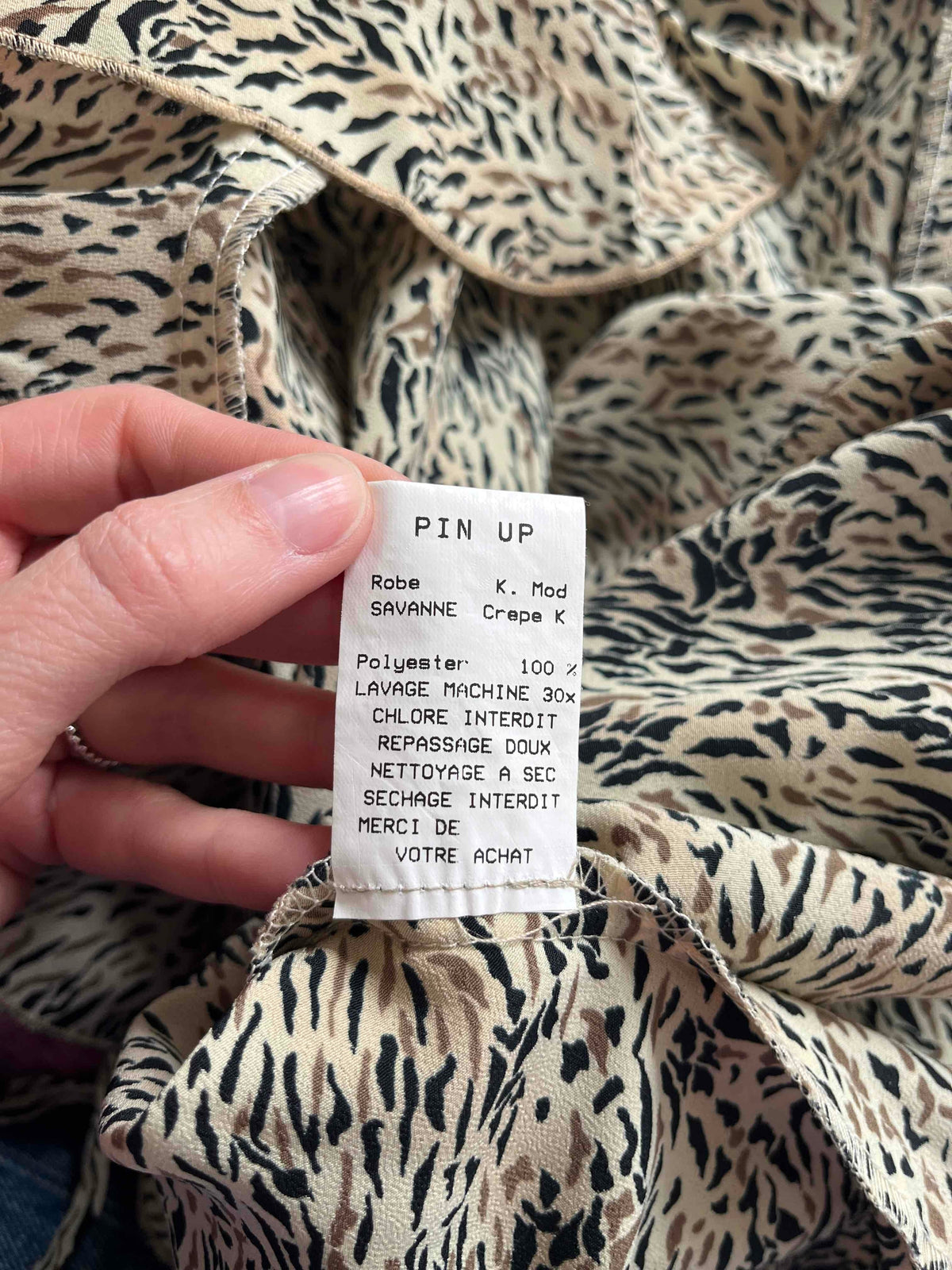 Prix unitaire parRobe léopard, longueur midi, volants en bas de la robe, décolleté orné de dentelle et d’un noeud, bretelles non ajustables, fabriquée en France. Portée ici sur une T36 pour 1m64 (mesure poitrine 43cm).