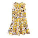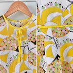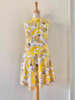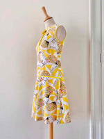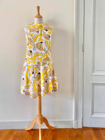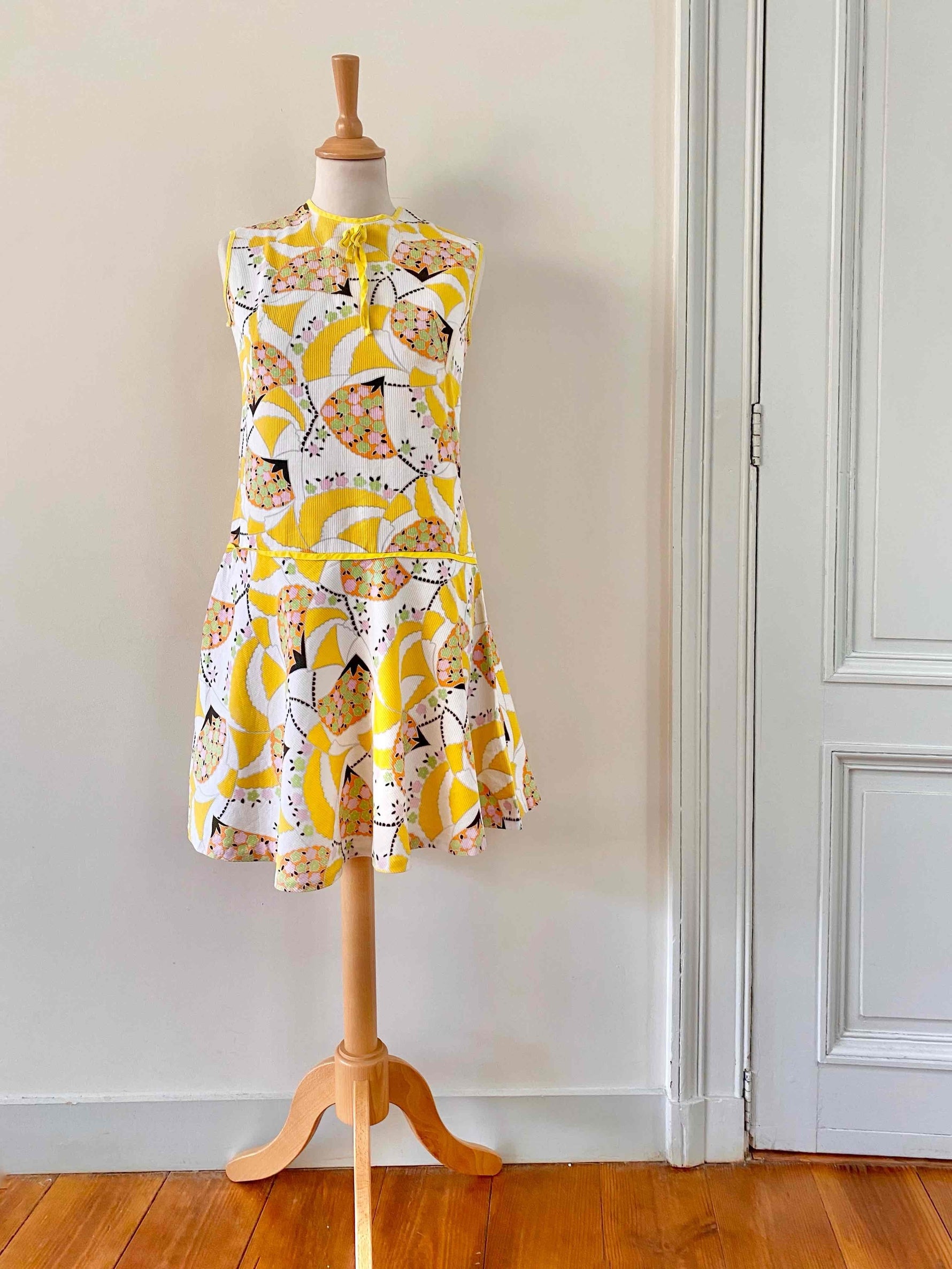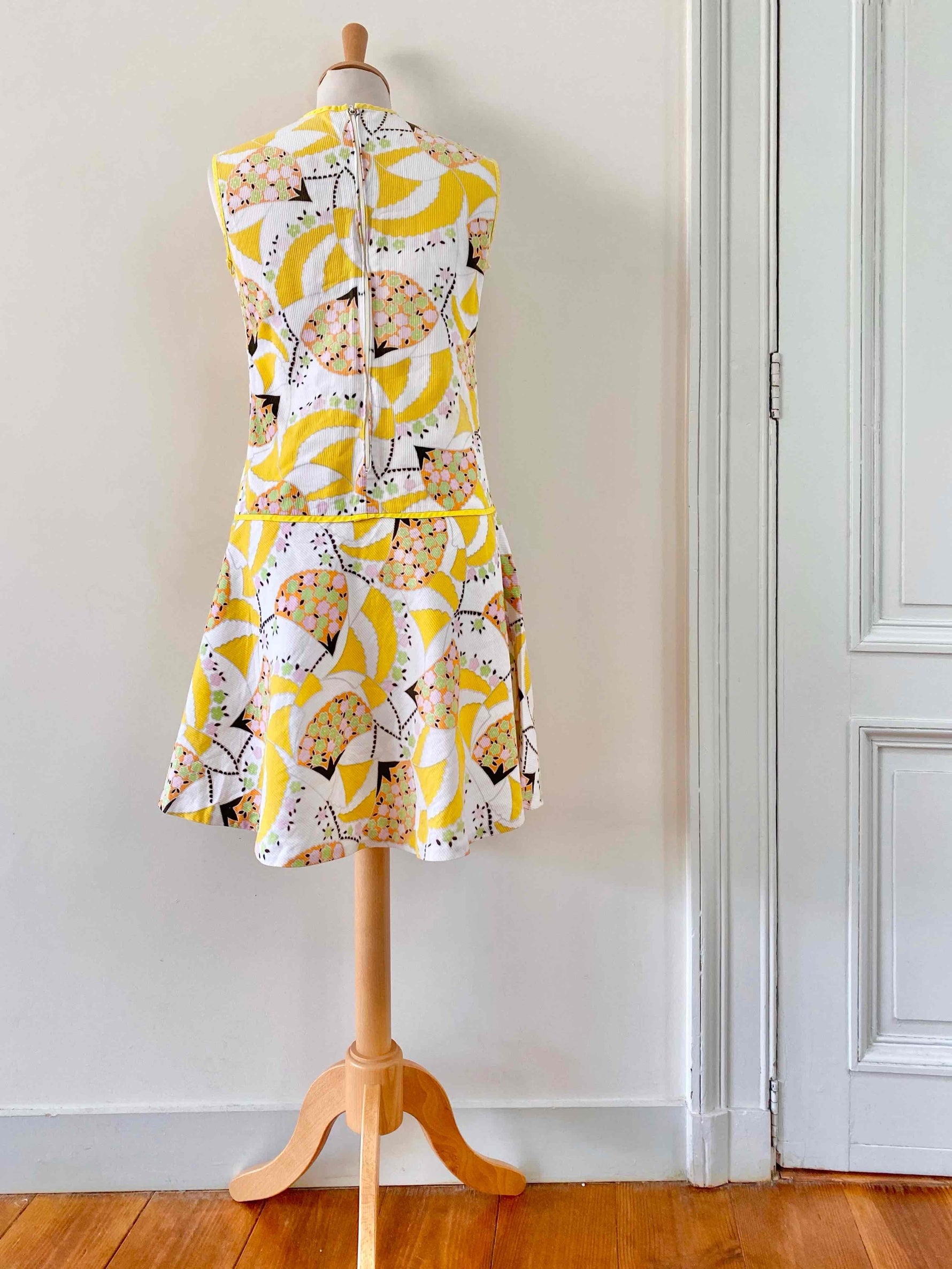Mini Robe 70’s en 100% coton piqué strié imprimé fleurs et motifs jaunes, vert pistache, roses, fond blanc, bordures jaunes, forme trois trous et bas trapèze, authentique 70’s, taille 36 portée ici sur un mannequin T36, aisselles 44cm.