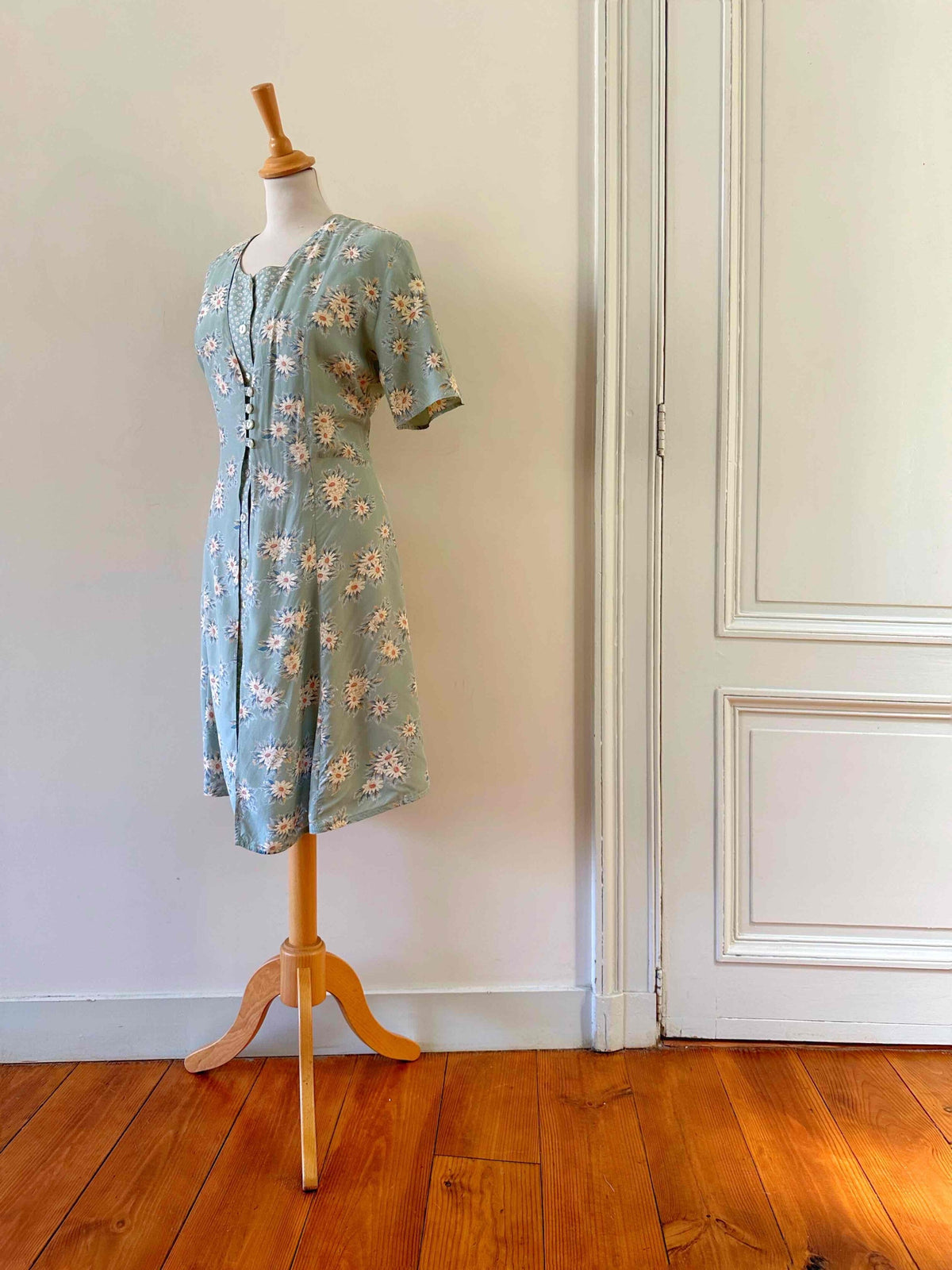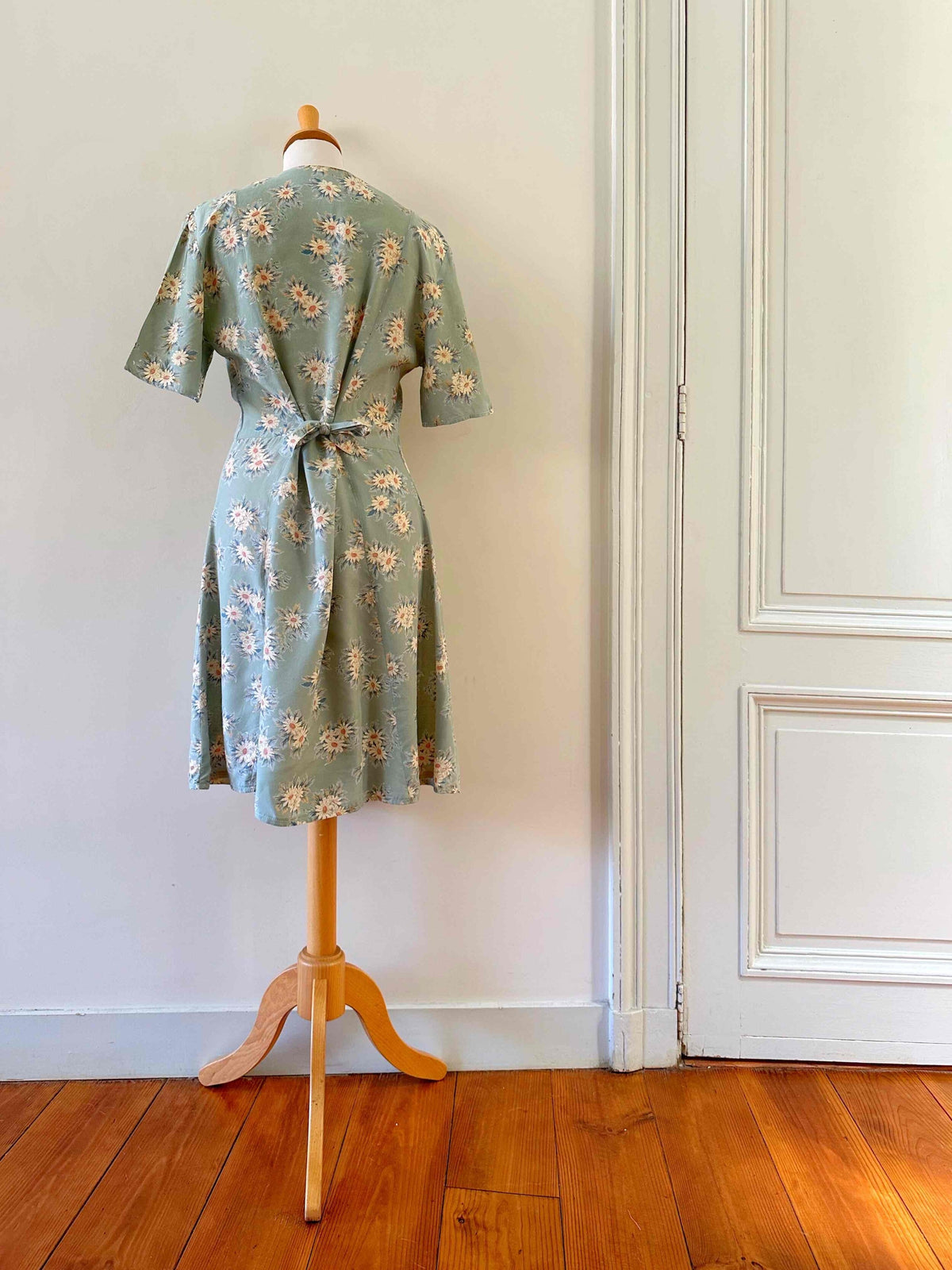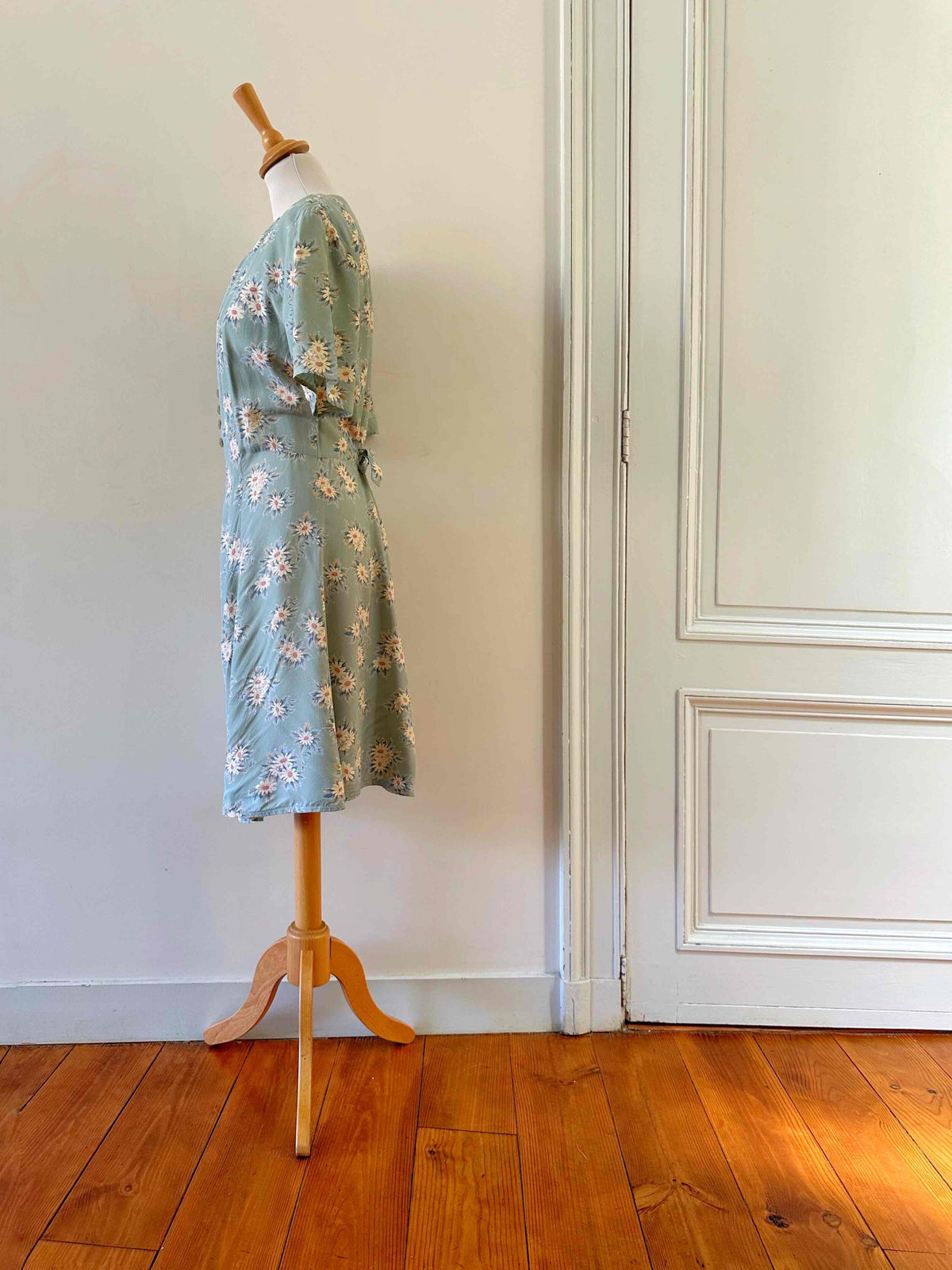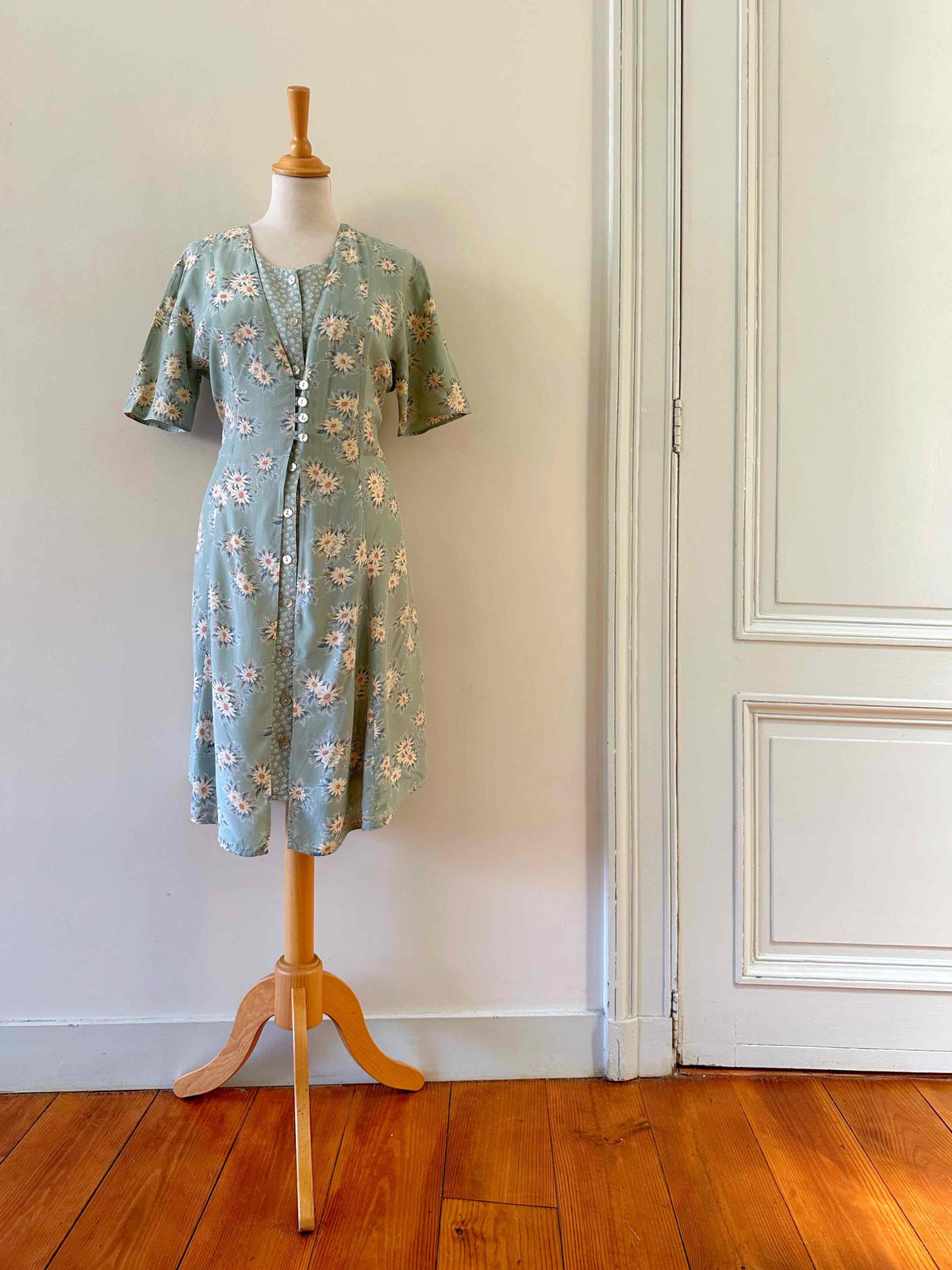 Prix unitaire parRobe boutonnée à fleurs, en viscose vert amande imprimée marguerites blanches, taille dos à nouer, effet double layer a mini fleurs, fabriquée en France, taille 36 portée ici sur un mannequin T36.