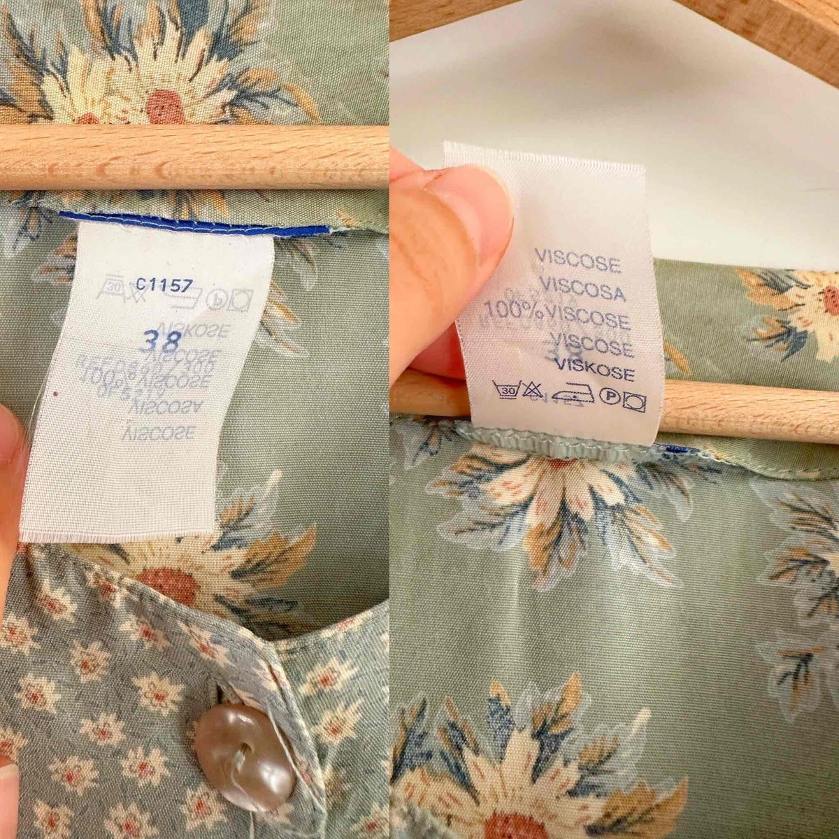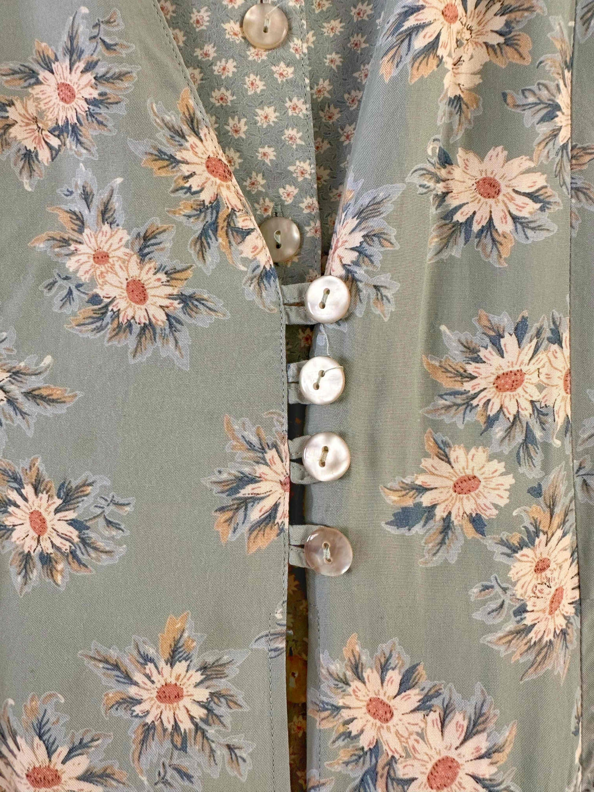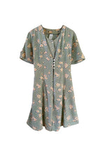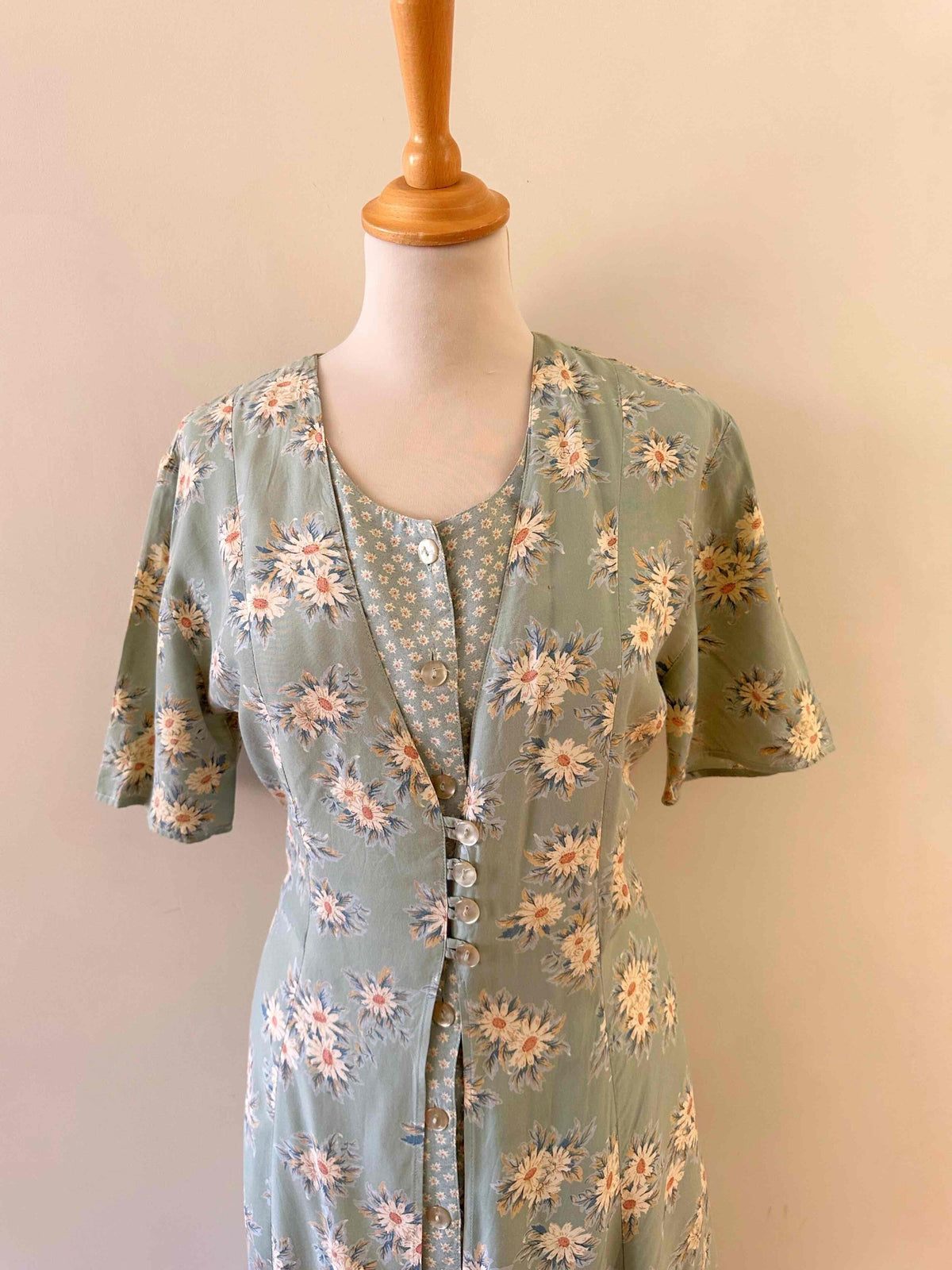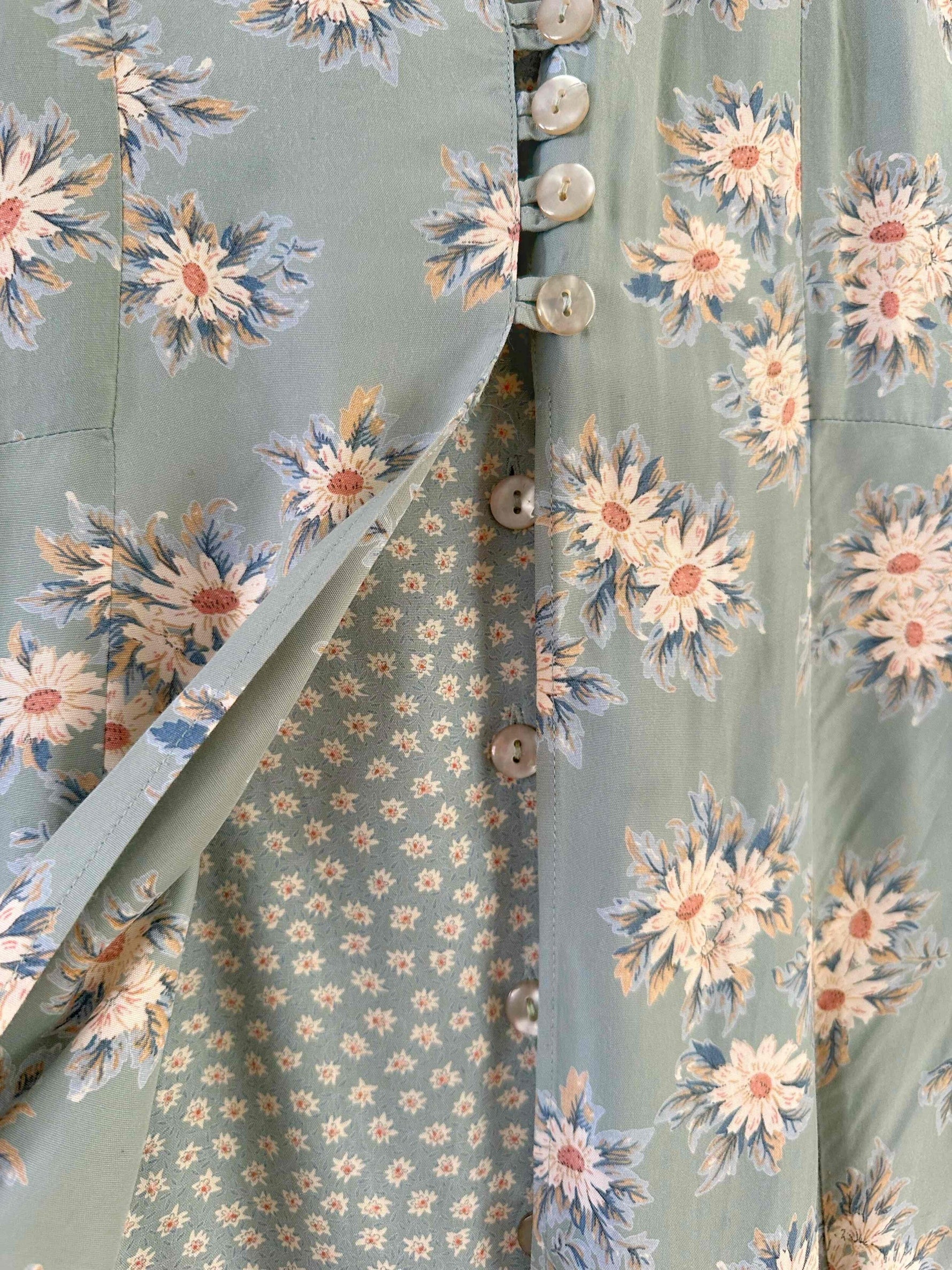 Prix unitaire parRobe boutonnée à fleurs, en viscose vert amande imprimée marguerites blanches, taille dos à nouer, effet double layer a mini fleurs, fabriquée en France, taille 36 portée ici sur un mannequin T36.