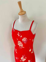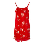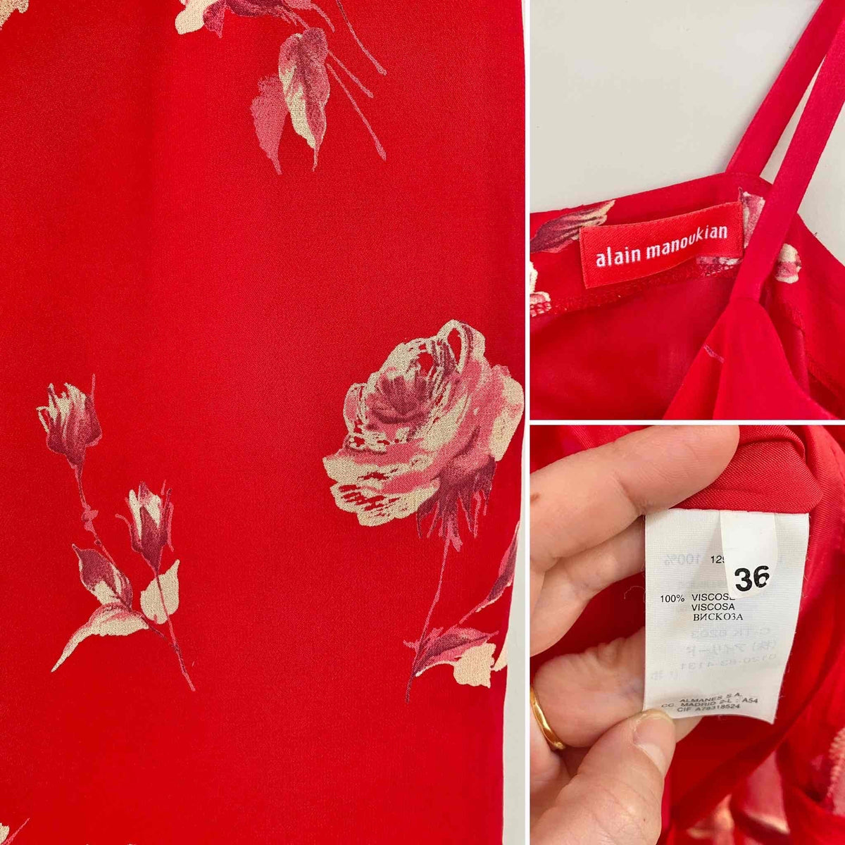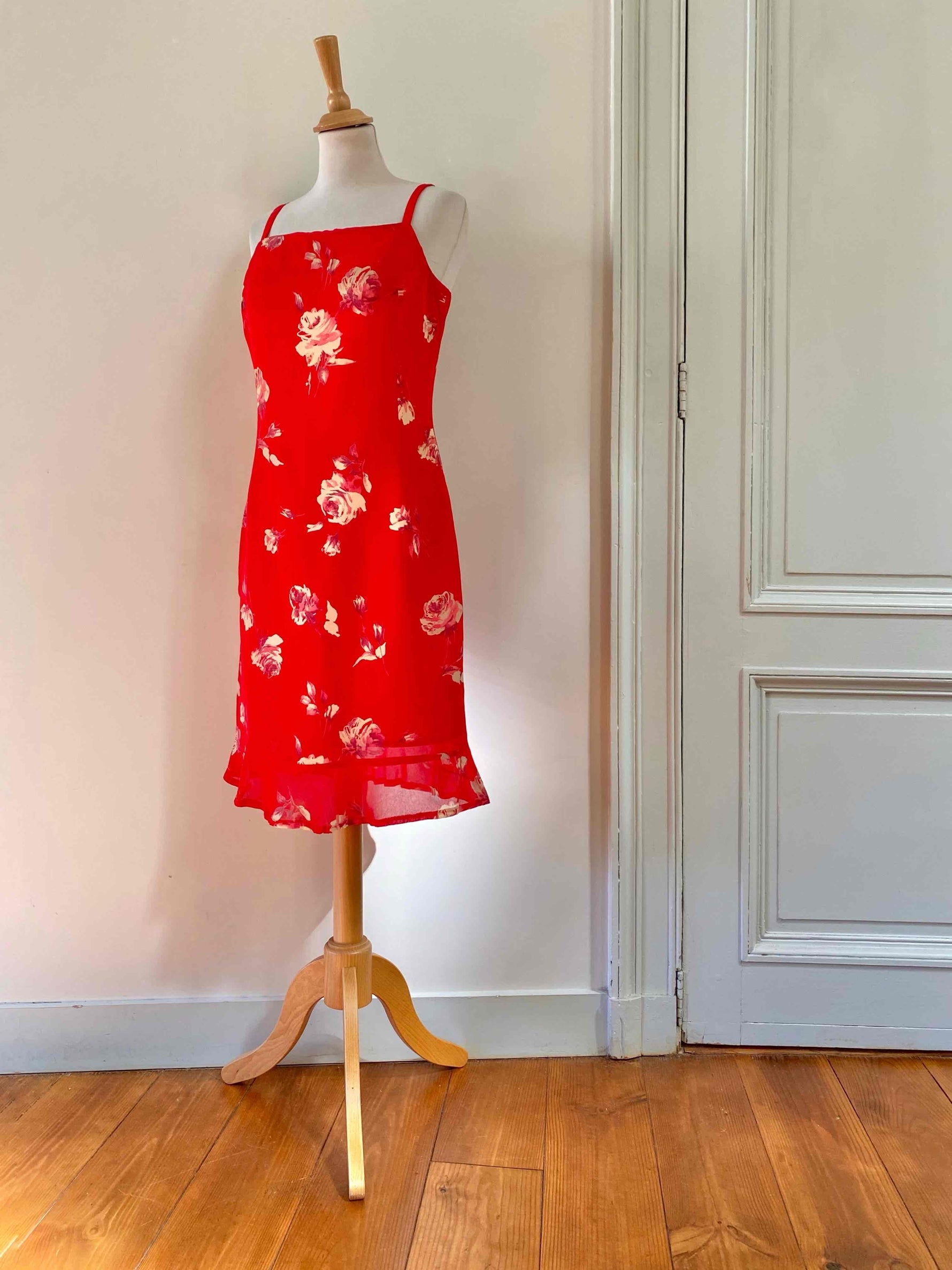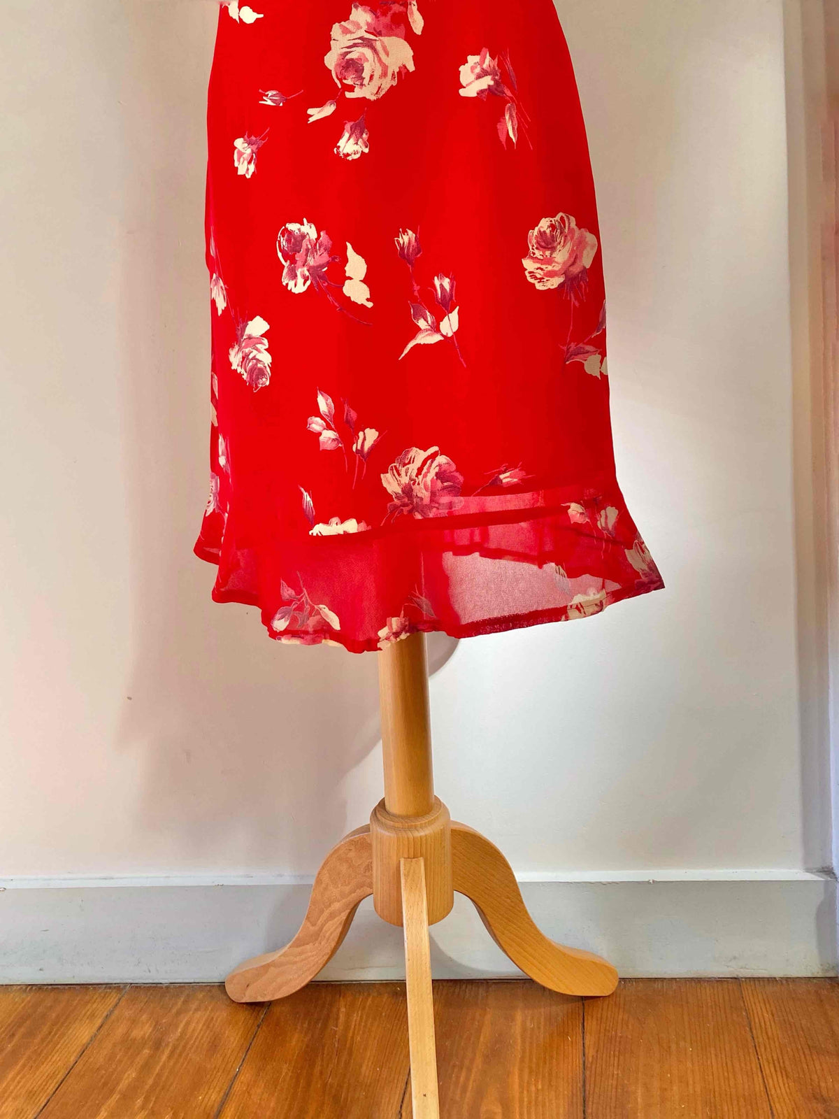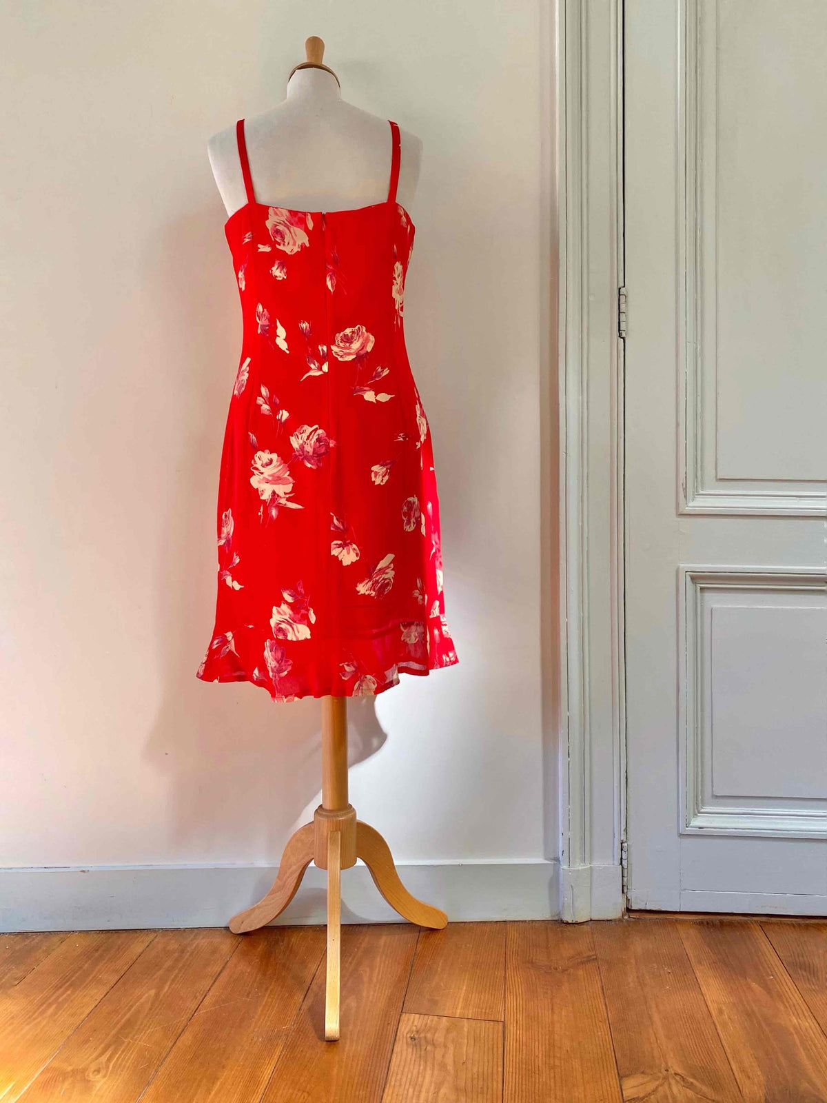Mini robe à fleurs en voile viscose doublée rouges imprimée fleurs roses et blanches, fines bretelles, encolure carrée, bas volanté, alain manoukian y2k, taille 36 portée ici sur un mannequin T36.