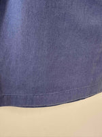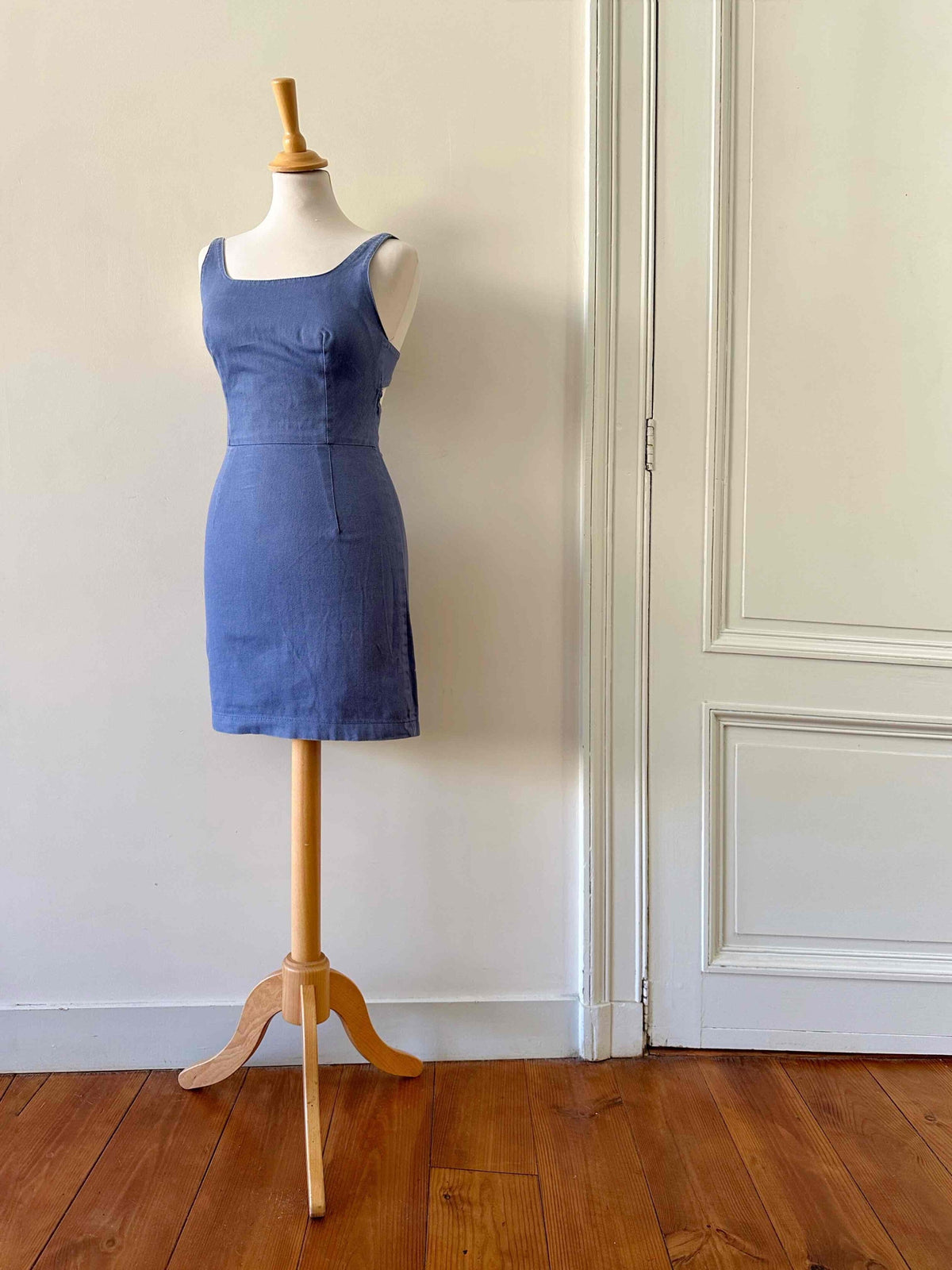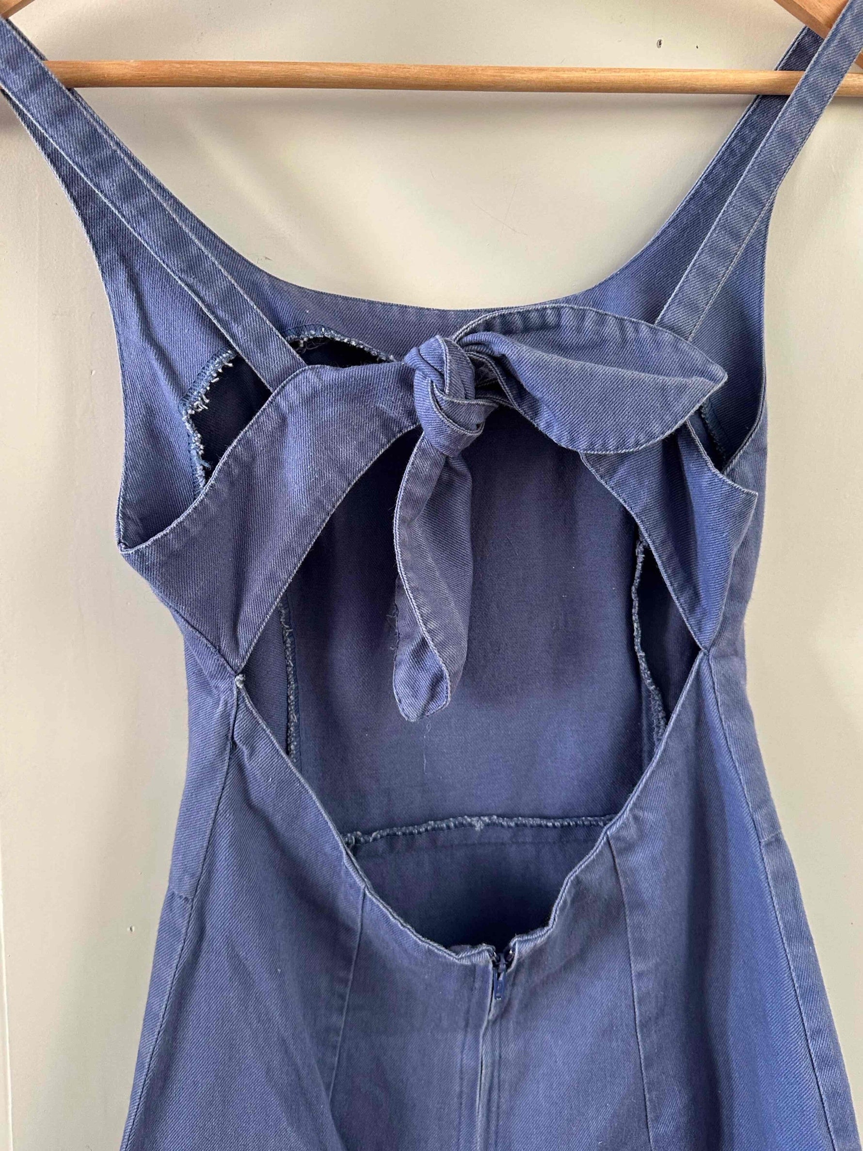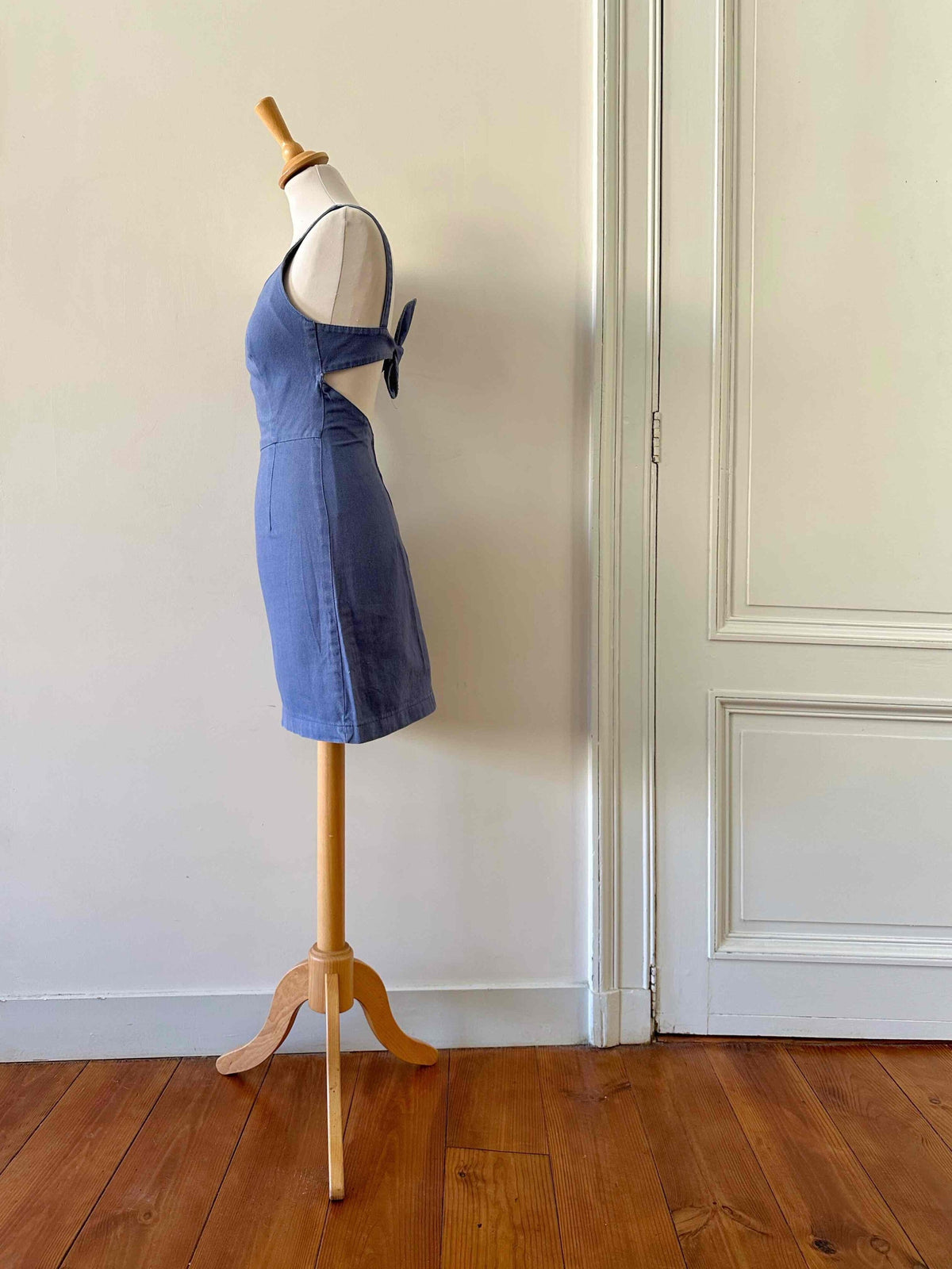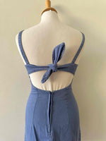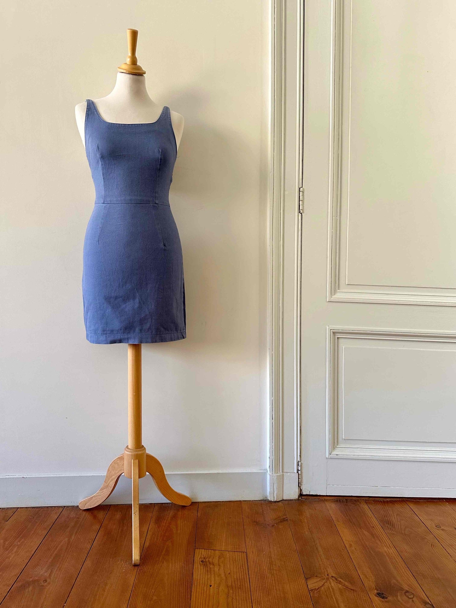 Robe dos nu en denim, 100% coton denim bleu, dos à nouer par un joli nœud, fabriquée en France, taille 34, actuelle portée ici serrée sur un mannequin T36, aisselles 42cm.