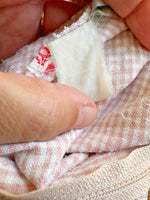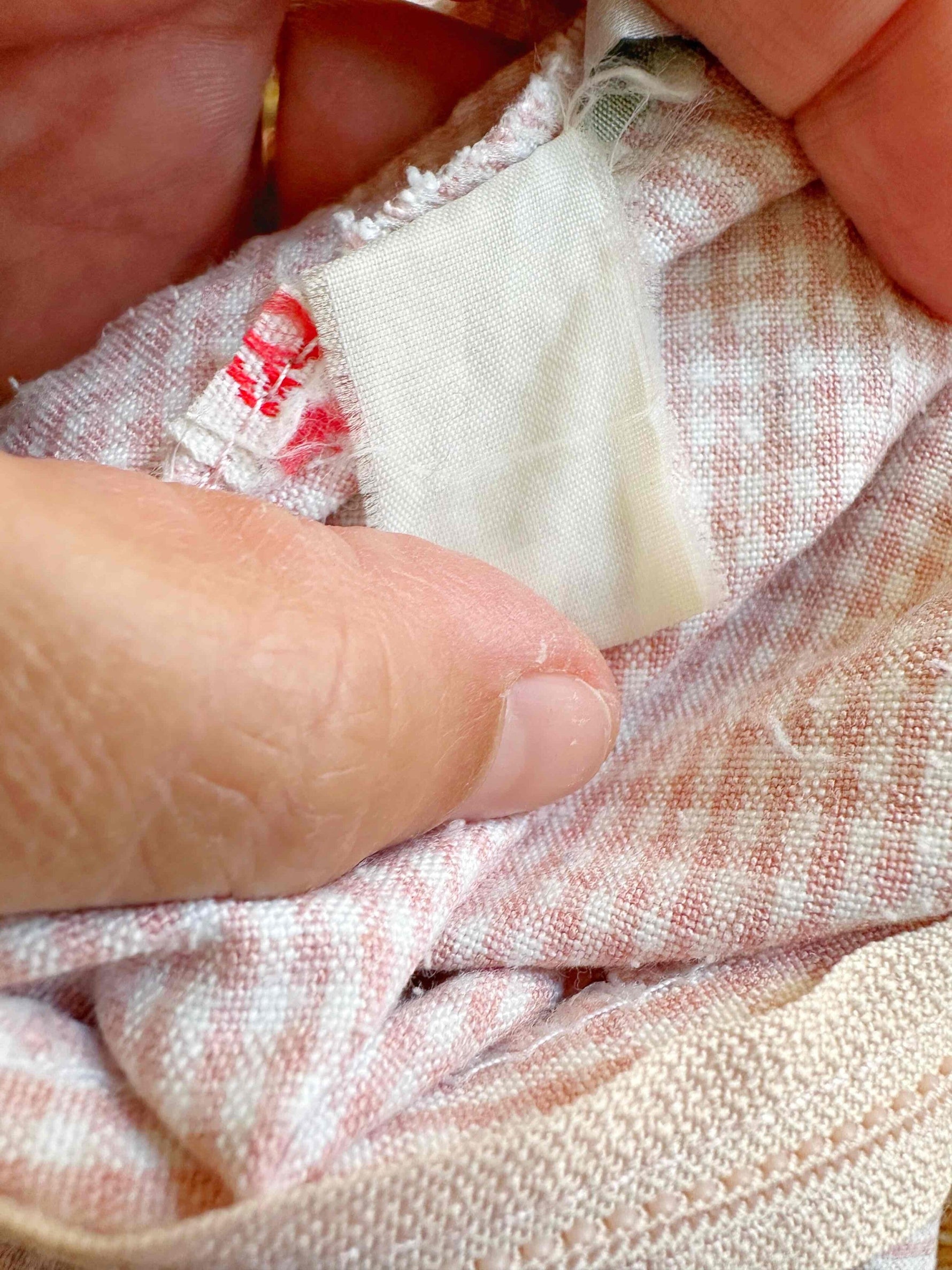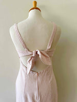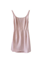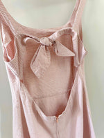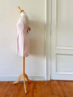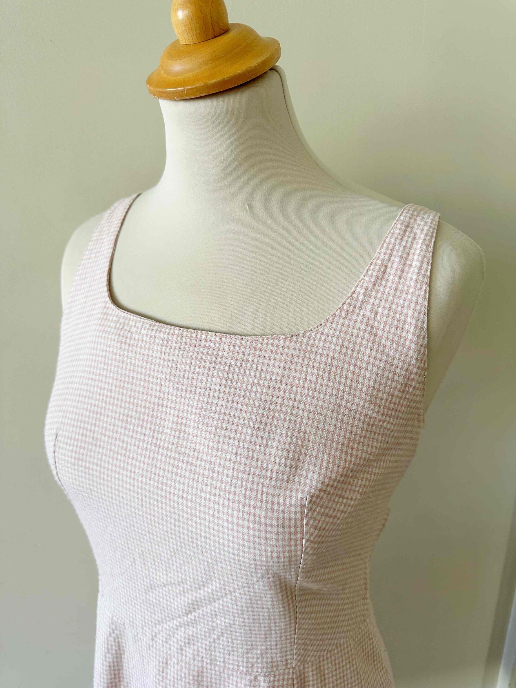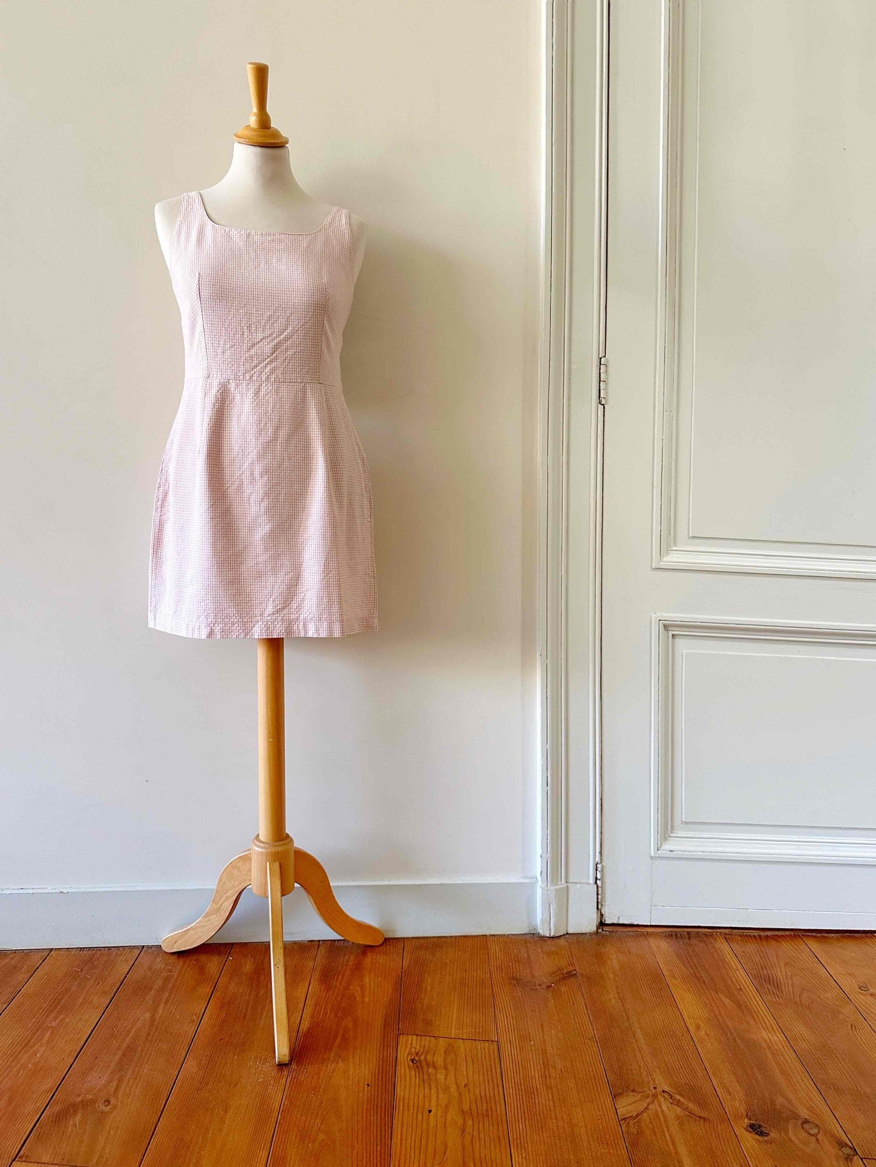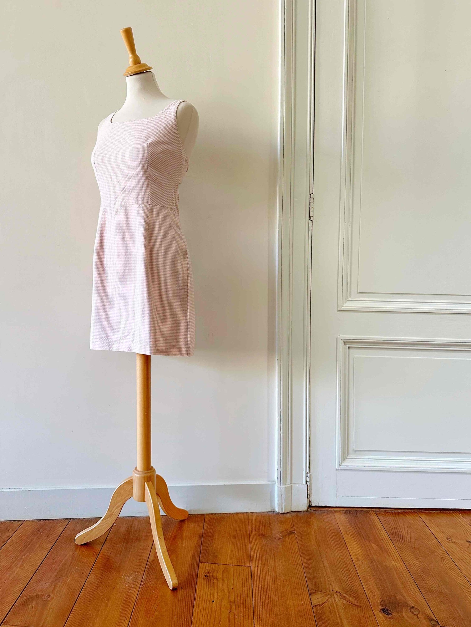Prix unitaire parRobe vichy dos nu, en lin viscose mélangé à minis carreaux vichy roses et blancs, dos à nouer par un joli nœud, fabriquée en France, taille 36, portée ici sur un mannequin T36, aisselles 44 cm.