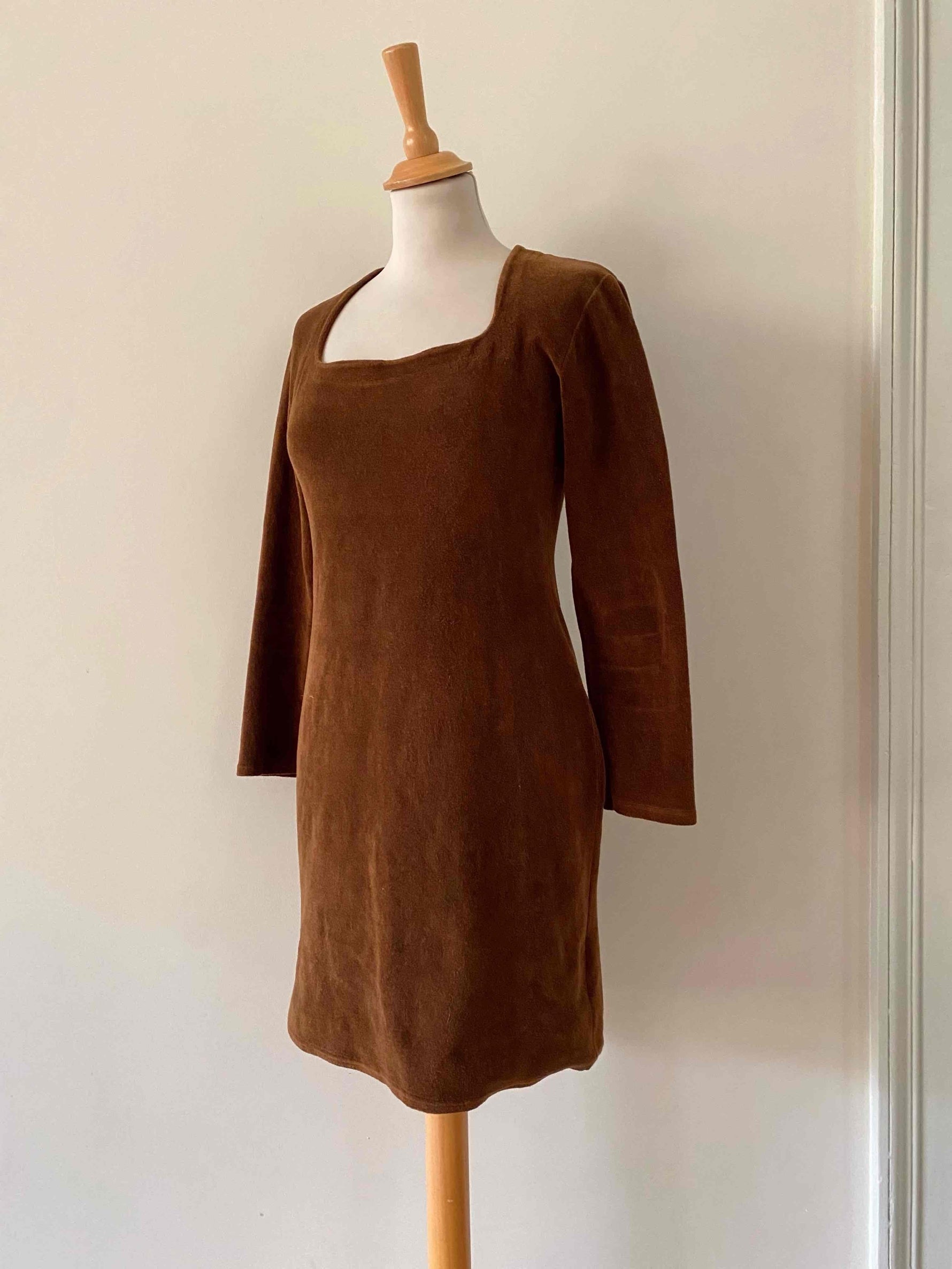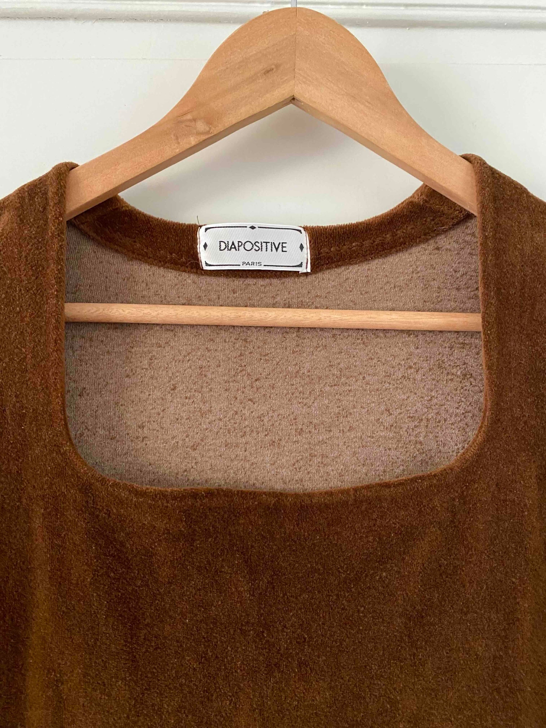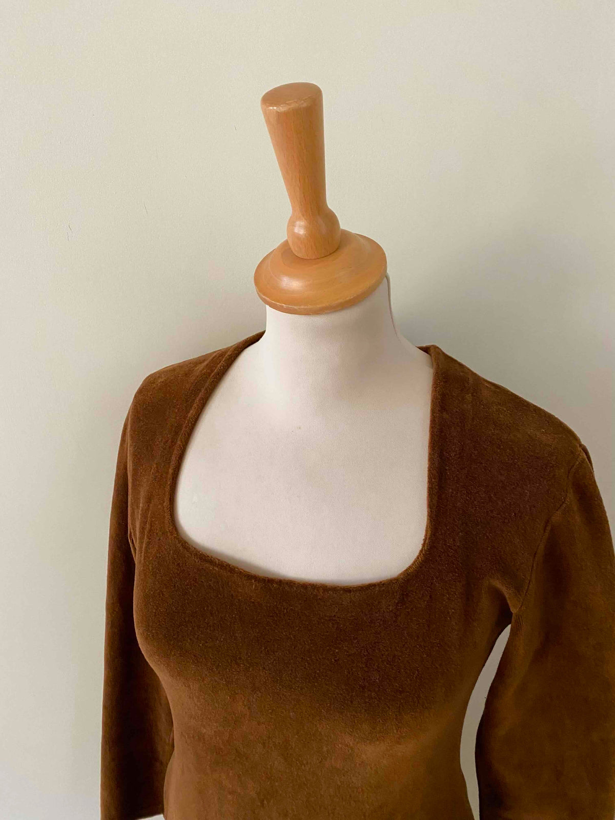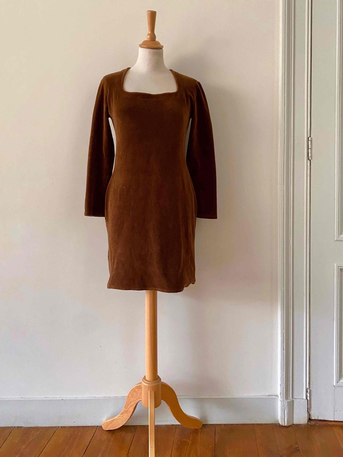 Mini robe en velours caramel, velours de coton ras, doux et elasthanne, encollure corsage carrée, manches longue 3/4, fabriquée en France, taille 38 portée ici sur un mannequin T36, aisselles 46cm.