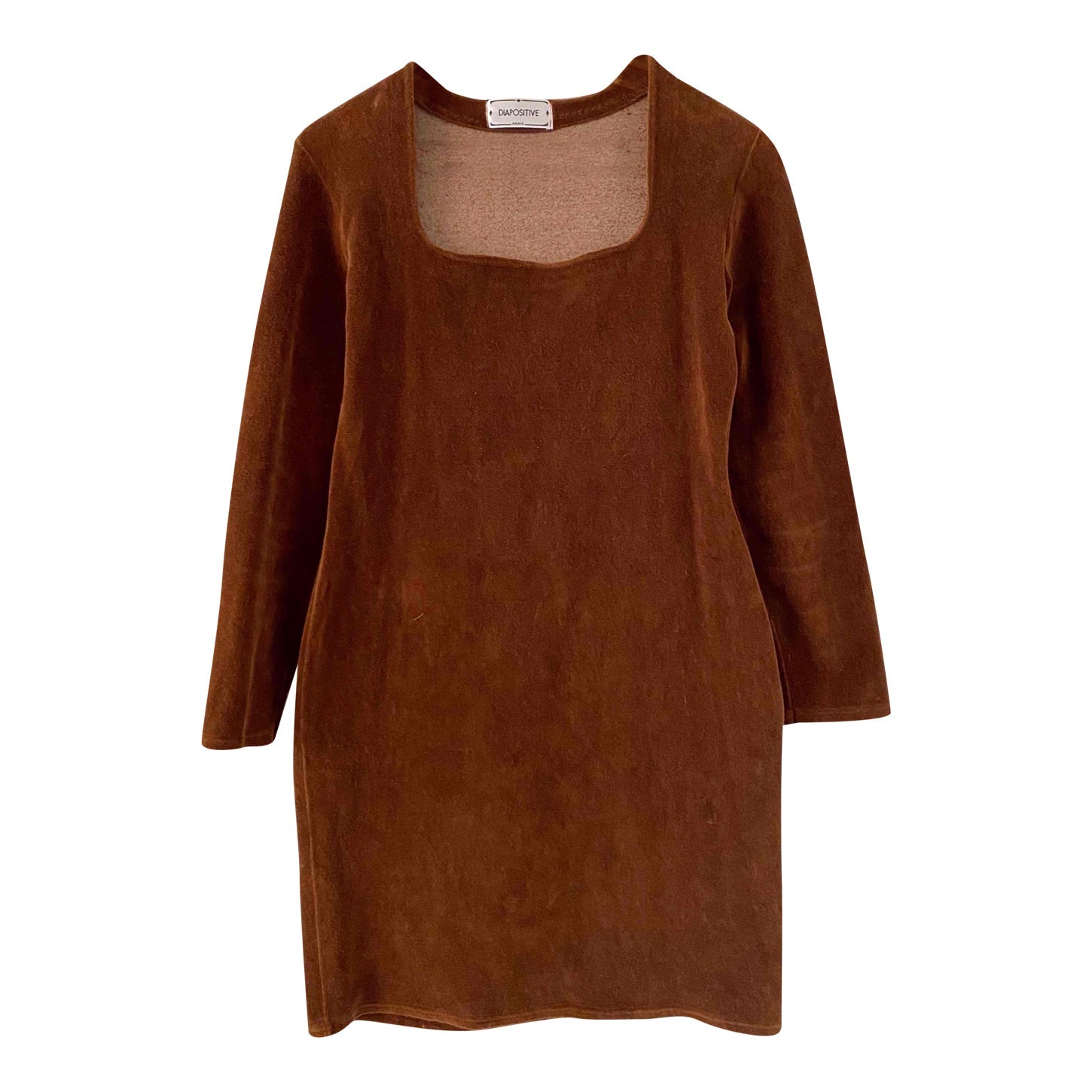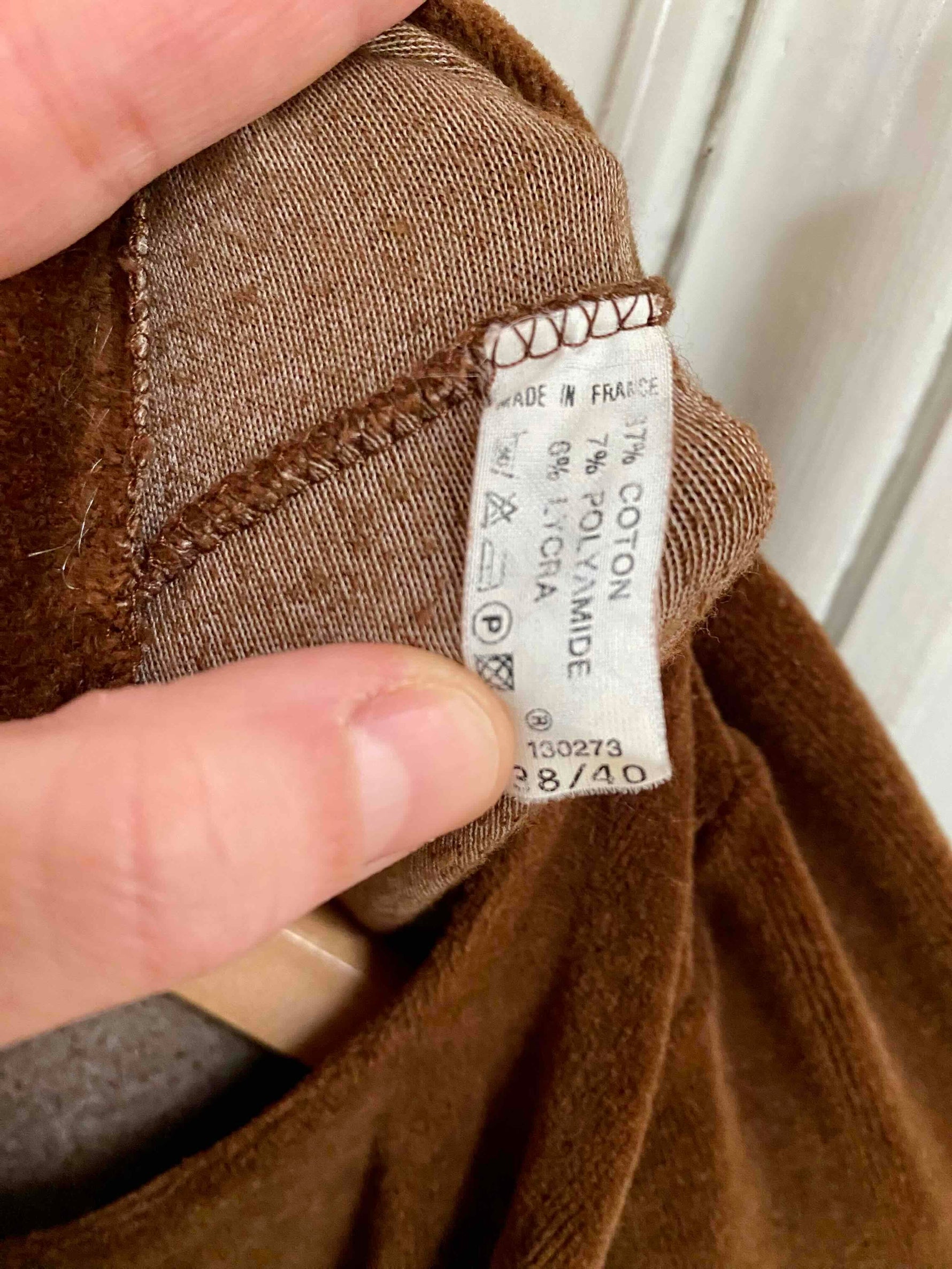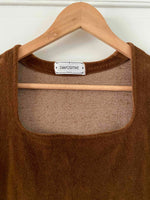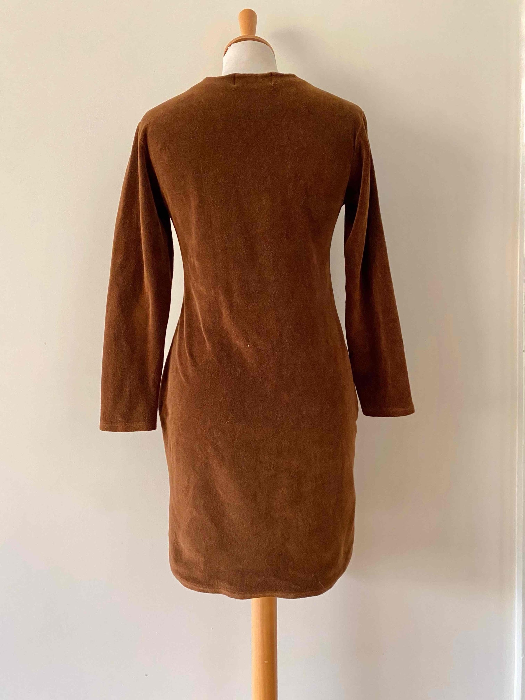 Mini robe en velours caramel, velours de coton ras, doux et elasthanne, encollure corsage carrée, manches longue 3/4, fabriquée en France, taille 38 portée ici sur un mannequin T36, aisselles 46cm.