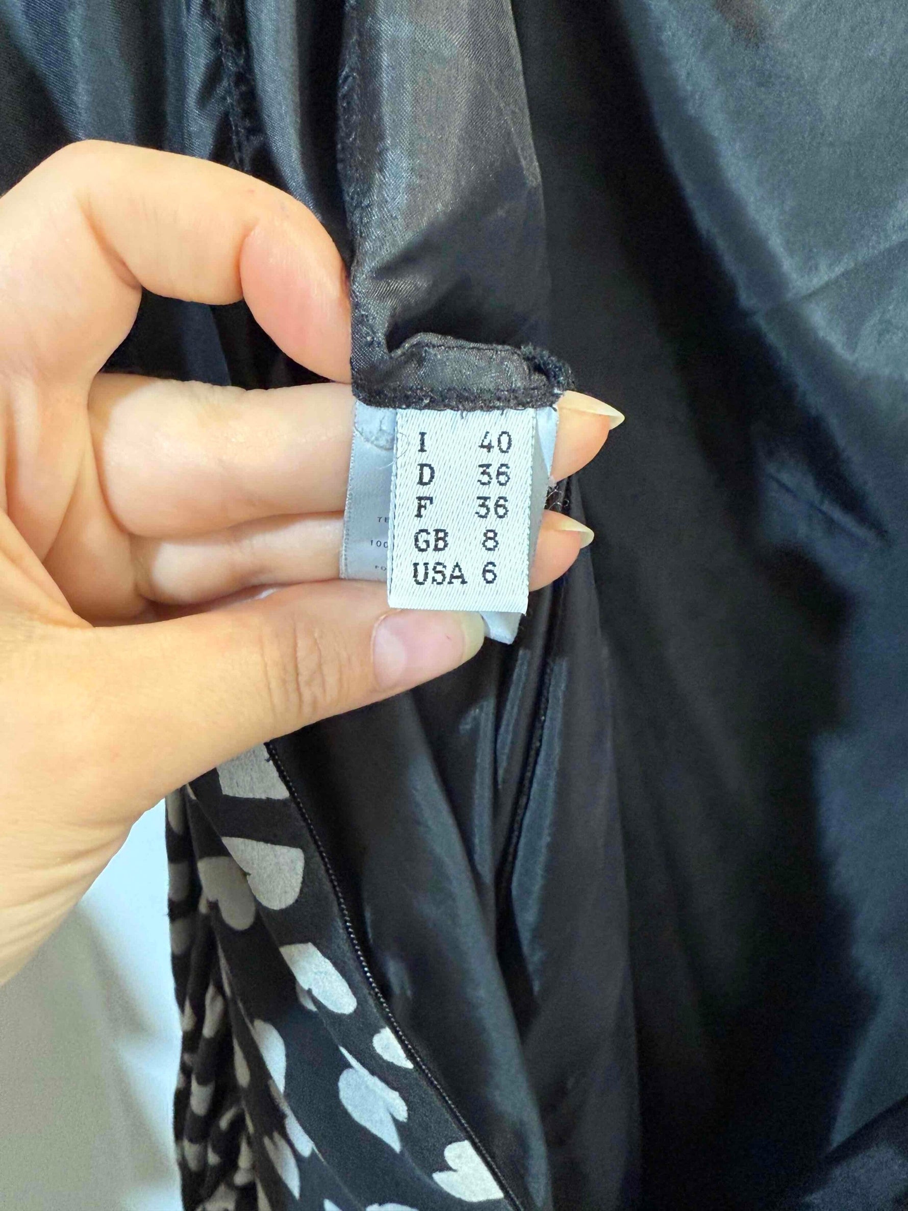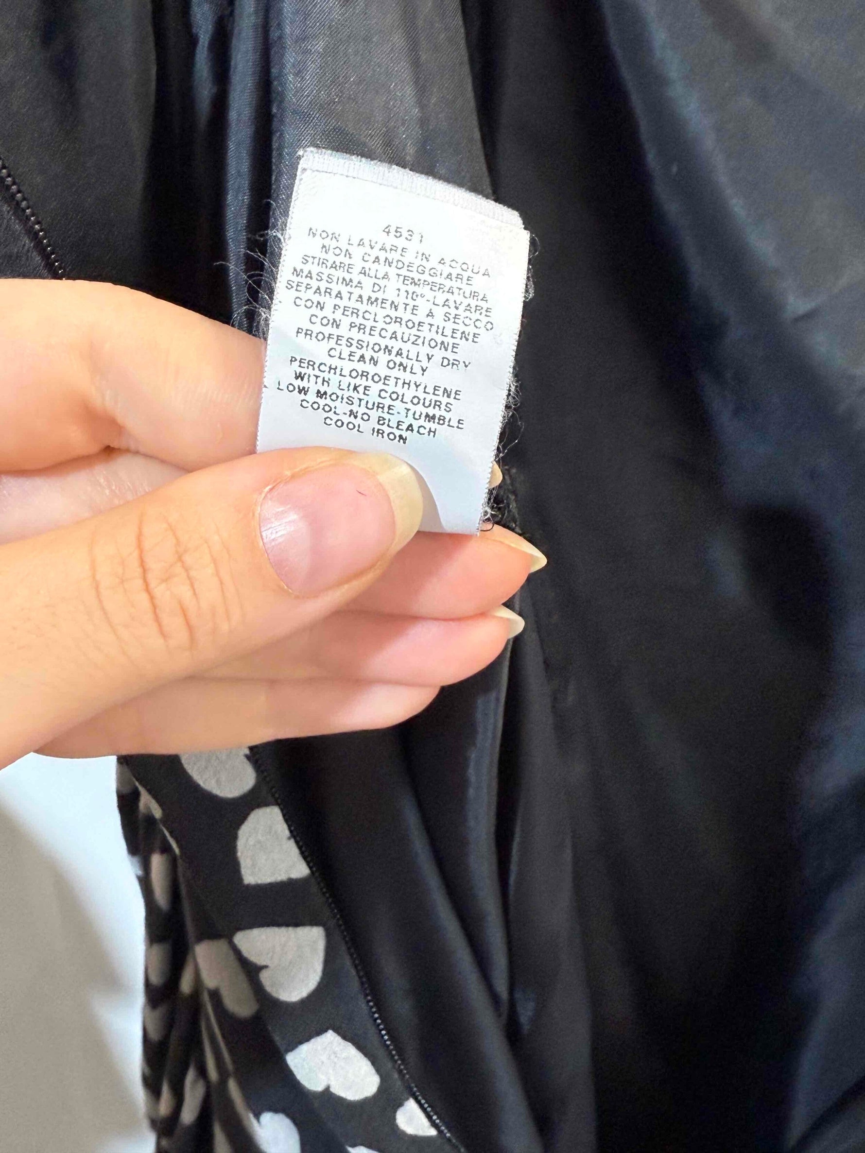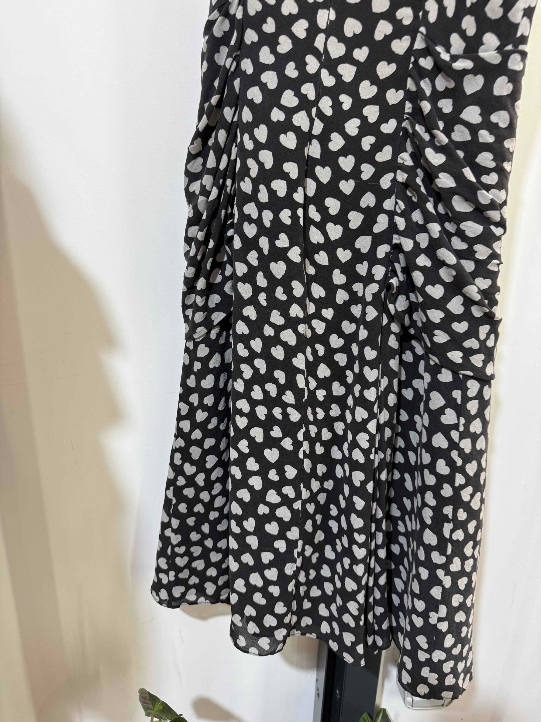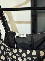 Robe midi soir boire avec des cœurs gris de la marque Moschino Jeans. Taille 36. 100% soie. Froncée sur le devant avec une petite fleur noir en soie. Robe sans manche habillée.