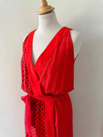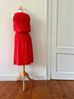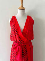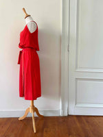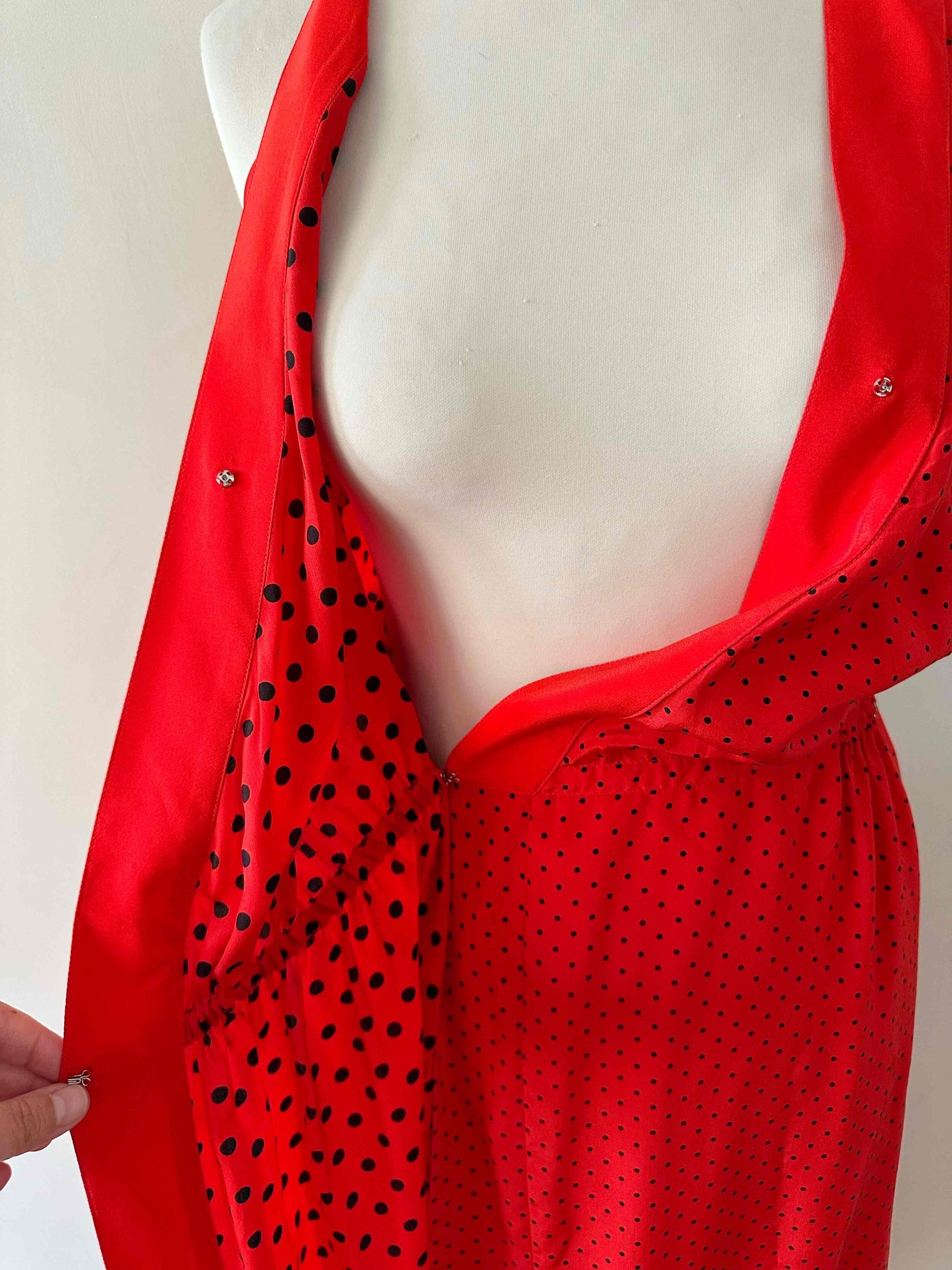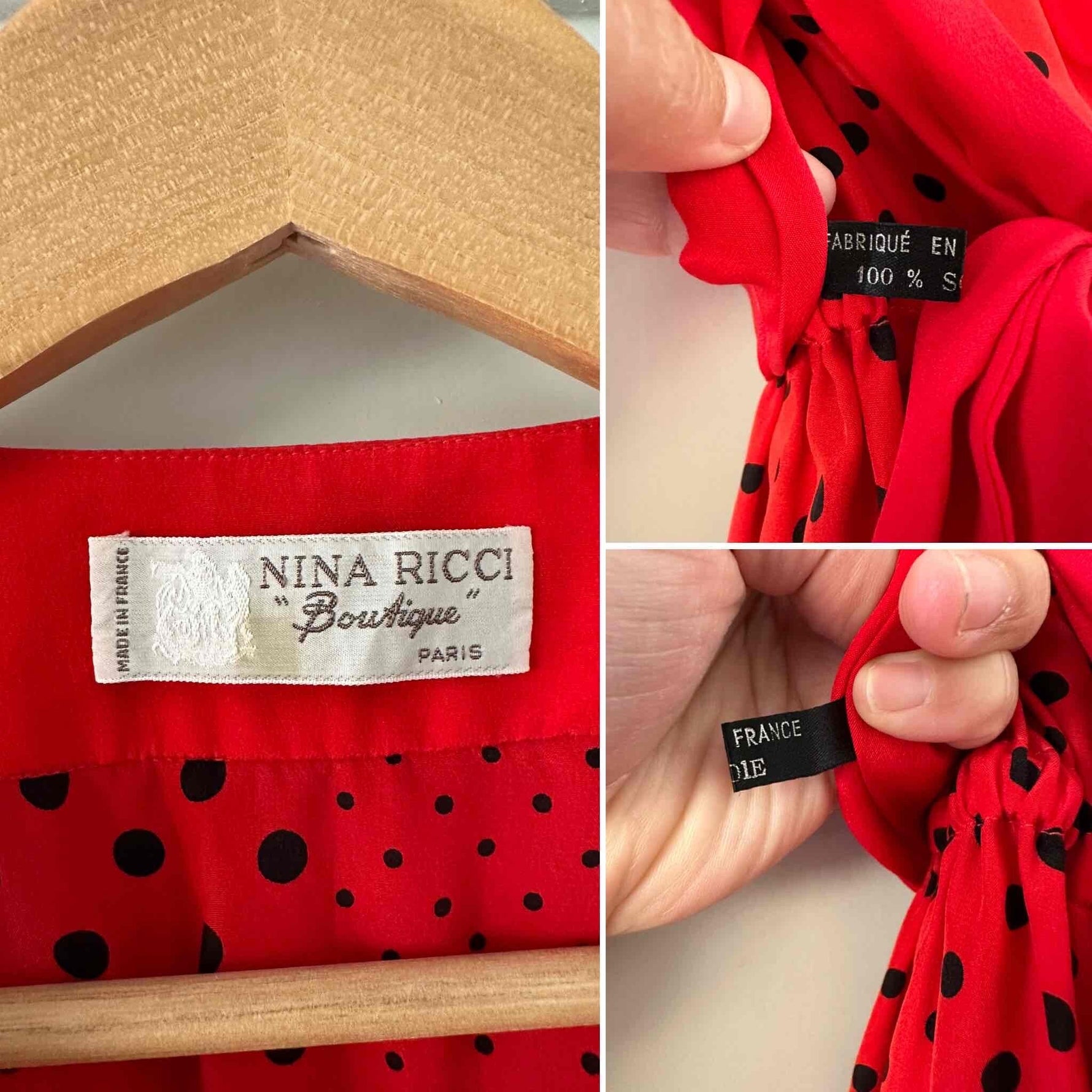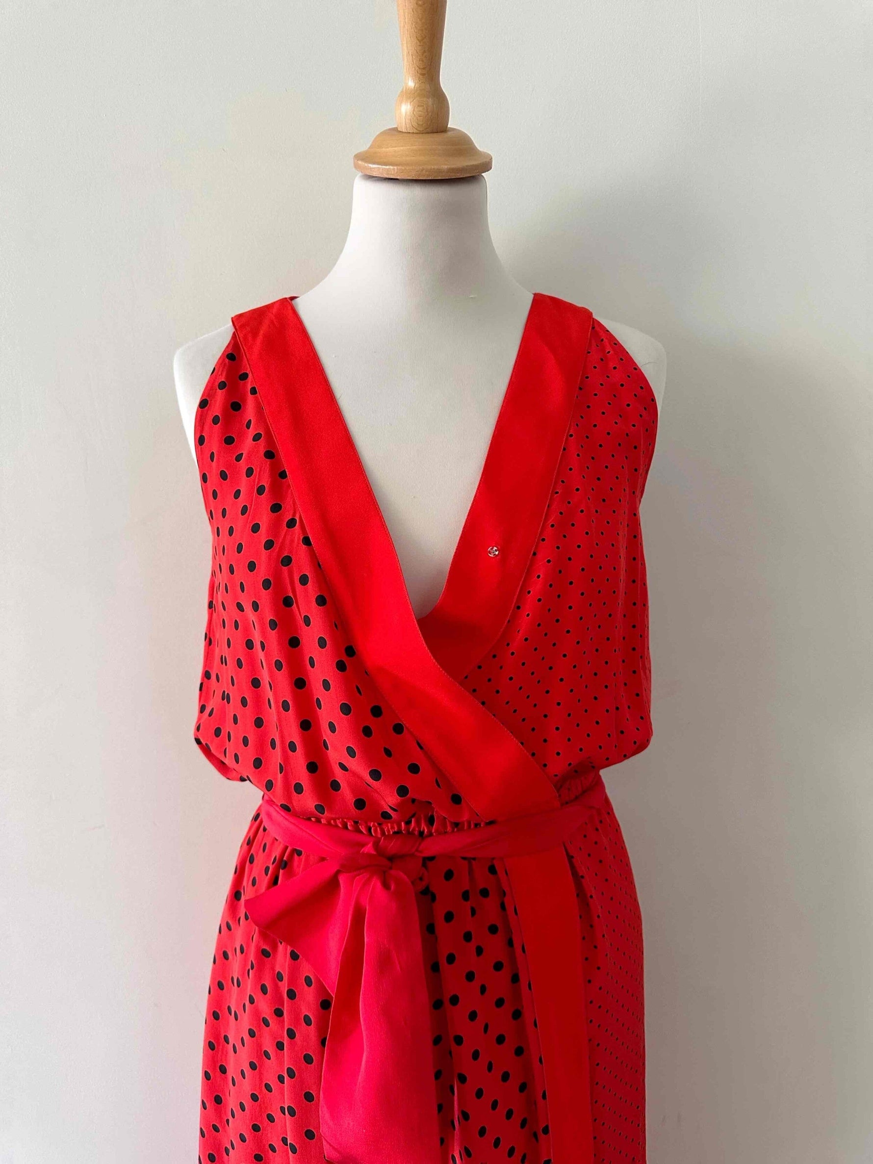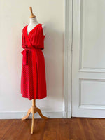 Prix unitaire parRobe portefeuille Nina Ricci en soie rouge vermillon à pois noirs, deux grandeurs de pois imprimés, croisée cache coeur par deux crochets, taille élastique m, ceinture taille à nouer, fabriquée en France, taille 34 portée ici sur un mannequin T36, aisselles 43cm.