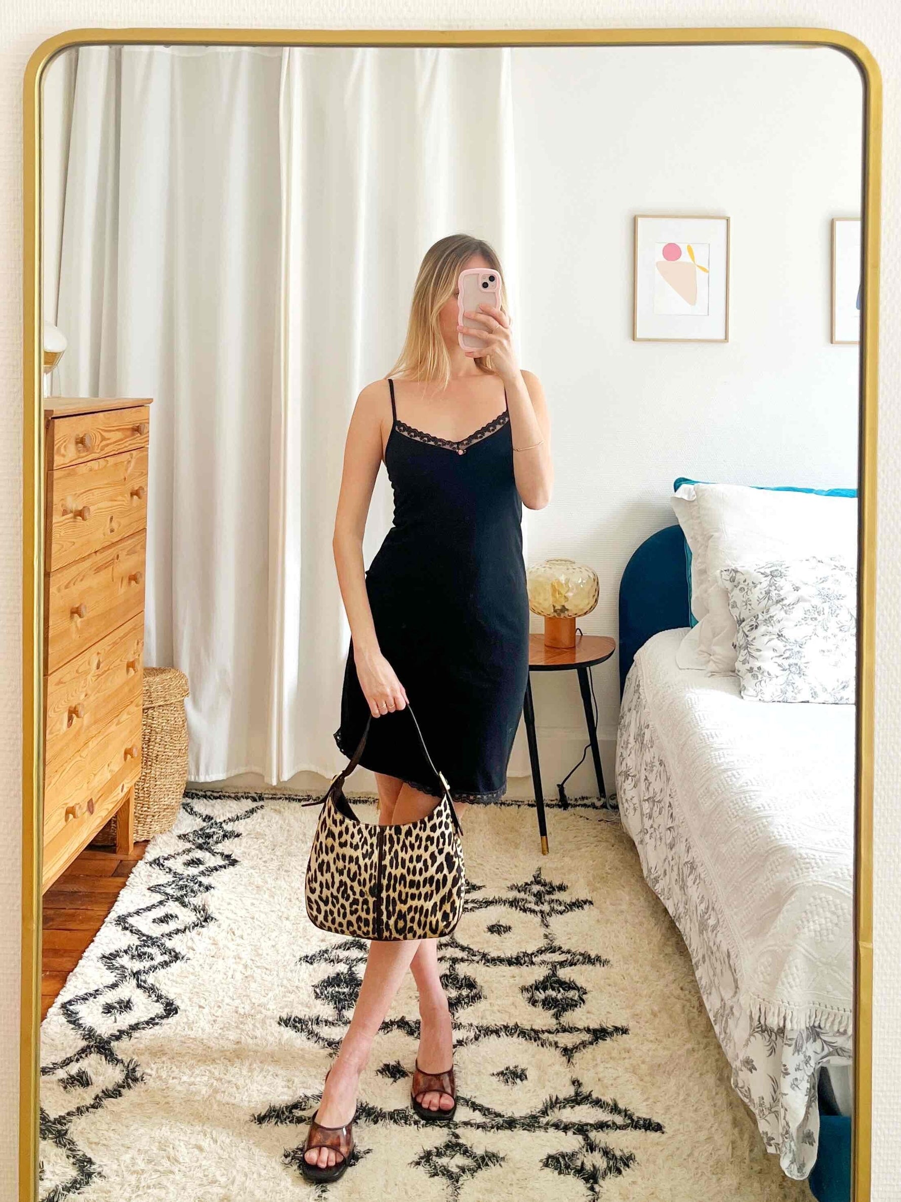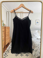 Mini robe noire, en coton et élasthanne donc stretch, tissu sans transparence, détails en dentelle, décolleté en V orné d’une petite rose, bretelles non ajustables, portée ici sur une T36 pour 1,64 m