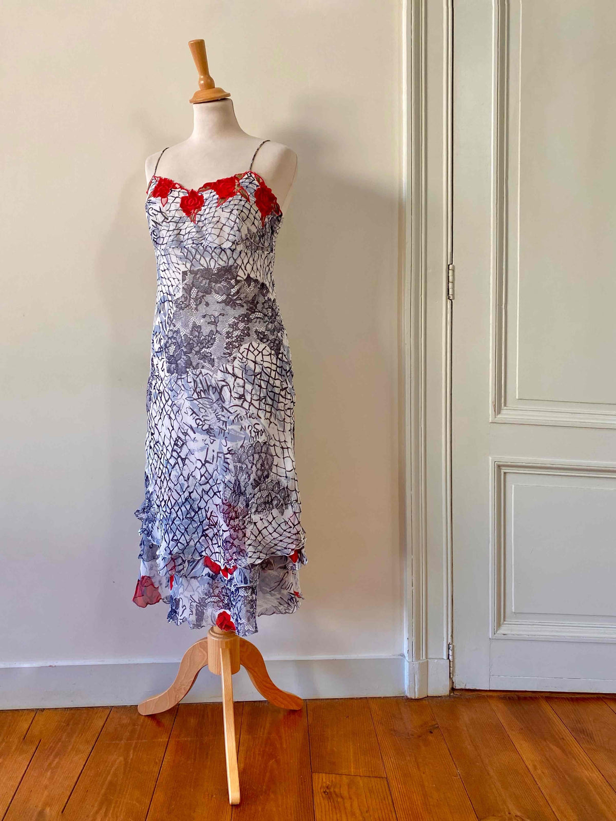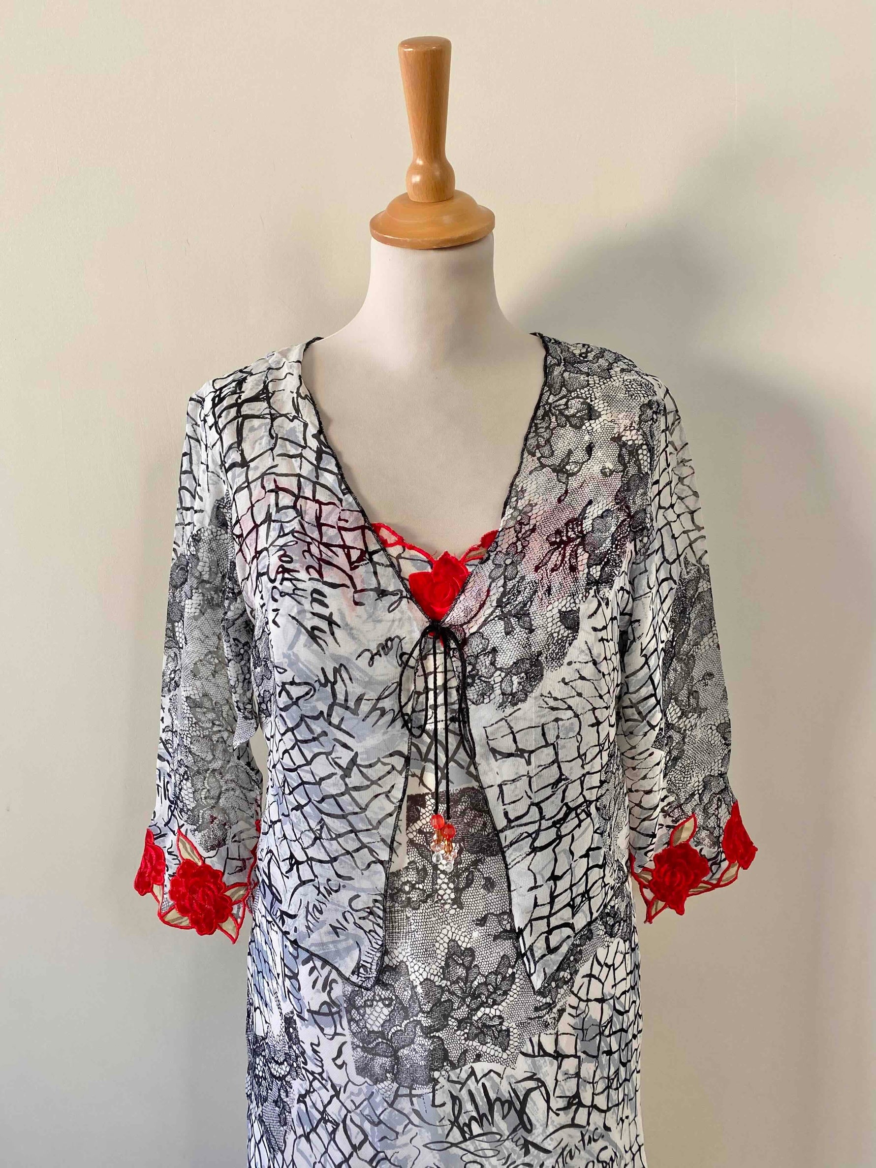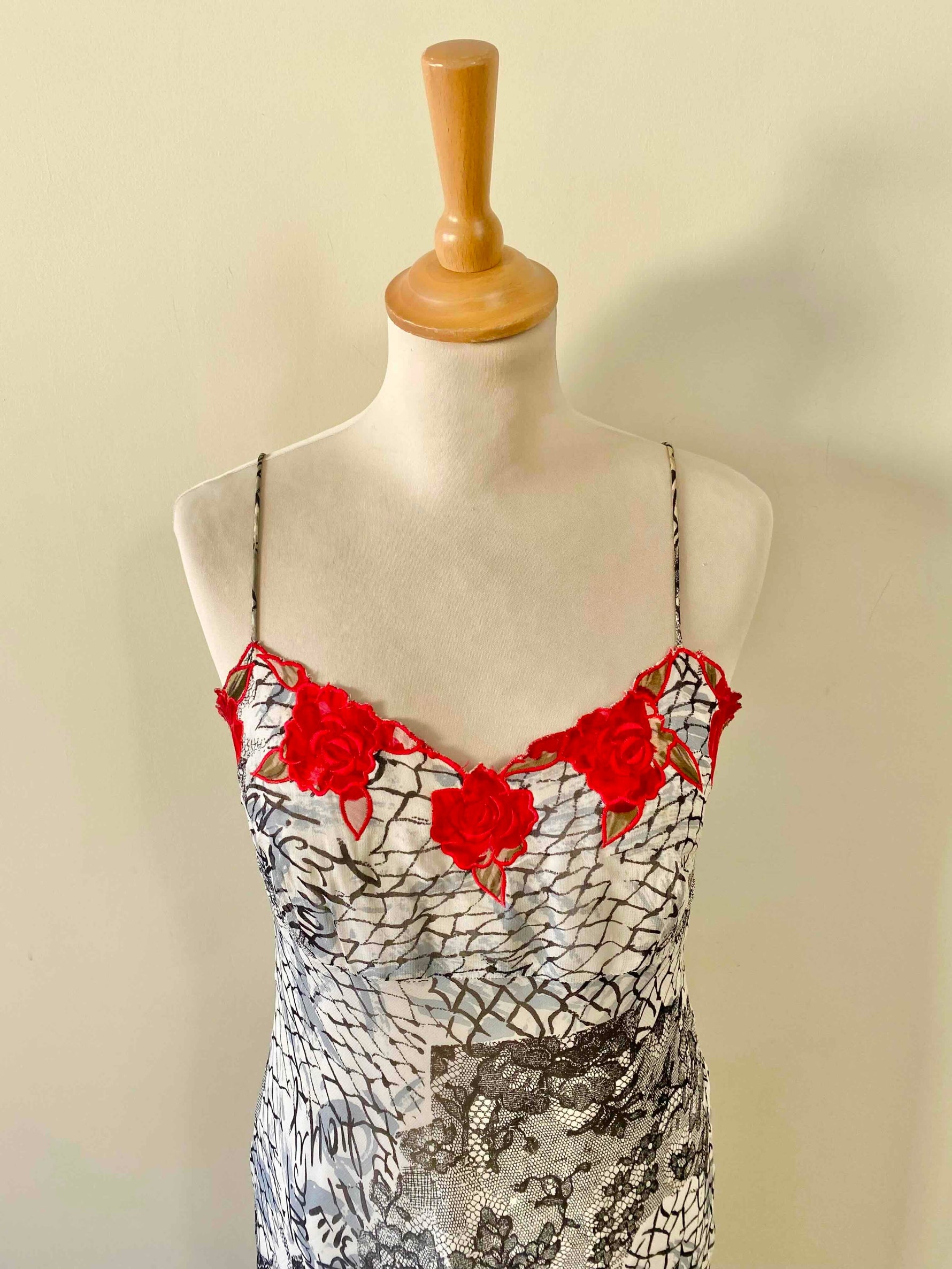 Robe nuisette à fleurs, en voile viscose blanche impression dentelle et graffitis noirs, encolure brodée de roses rouges en patch, bretelles spaghettis, longueur midi, fermeture éclaire côté, René Derhy y2k, taille 36 portée ici sur un mannequin T36, aisselles 43cm.