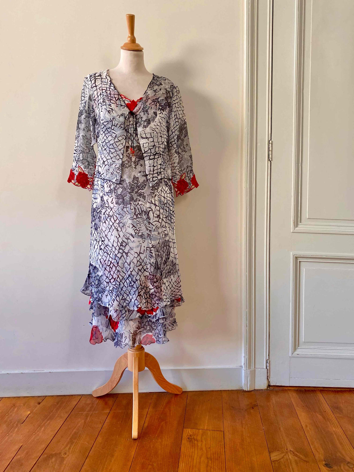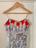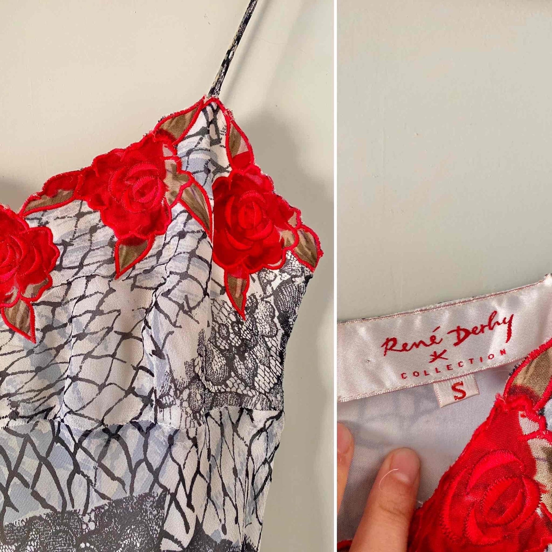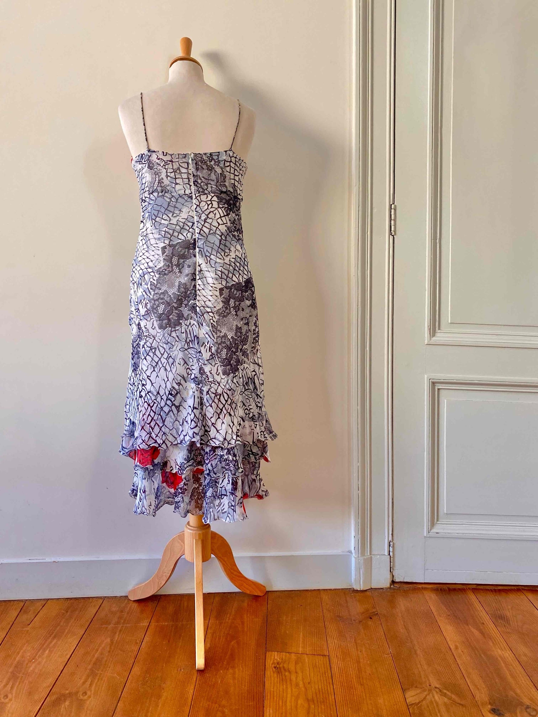 Robe nuisette à fleurs, en voile viscose blanche impression dentelle et graffitis noirs, encolure brodée de roses rouges en patch, bretelles spaghettis, longueur midi, fermeture éclaire côté, René Derhy y2k, taille 36 portée ici sur un mannequin T36, aisselles 43cm.